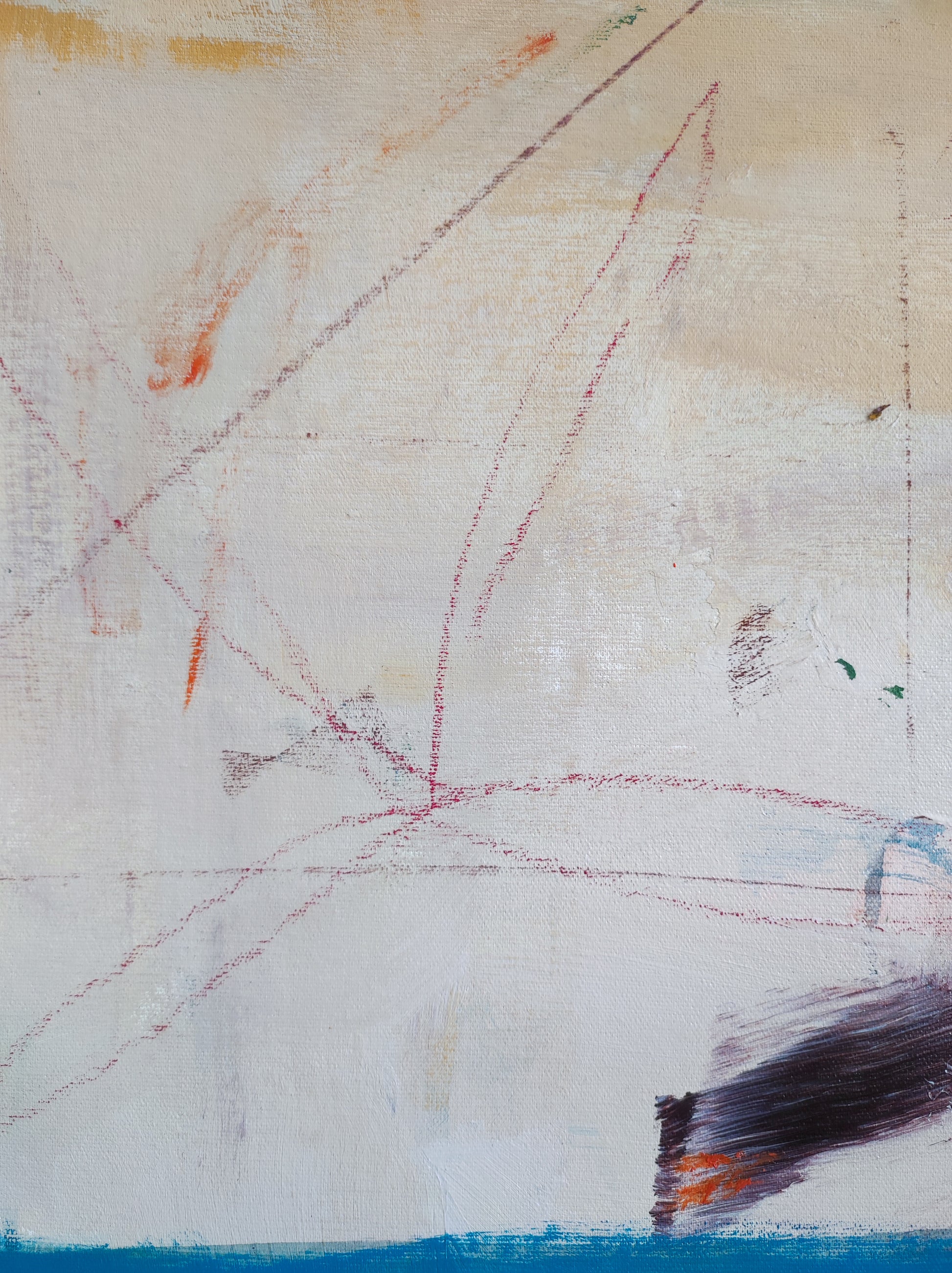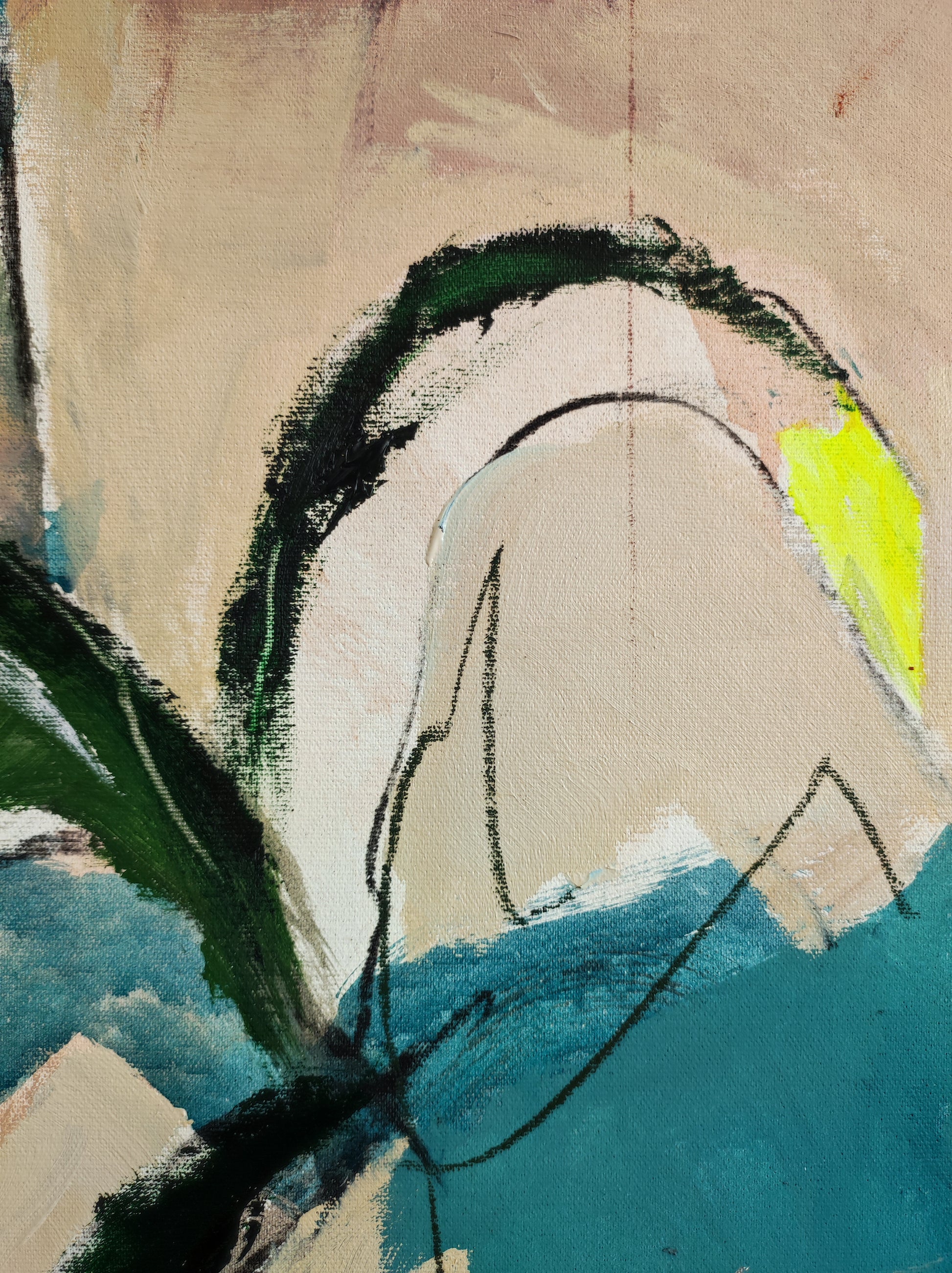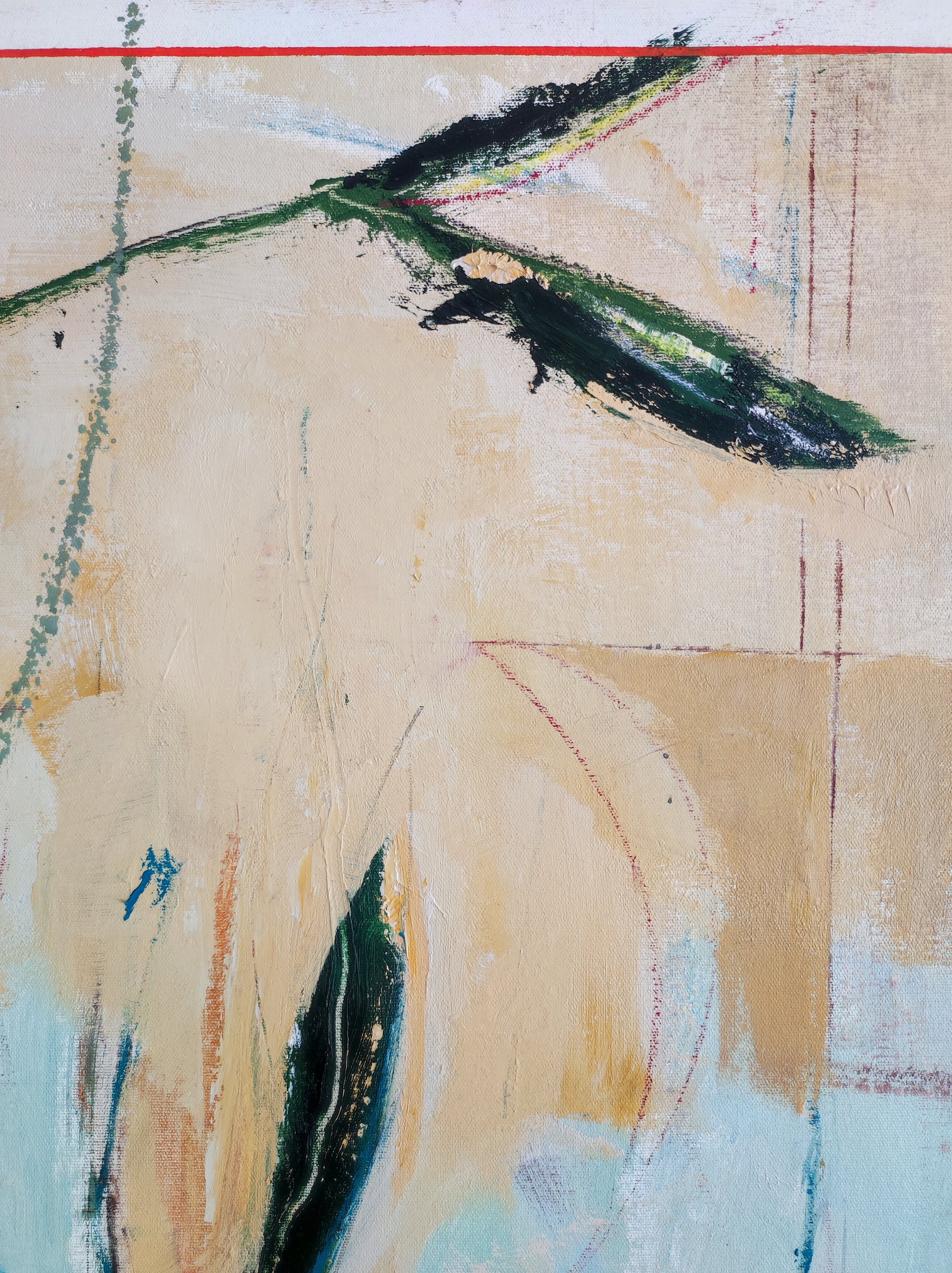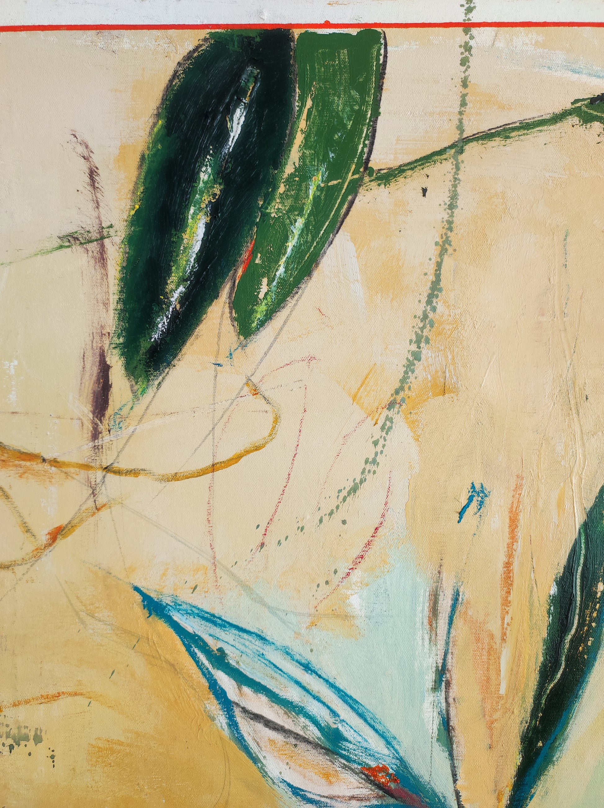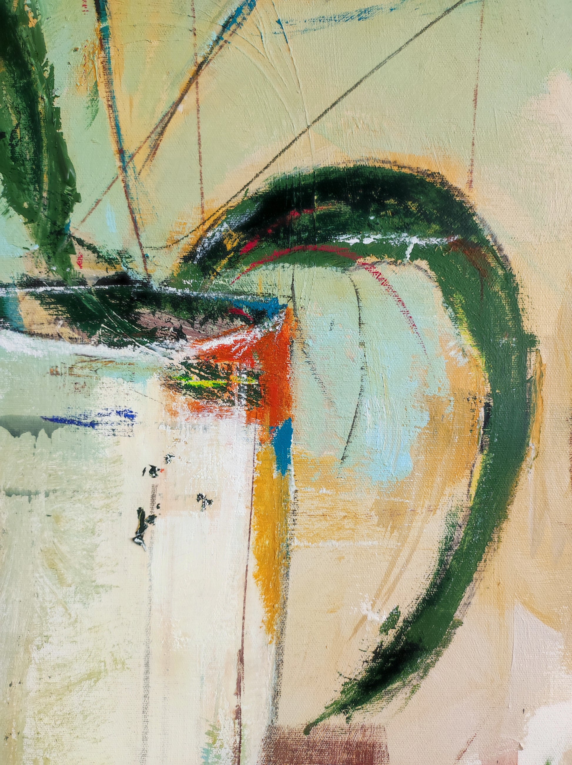 Pintura gestual, intuitiva, que deja que las cosas pasen y se apoya sobre lo que aparece. Aprovechando el accidente y aceptando las consecuencias.