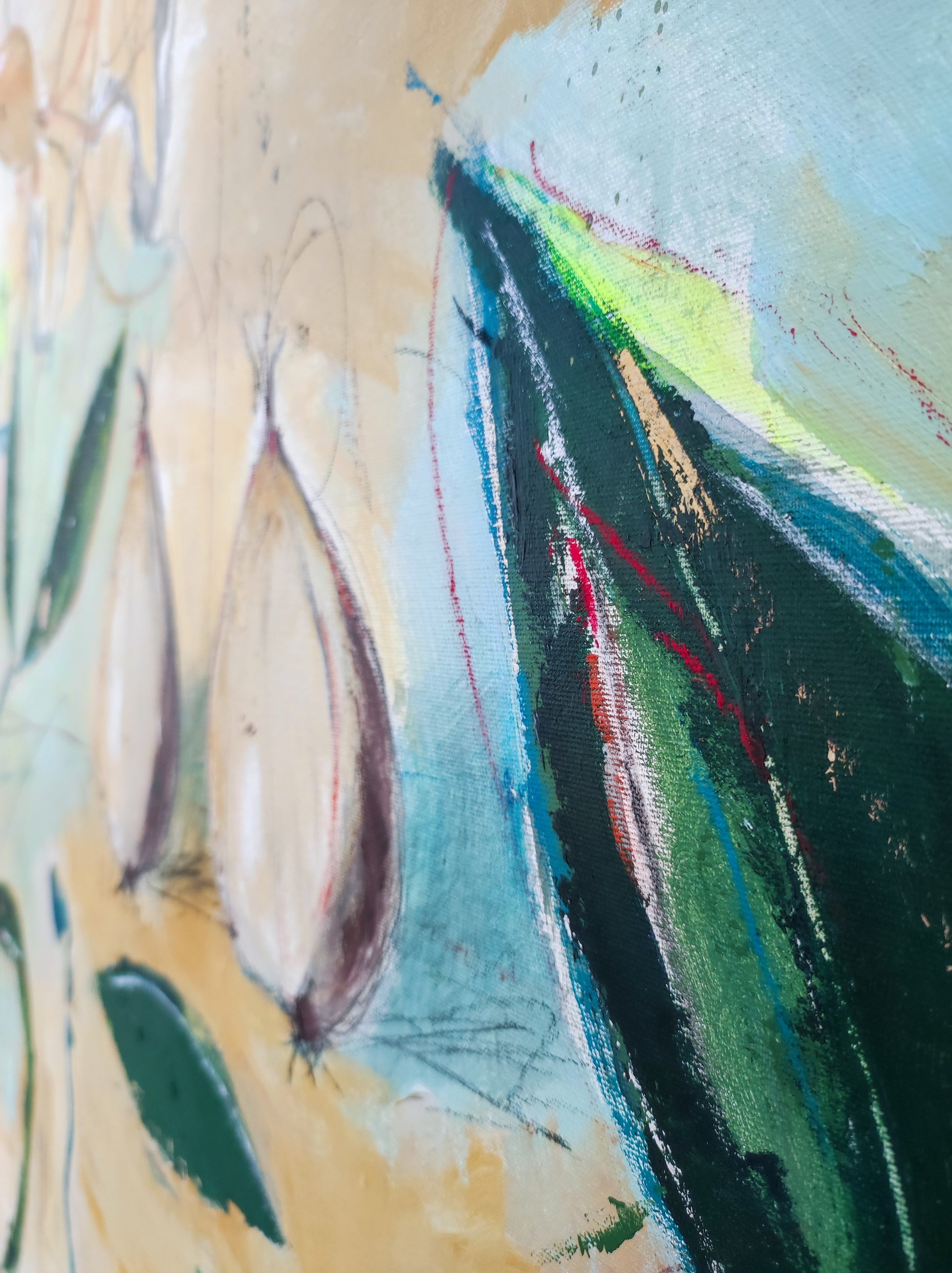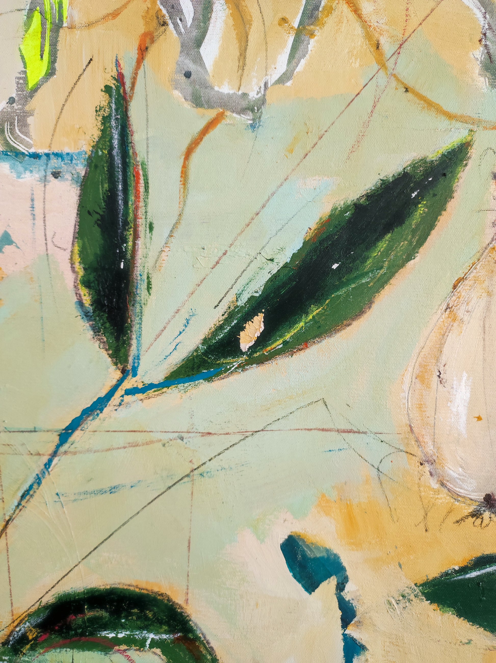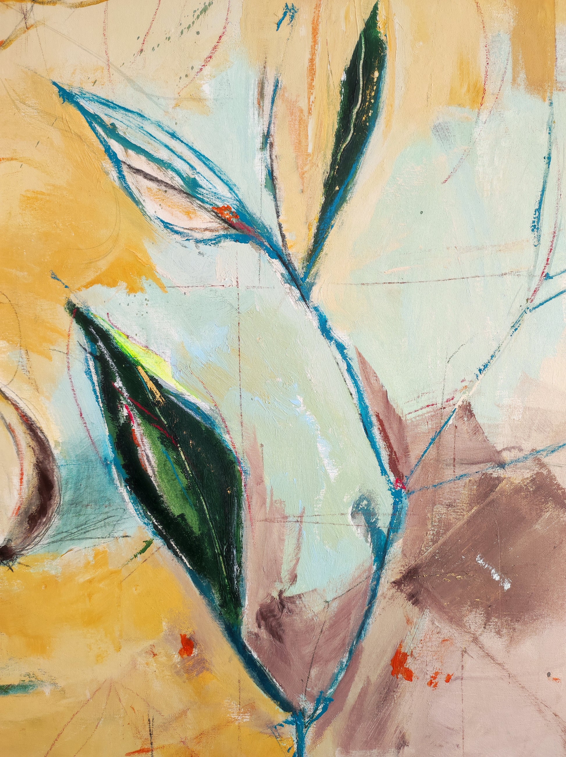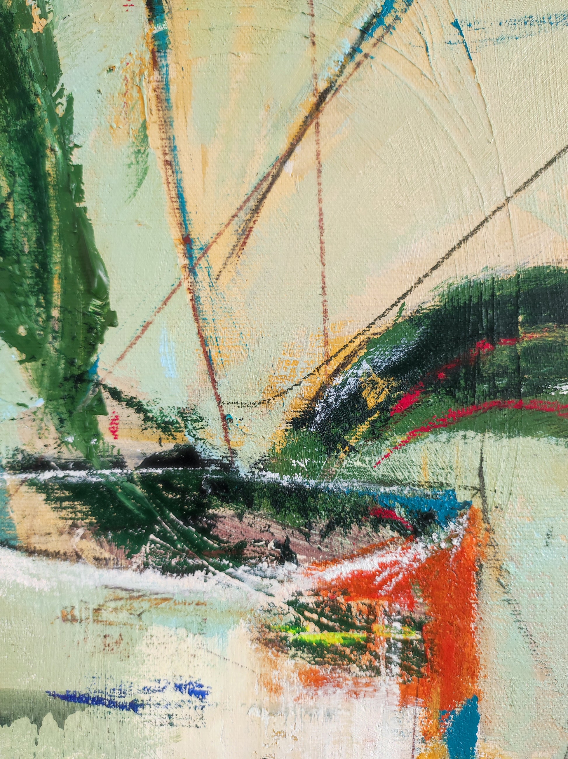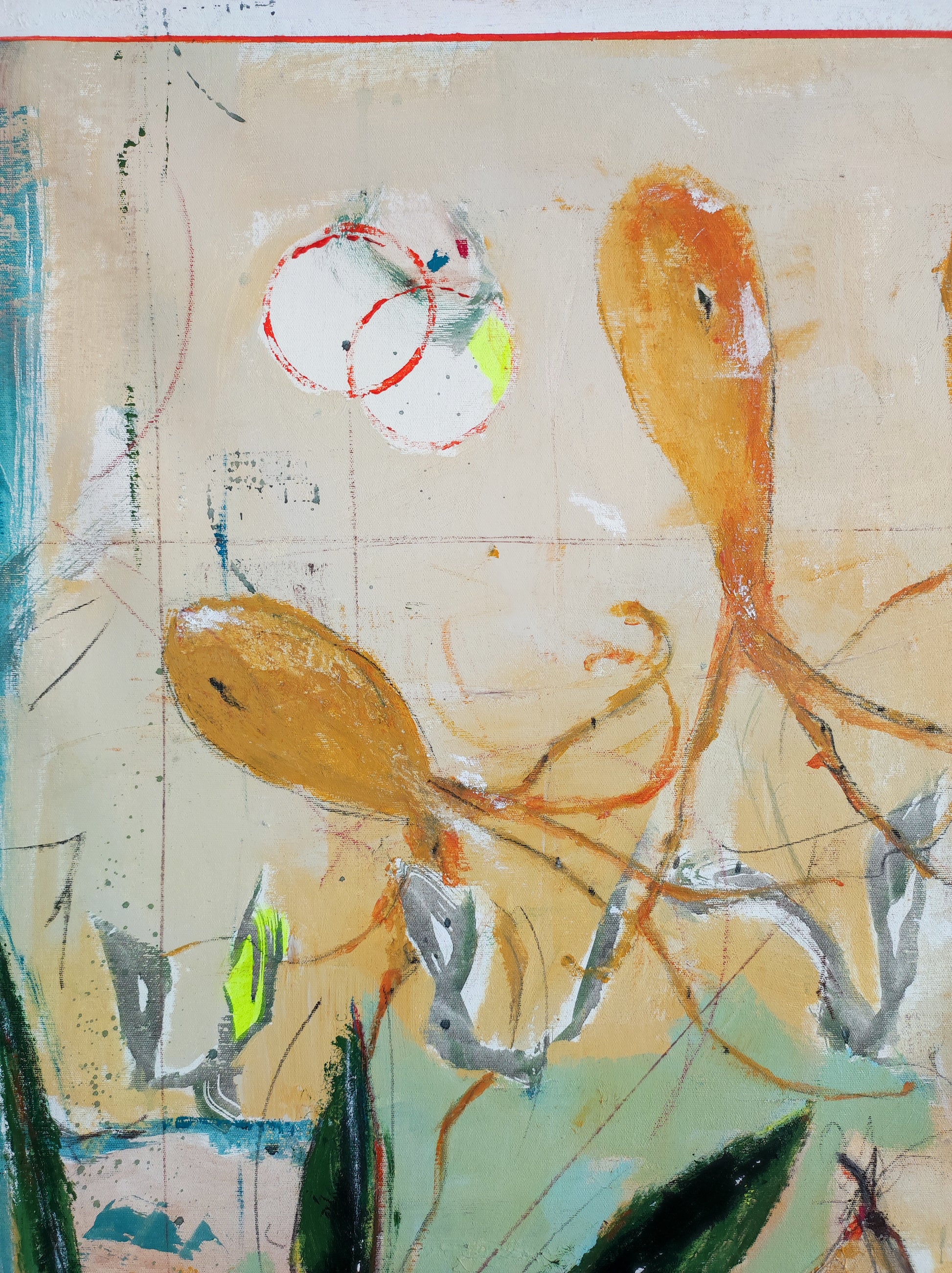 Pintura gestual, intuitiva, que deja que las cosas pasen y se apoya sobre lo que aparece. Aprovechando el accidente y aceptando las consecuencias.