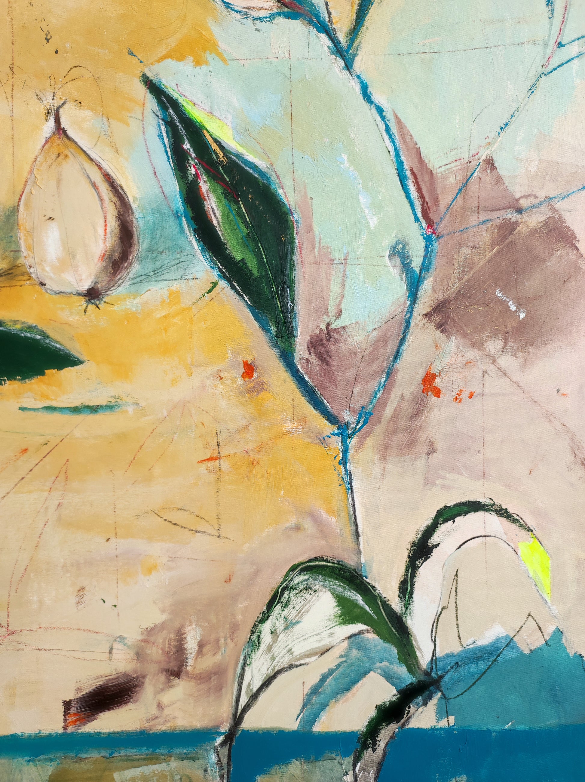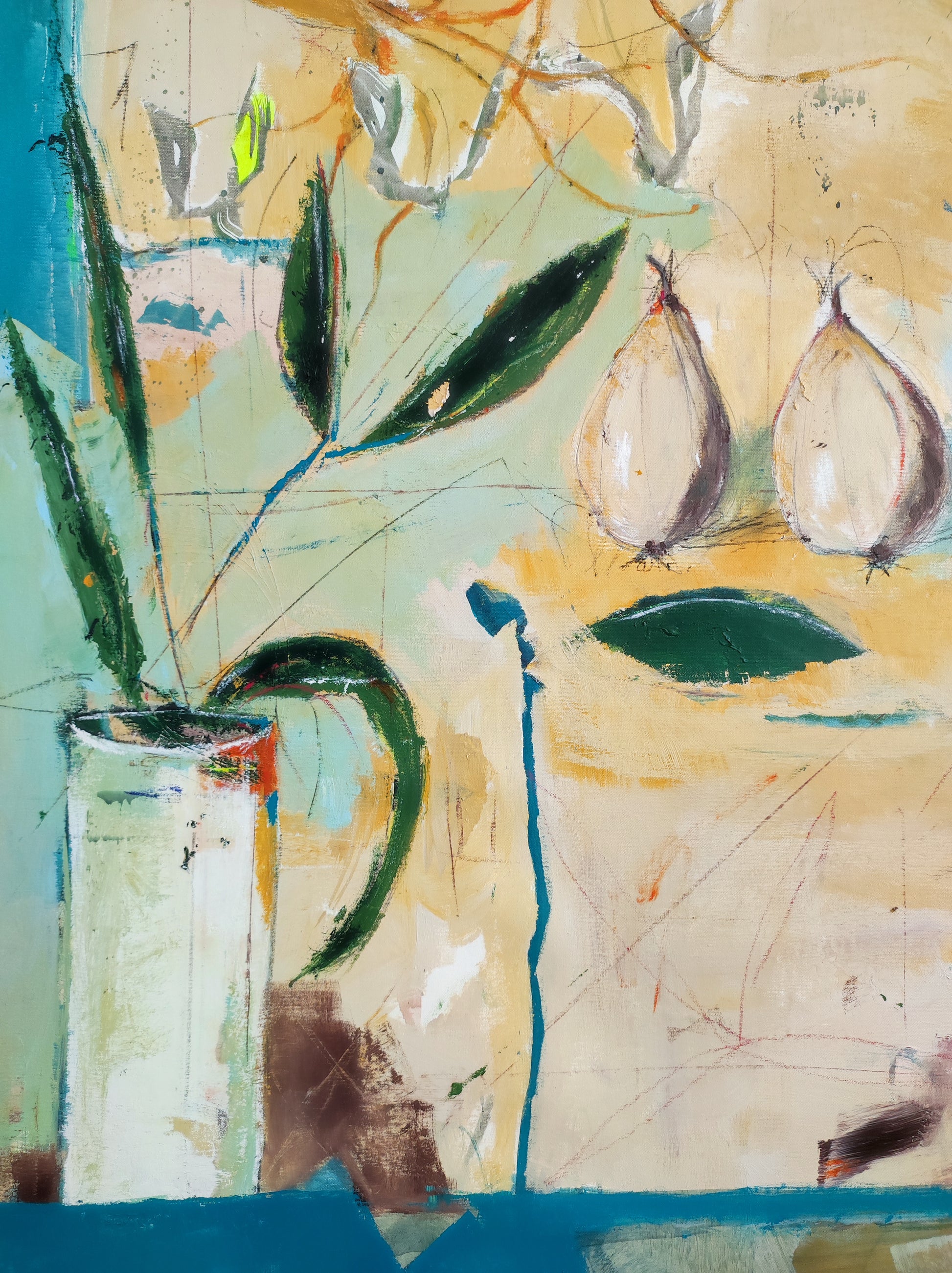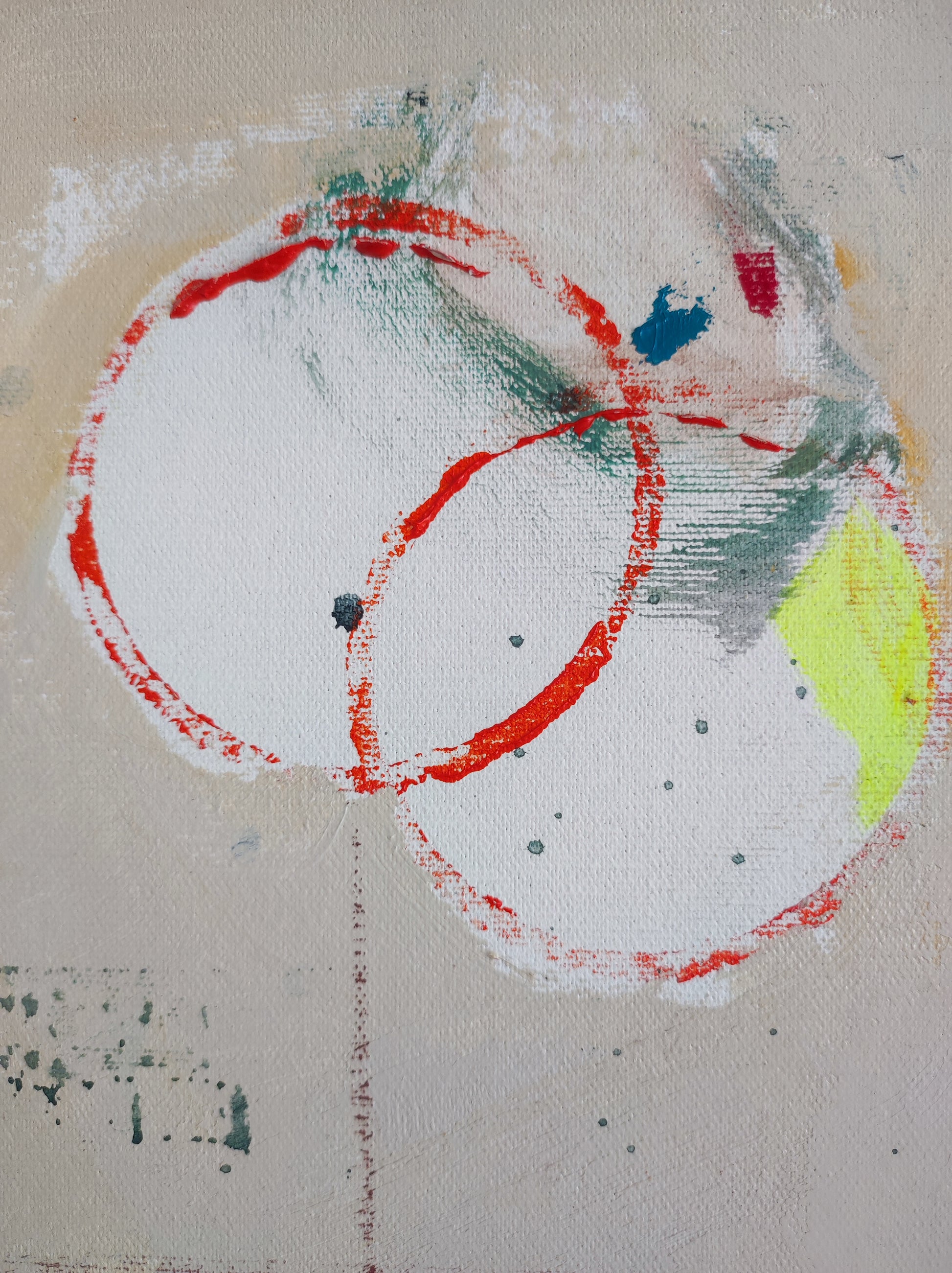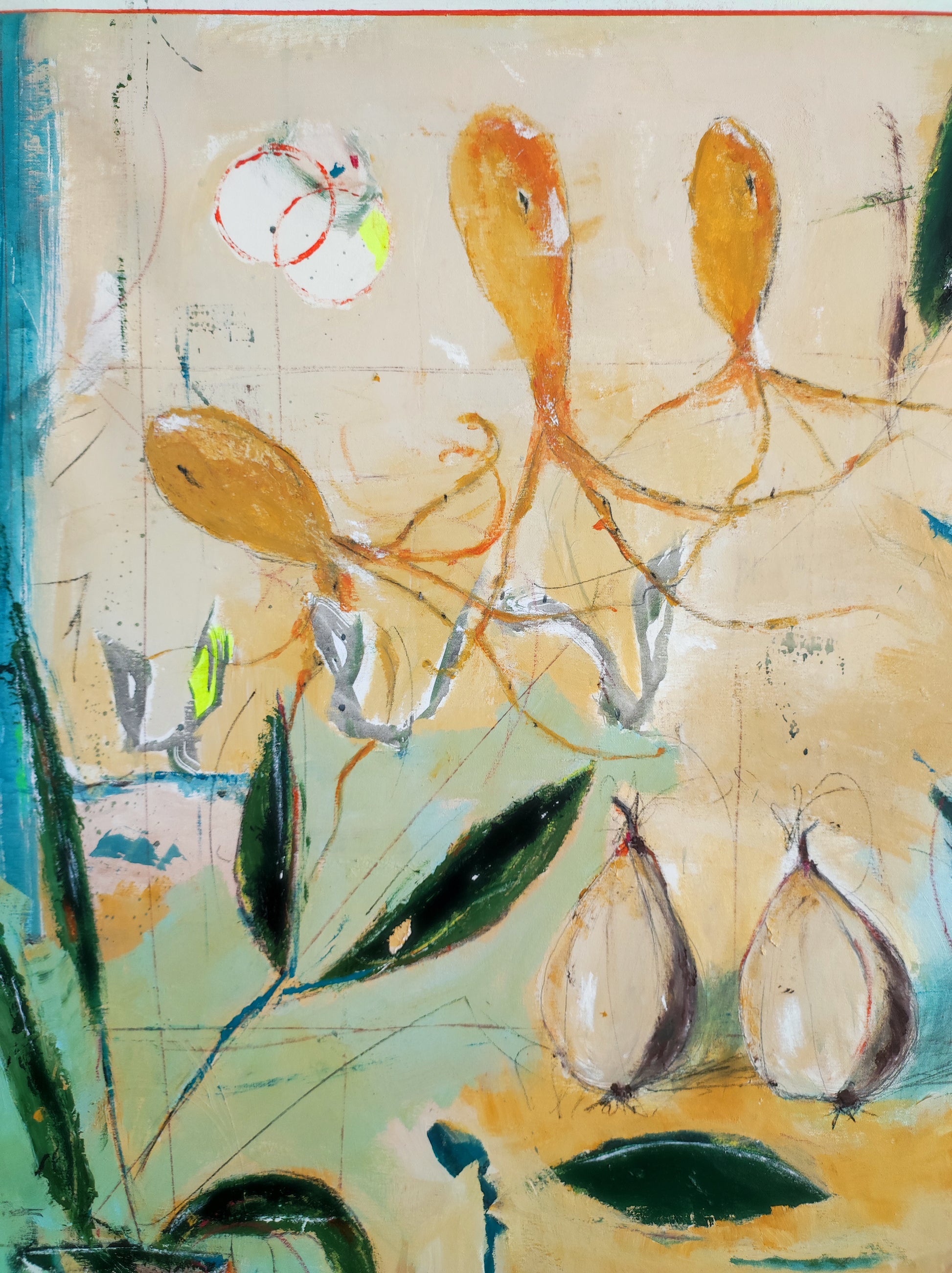 Pintura gestual, intuitiva, que deja que las cosas pasen y se apoya sobre lo que aparece. Aprovechando el accidente y aceptando las consecuencias.