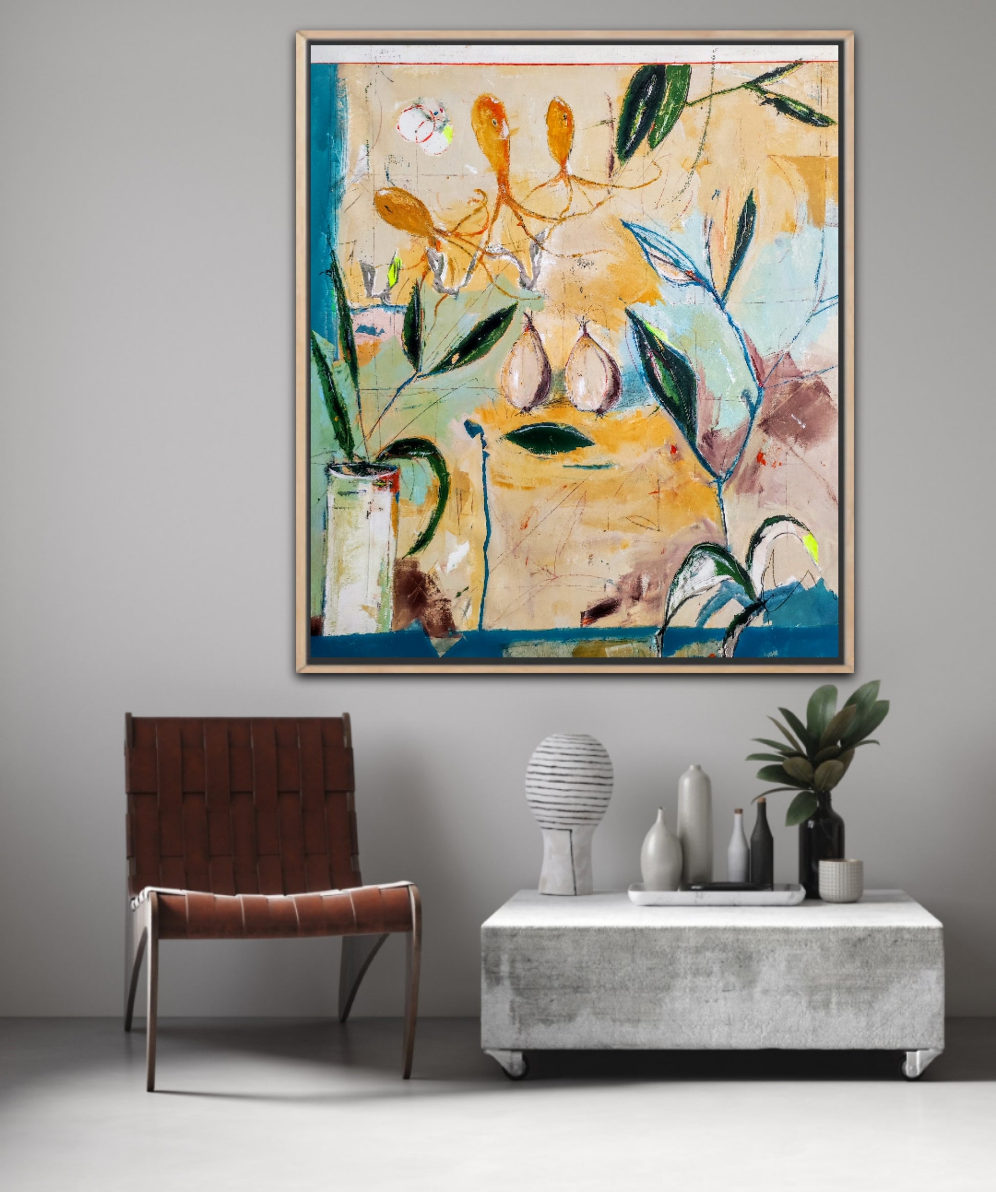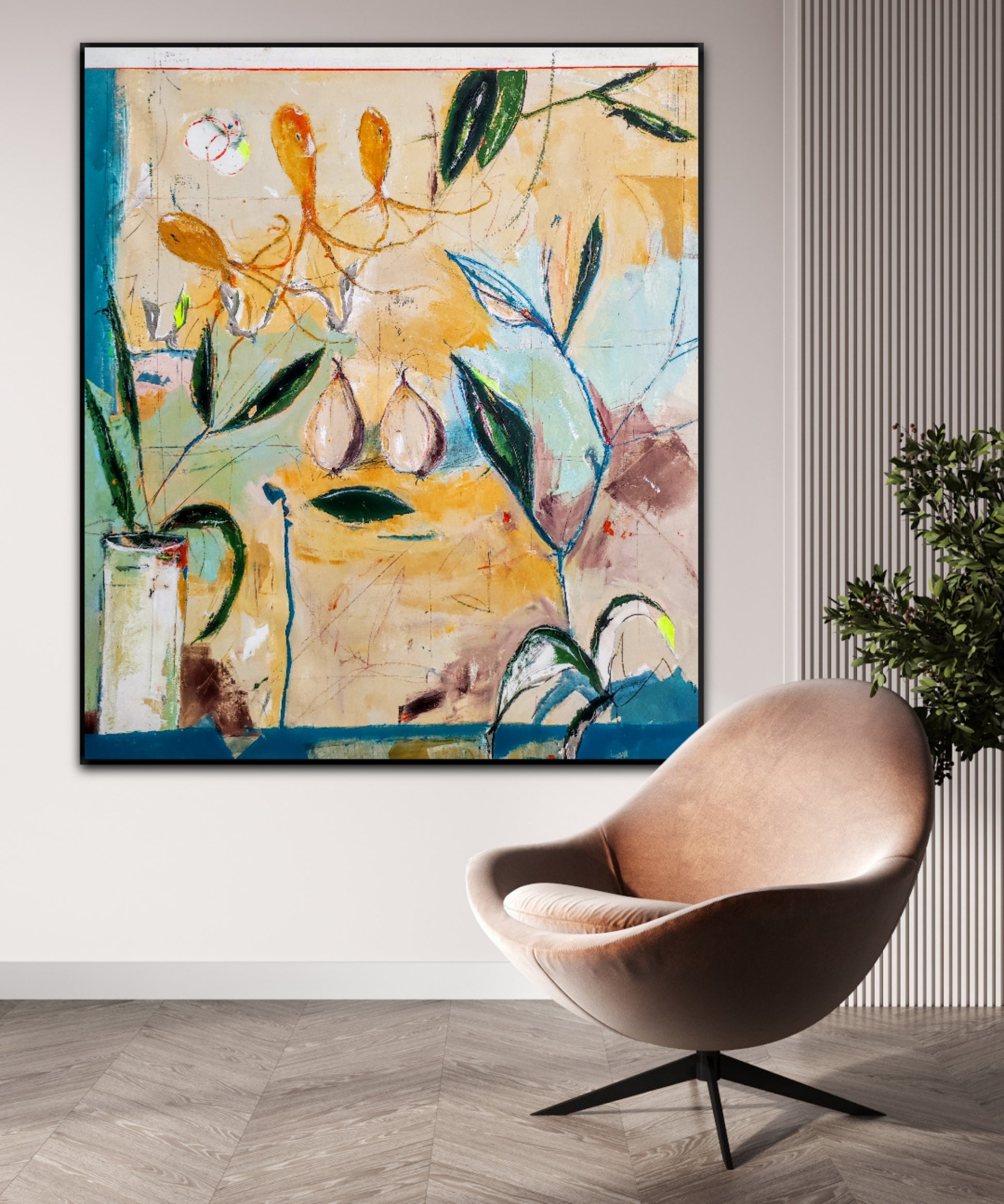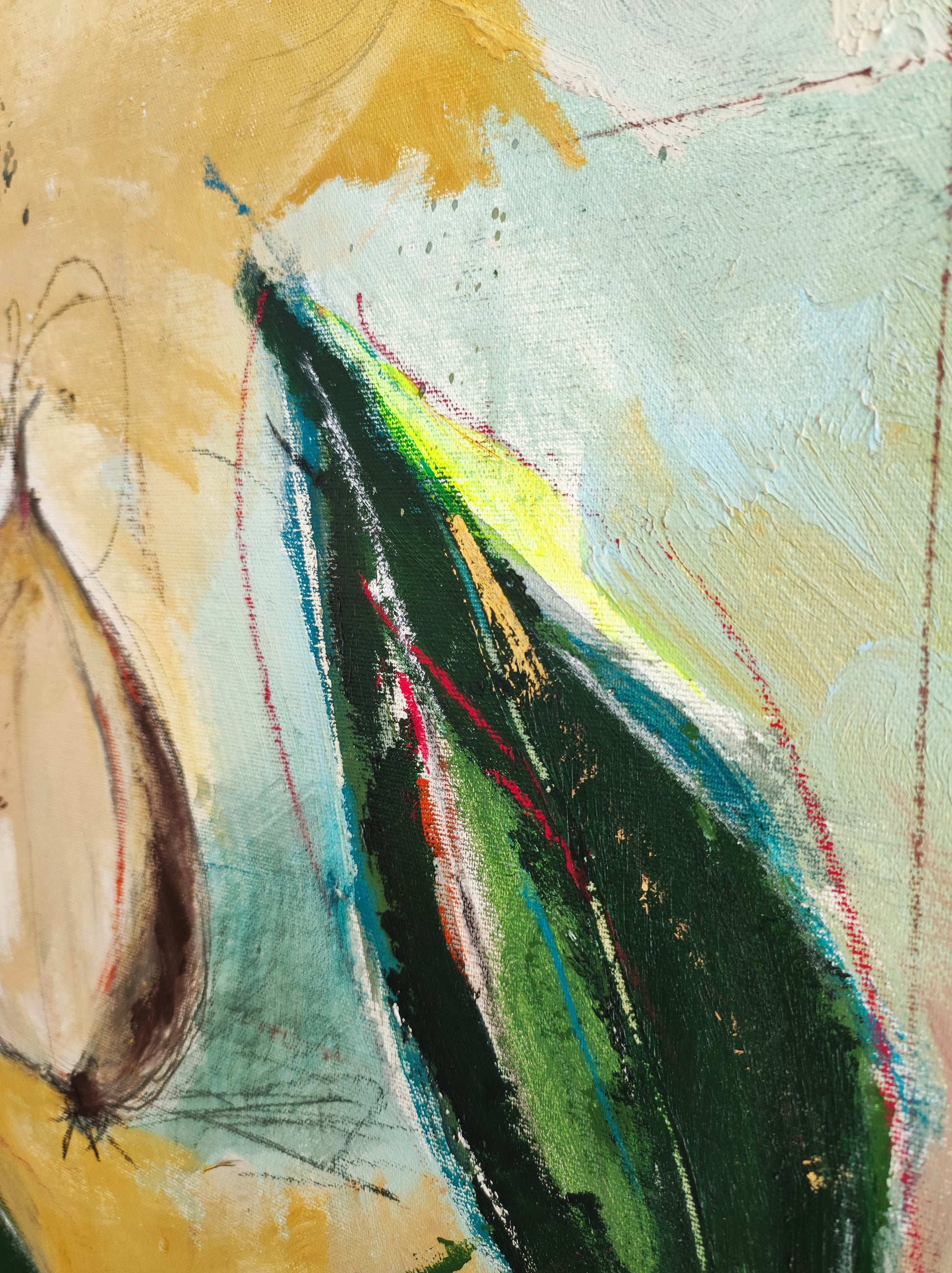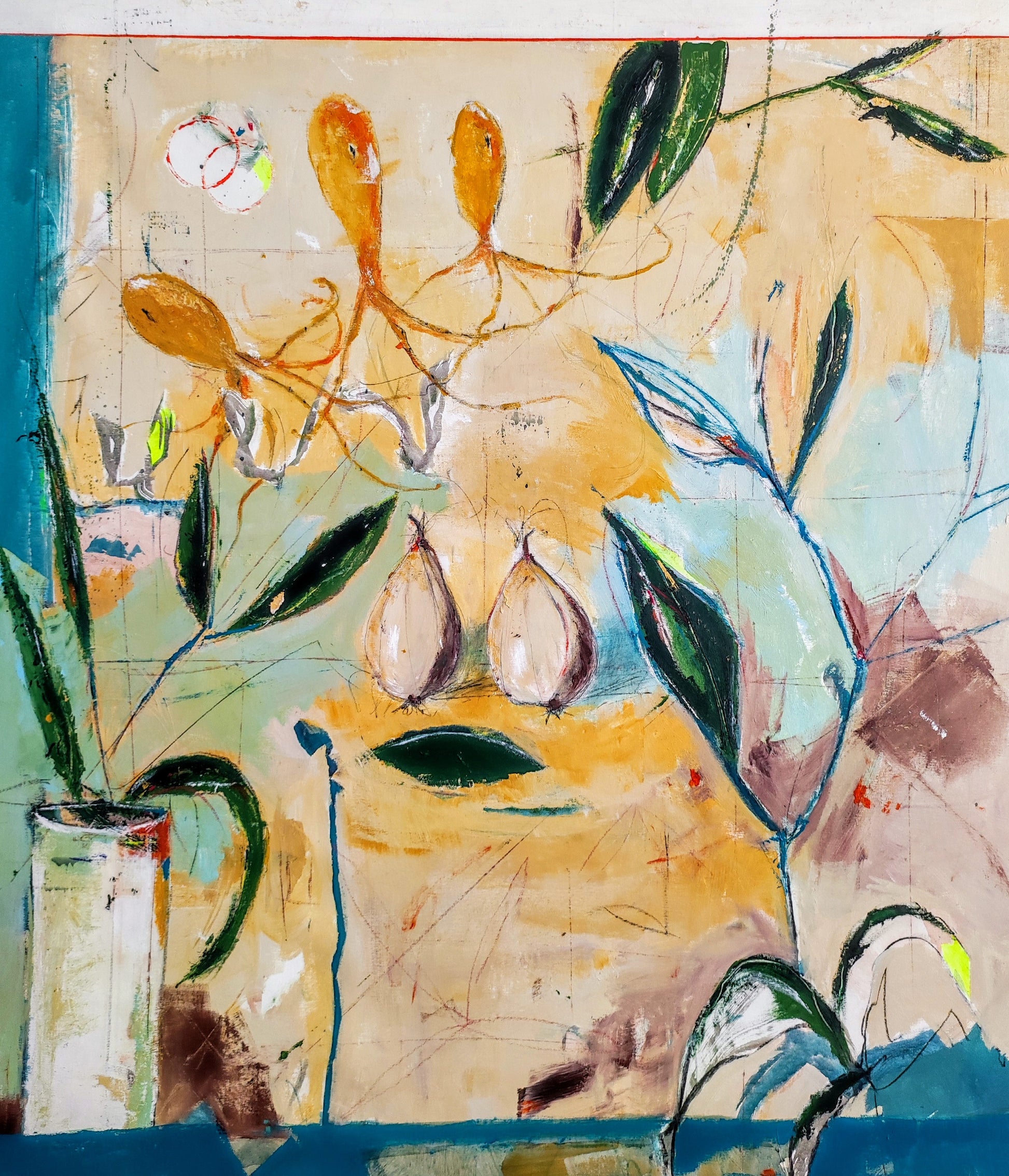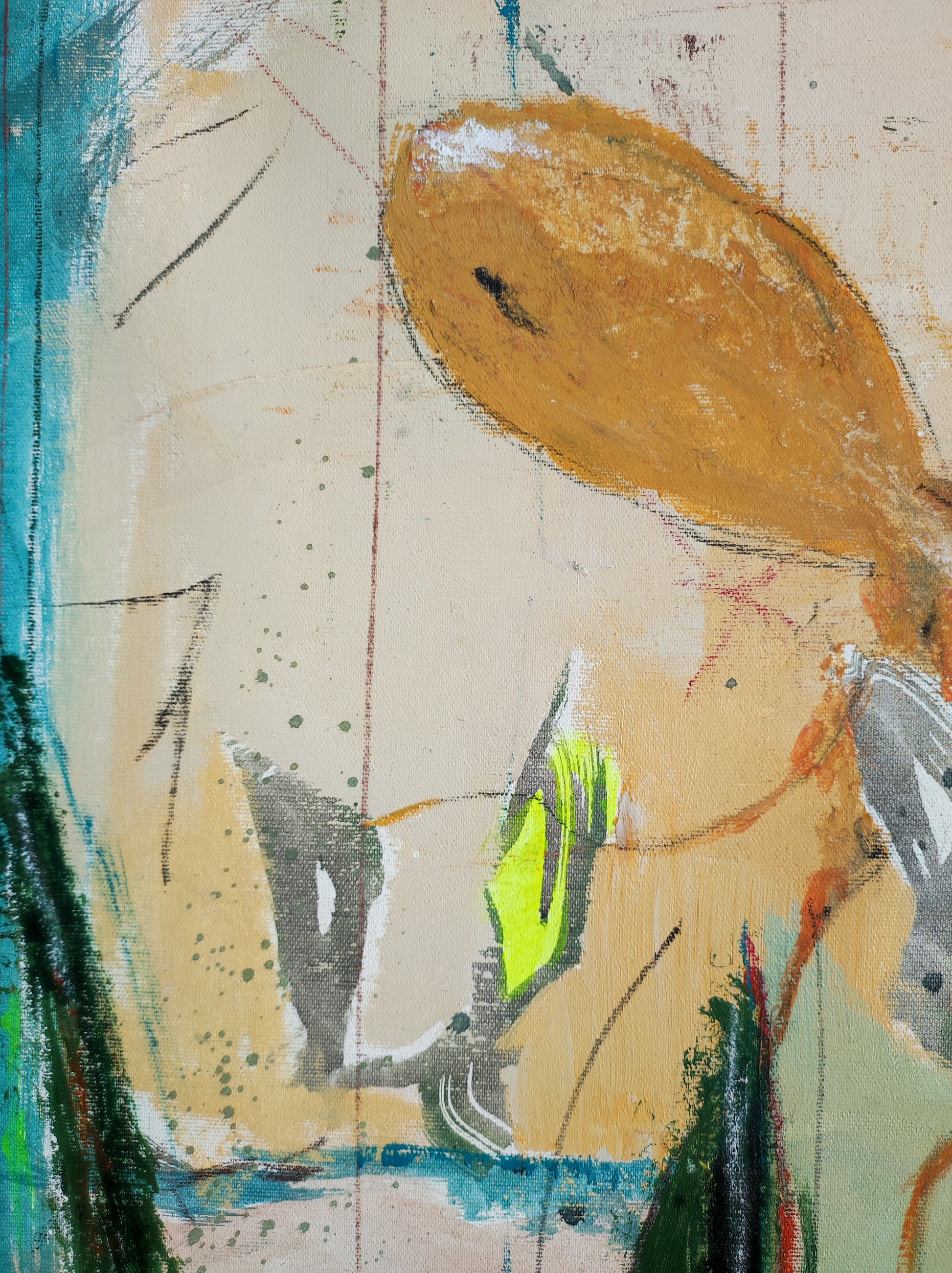 Pintura gestual, intuitiva, que deja que las cosas pasen y se apoya sobre lo que aparece. Aprovechando el accidente y aceptando las consecuencias.