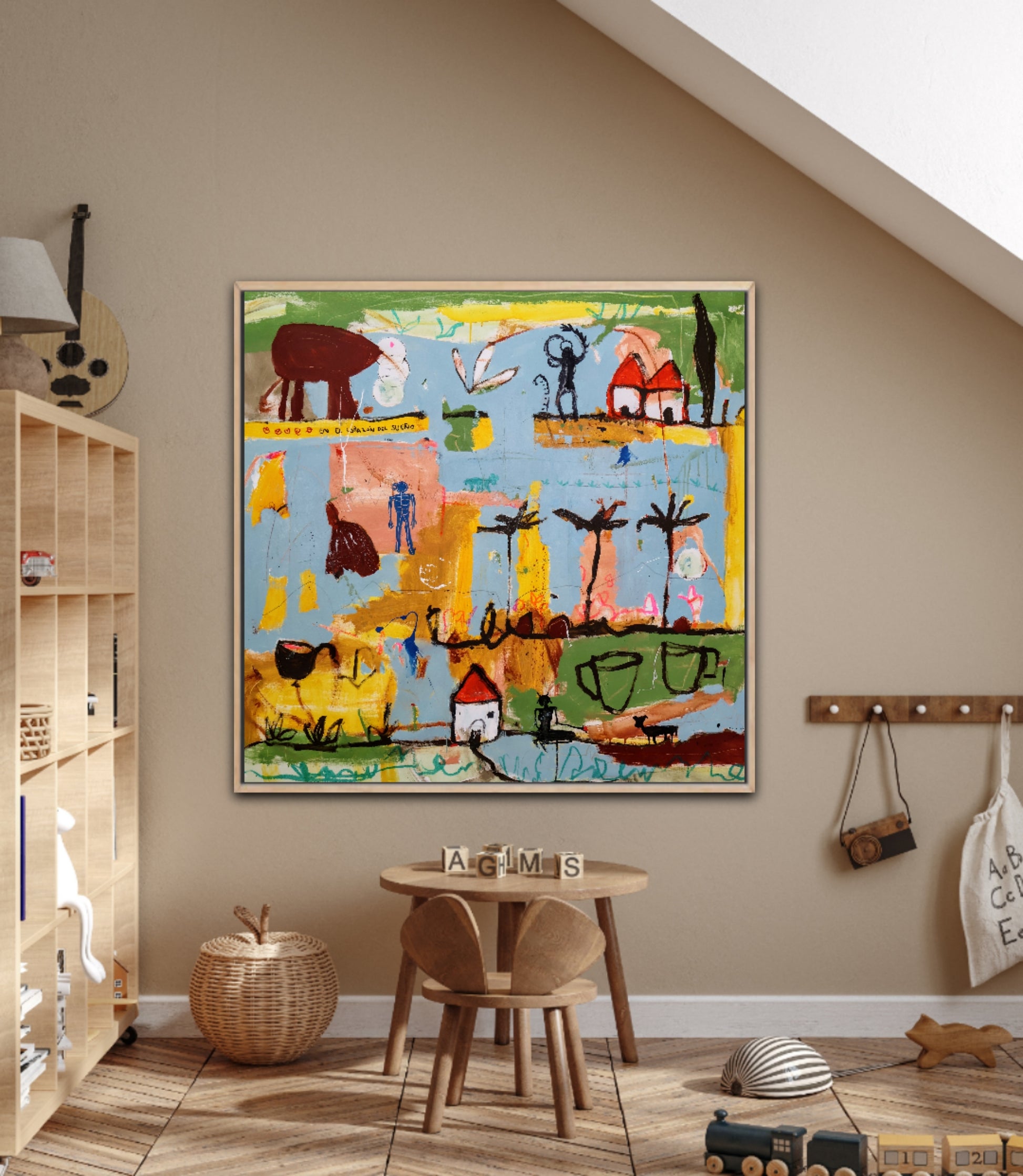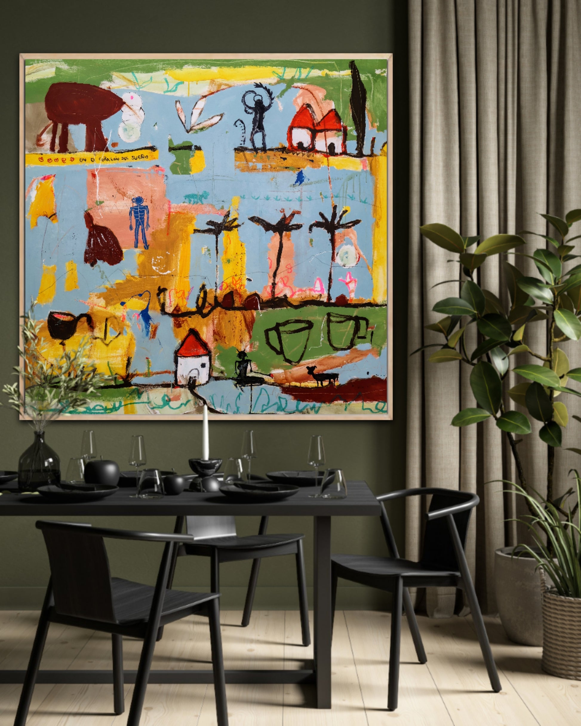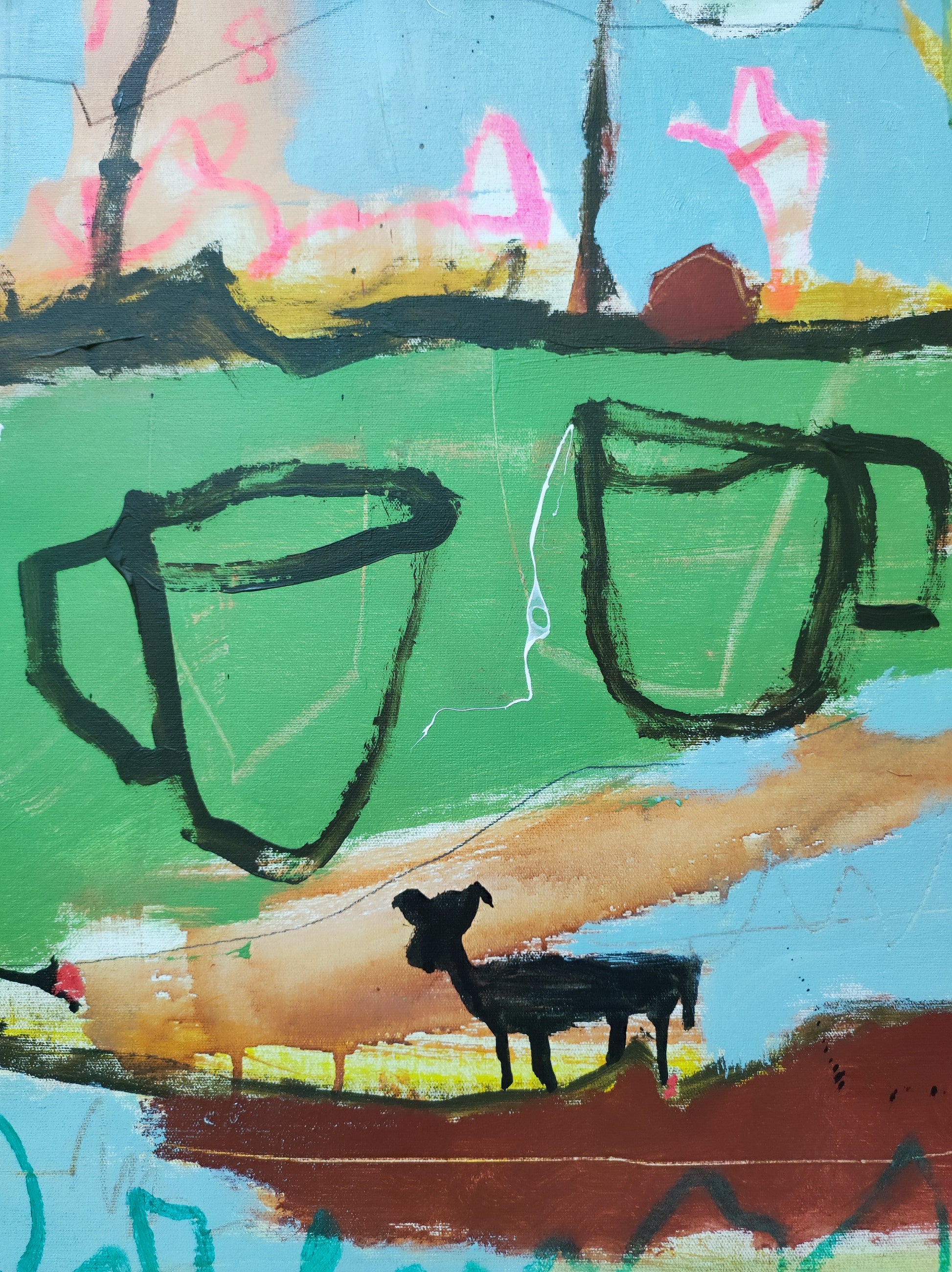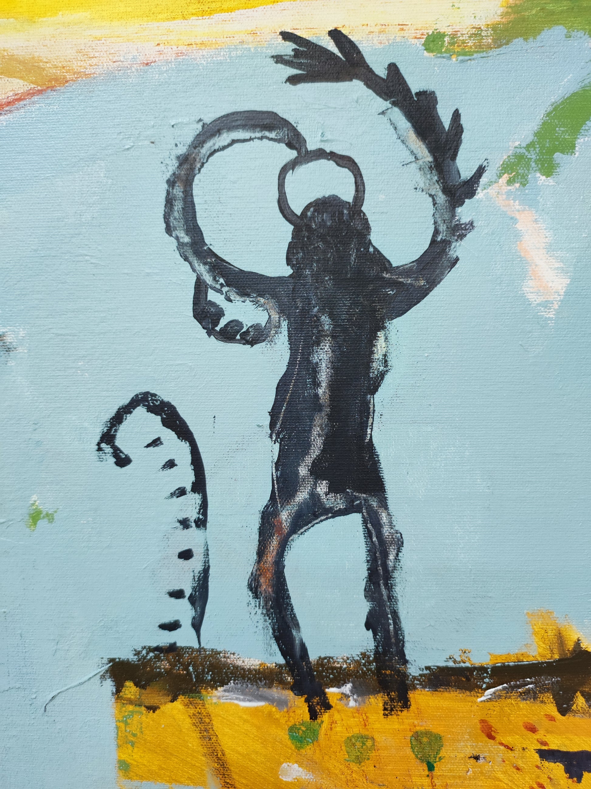 Pintura gestual, intuitiva, que deja que las cosas pasen y se apoya sobre lo que aparece. Aprovechando el accidente y aceptando las consecuencias.