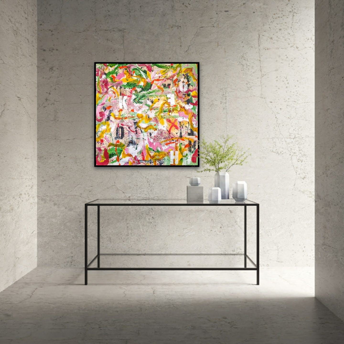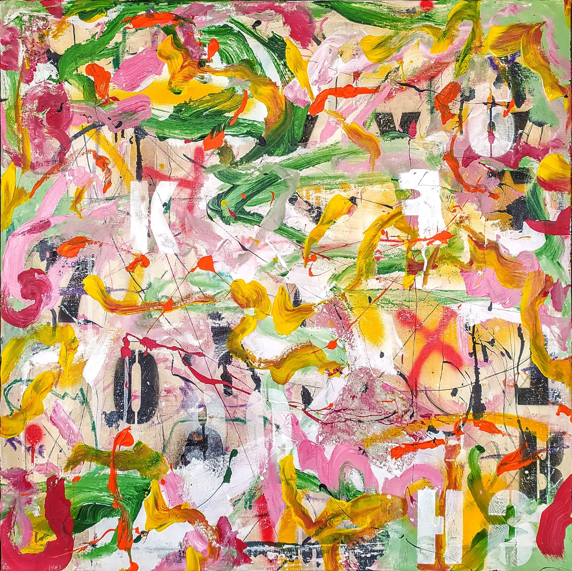 Técnica: mixed media: acrílico, pintura en spray, ceras, tintas al alcohol y collage con tela.