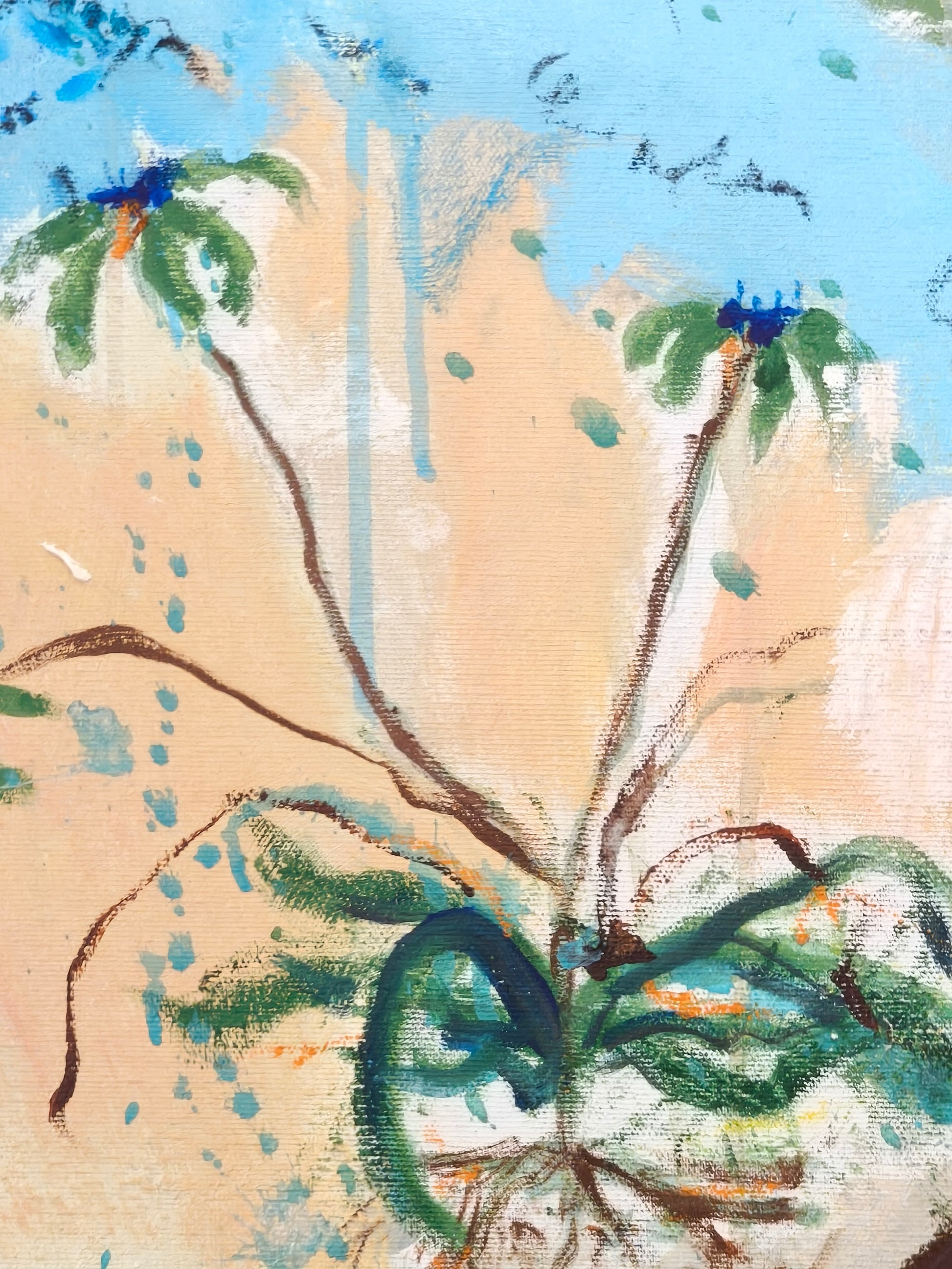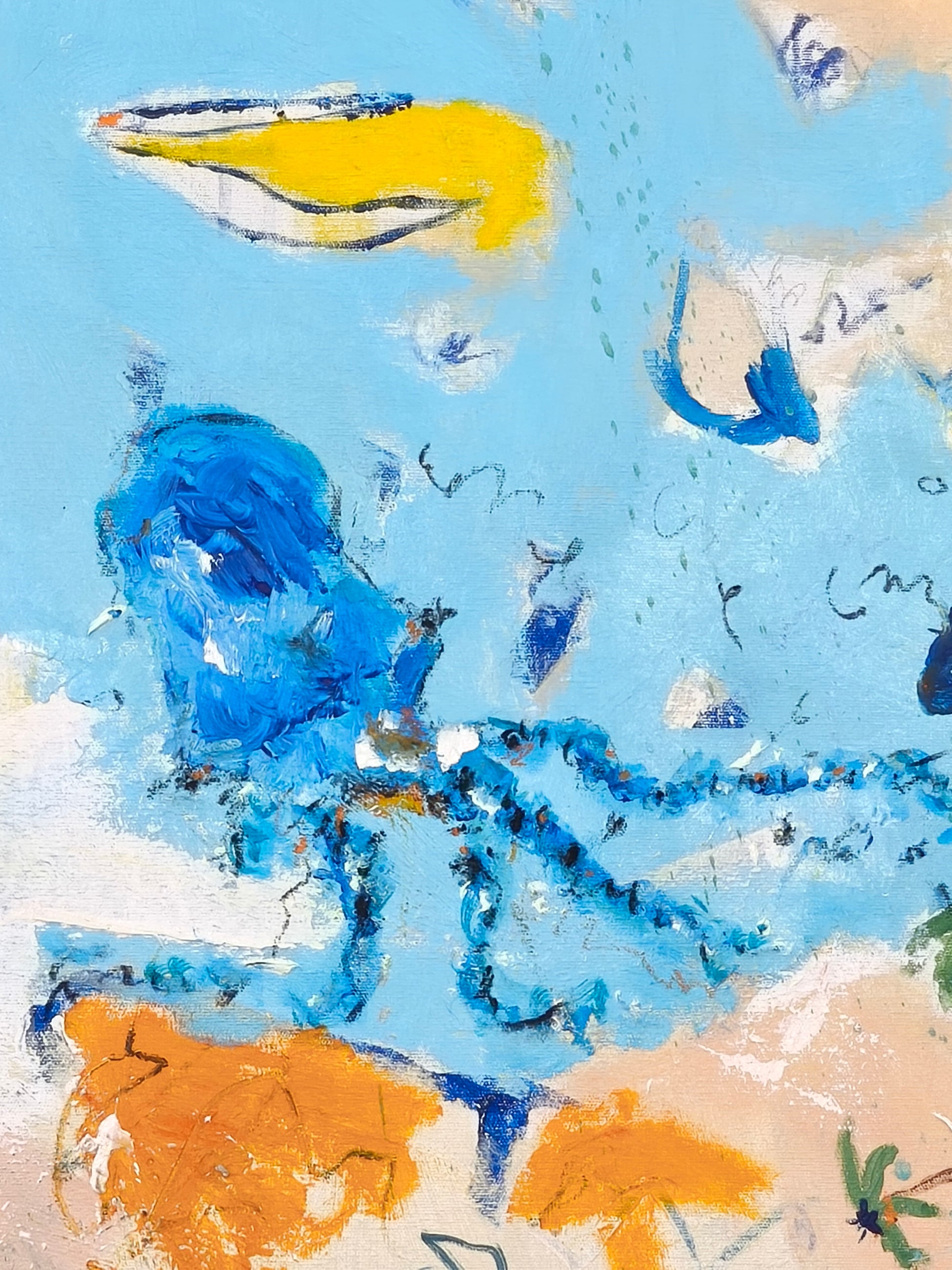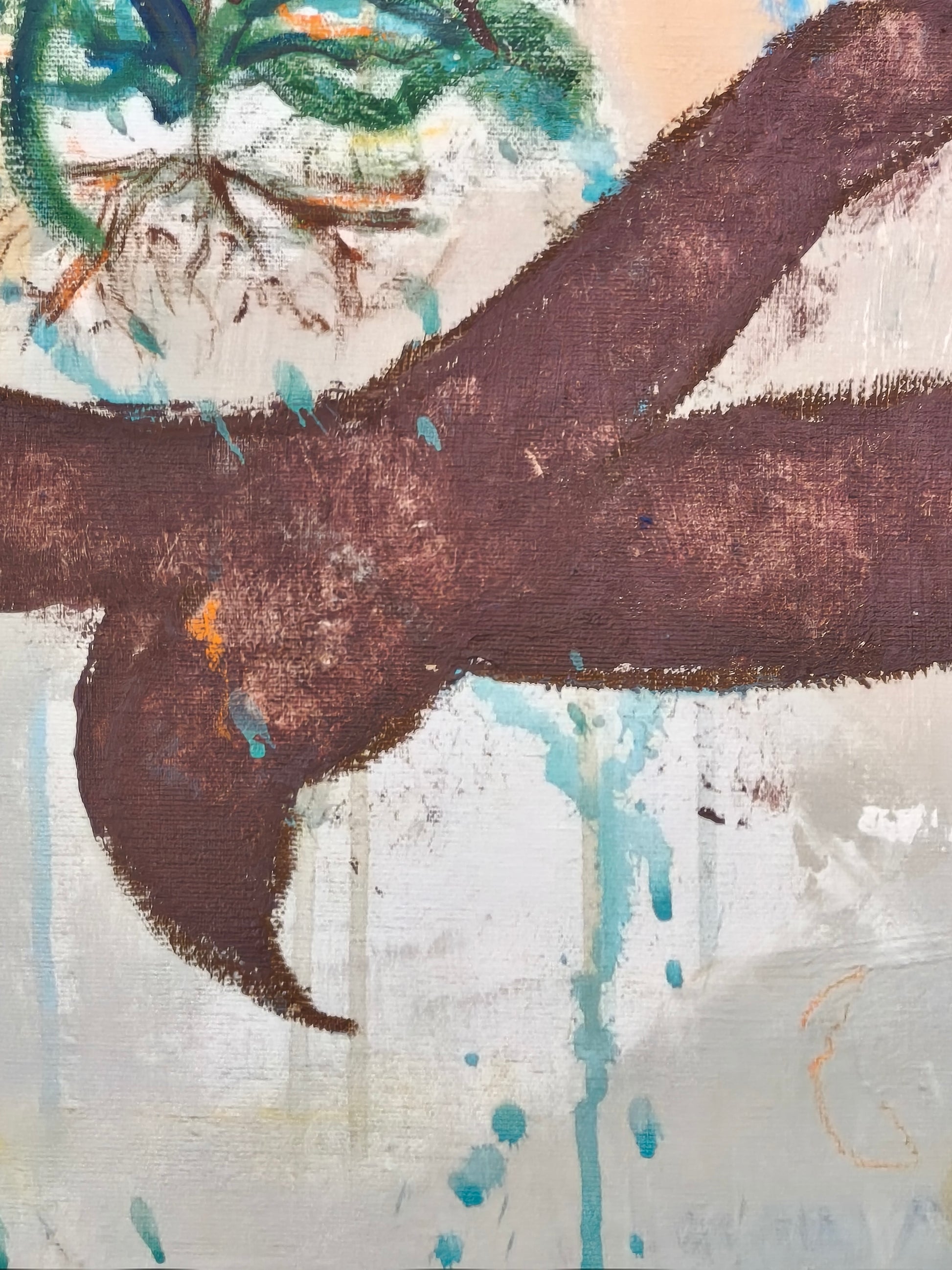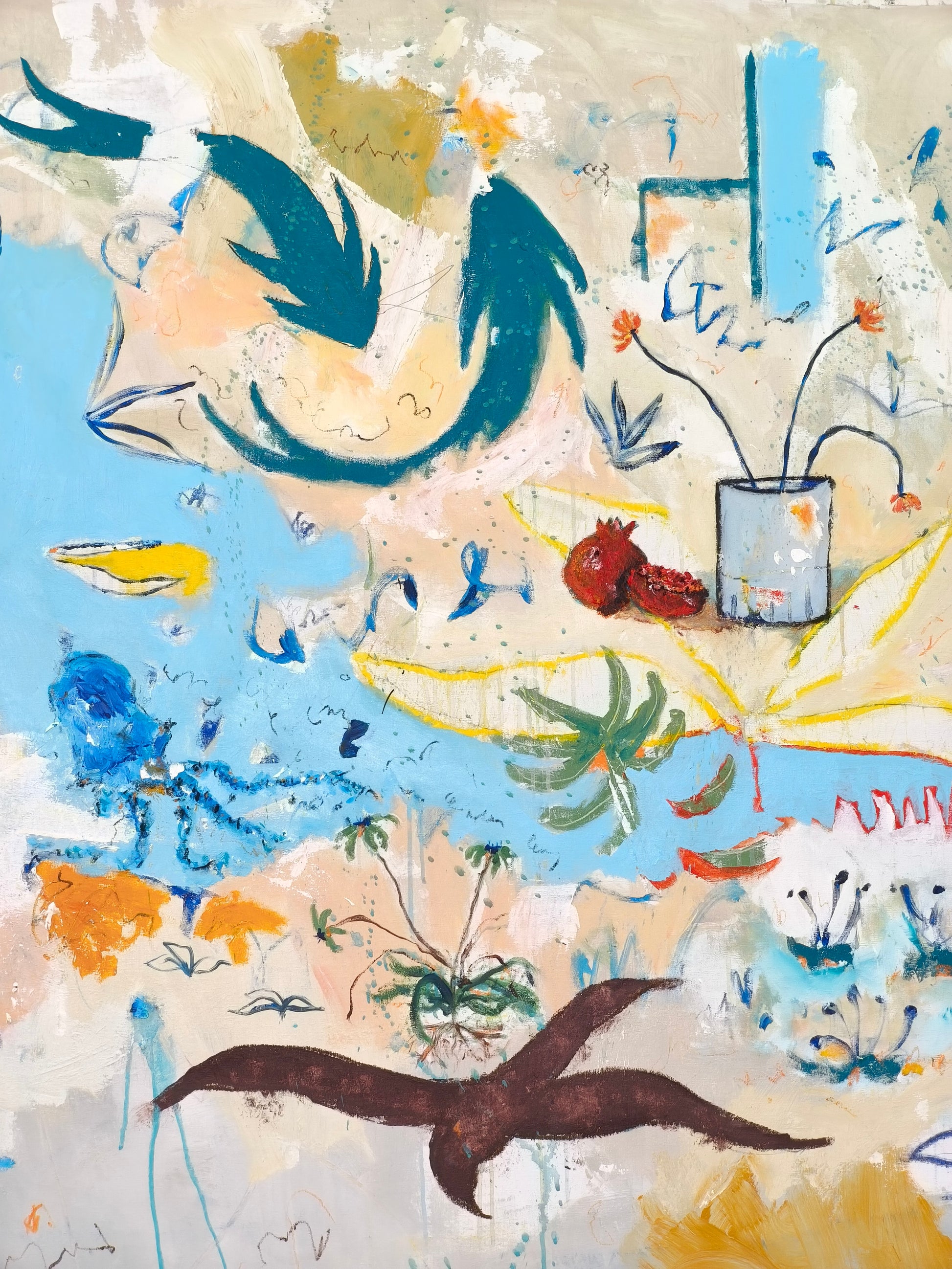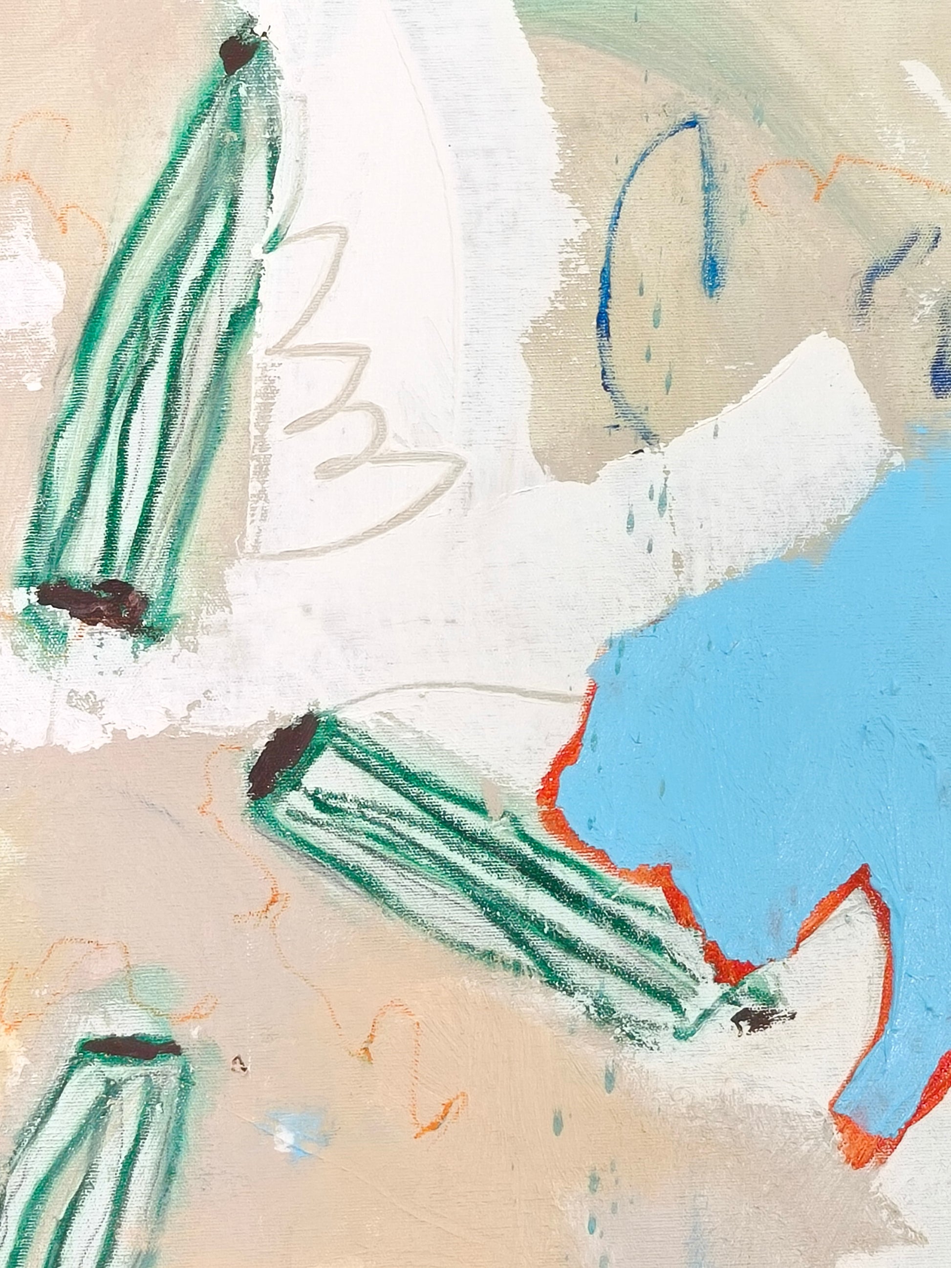 Pintura gestual, intuitiva, que deja que las cosas pasen y se apoya sobre lo que aparece. Aprovechando el accidente y aceptando las consecuencias.