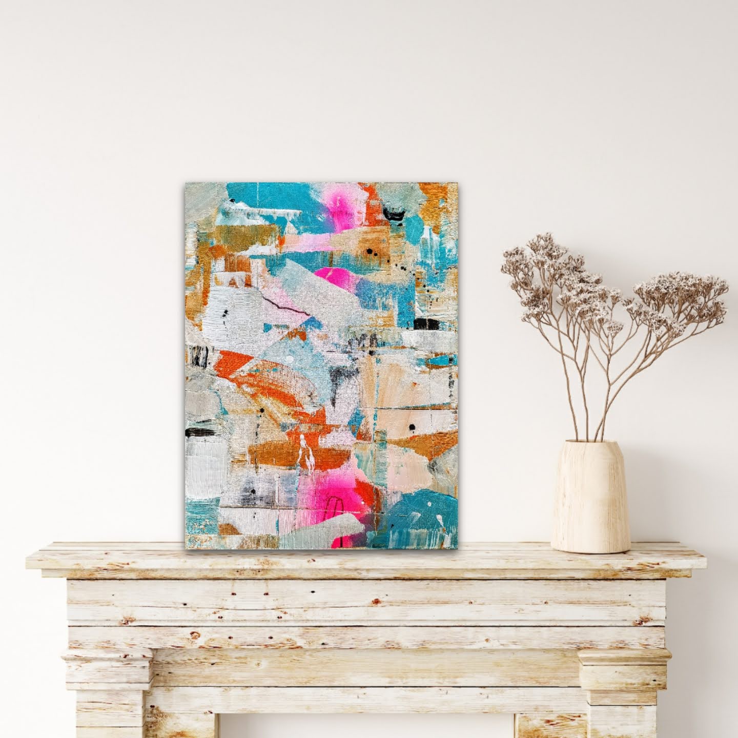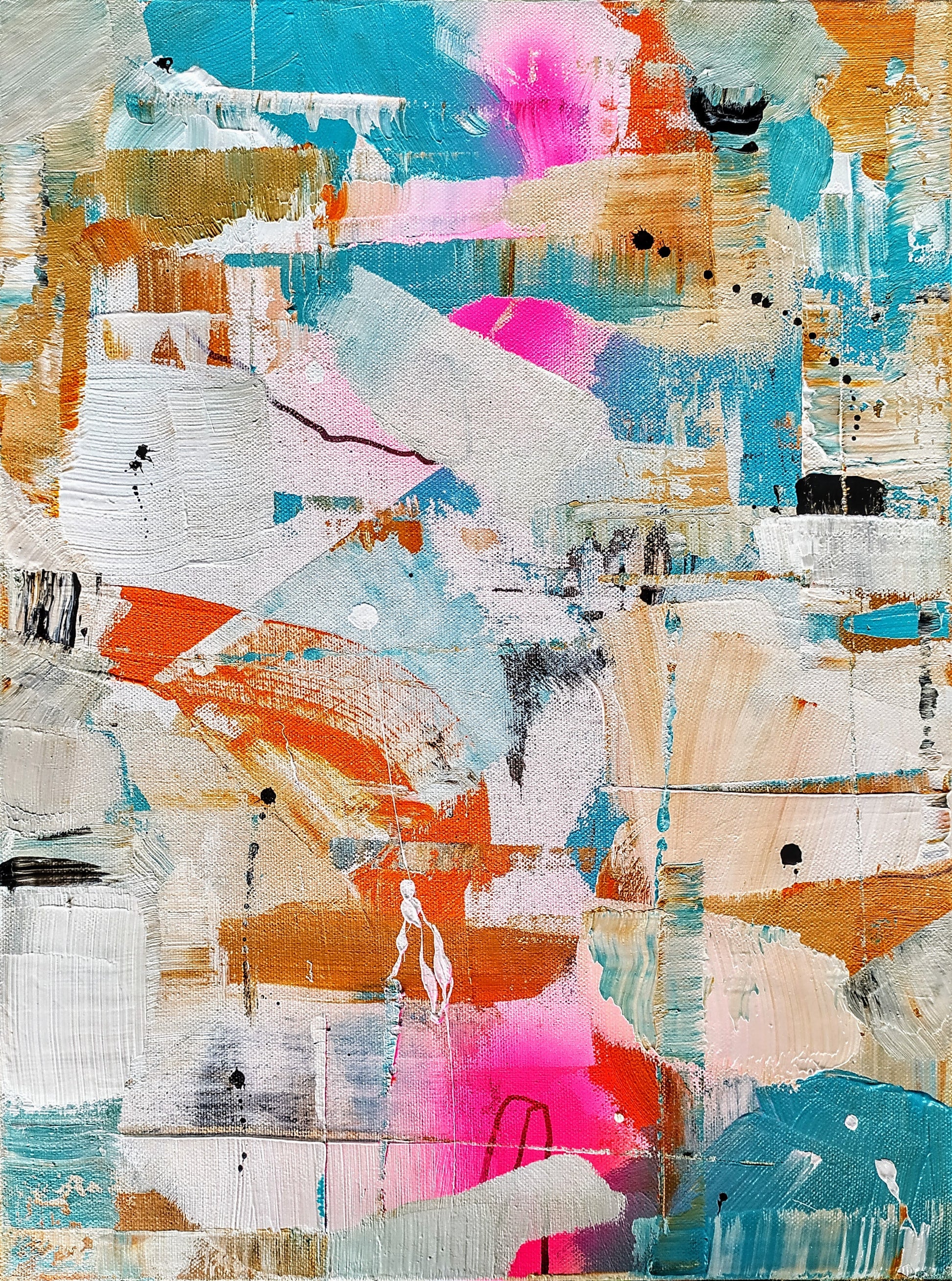 Obra perteneciente a la serie "August". 2 obras creadas con múltiples capas, sobre una base de colores ocres, naranjas, rosas y azules, homogeneizando con cremas y blancos.