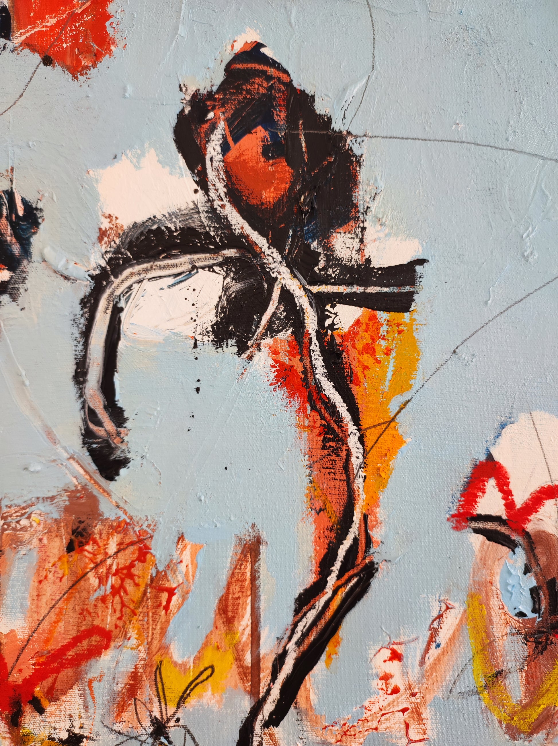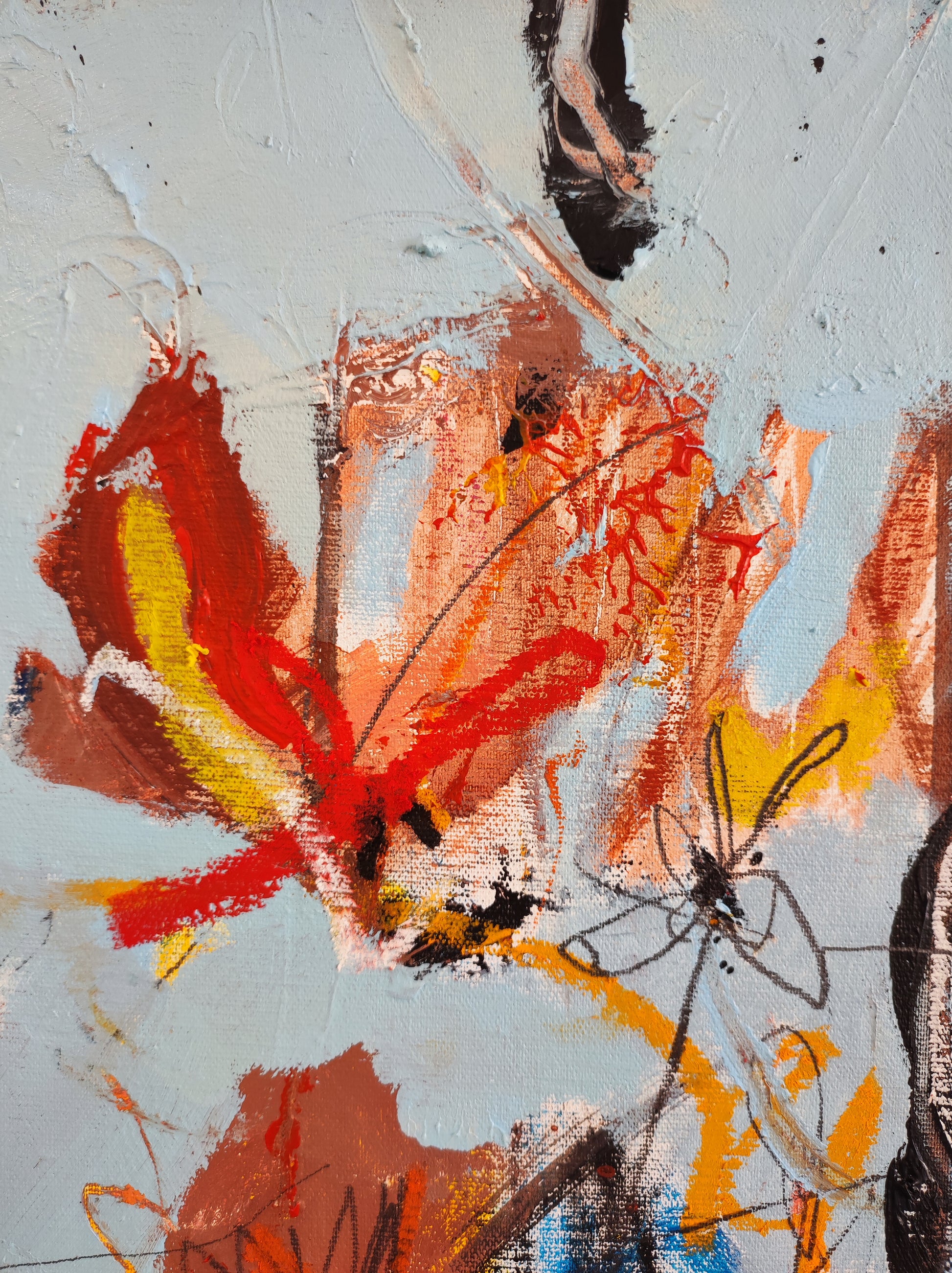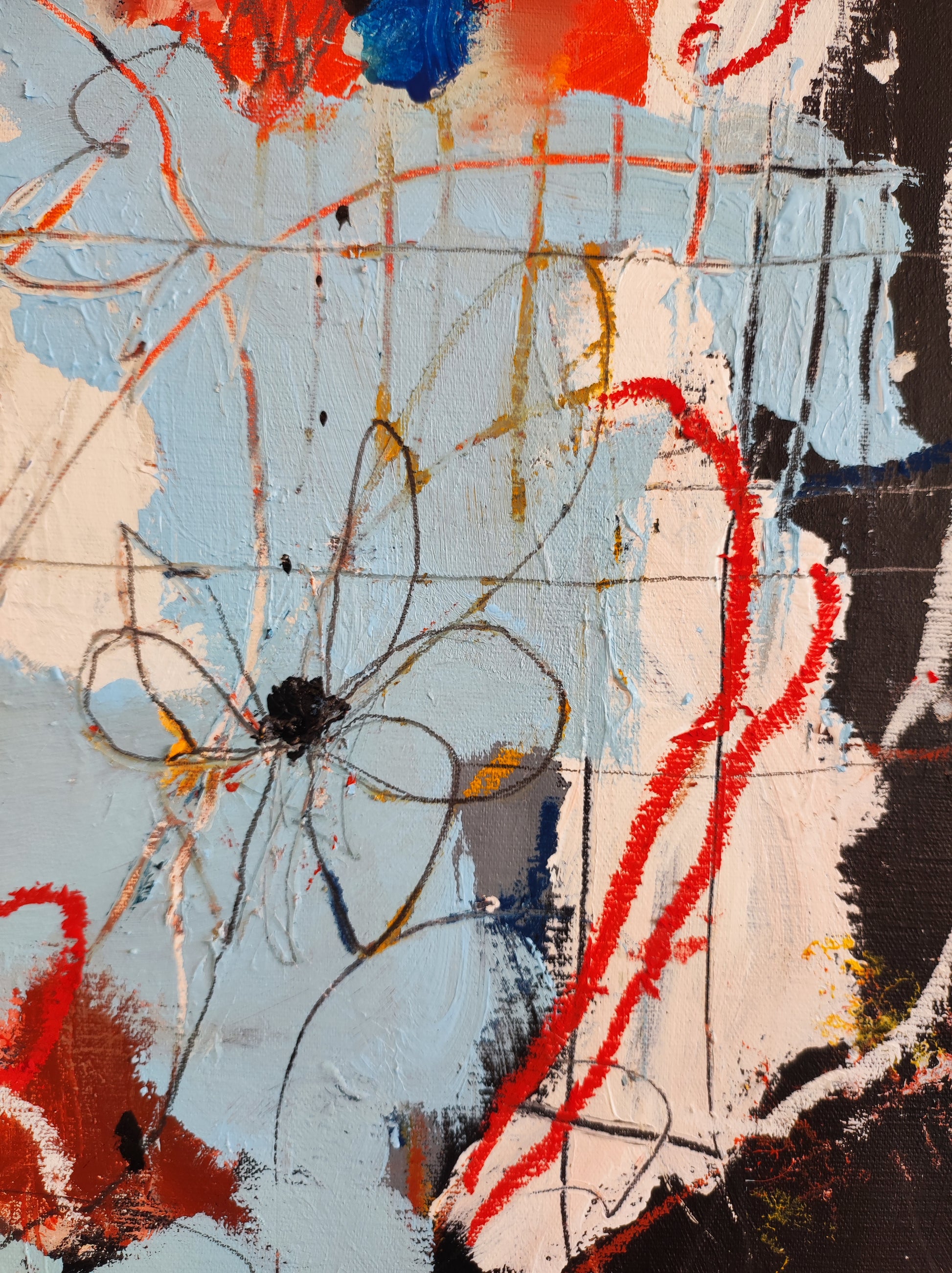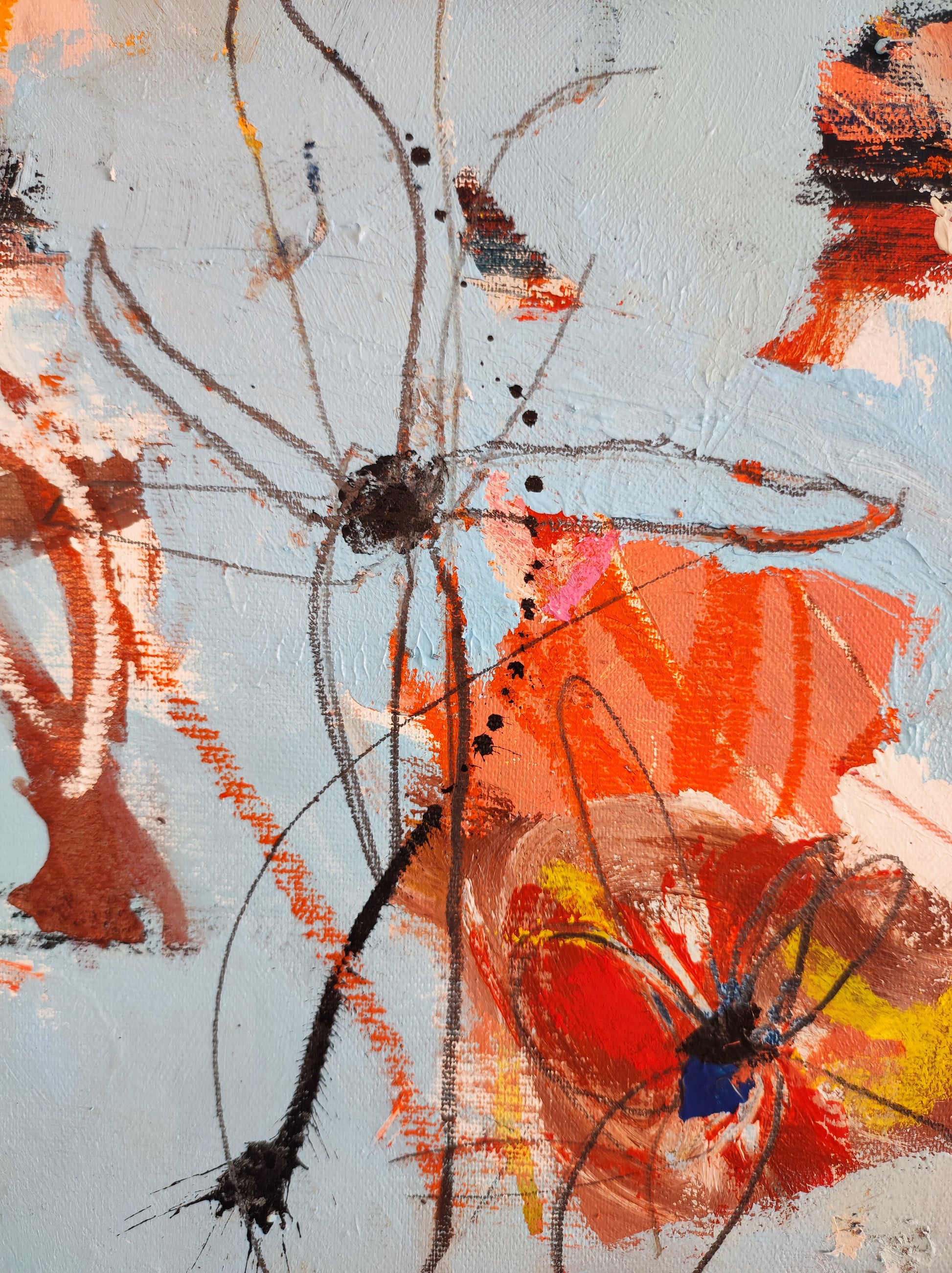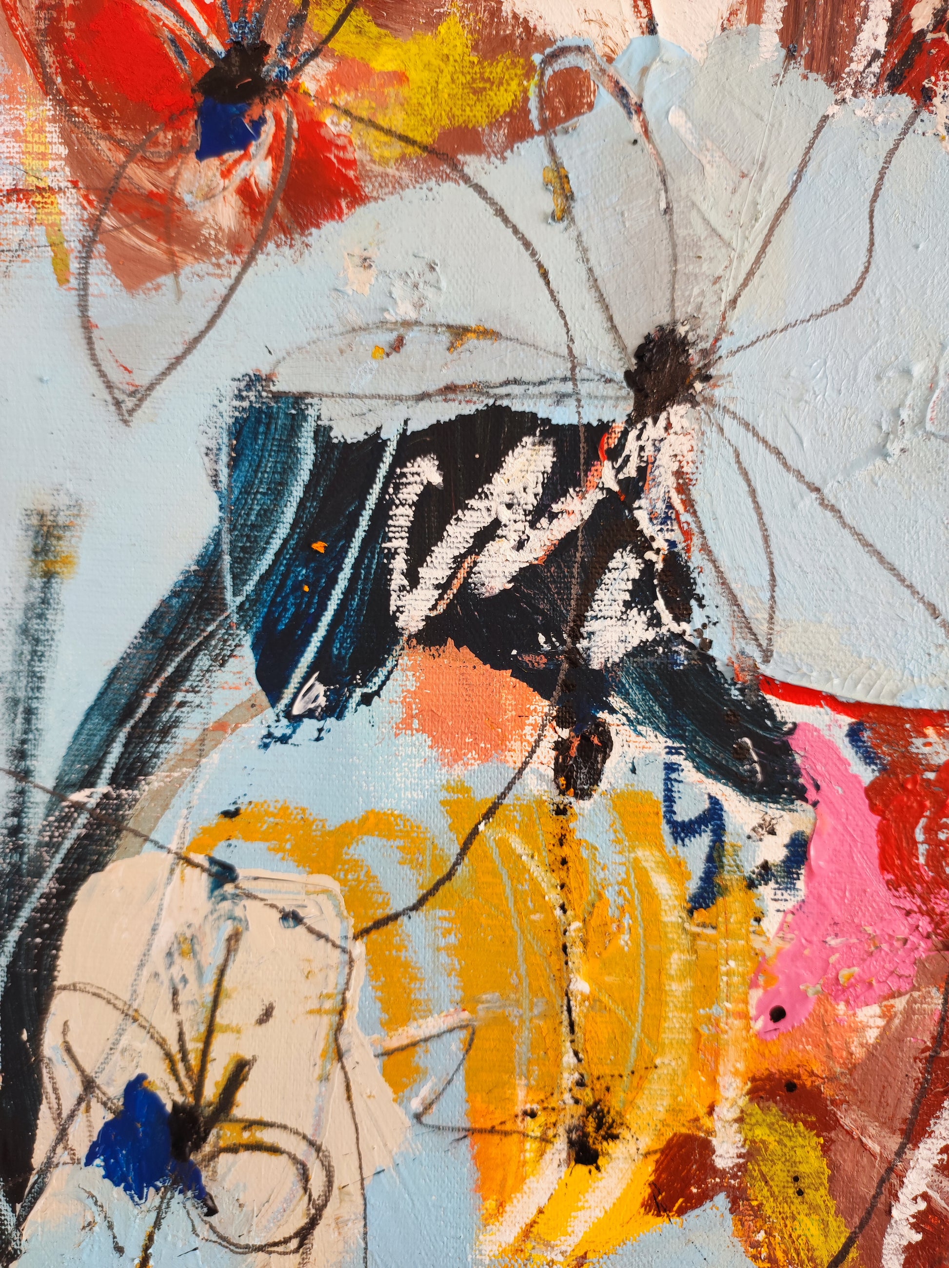De forma orgánica, intuitiva, aparecen algunas formas, flores, fragmentos de cosas. Todo muy sugerido y sin forzar. Dejando que las cosas pasen más que provocando que ocurran. Se aprovecha lo que surge y se construye a partir de ahí. Se aprovecha el accidente y se aceptan las consecuencias.