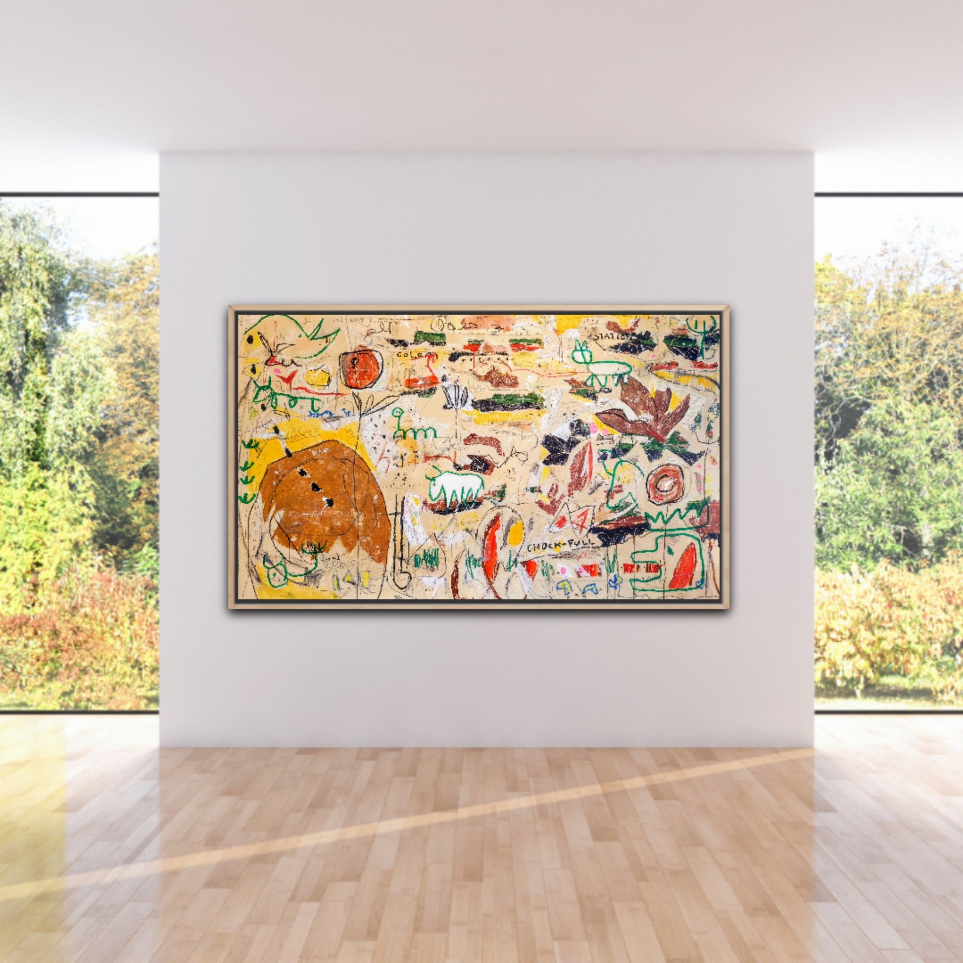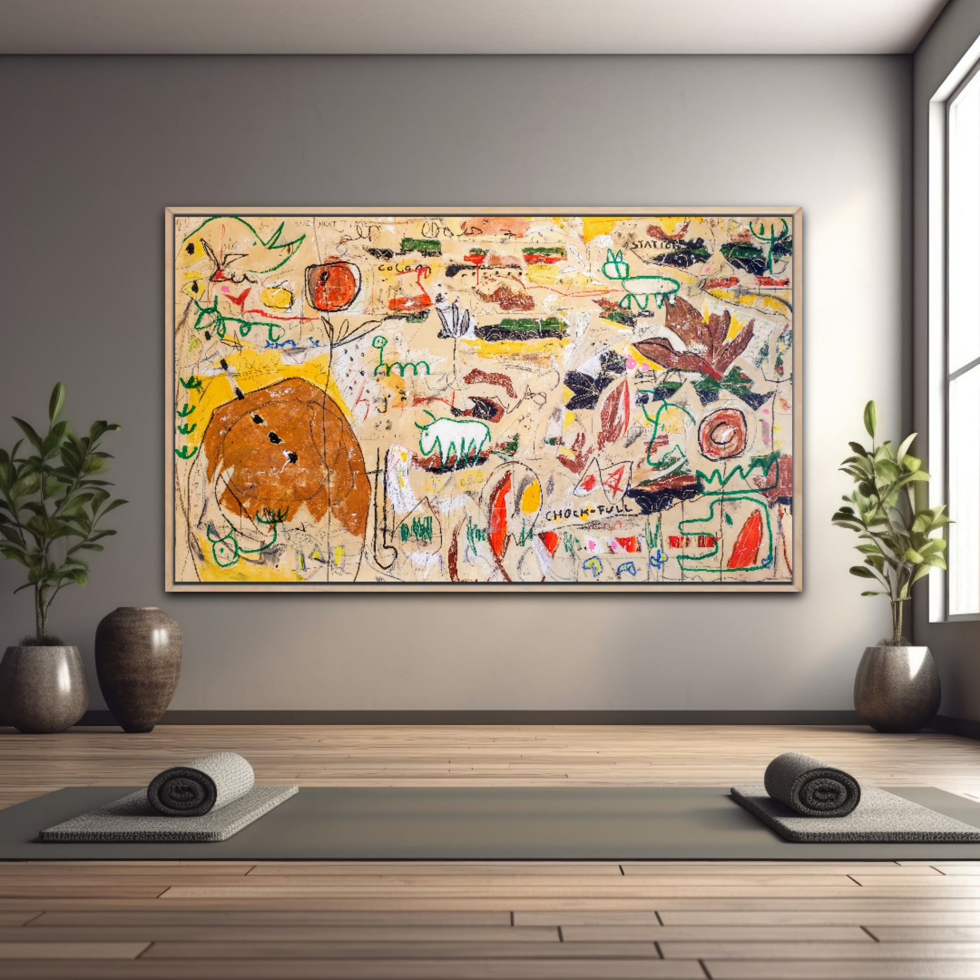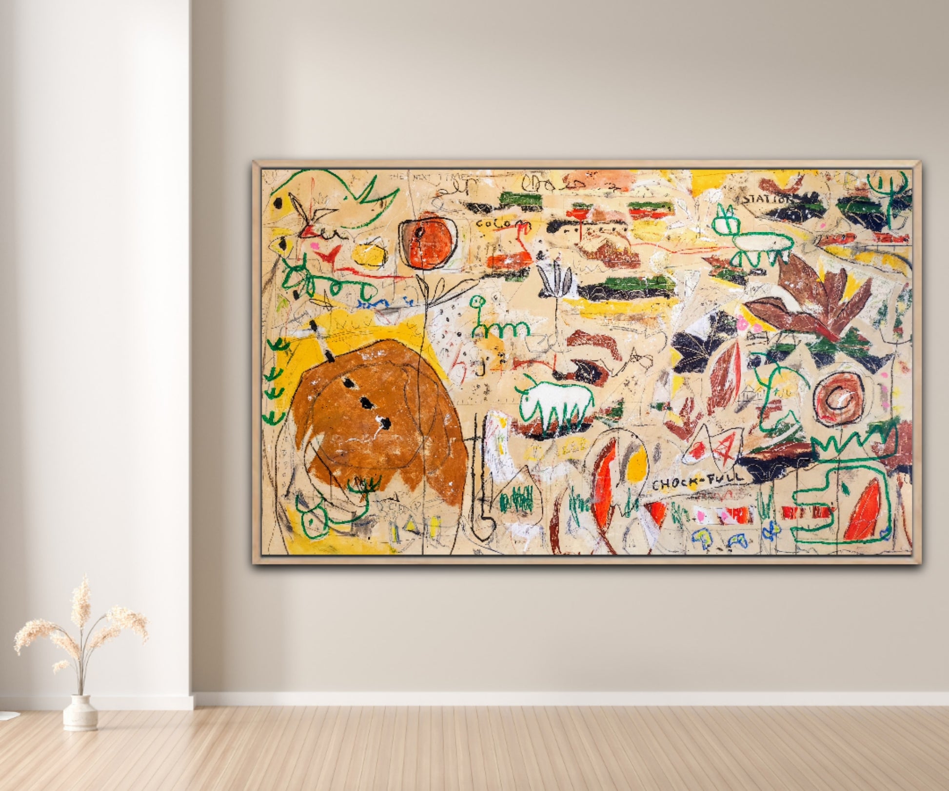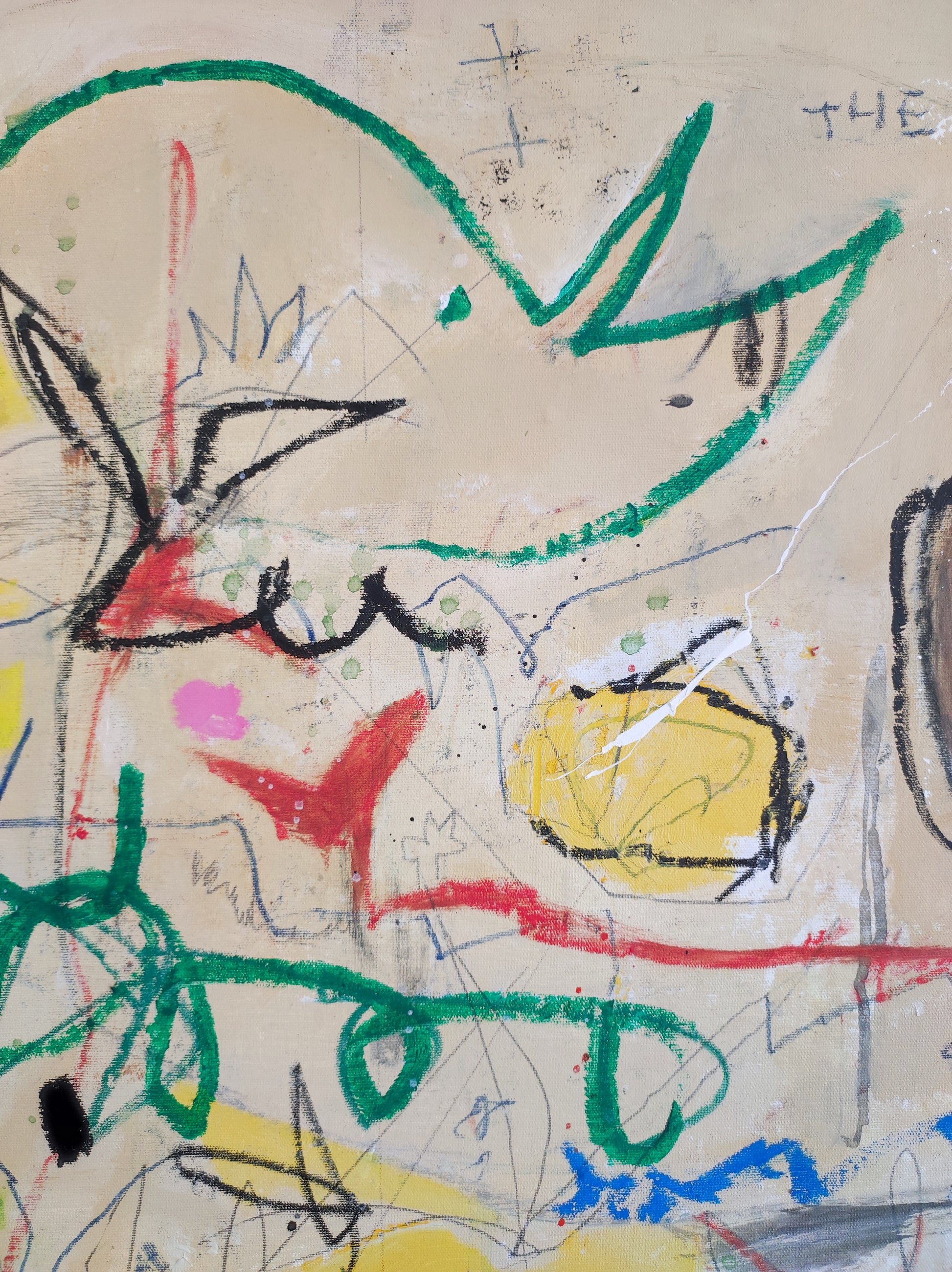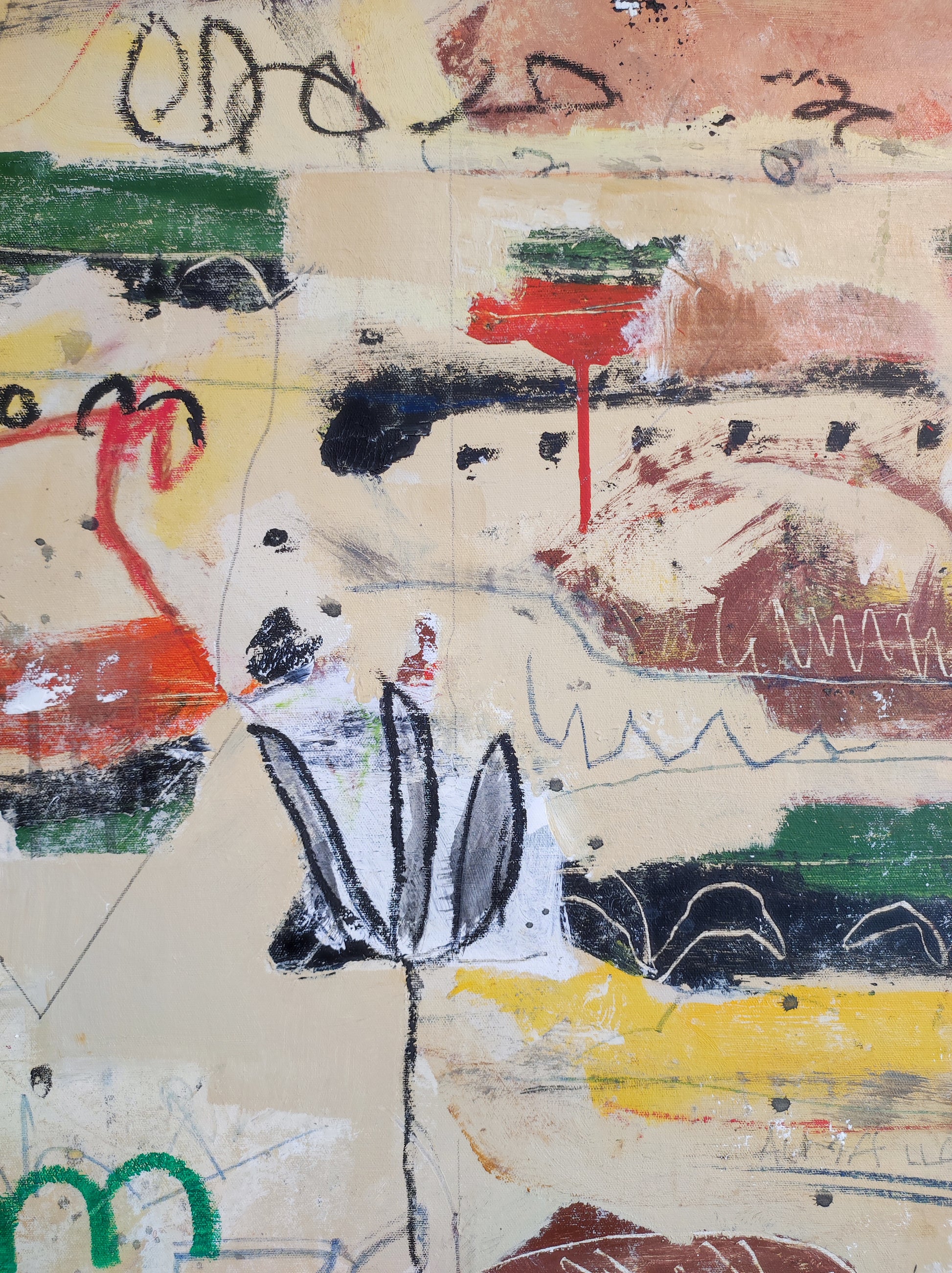 Técnica: acrílico, gesso, tinta china, ceras, pastel, carboncillo y lápiz.