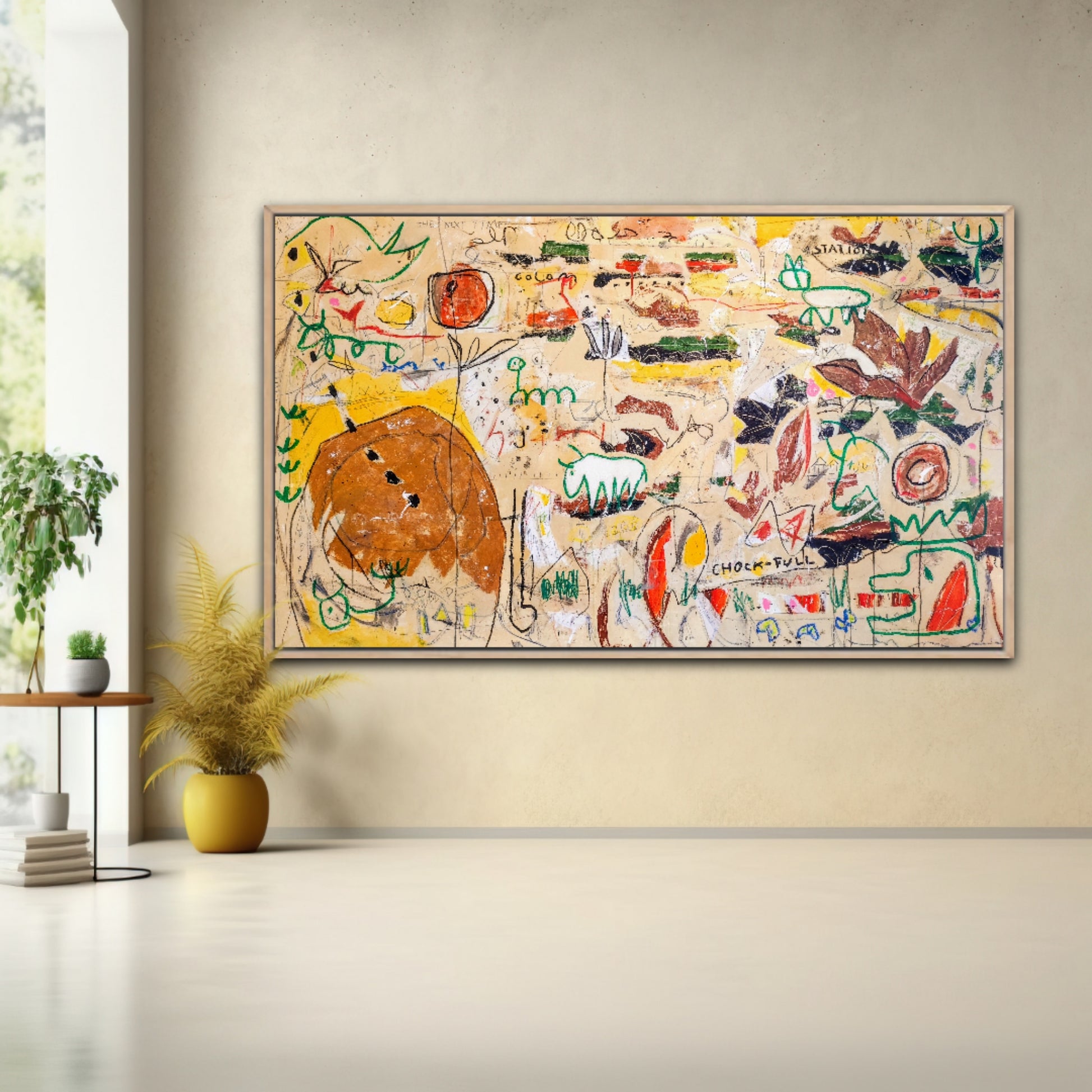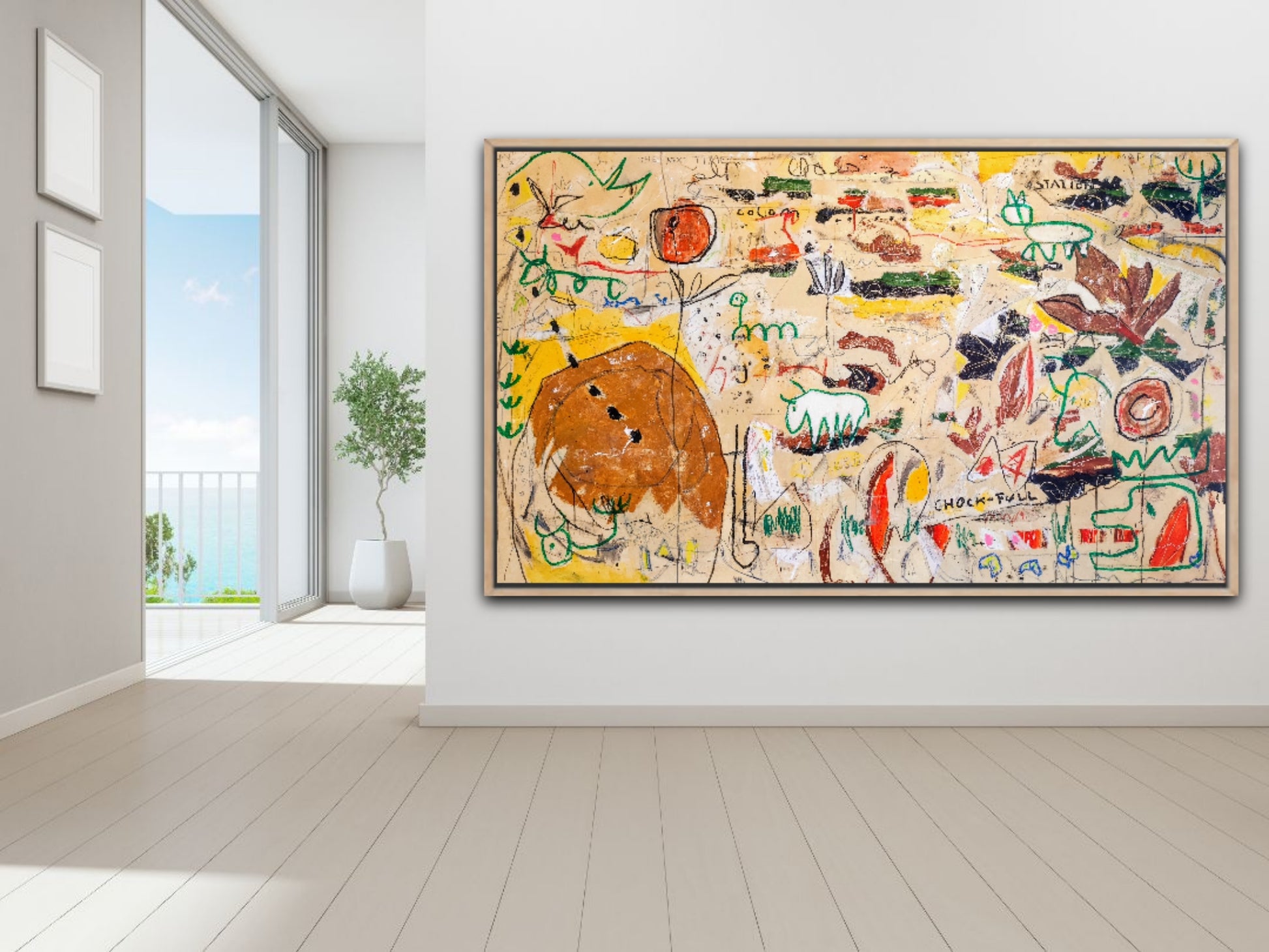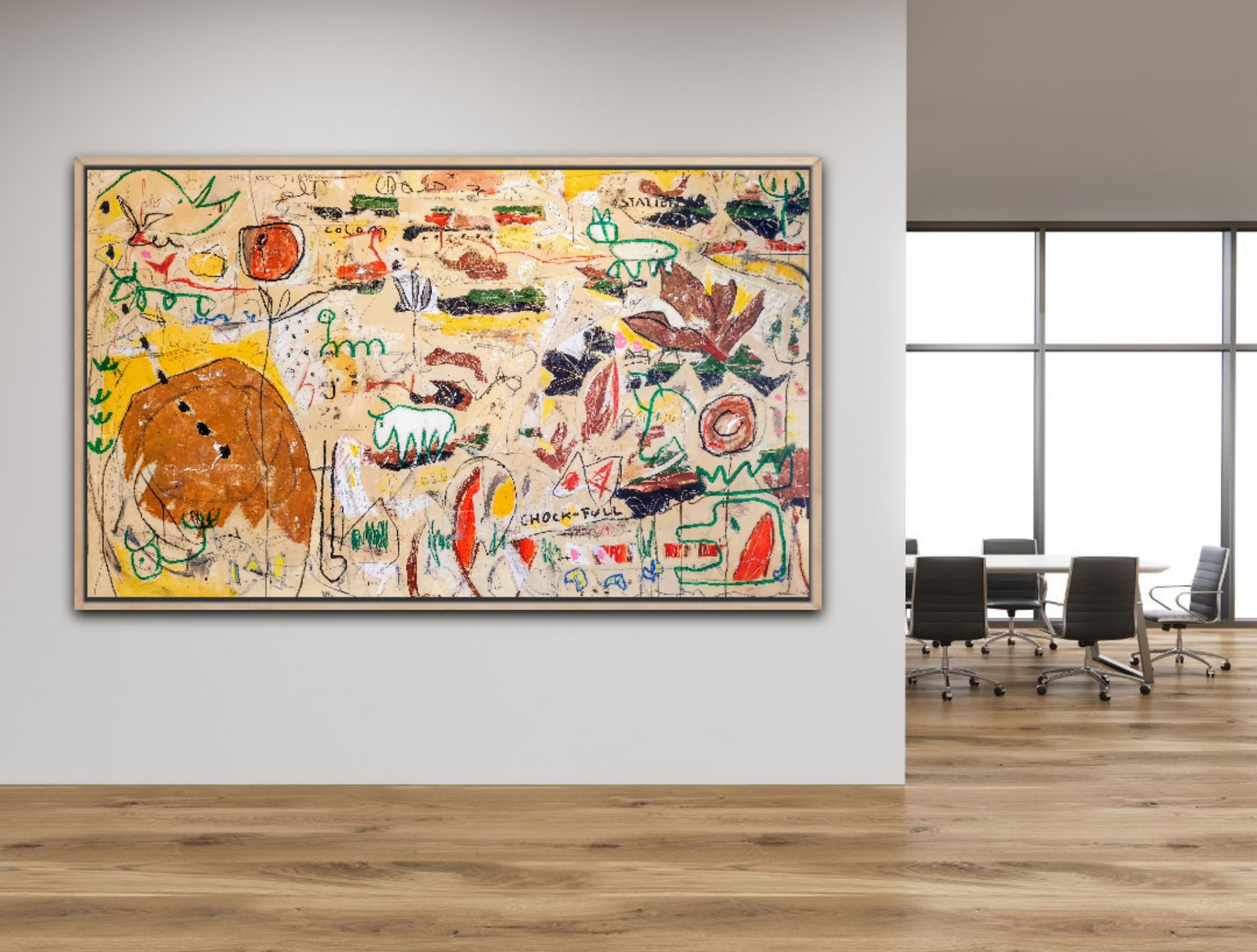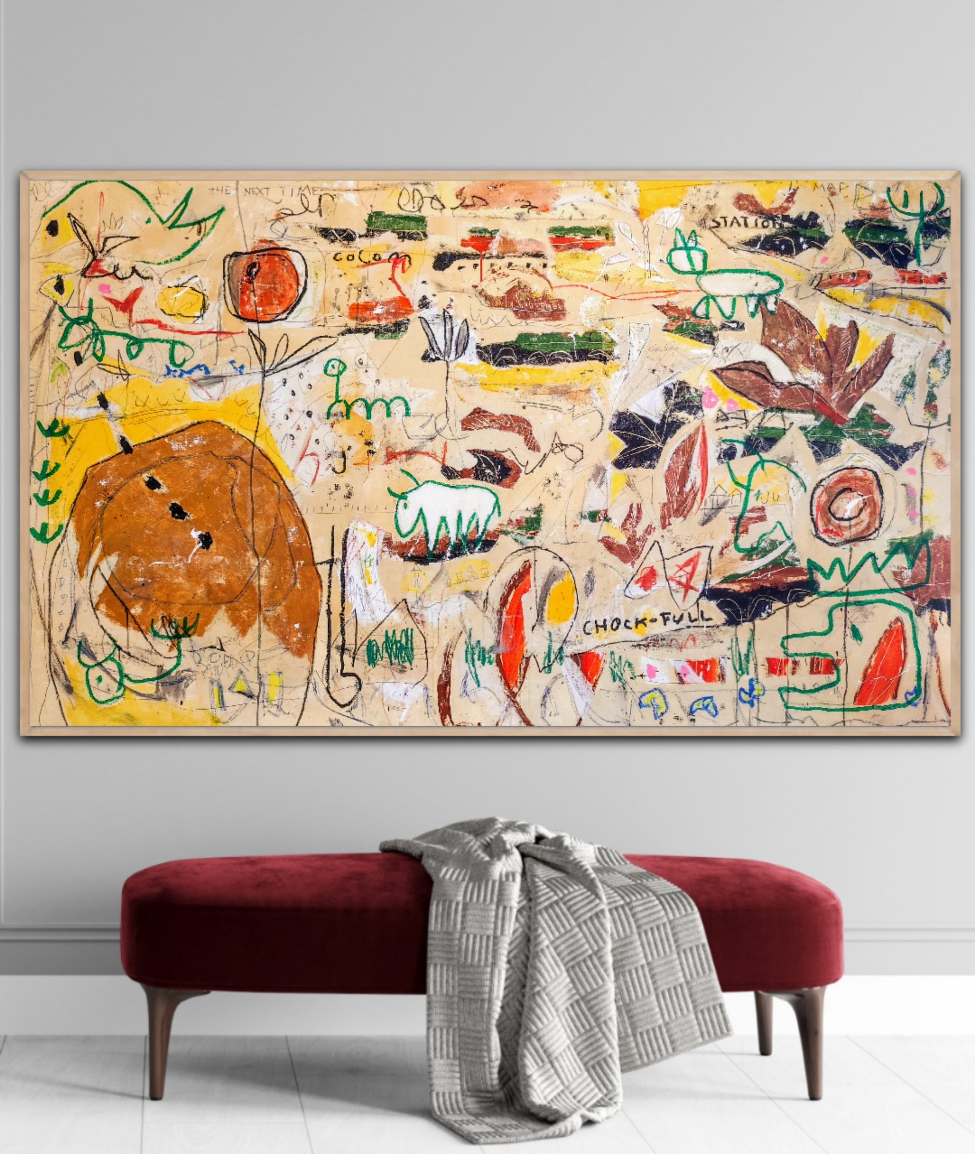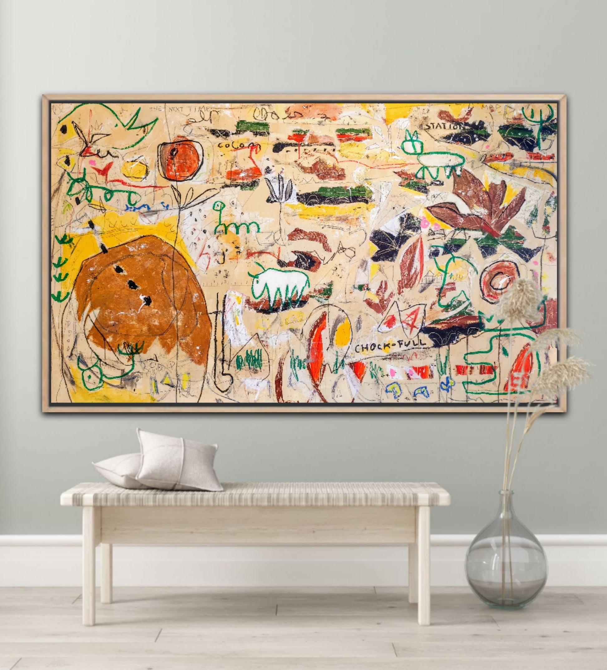 Técnica: acrílico, gesso, tinta china, ceras, pastel, carboncillo y lápiz.