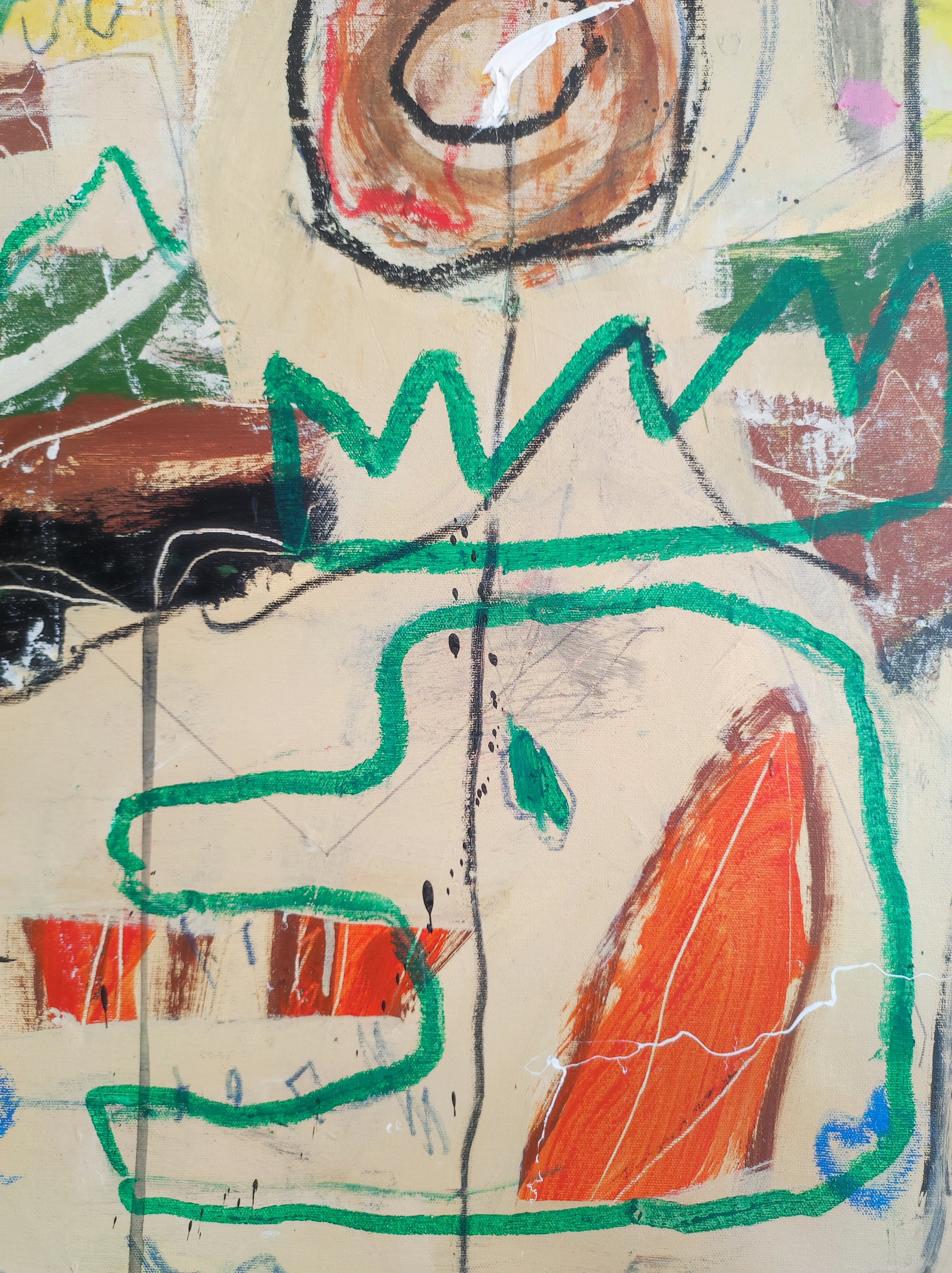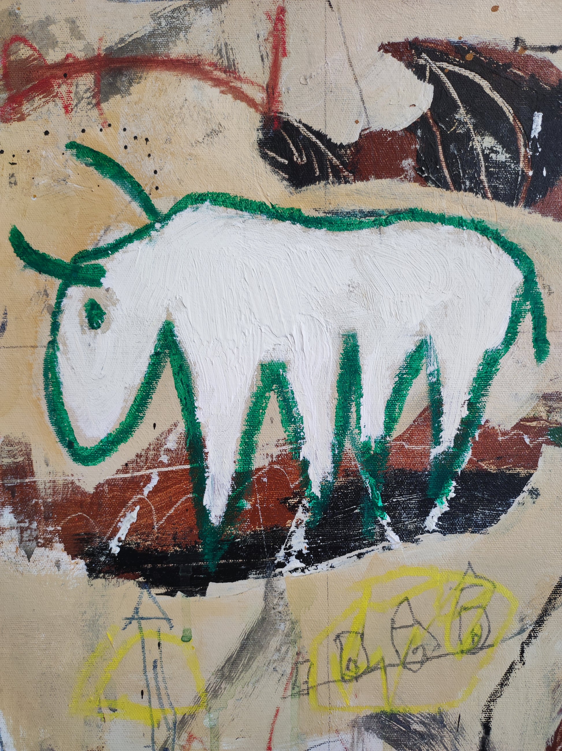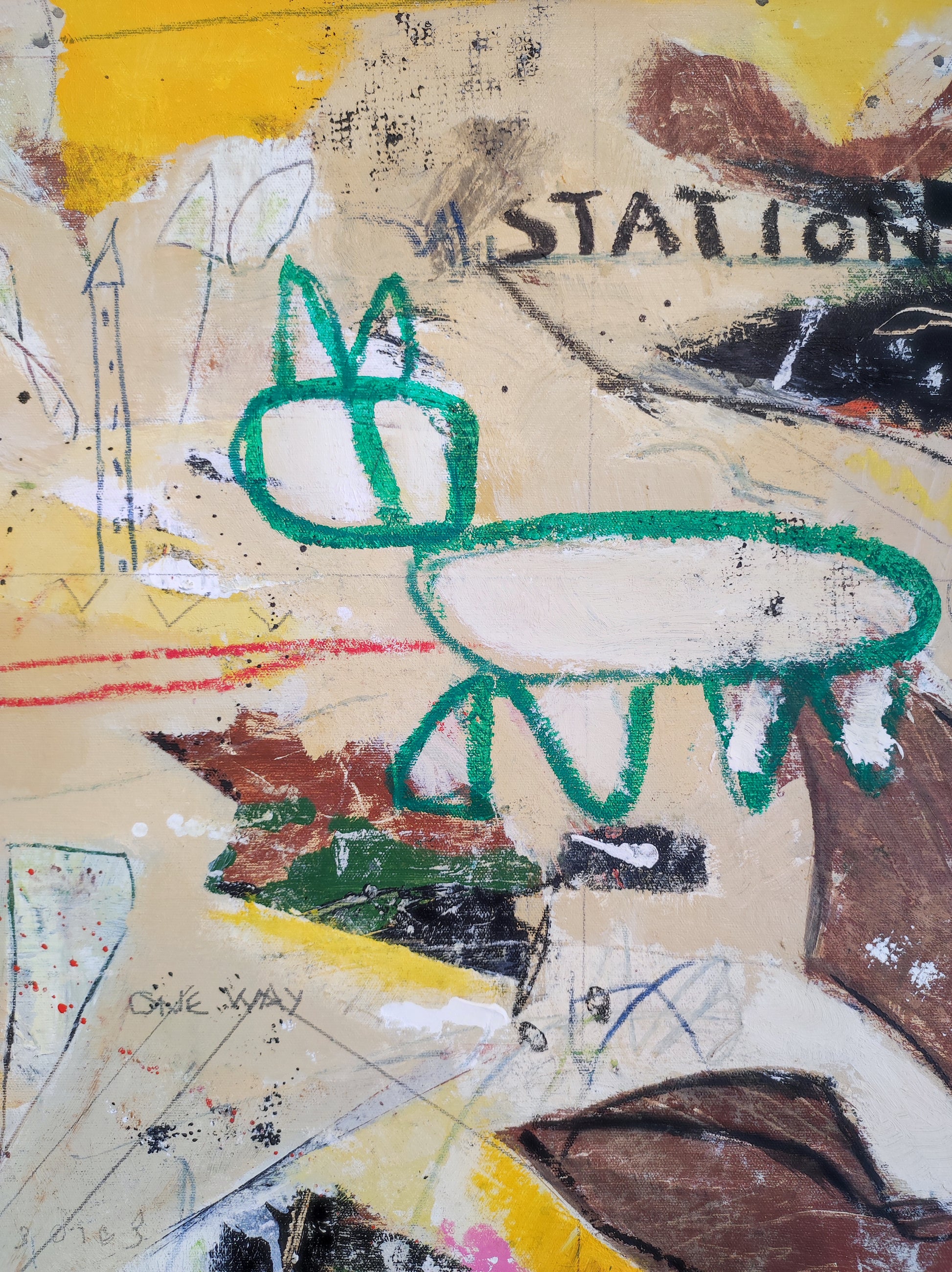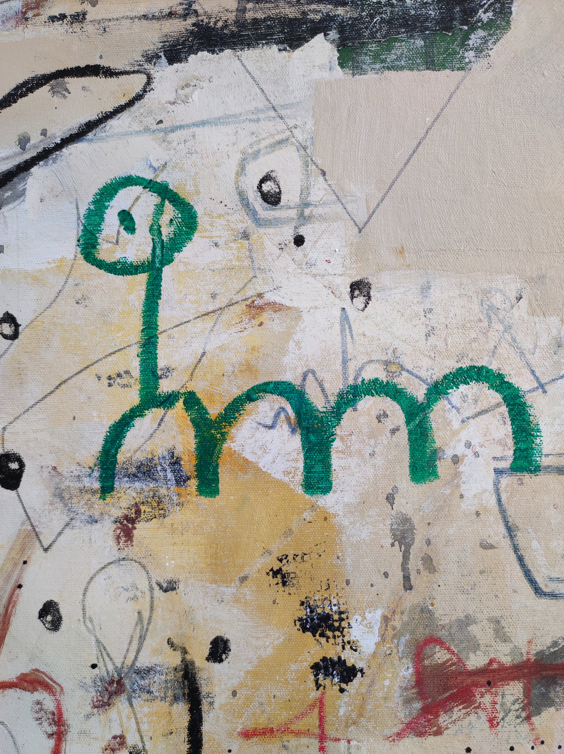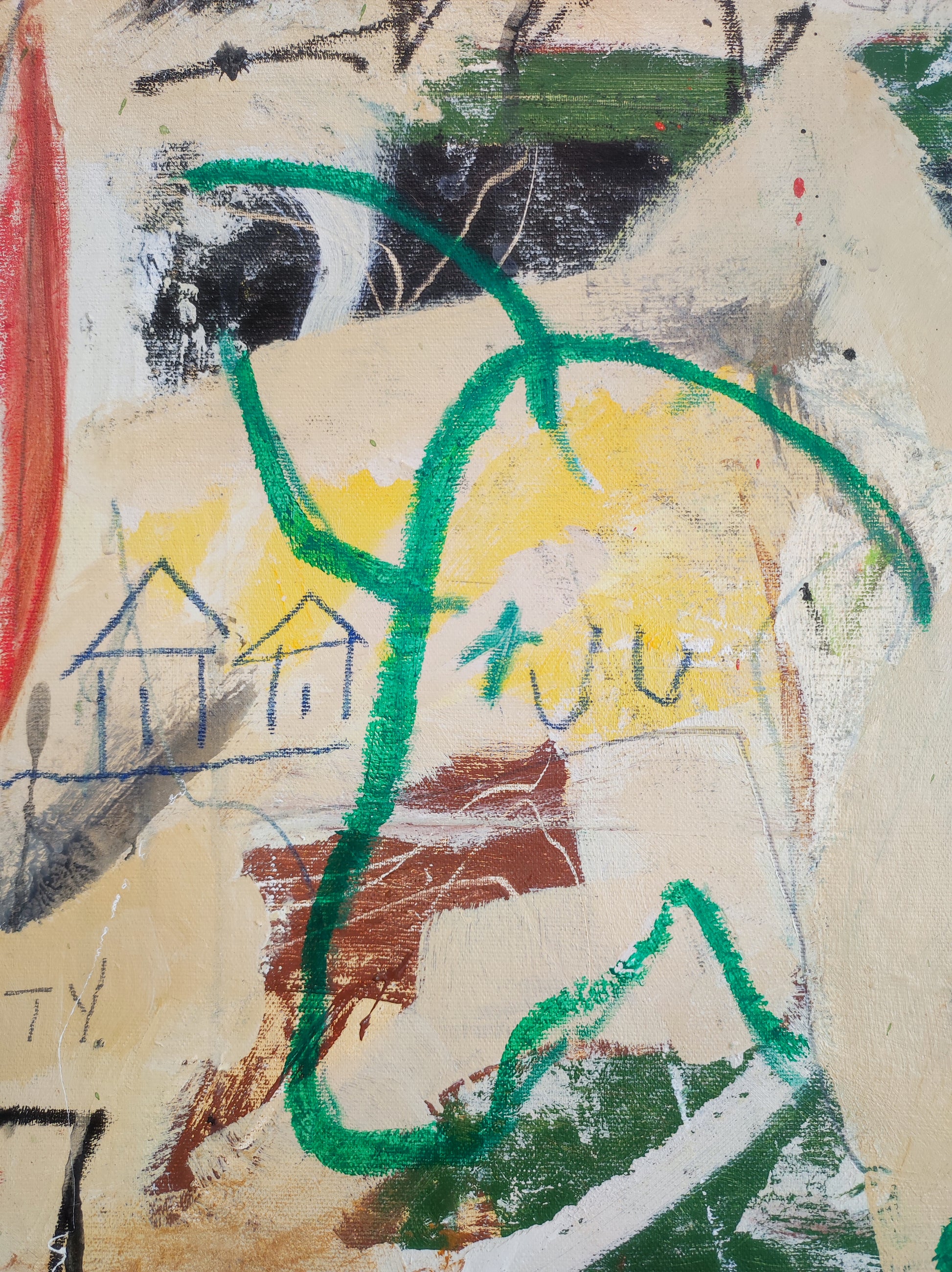 Obra desarrollada mediante múltiples capas. Lo nuevo va tapando a lo antiguo pero siempre queda un rastro. Pintura gestual e intuitiva donde los dibujos, las manchas y las marcas van encajando poco a poco, sin forzar.