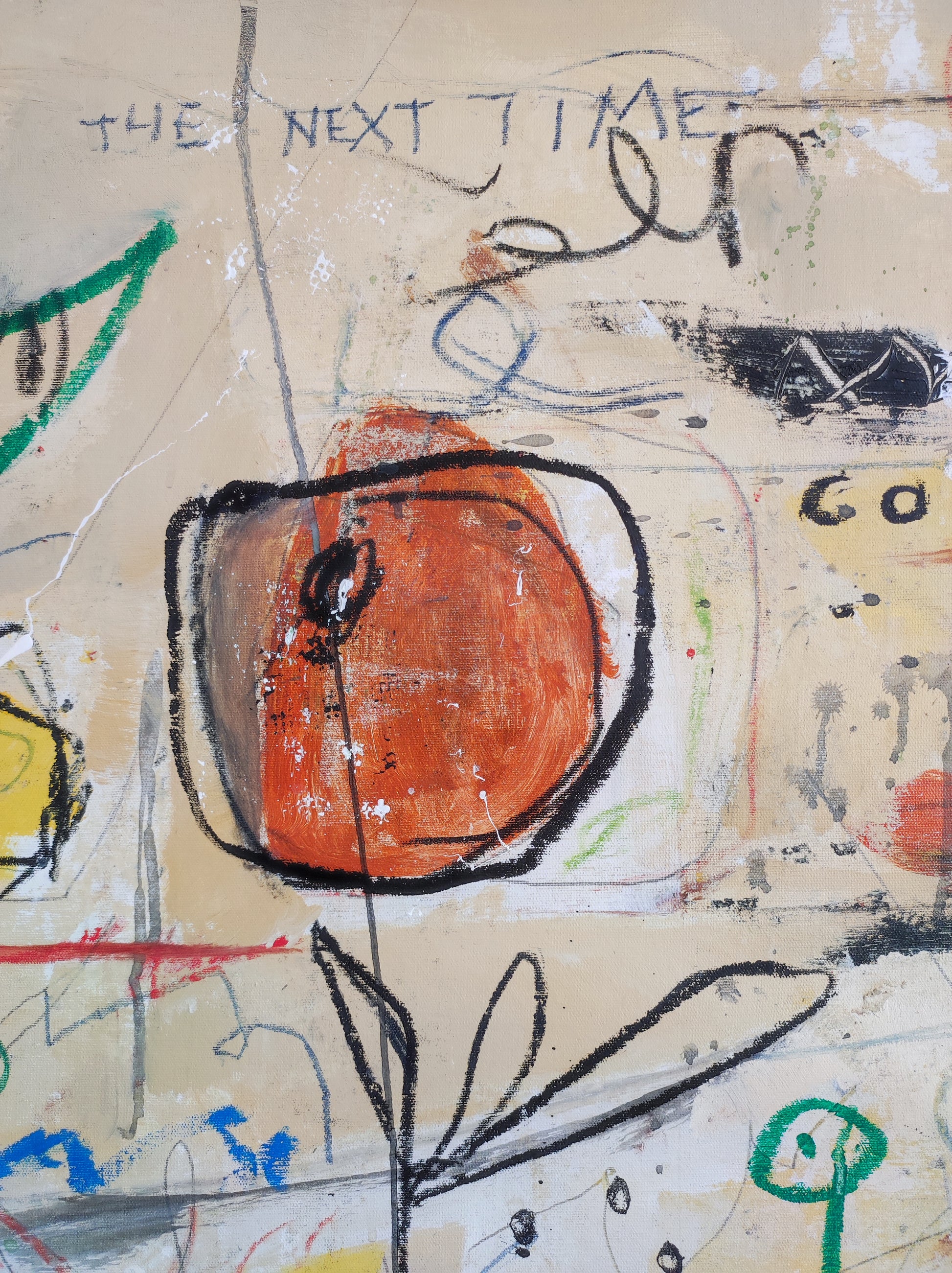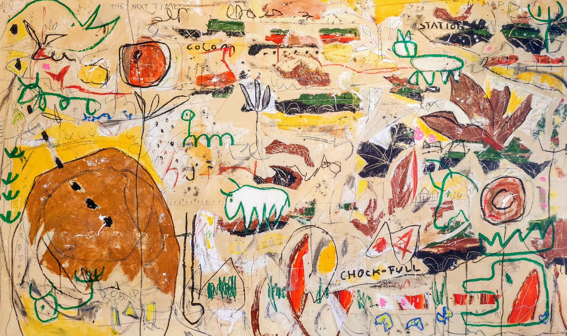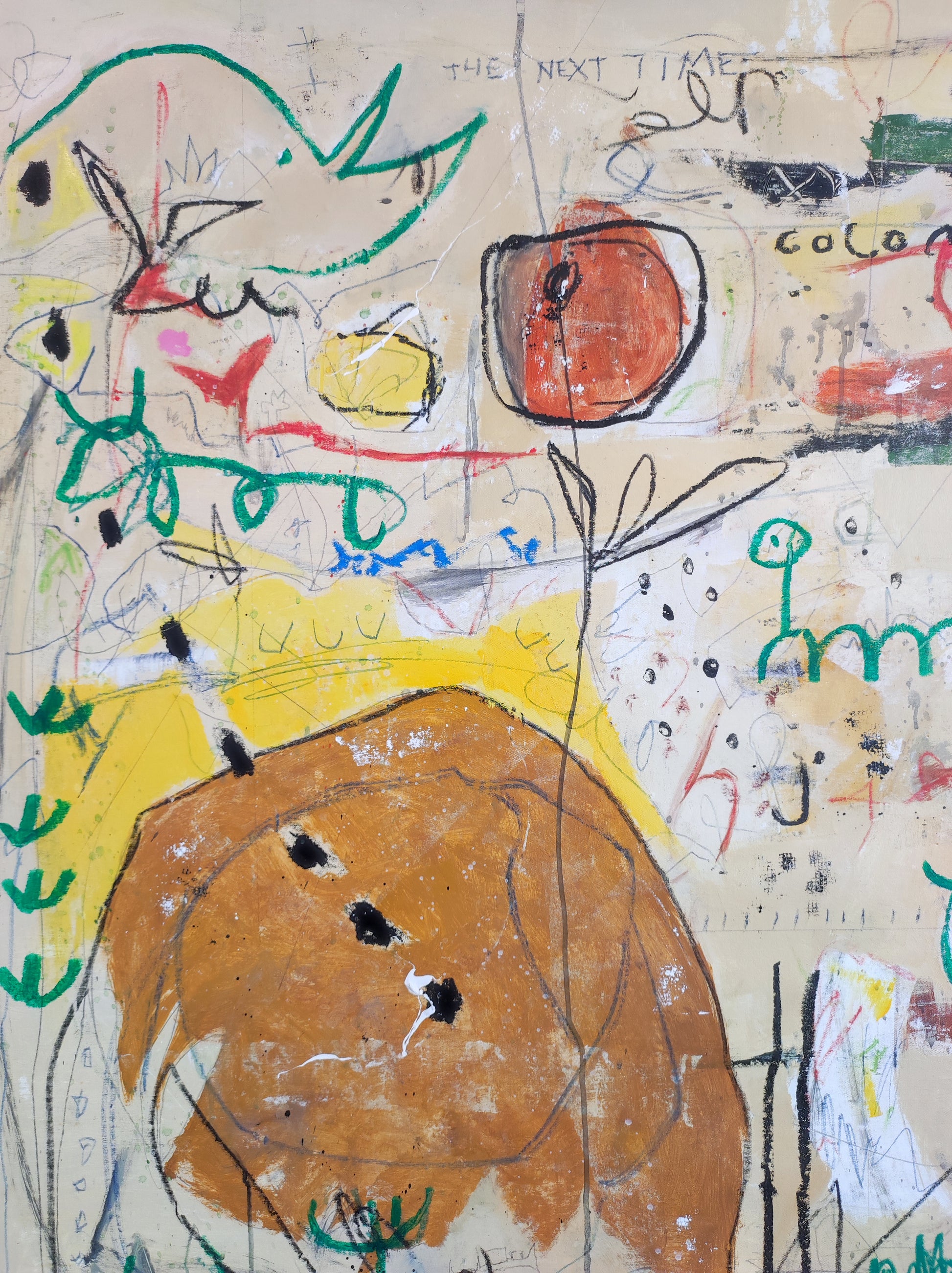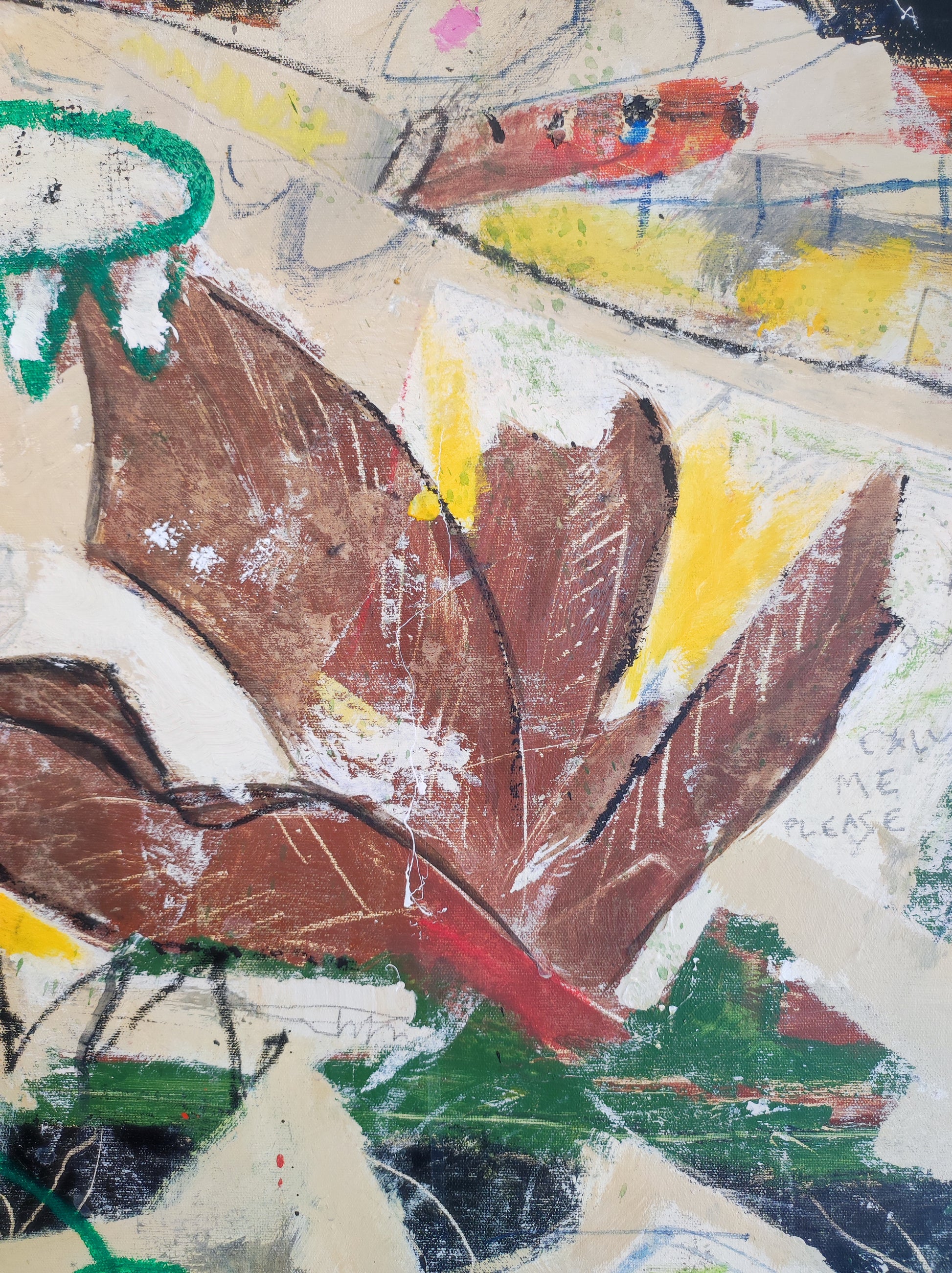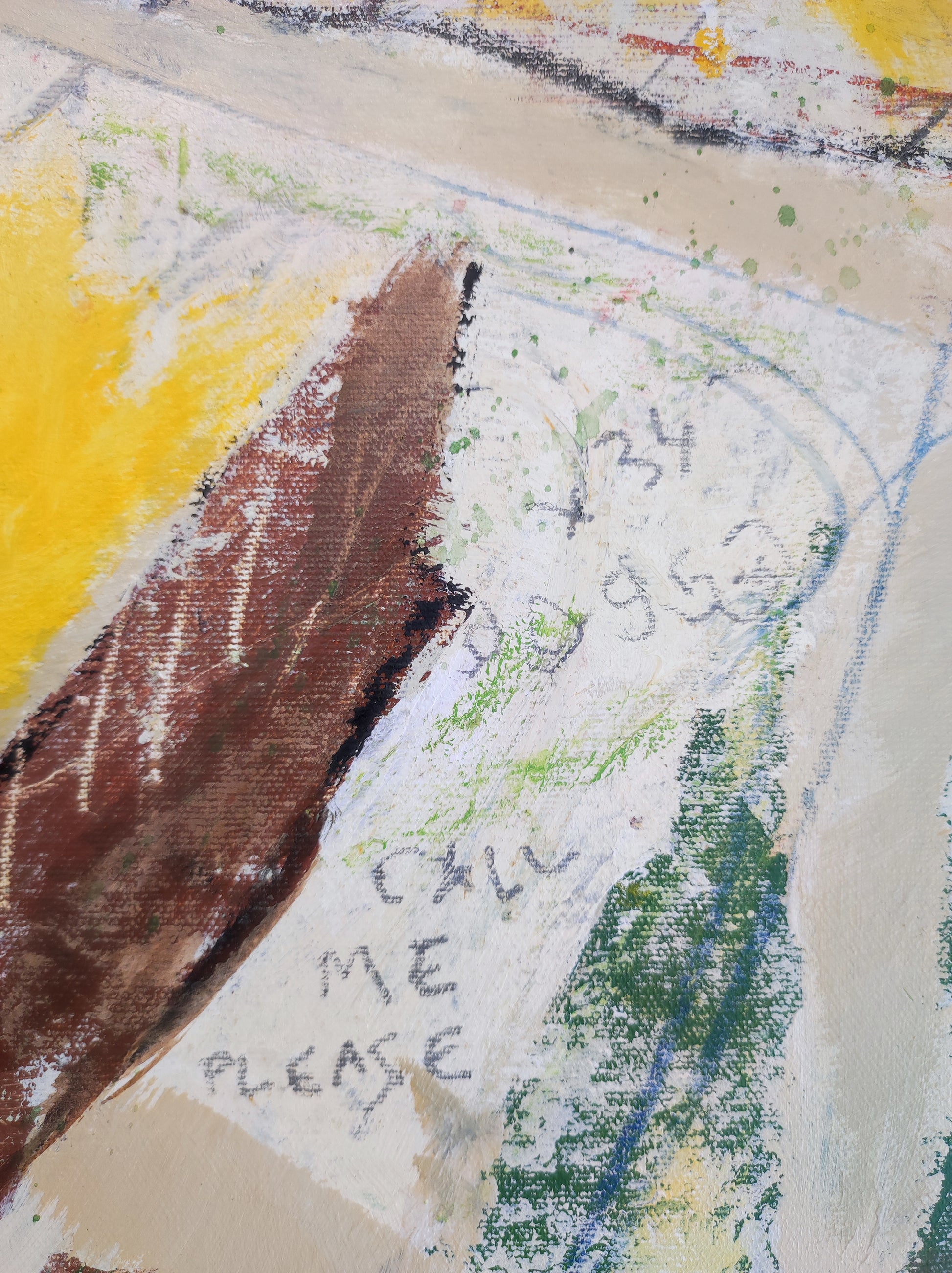 Obra desarrollada mediante múltiples capas. Lo nuevo va tapando a lo antiguo pero siempre queda un rastro. Pintura gestual e intuitiva donde los dibujos, las manchas y las marcas van encajando poco a poco, sin forzar.