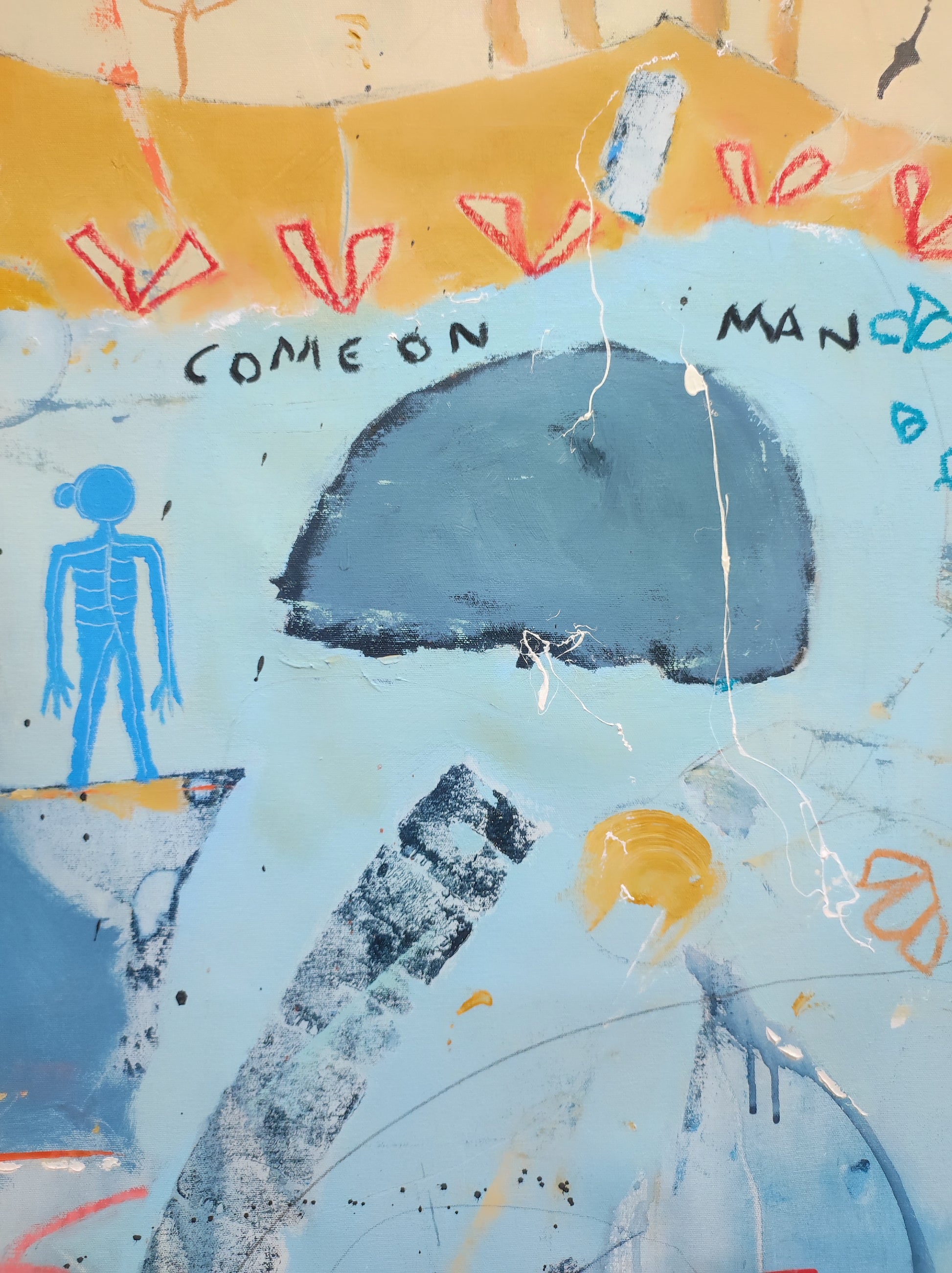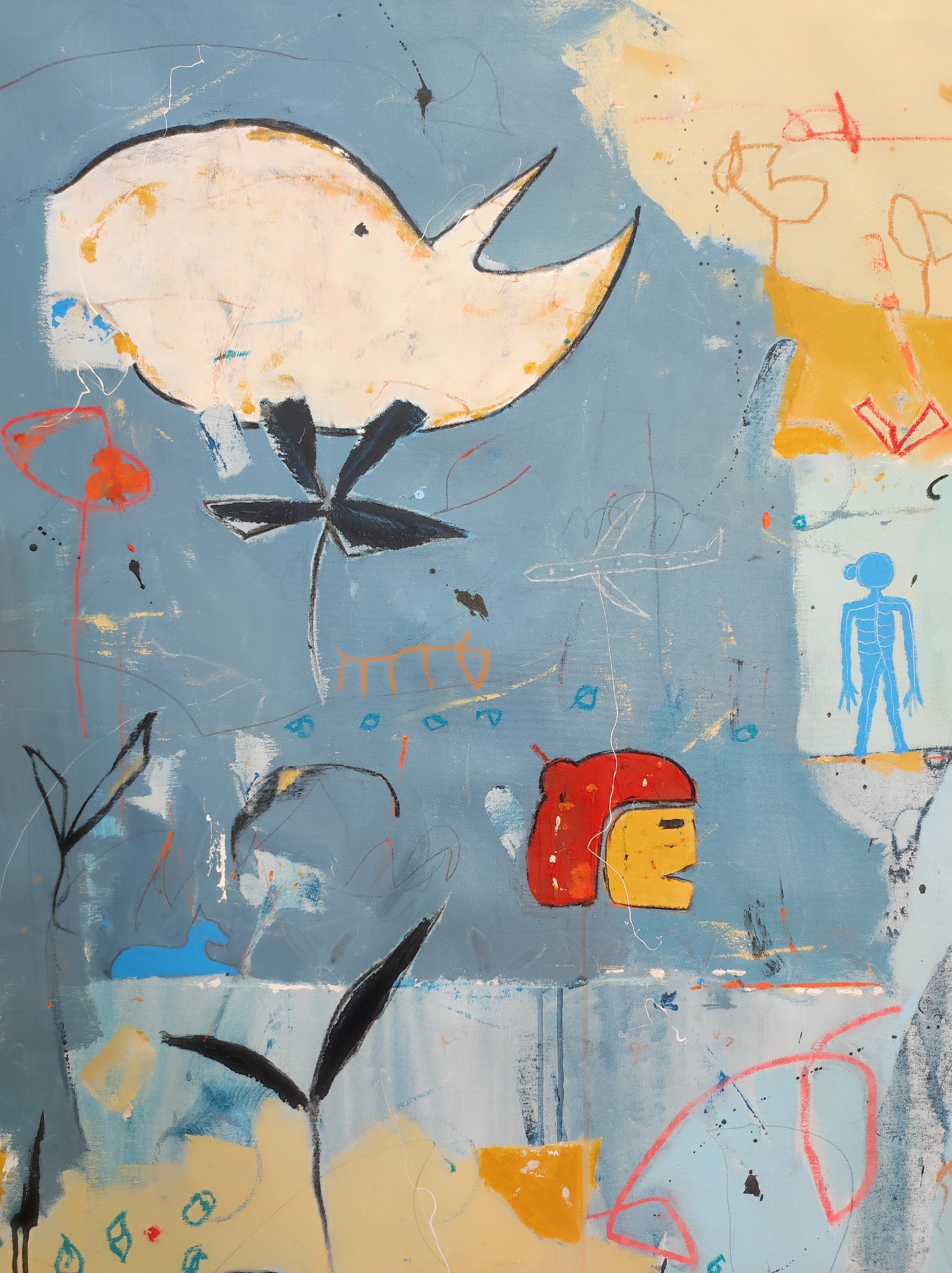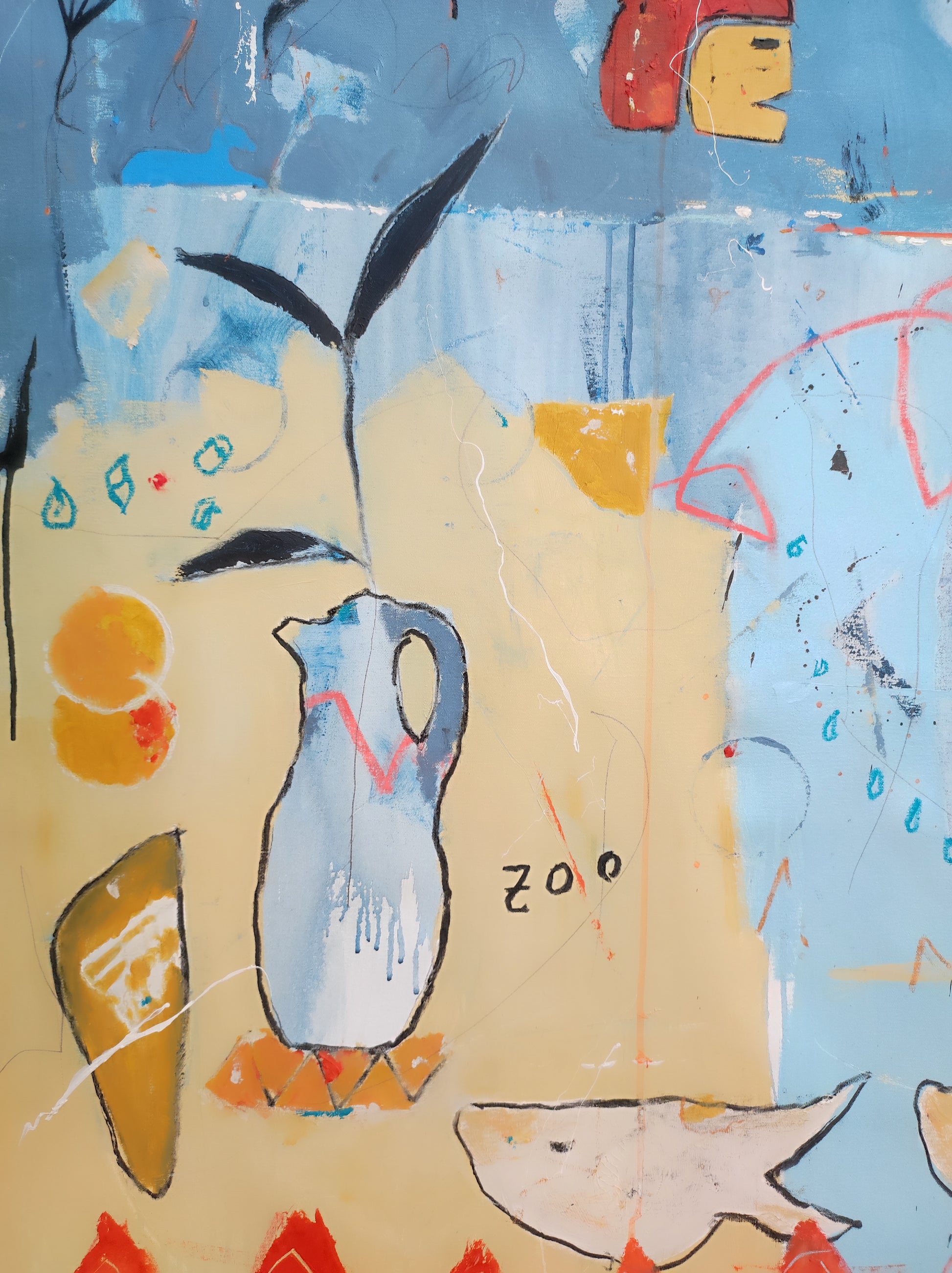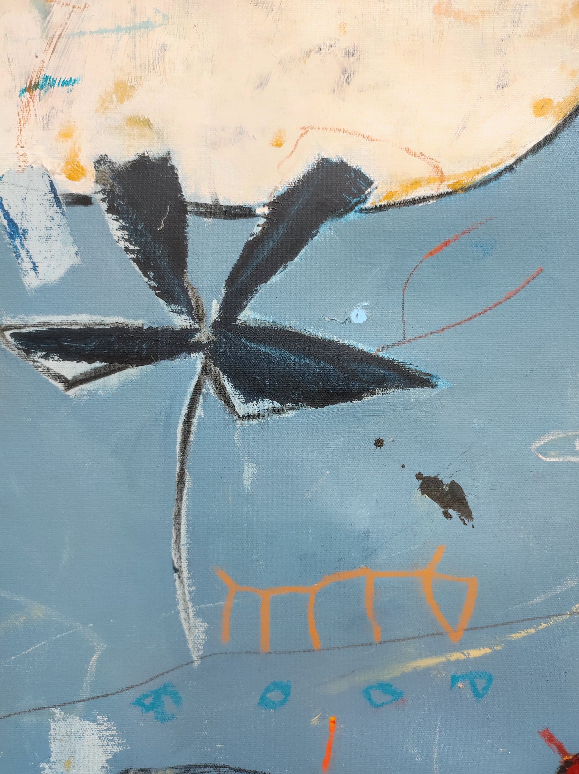 Pintura gestual, intuitiva, que deja que las cosas pasen y se apoya sobre lo que aparece. Aprovechando el accidente y aceptando las consecuencias.