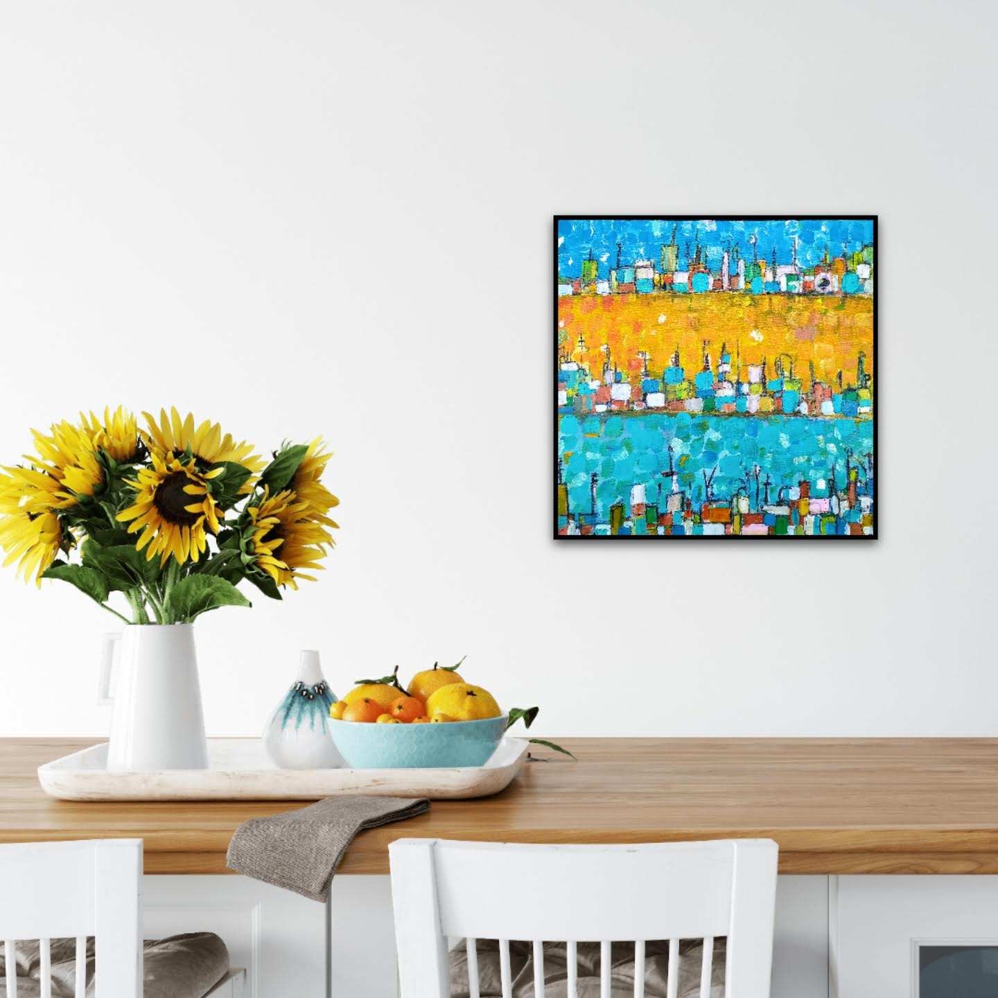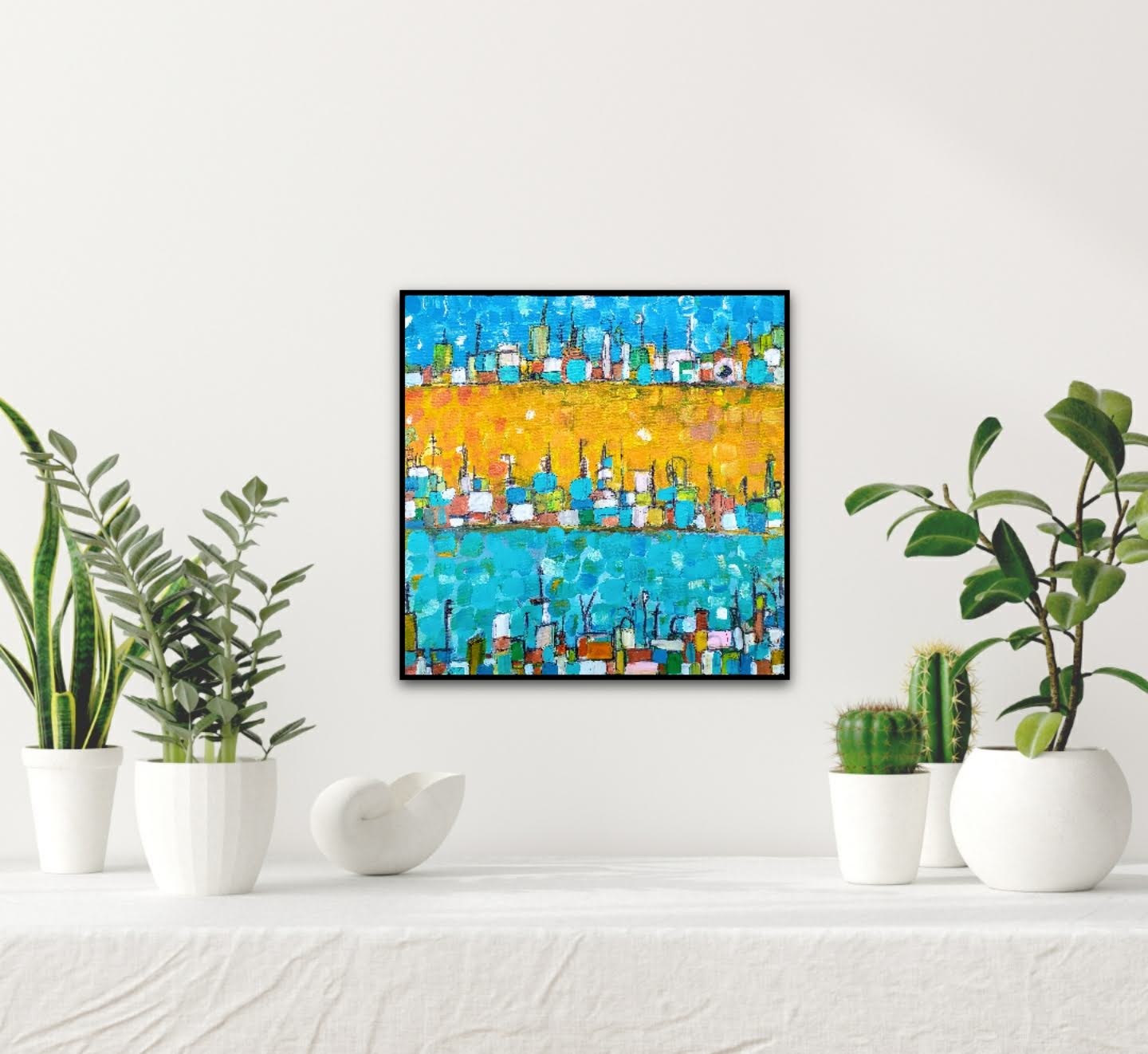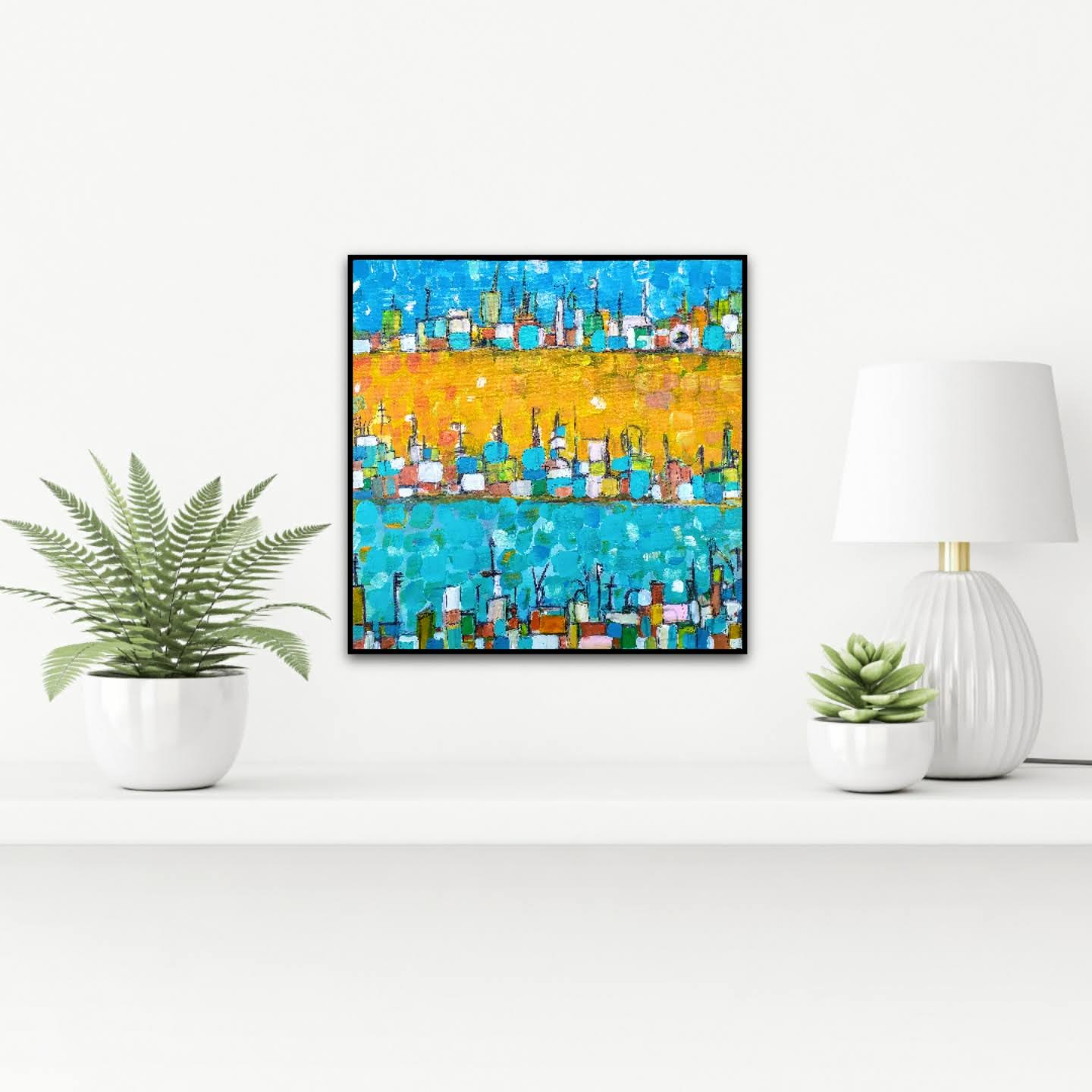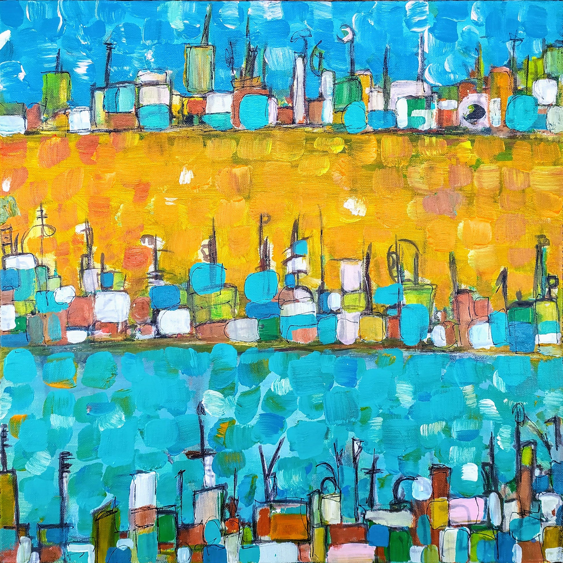 Cuadro trabajado desde la improvisación libre. La obra representa un skyline de una ciudad , trabajado con manchas de color que se desarrolla en línea continua sobre un fondo azul y naranja.