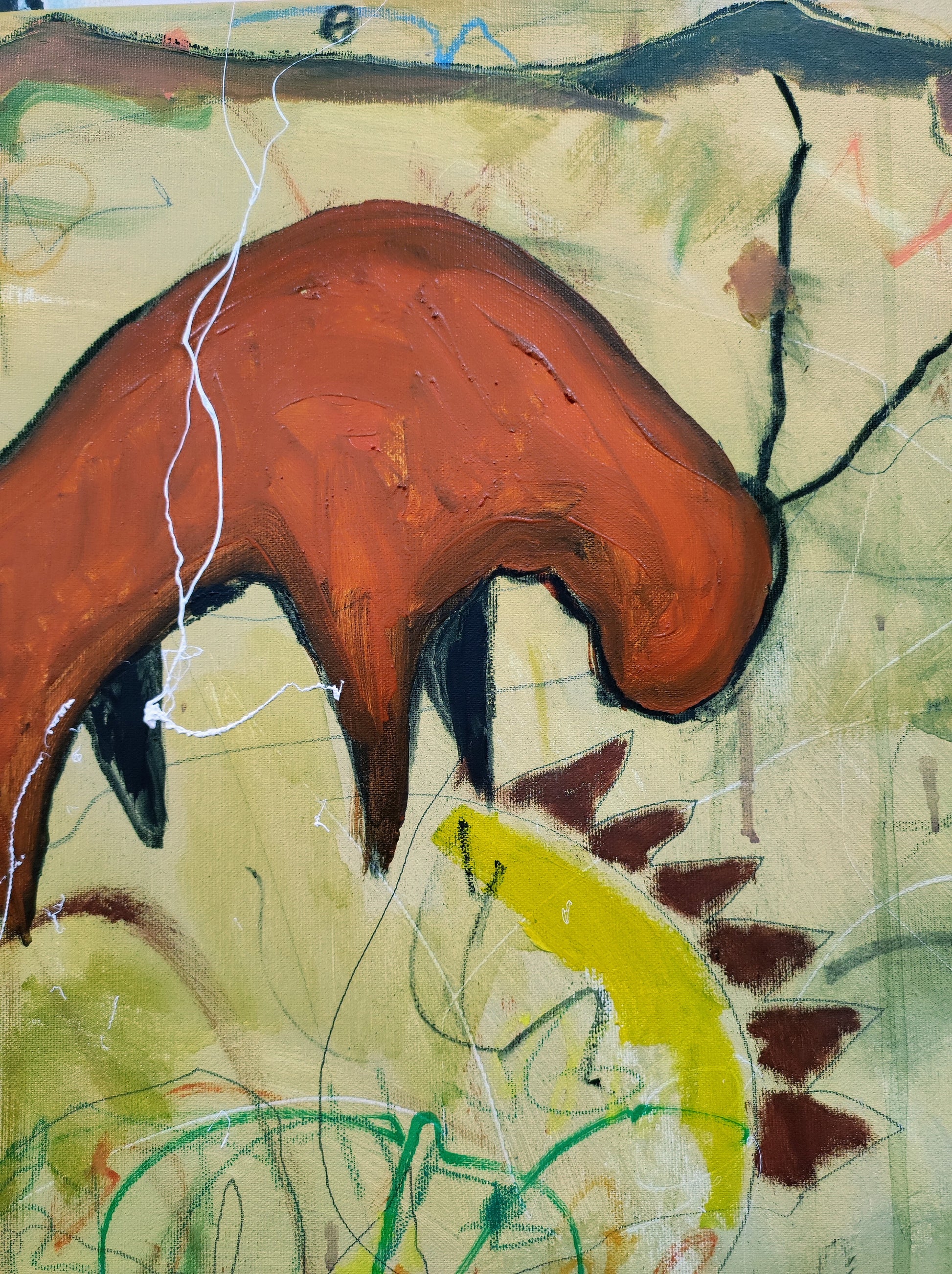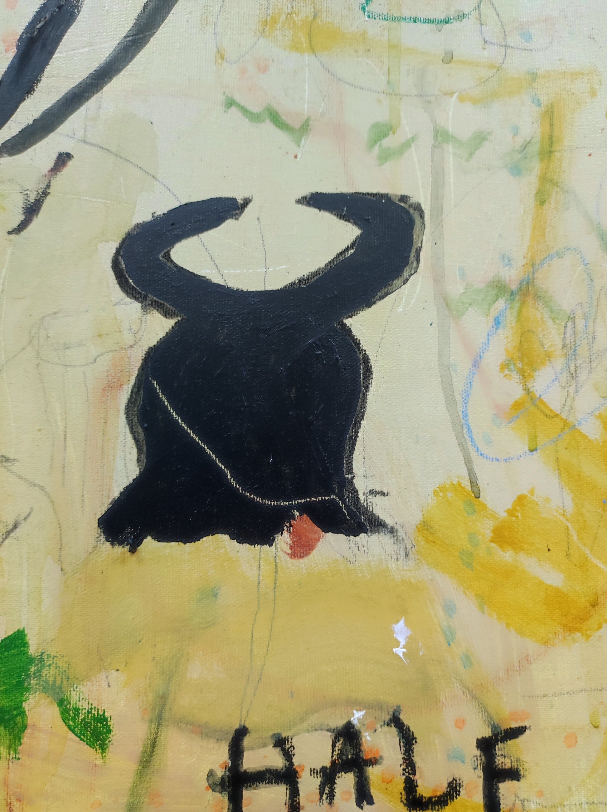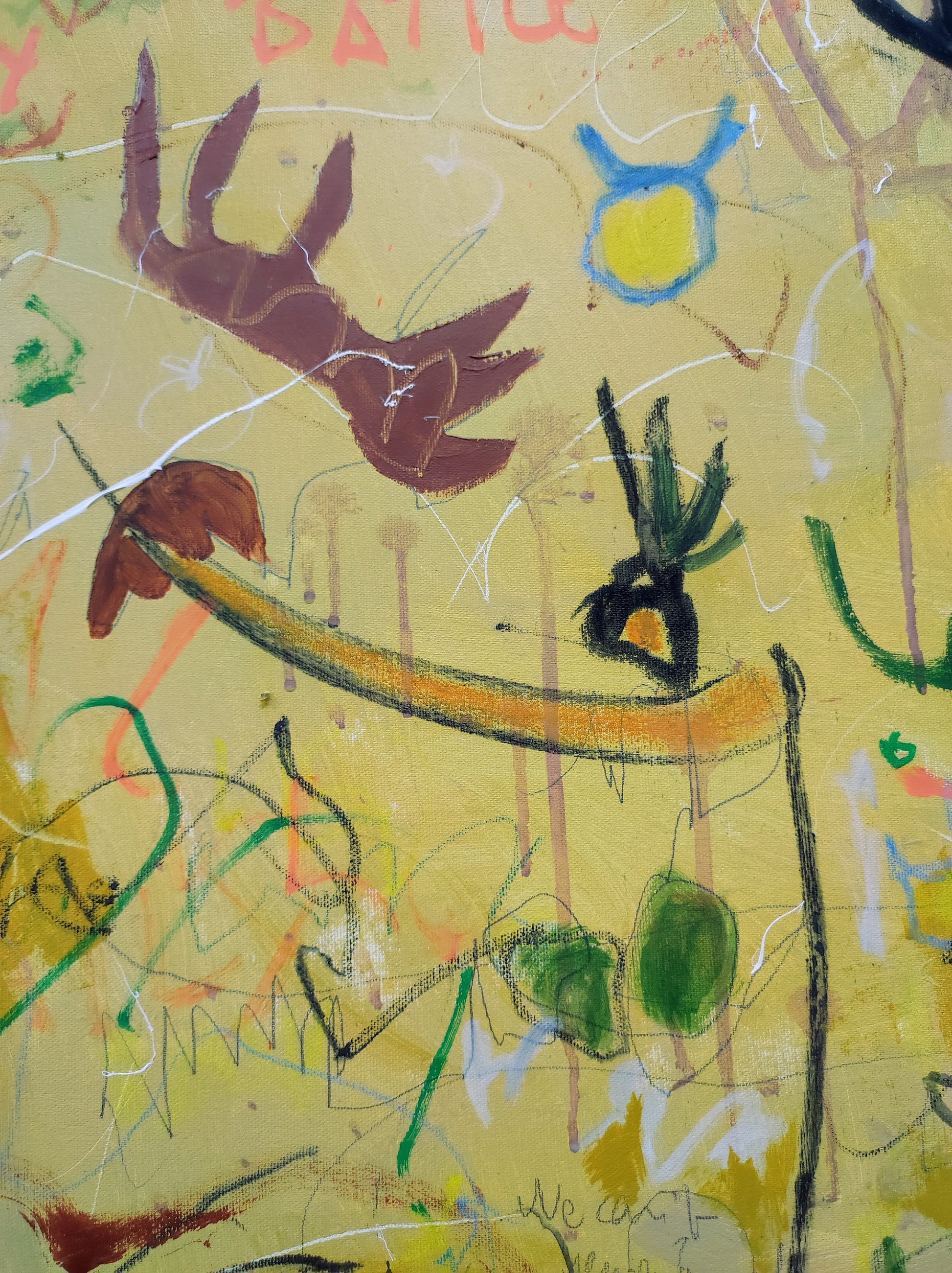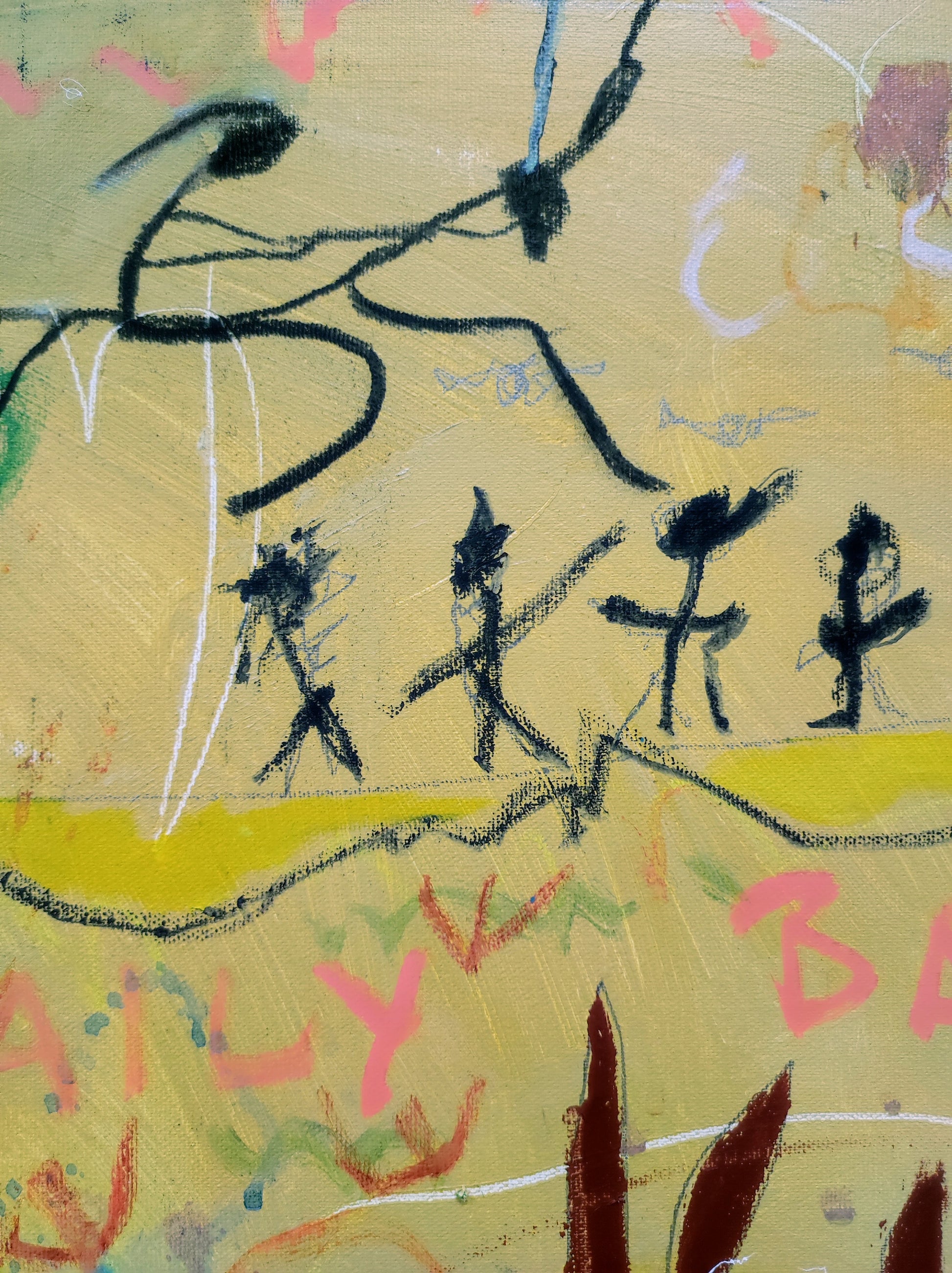 Pintura gestual, intuitiva, que deja que las cosas pasen y se apoya sobre lo que aparece. Aprovechando el accidente y aceptando las consecuencias.