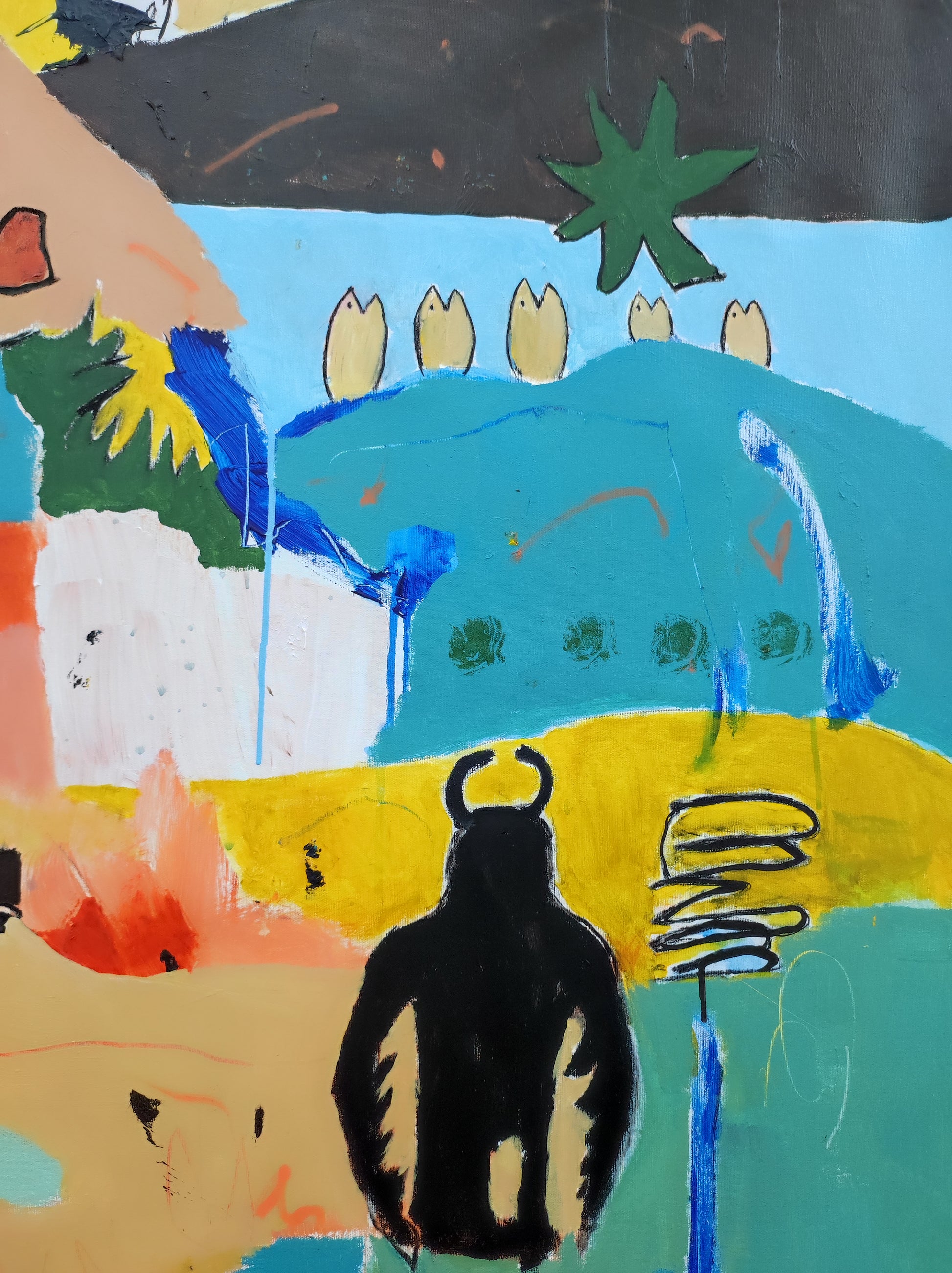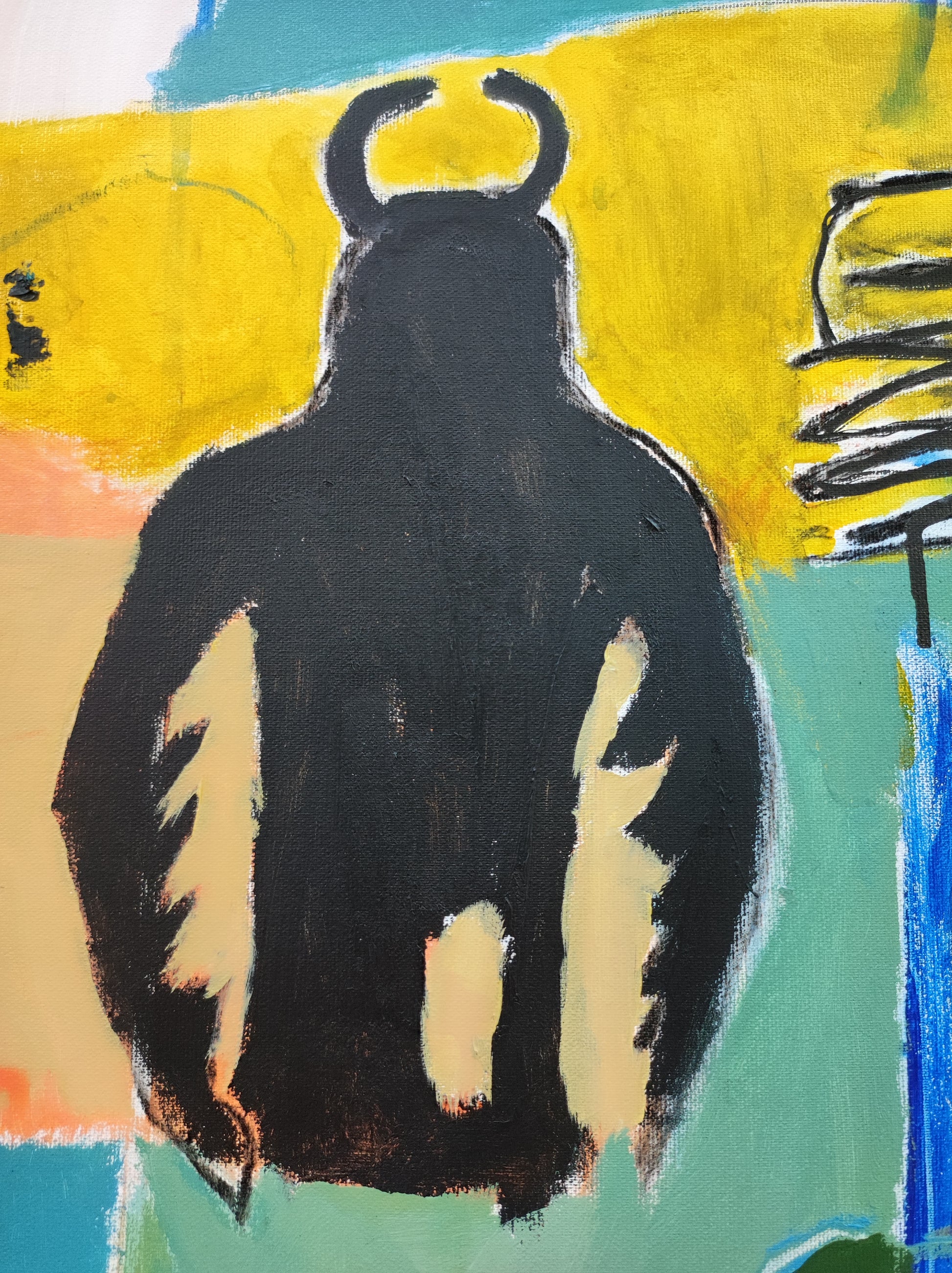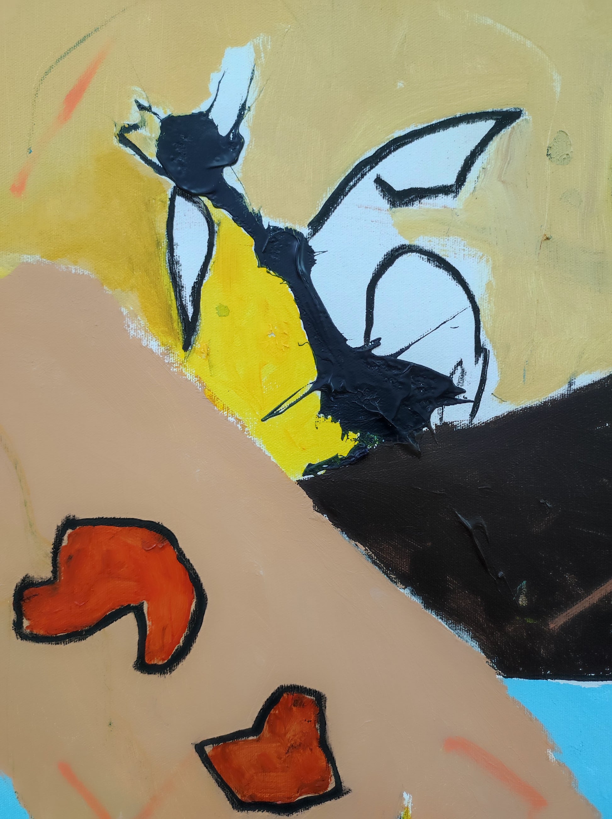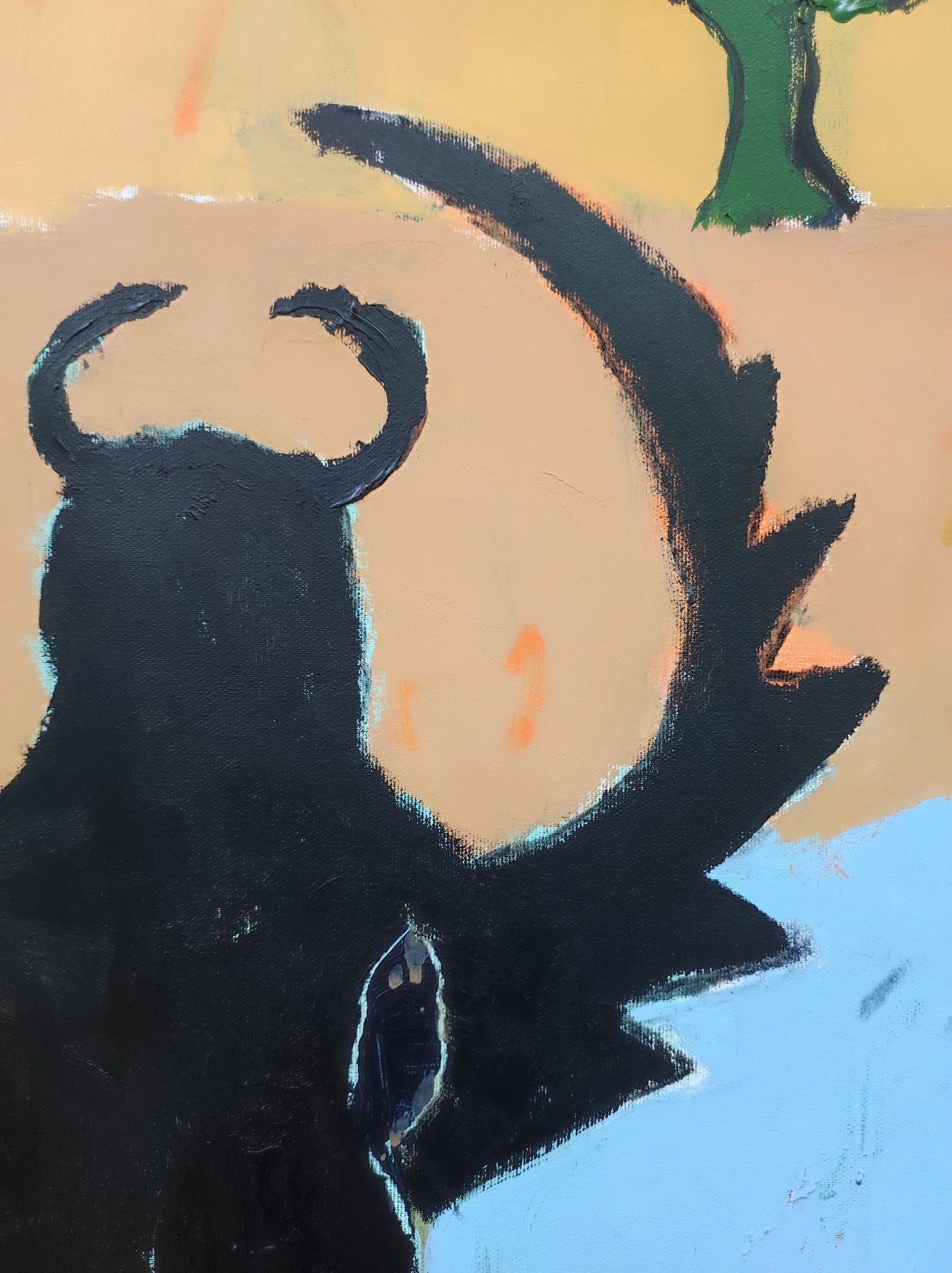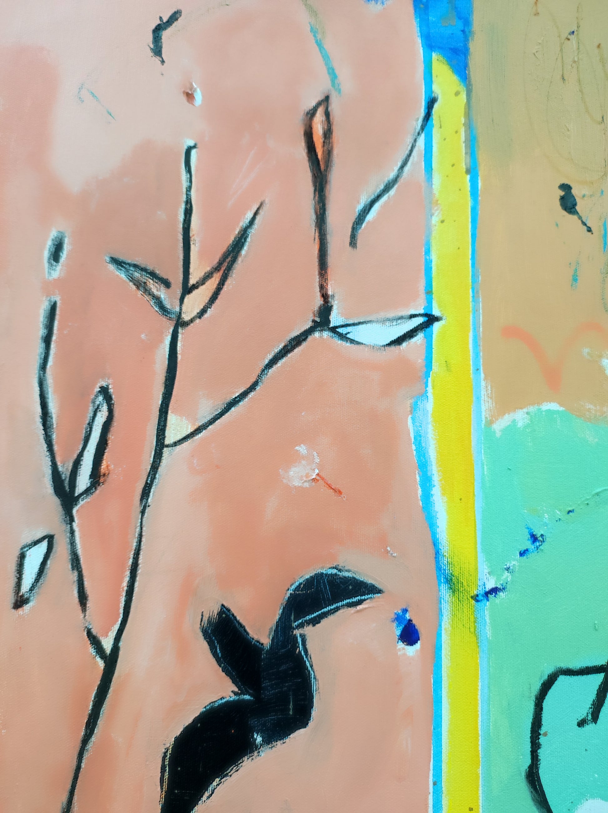 Pintura gestual, intuitiva, que deja que las cosas pasen y se apoya sobre lo que aparece. Aprovechando el accidente y aceptando las consecuencias.