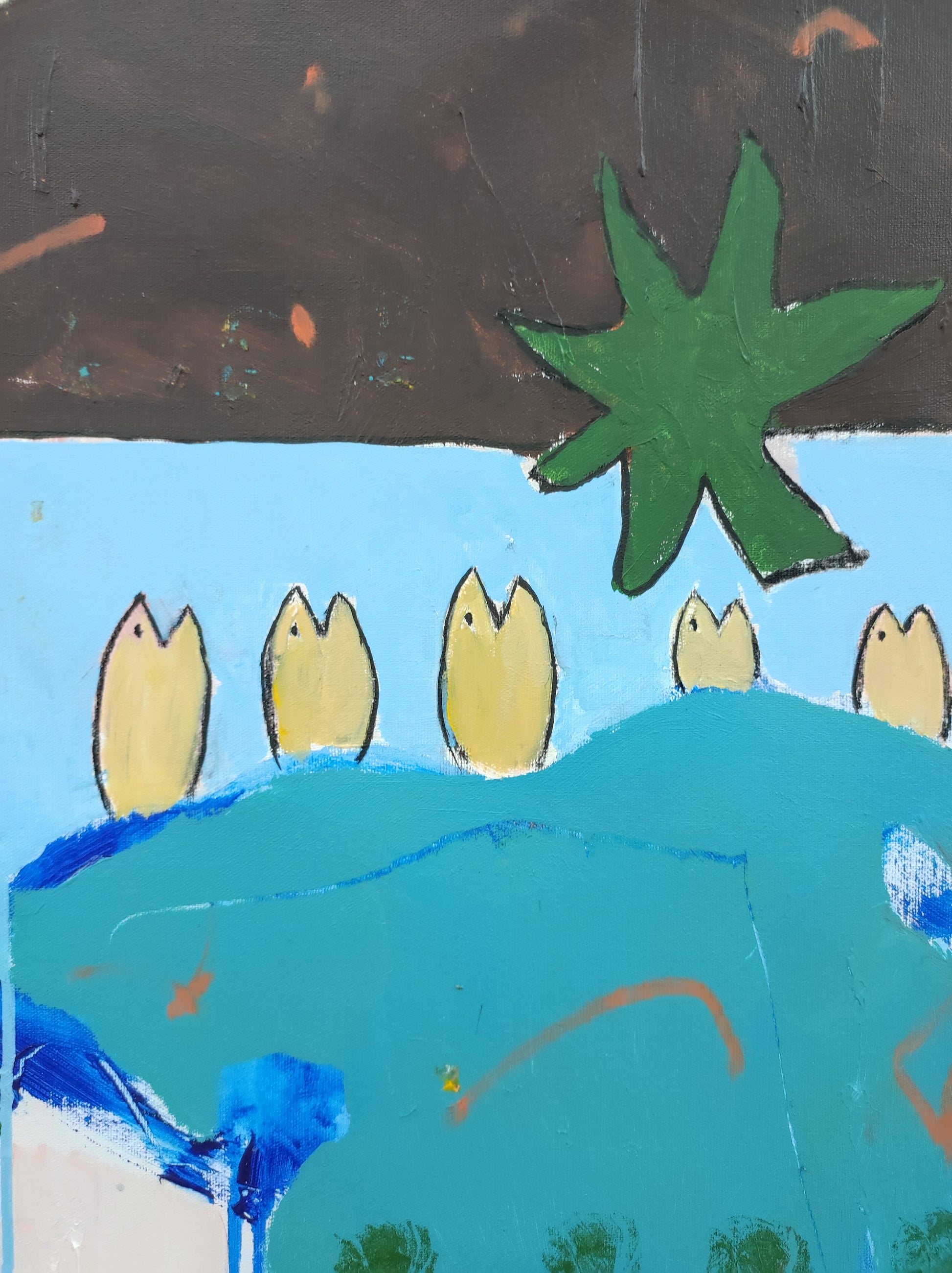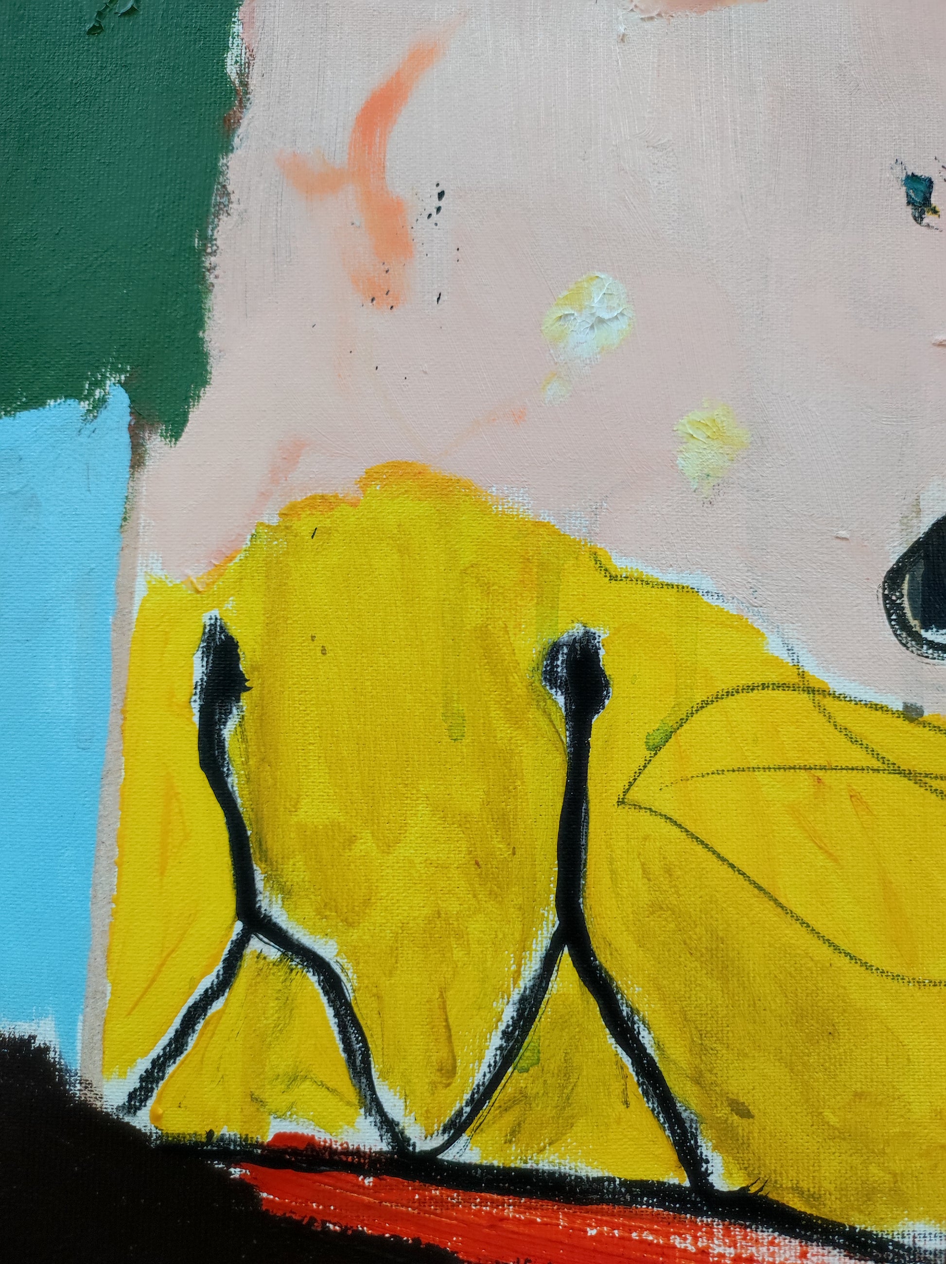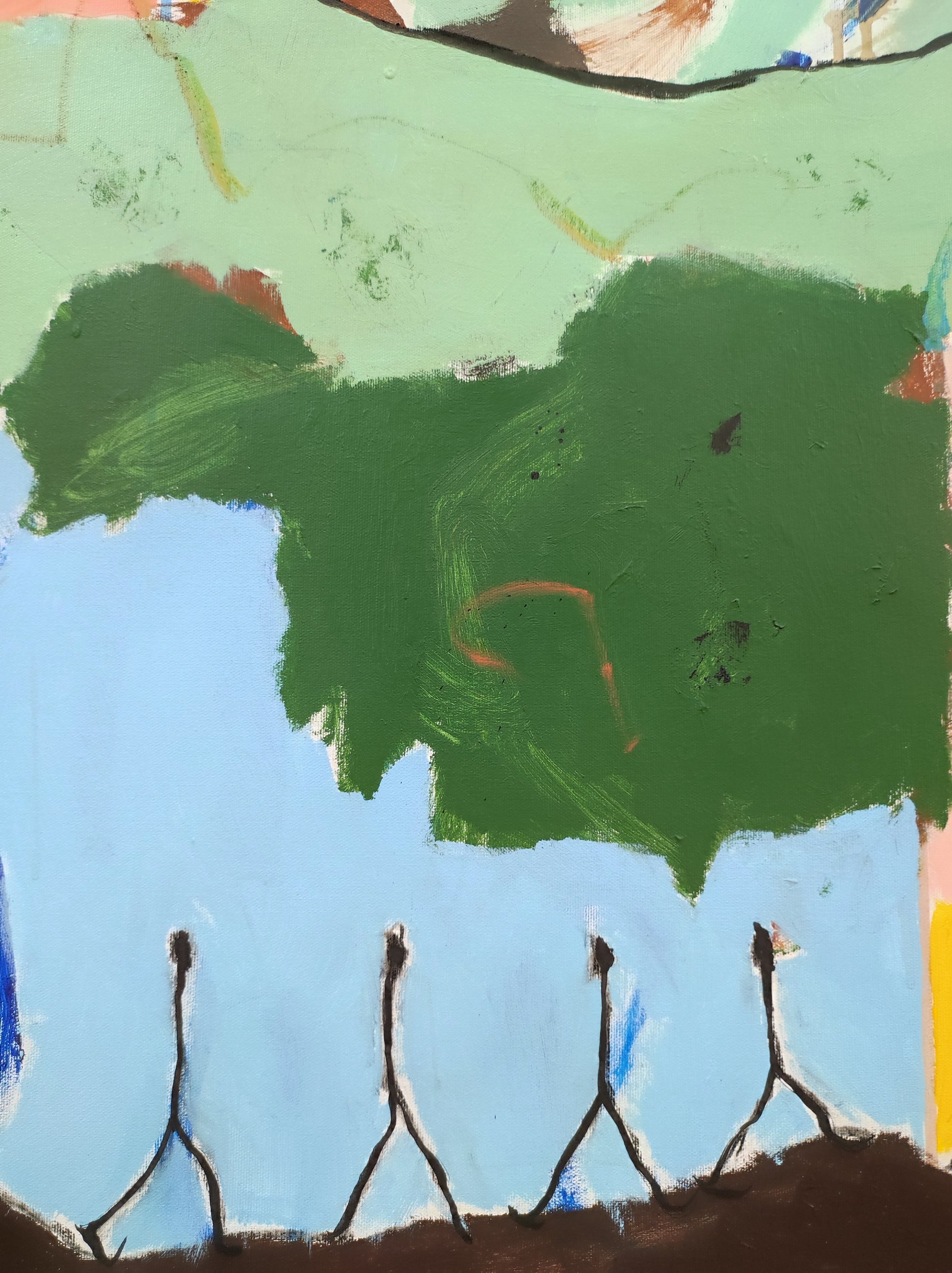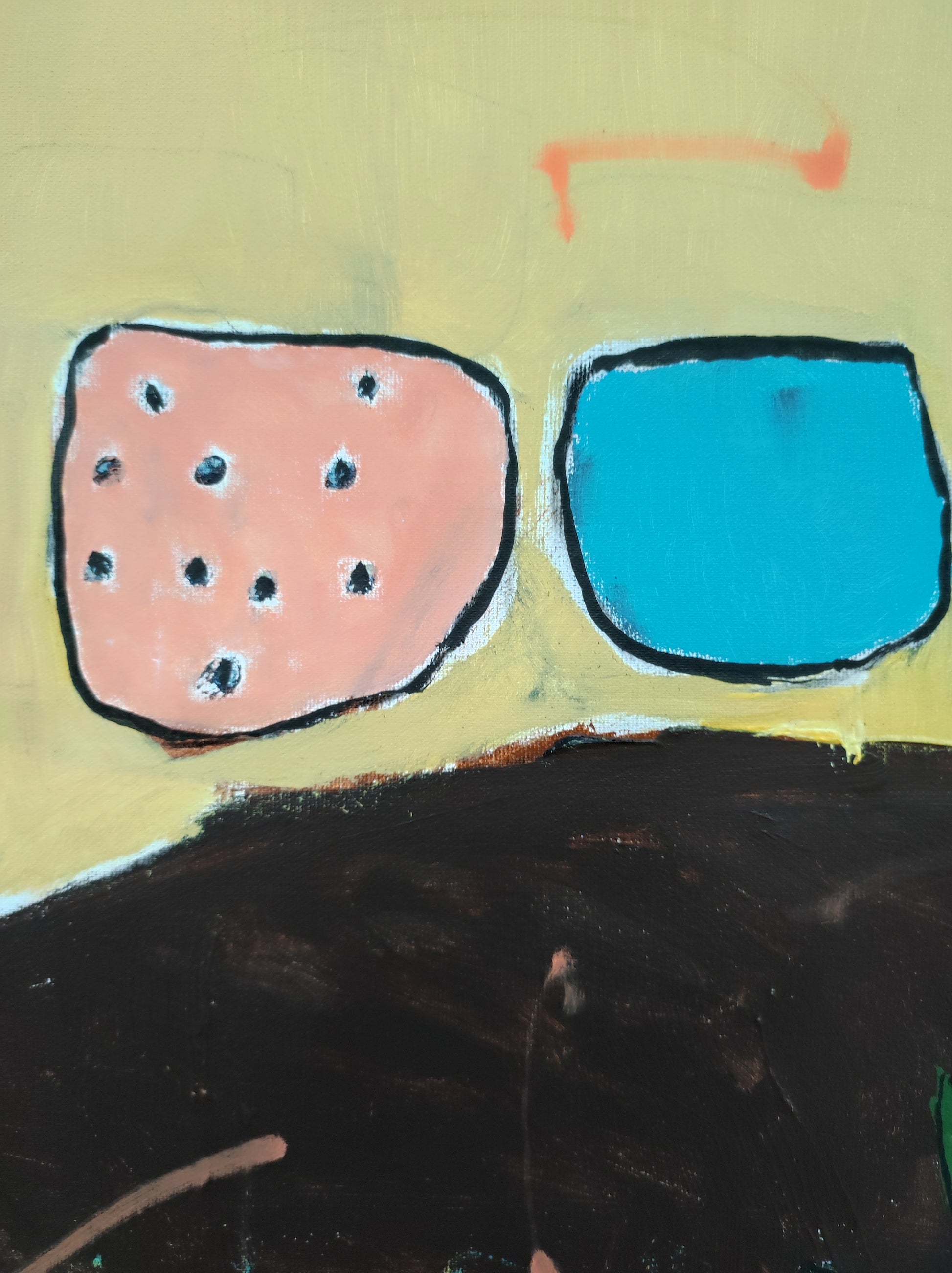 Pintura gestual, intuitiva, que deja que las cosas pasen y se apoya sobre lo que aparece. Aprovechando el accidente y aceptando las consecuencias.