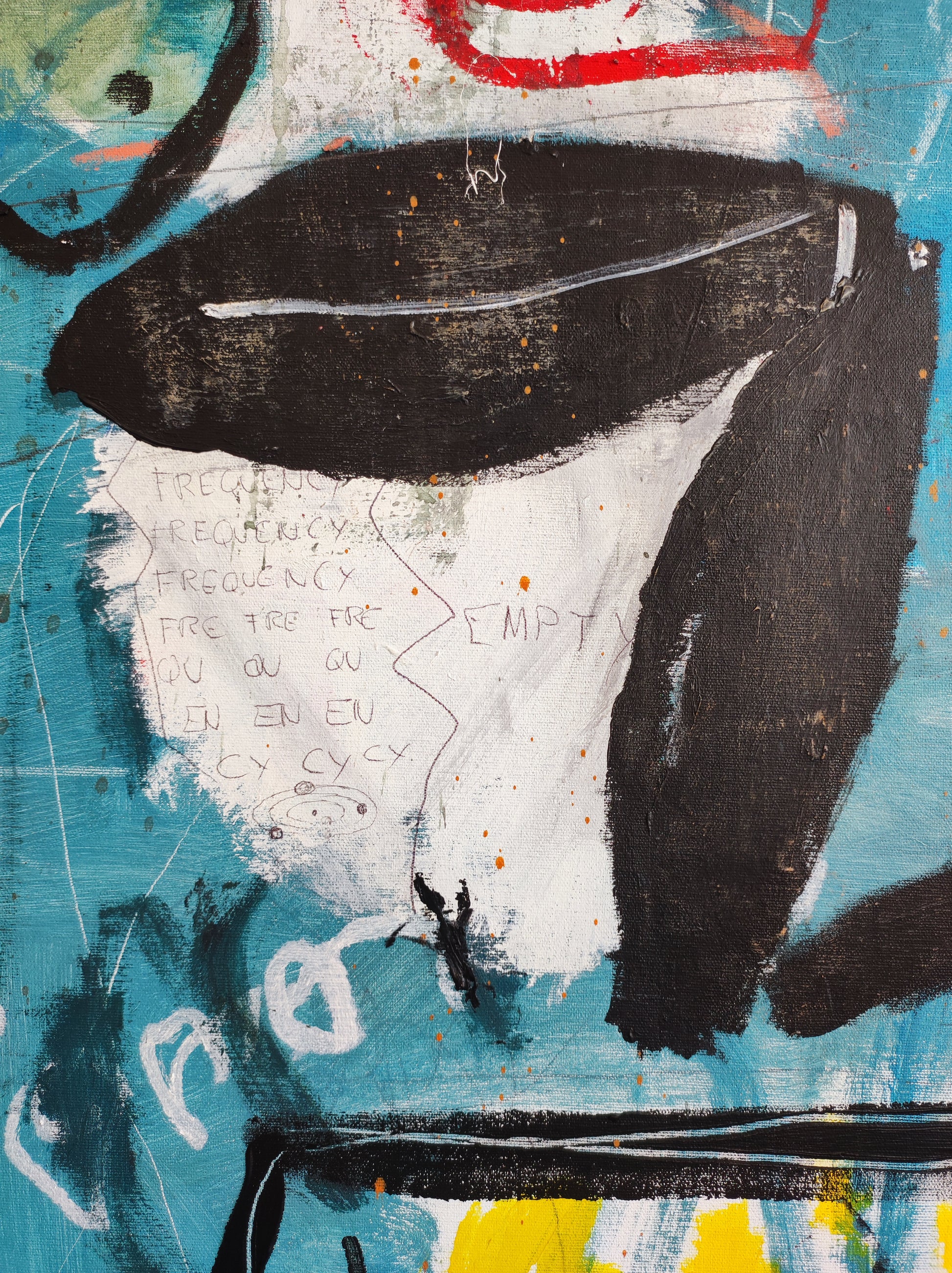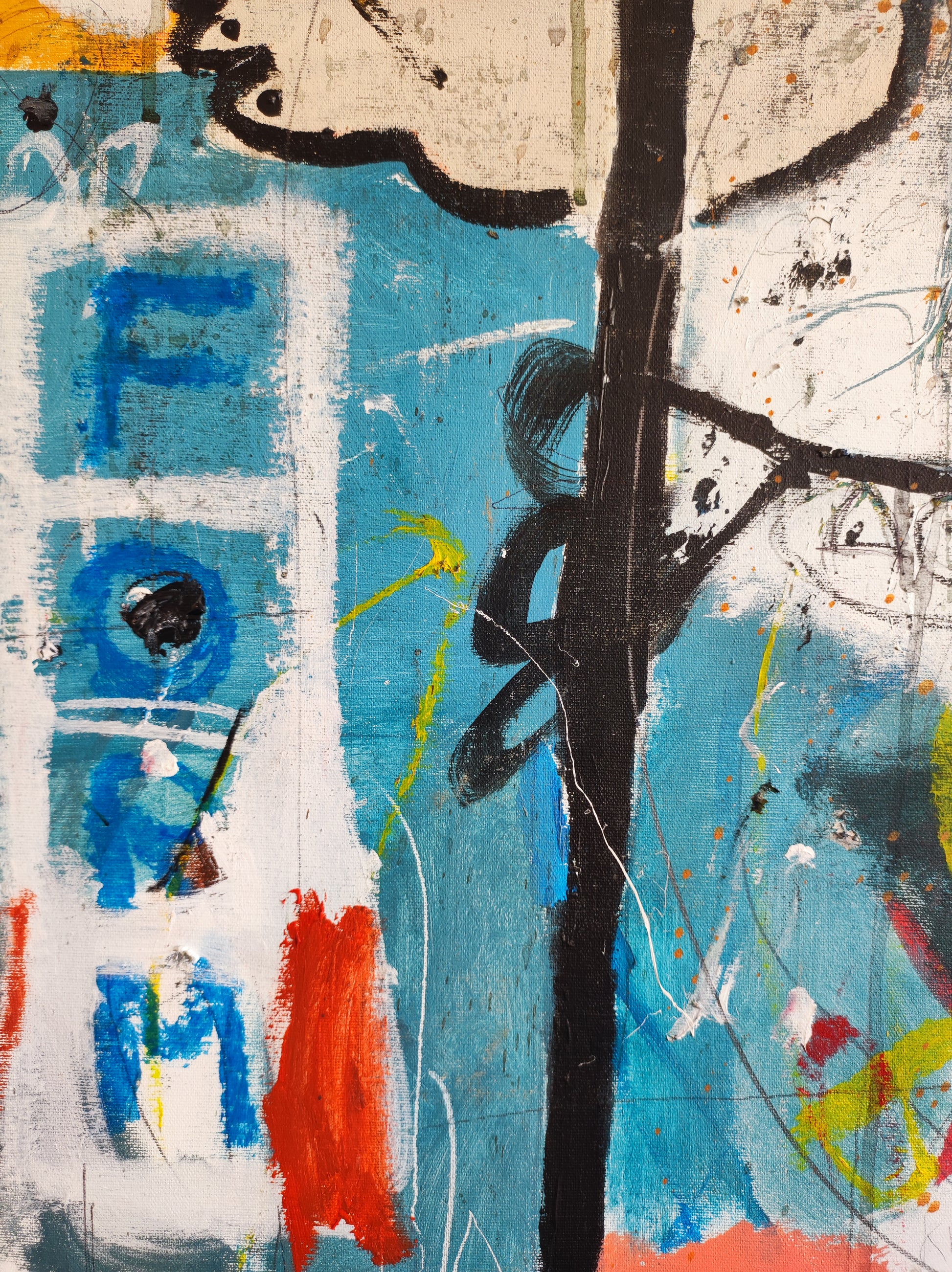 Cuadro trabajado desde la improvisación libre. Action painting con música de Arcade Fire.