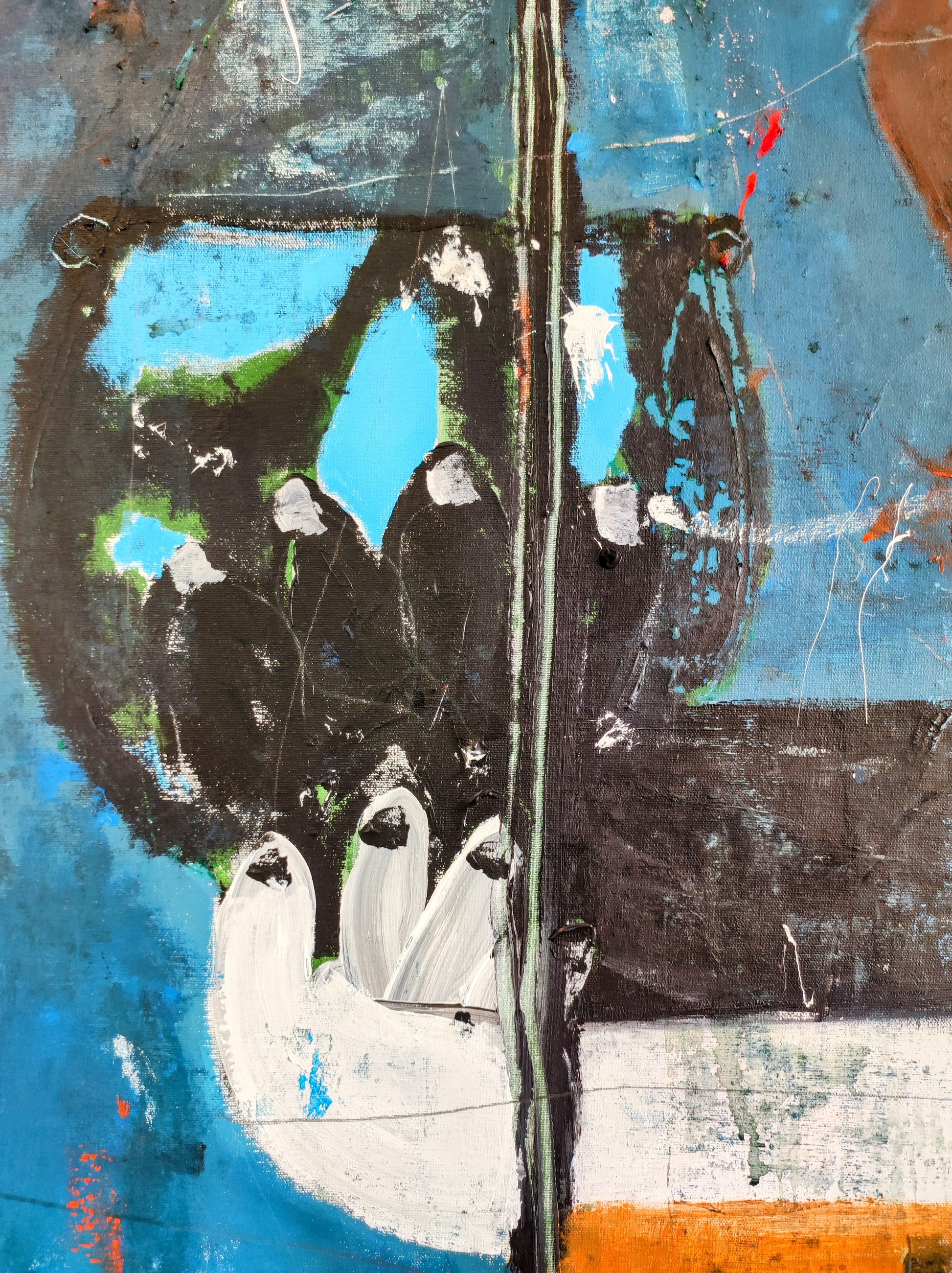 Pintura gestual, intuitiva, que deja que las cosas pasen y se apoya sobre lo que aparece. Aprovechando el accidente y aceptando las consecuencias.