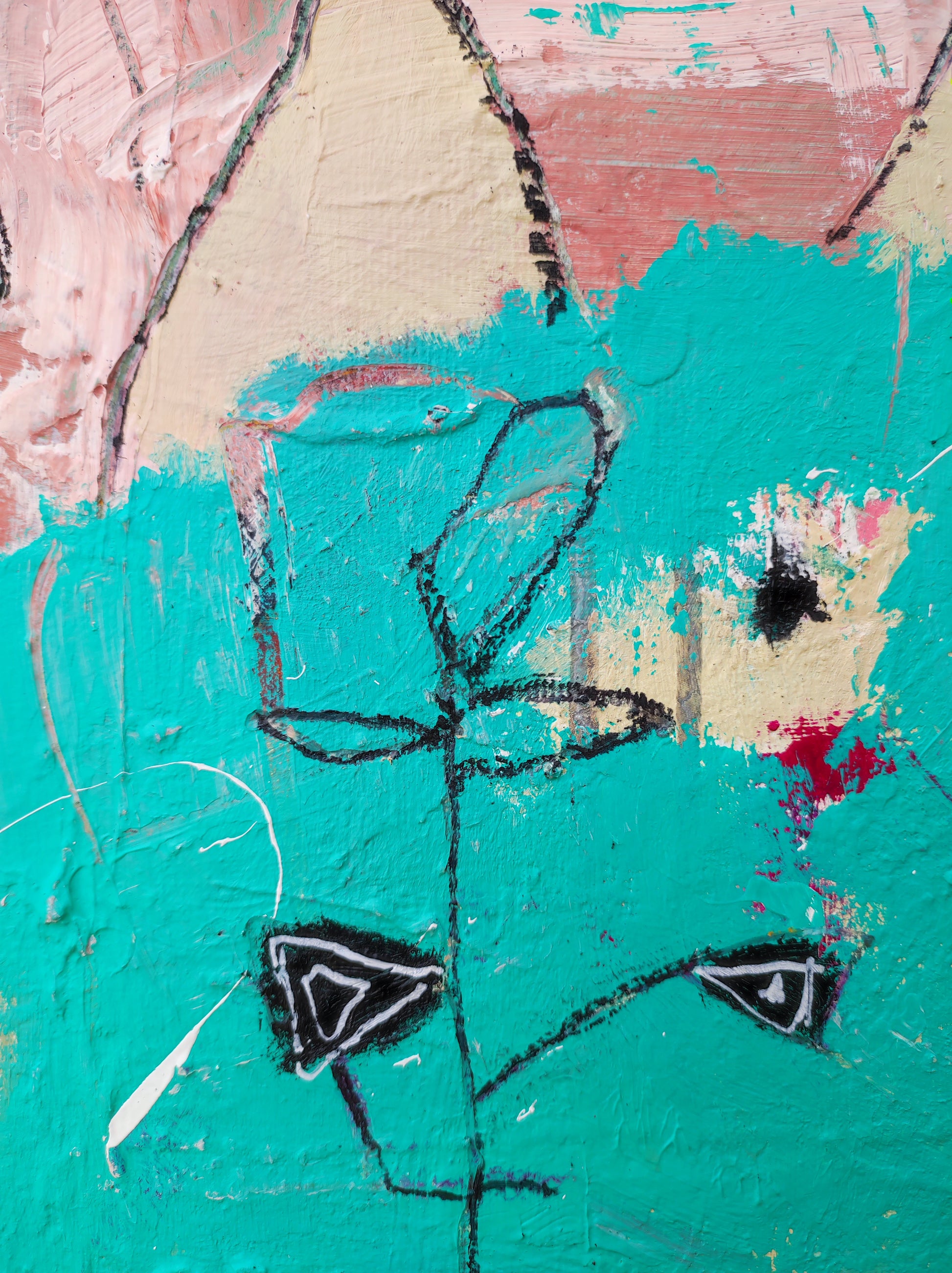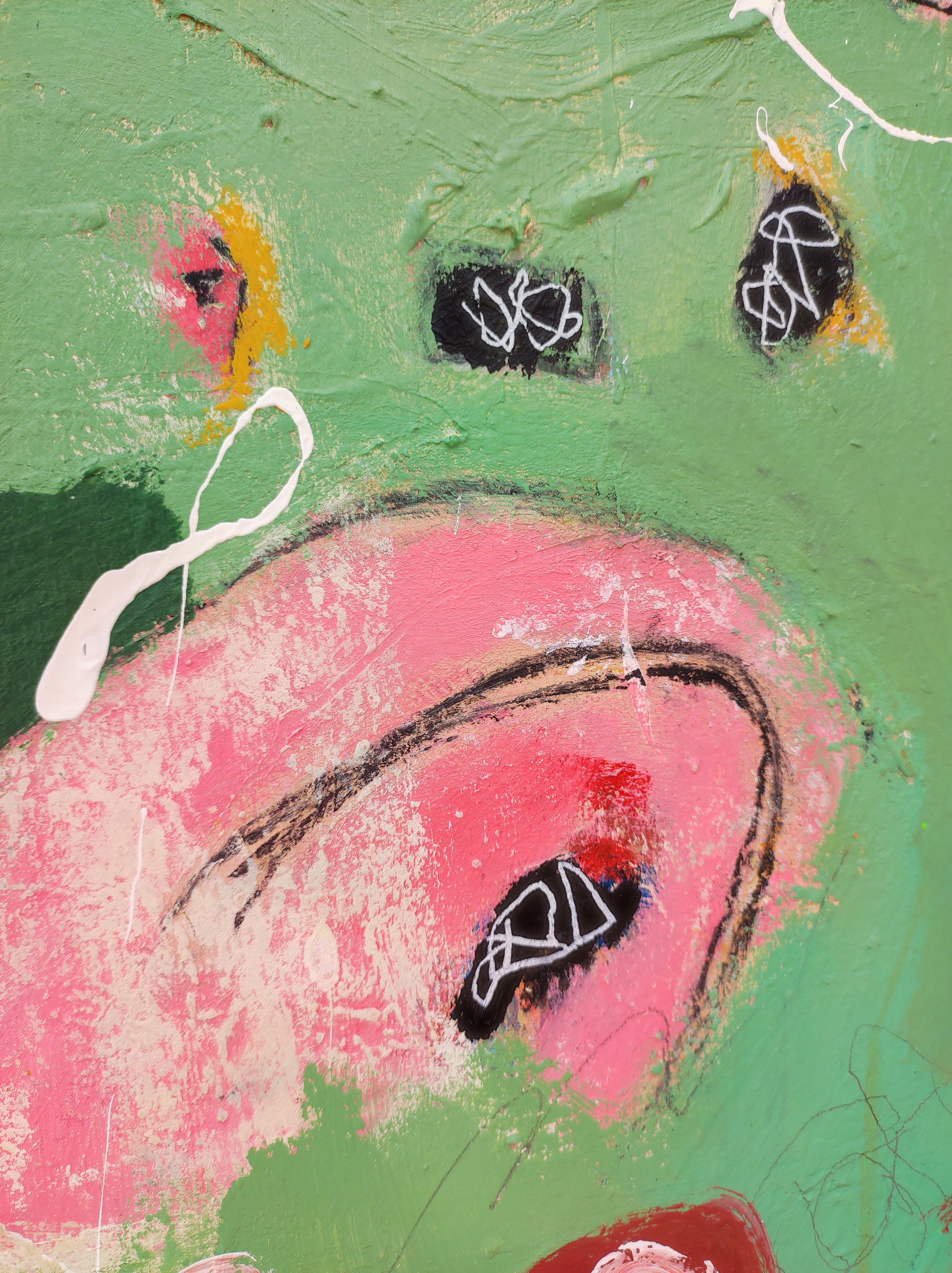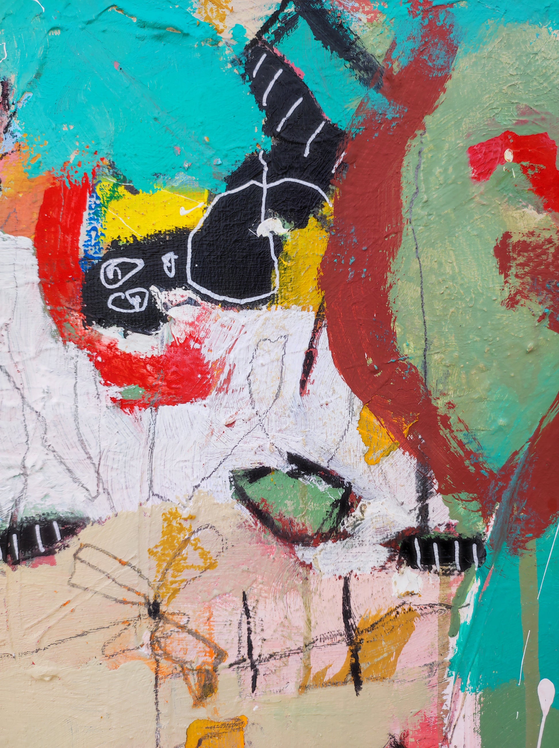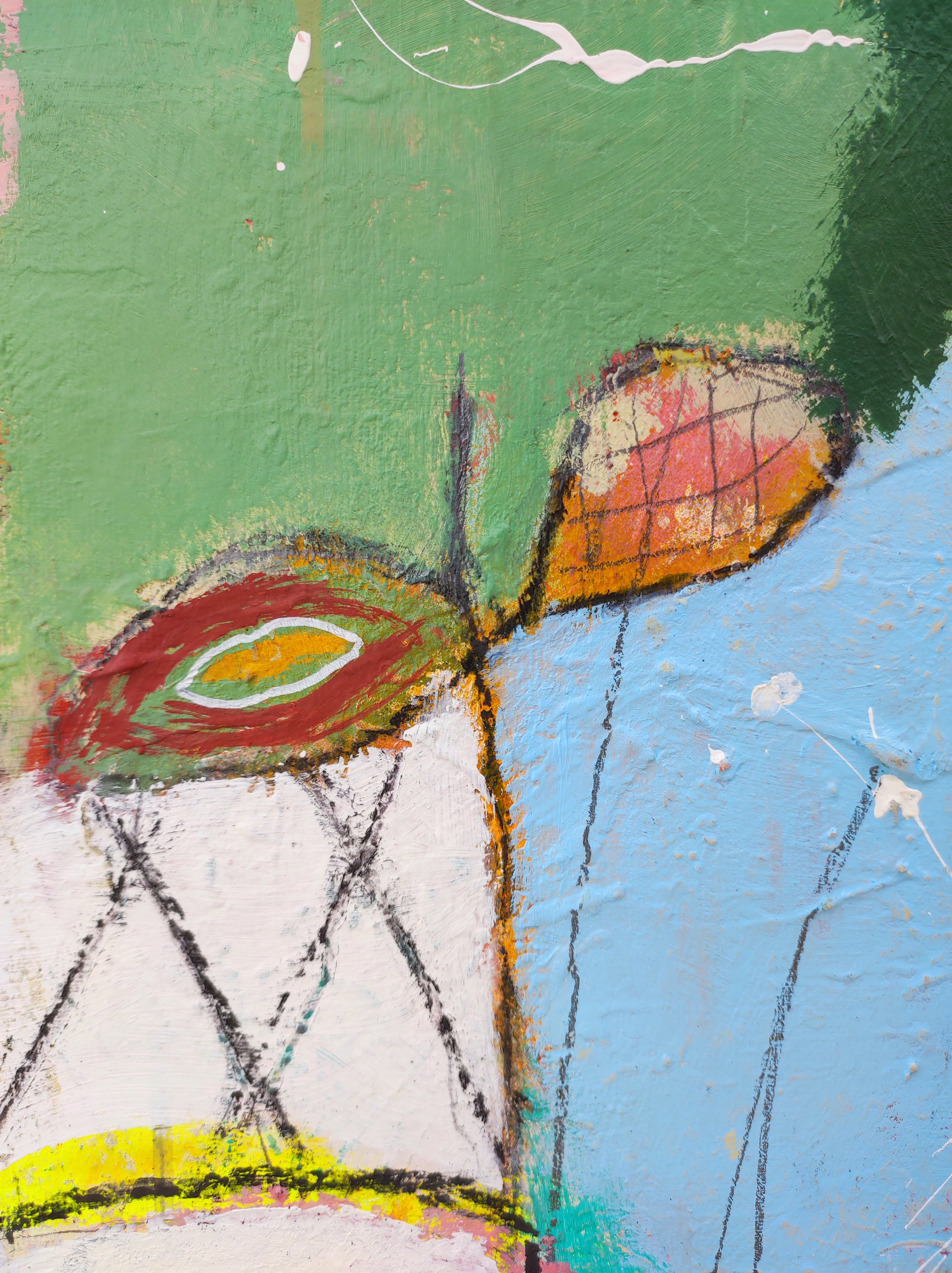 Técnica: acrílico, pigmentos, lápiz, bolígrafo, gesso, pintura en spray, carboncillo, ceras.