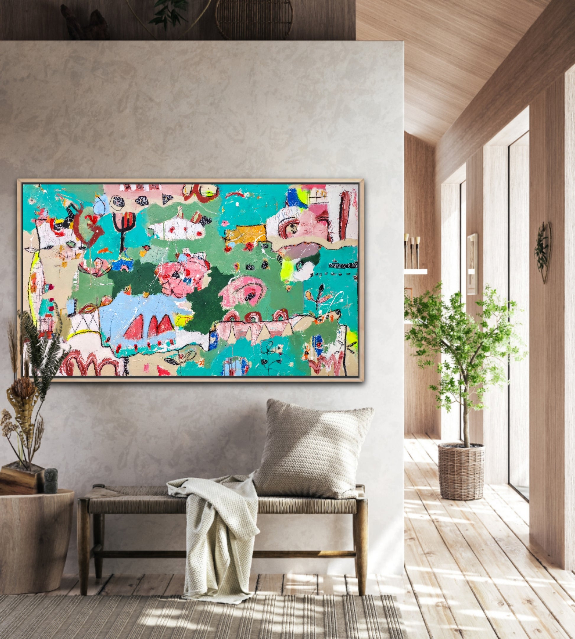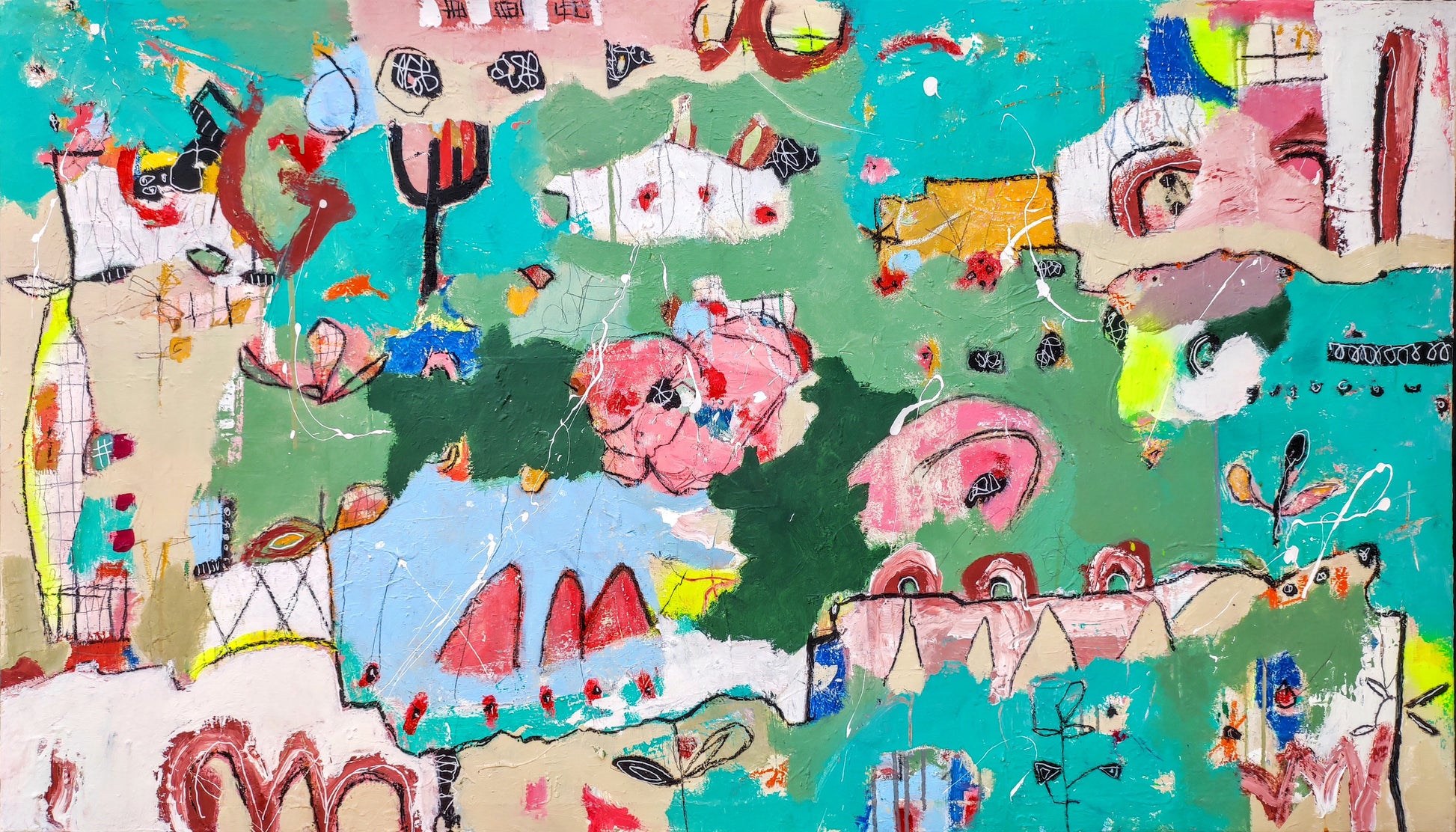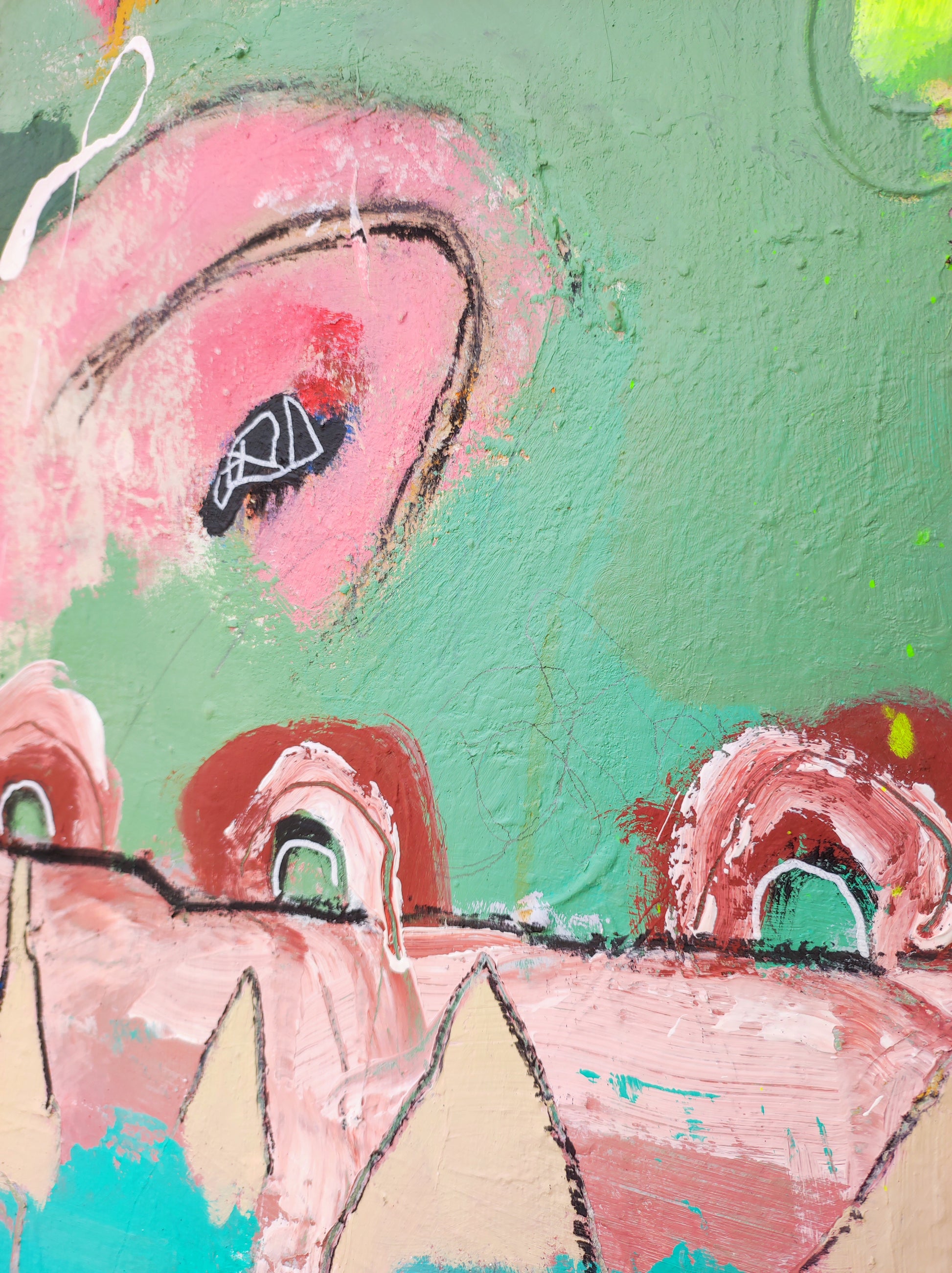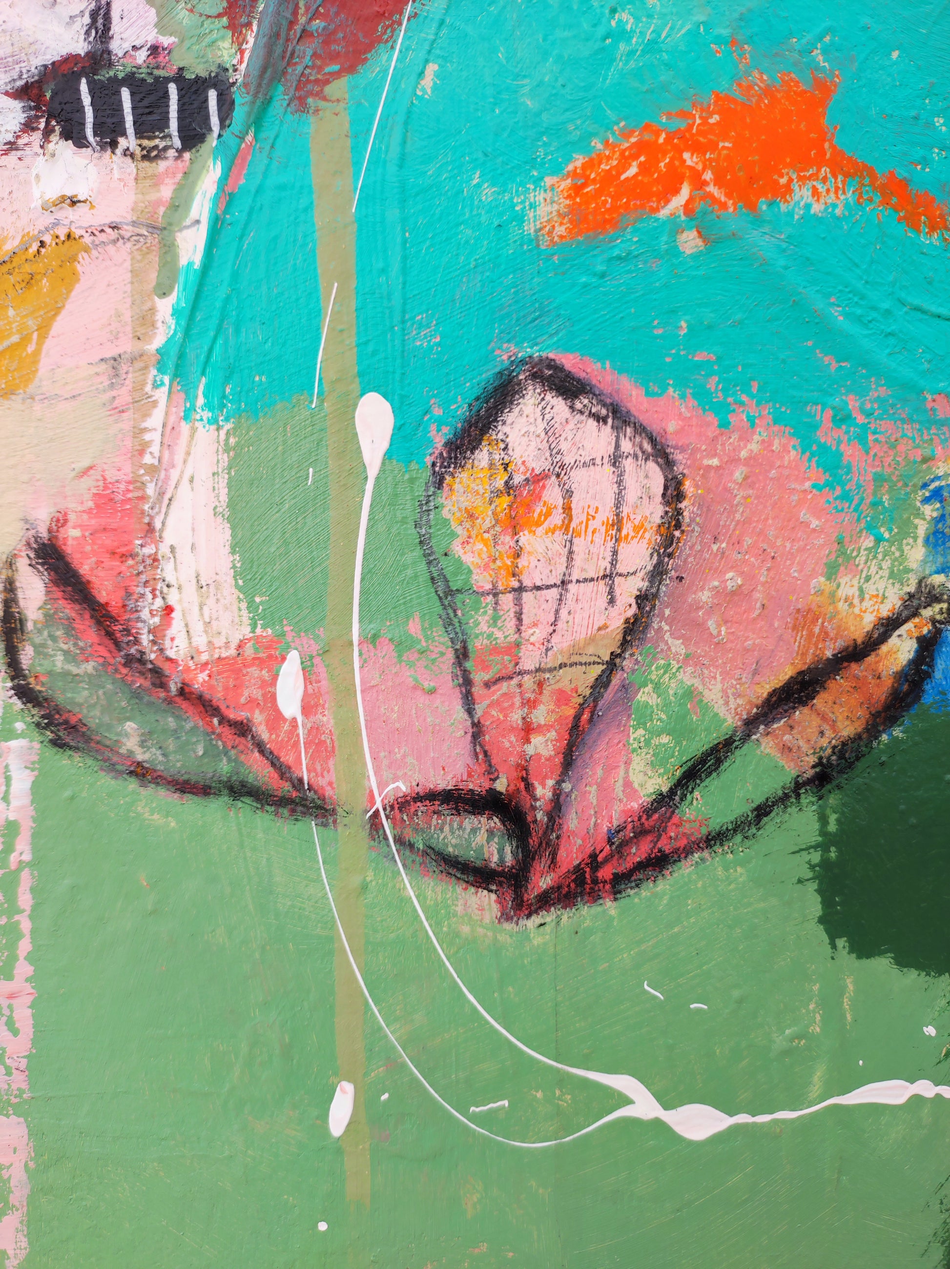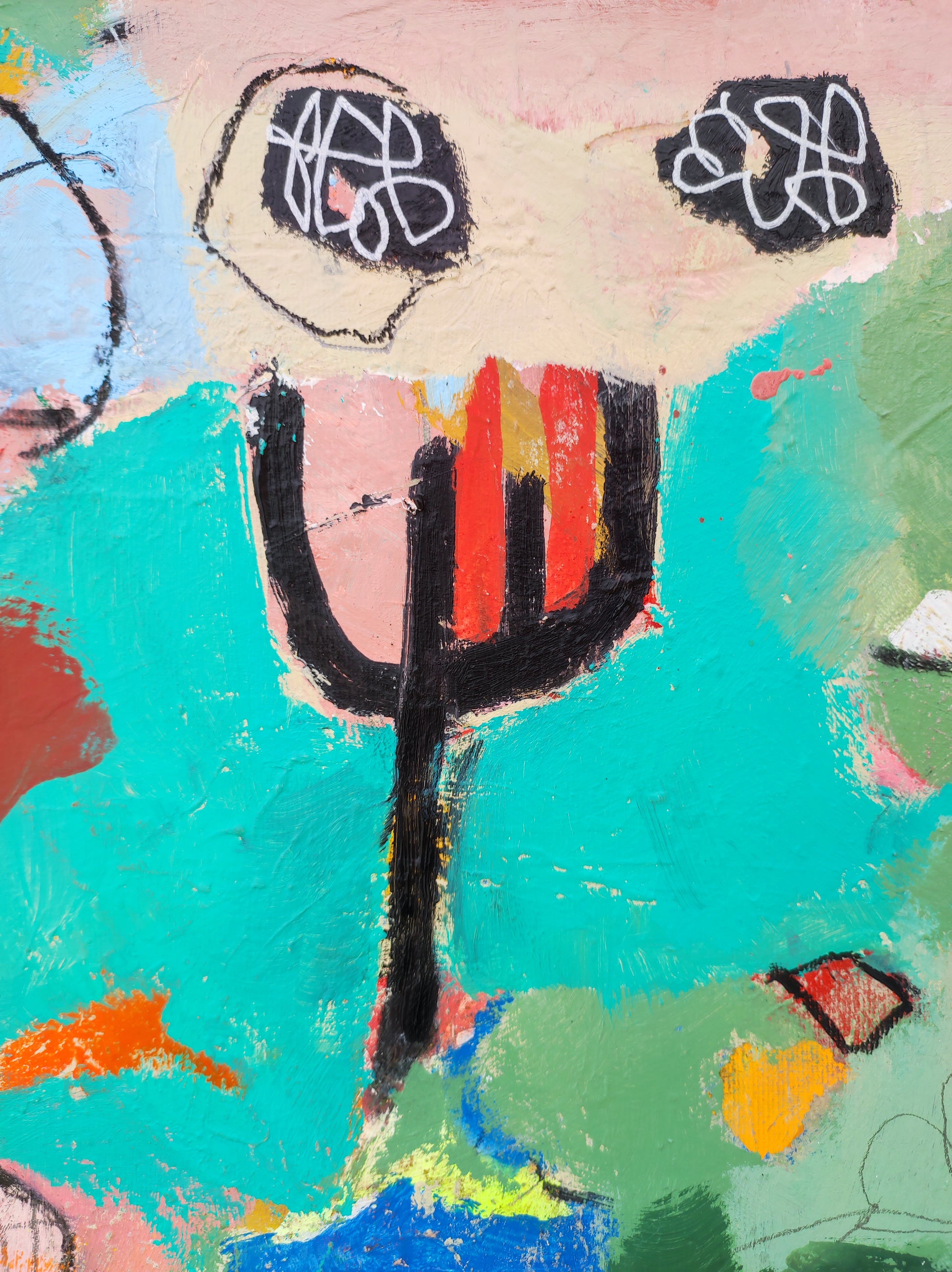 Técnica: acrílico, pigmentos, lápiz, bolígrafo, gesso, pintura en spray, carboncillo, ceras.