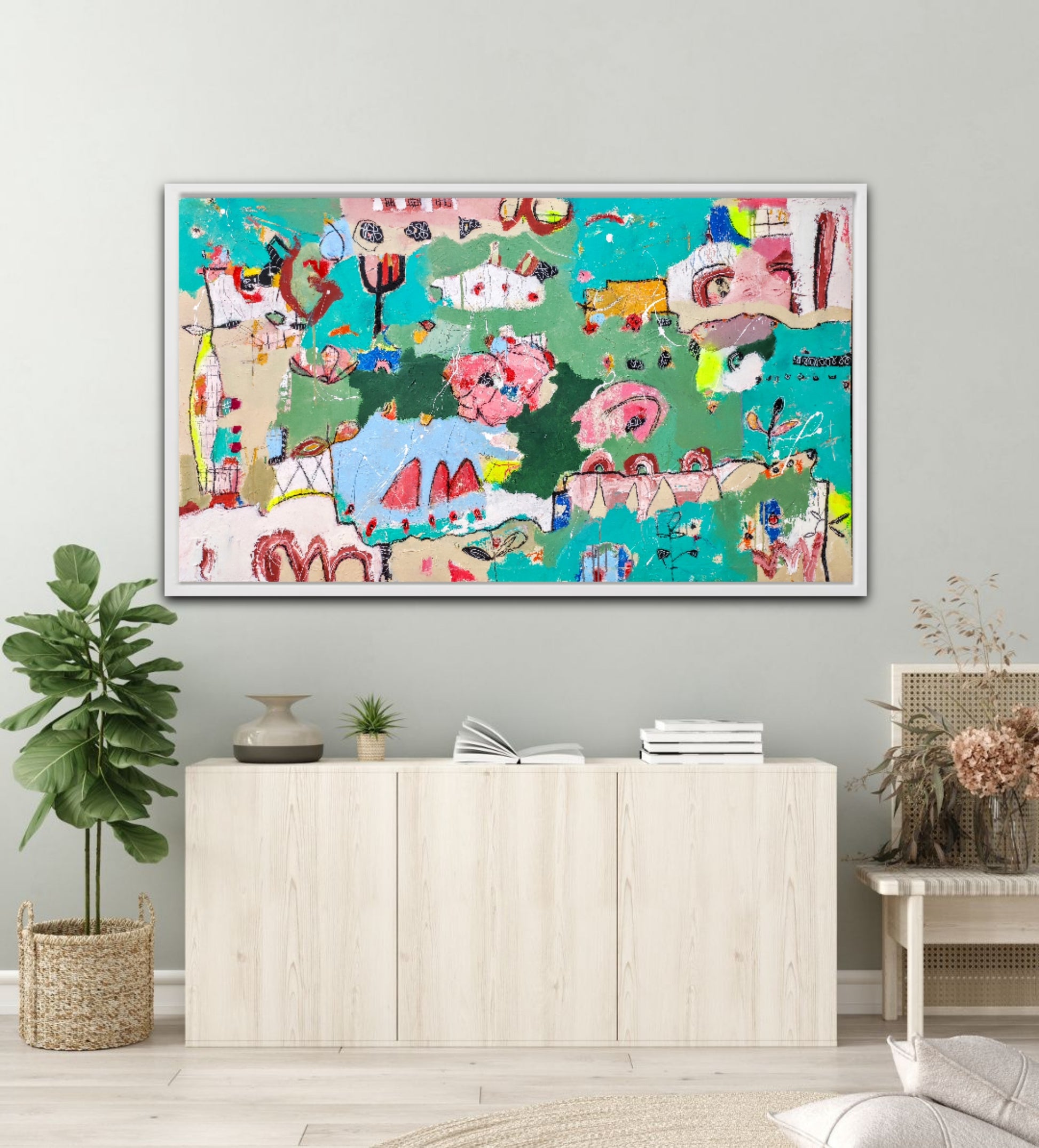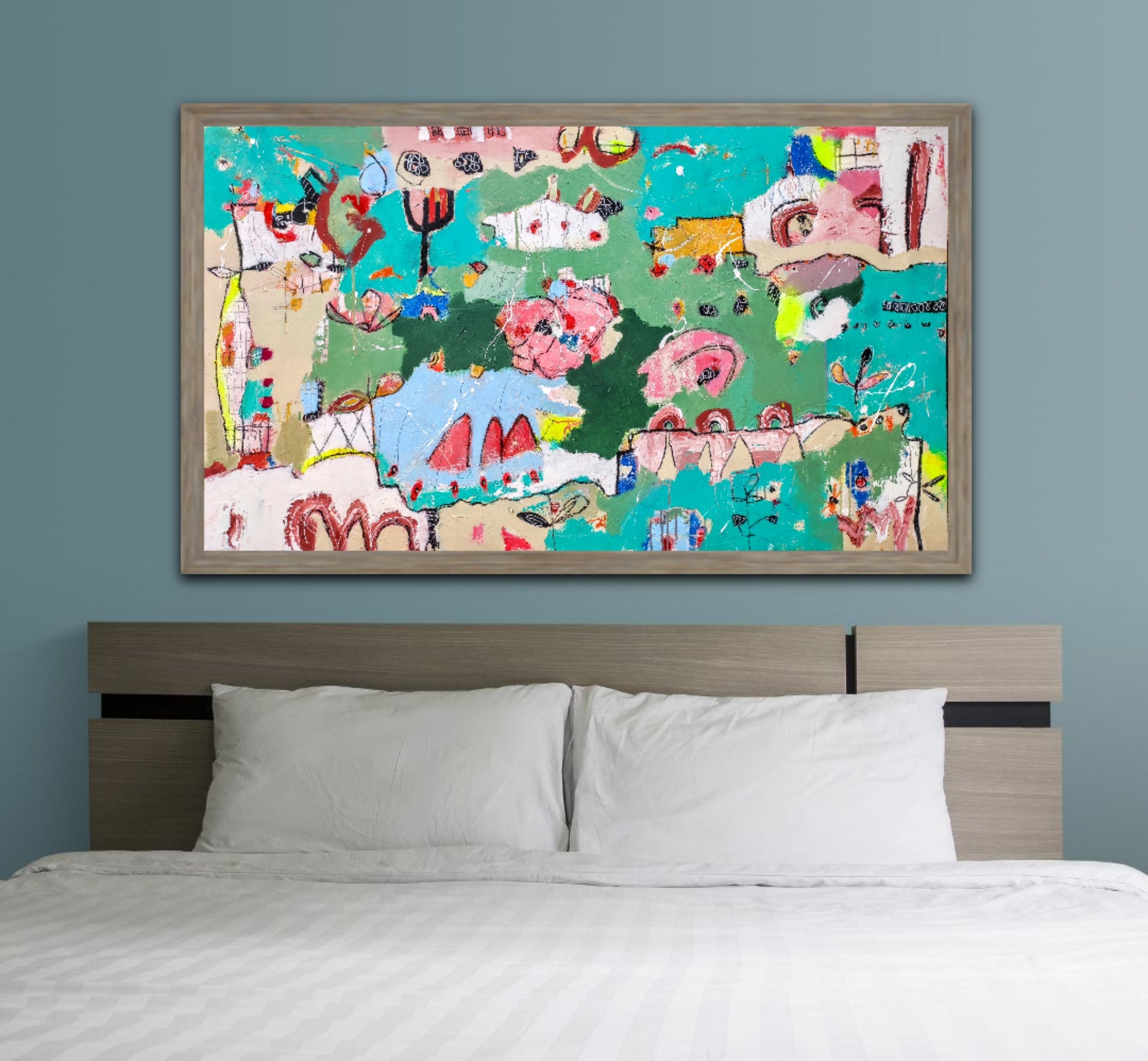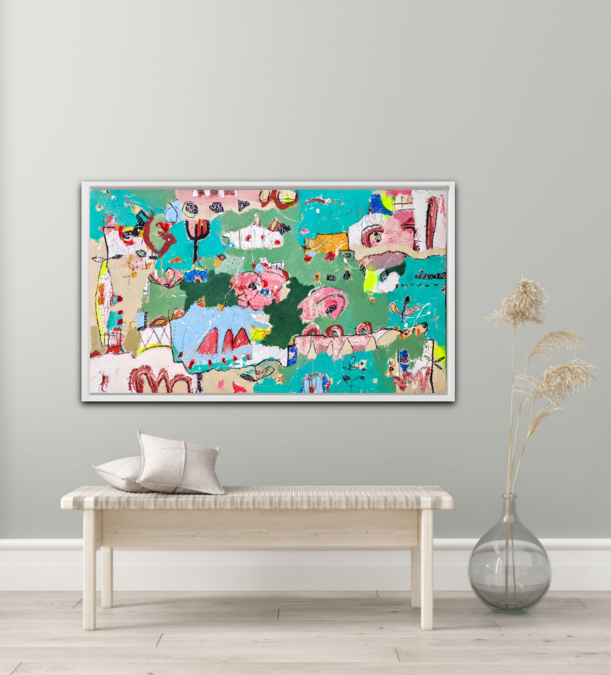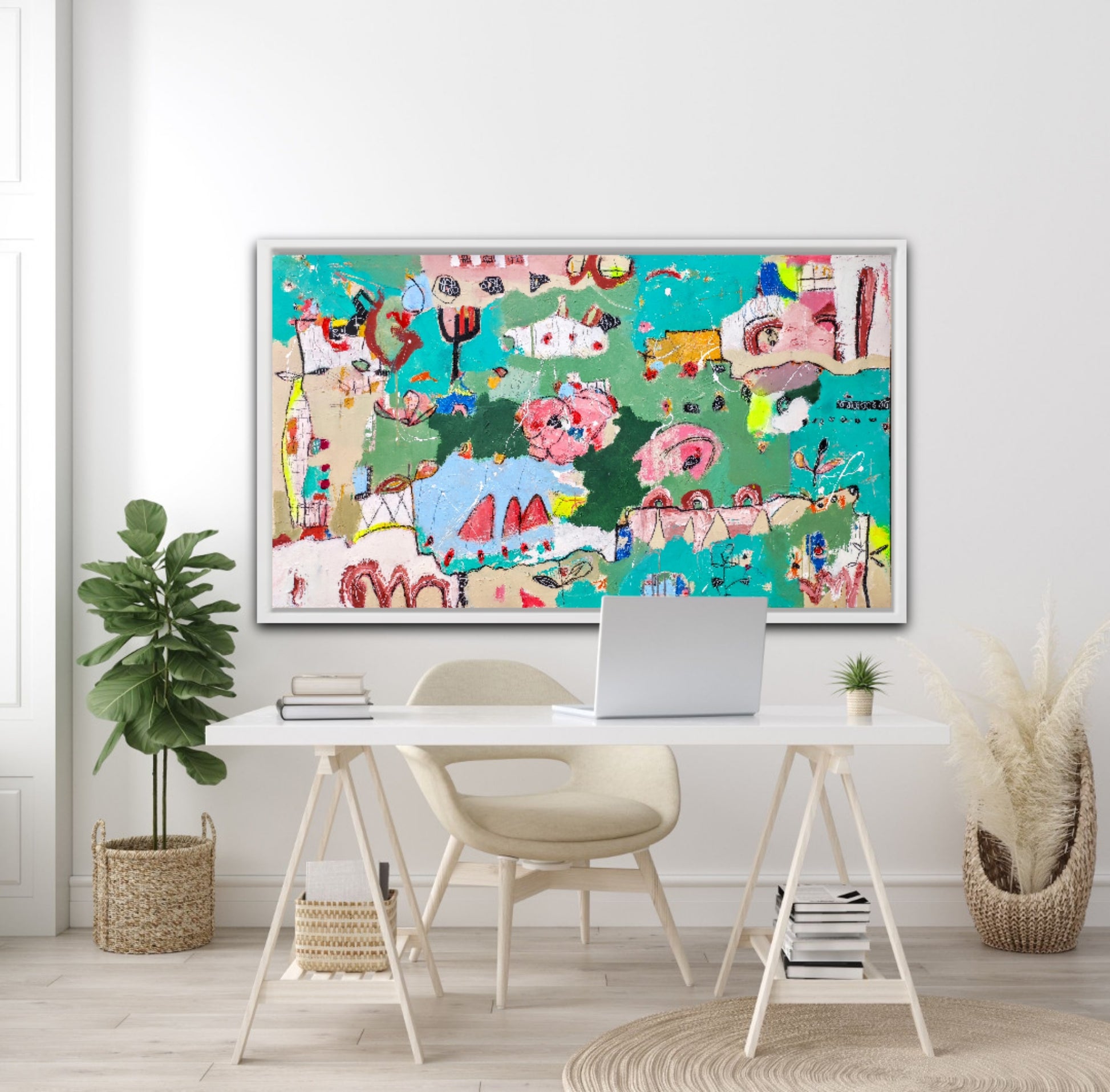 Técnica: acrílico, pigmentos, lápiz, bolígrafo, gesso, pintura en spray, carboncillo, ceras.