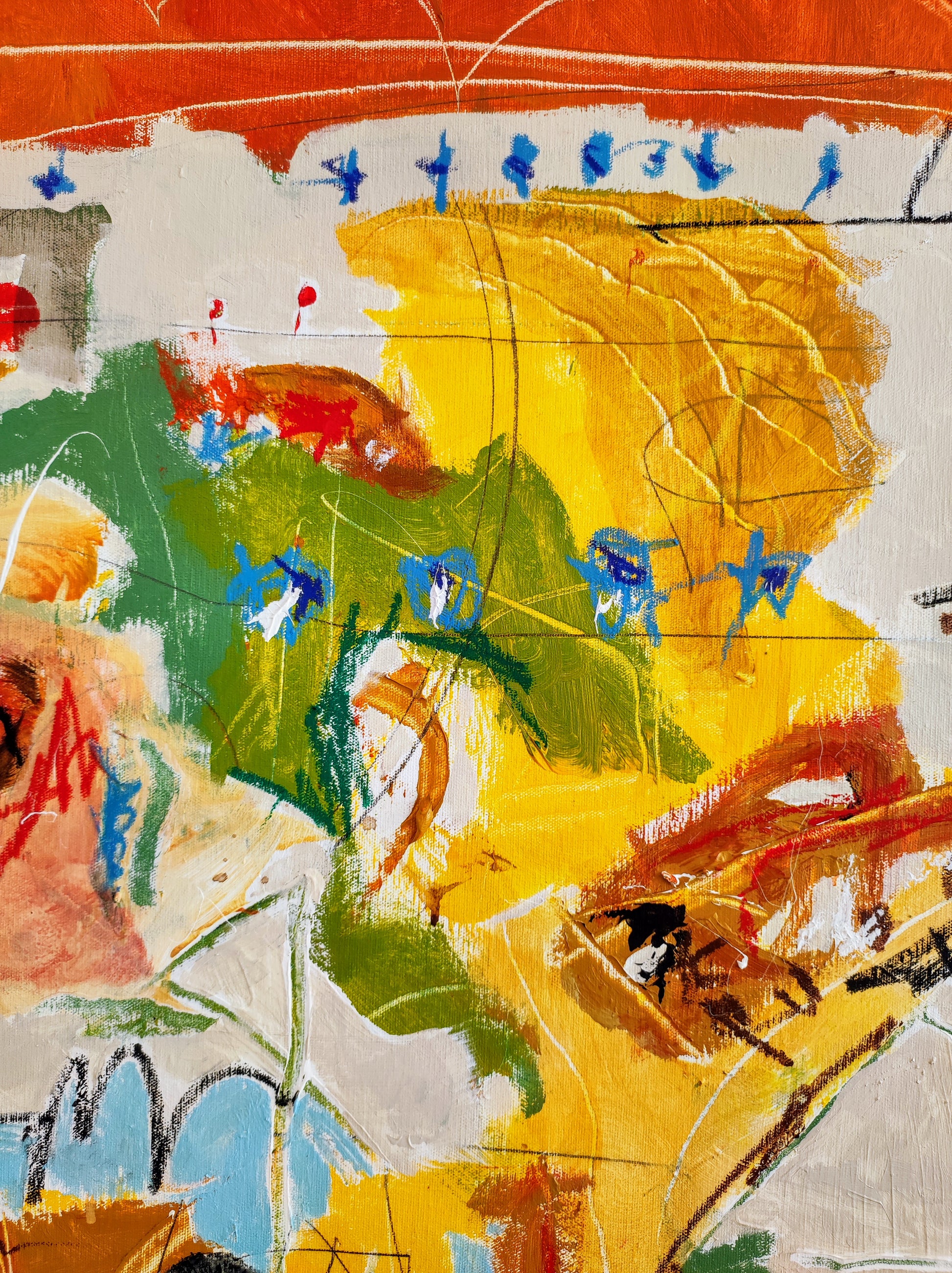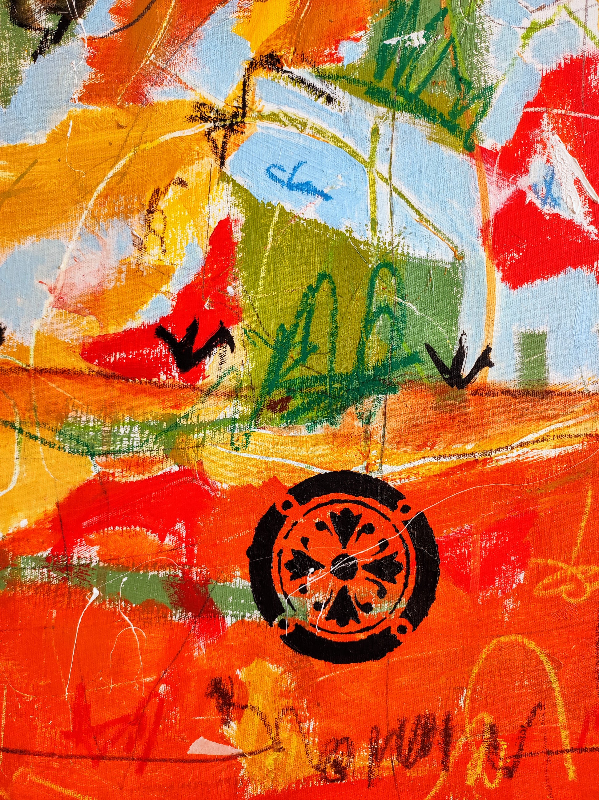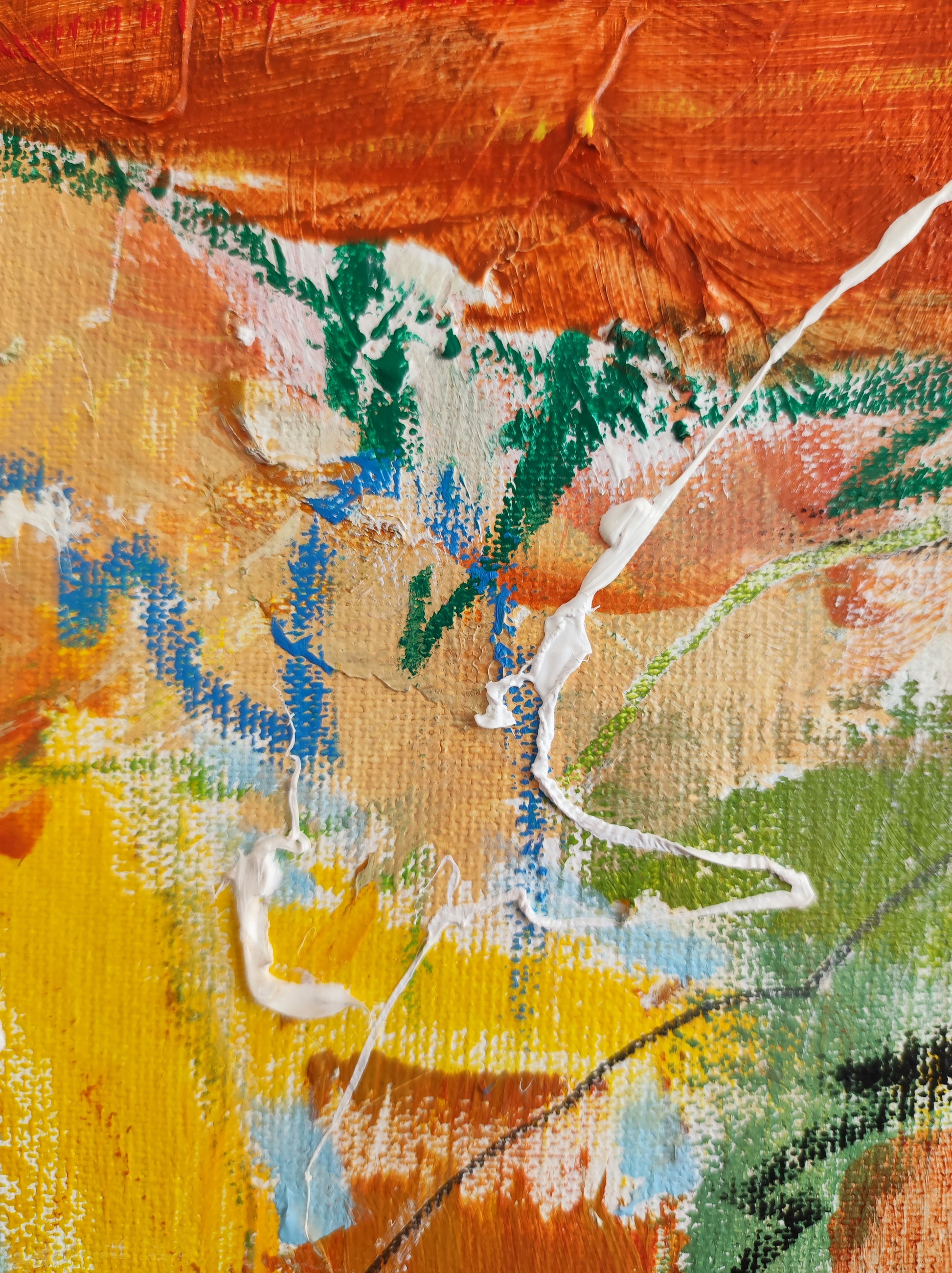 Pintura gestual, intuitiva, que deja que las cosas pasen y se apoya sobre lo que aparece. Aprovechando el accidente y aceptando las consecuencias.