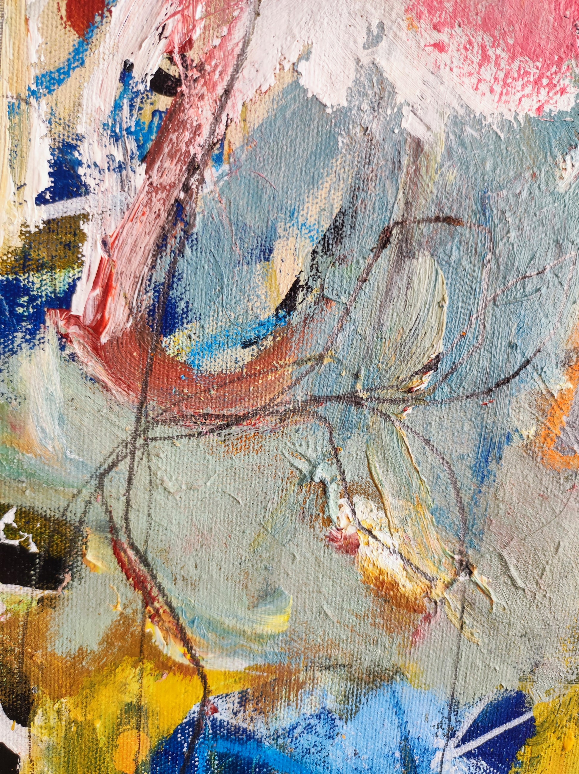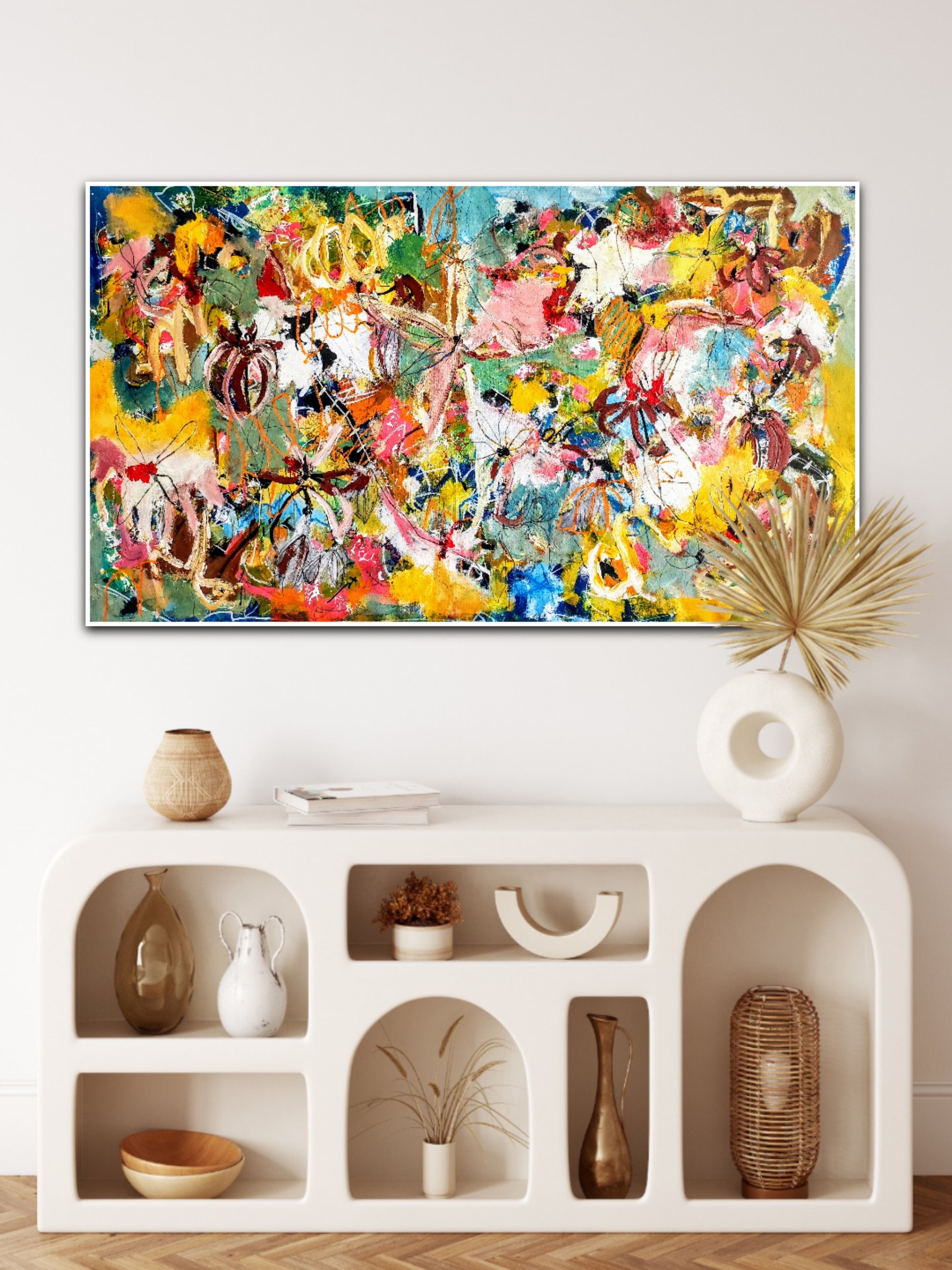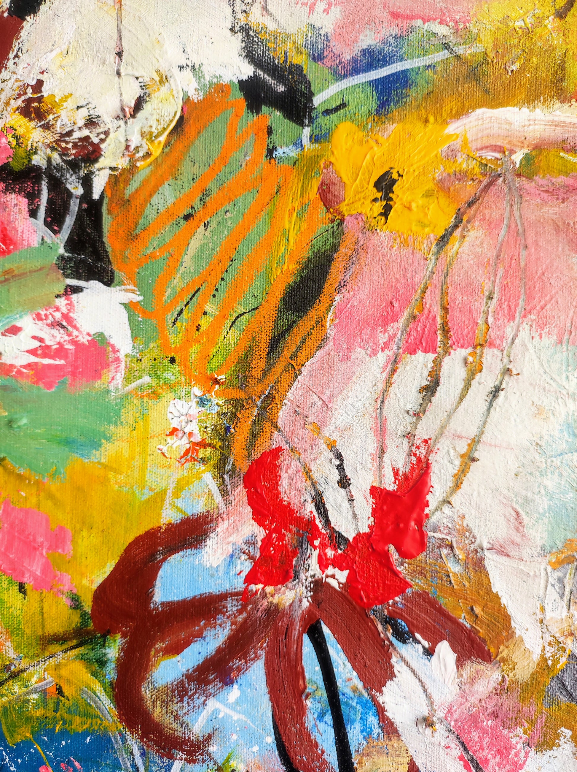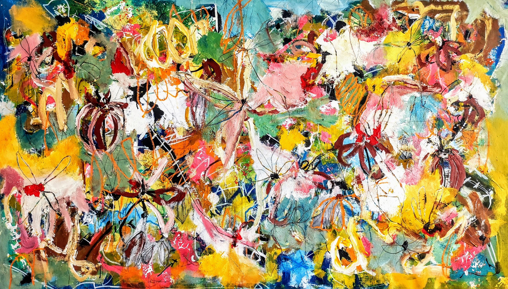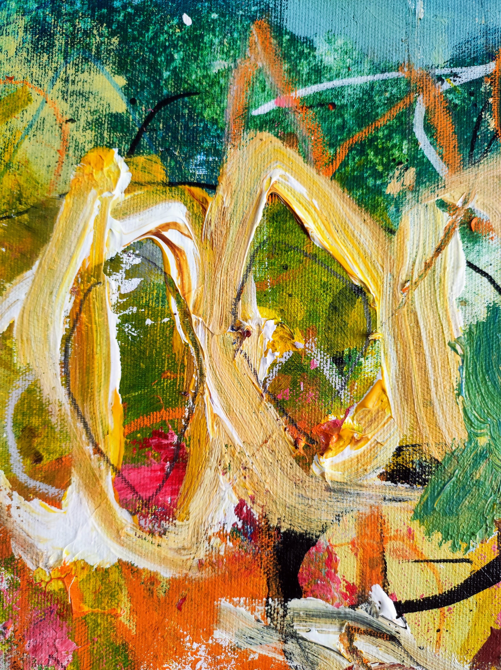Tarde calurosa de verano, mis hijas Aitana y Claudia (10 y 11 años) comienzan a dibujar en un trozo de lienzo que tengo olvidado por el estudio. Con música, bailando empiezan a garabatear un paisaje, su jardín. Al rato sueltan las pinturas y lo dejan todo porque, obviamente en verano, hay cosas mejores que hacer. Tras unos días me fijo en el lienzo y decido trabajarlo. Misma música, sin objetivos, sin el hemisferio izquierdo, sigo creando el jardín de Aitana y Claudia. Van apareciendo colores, formas, Naturaleza...