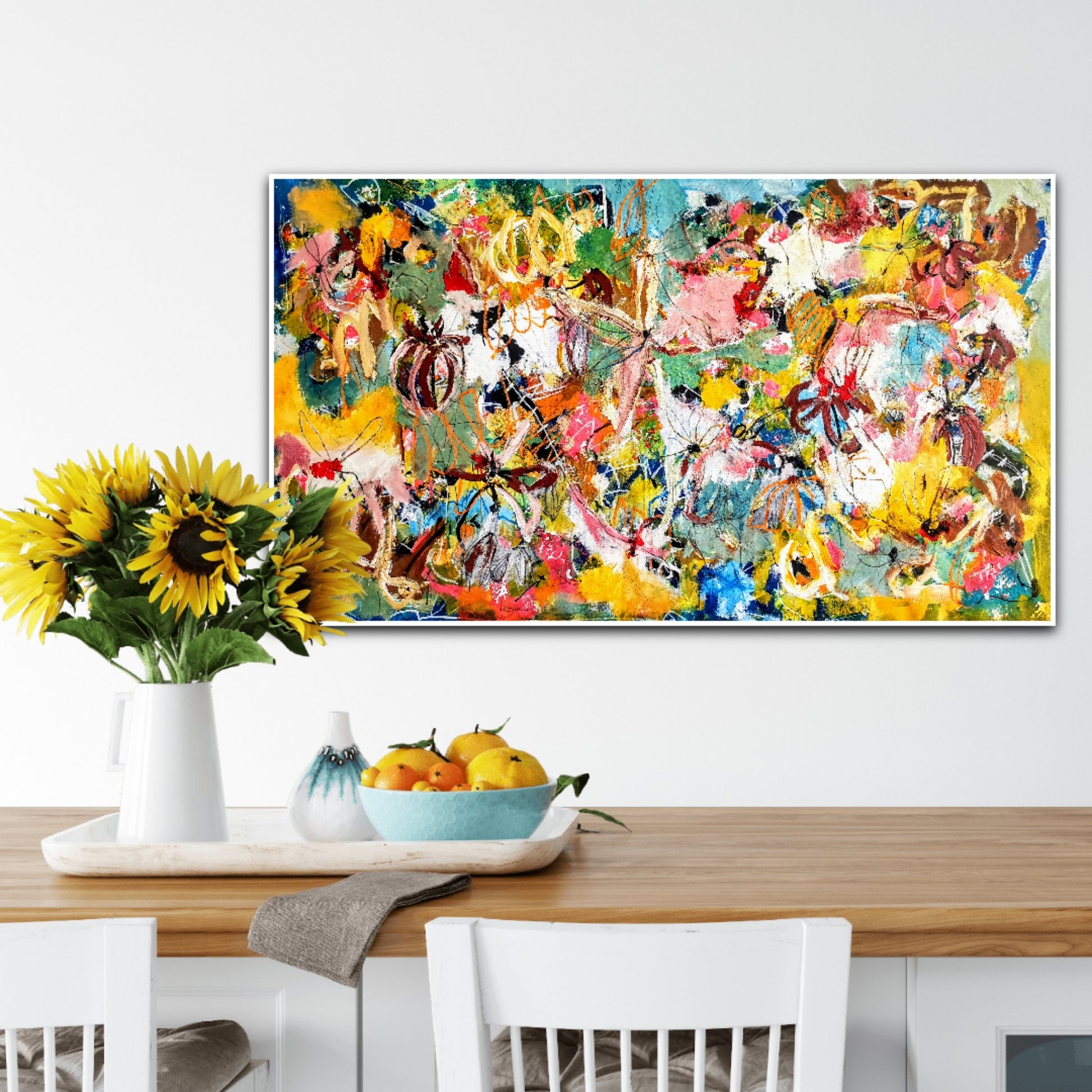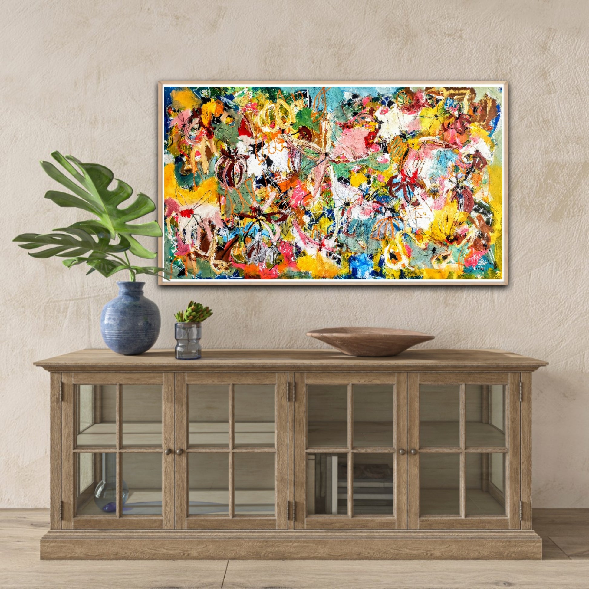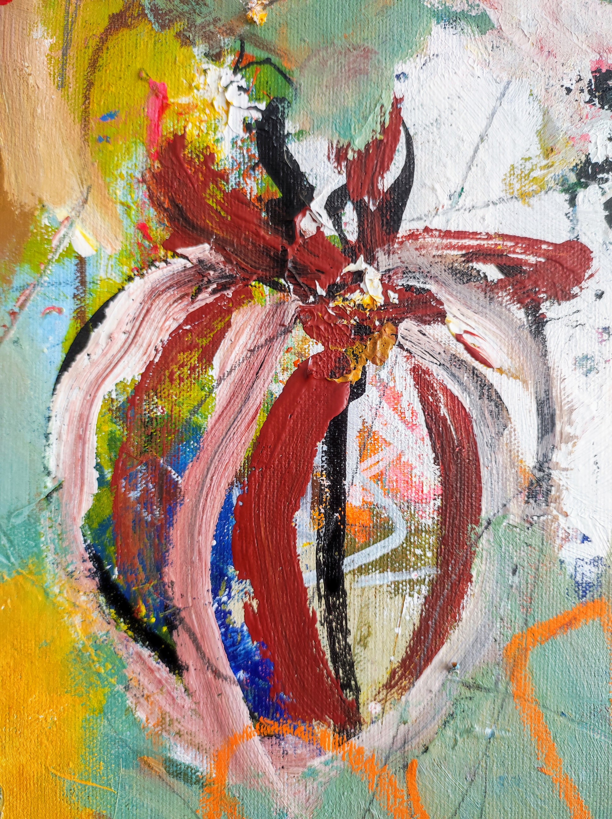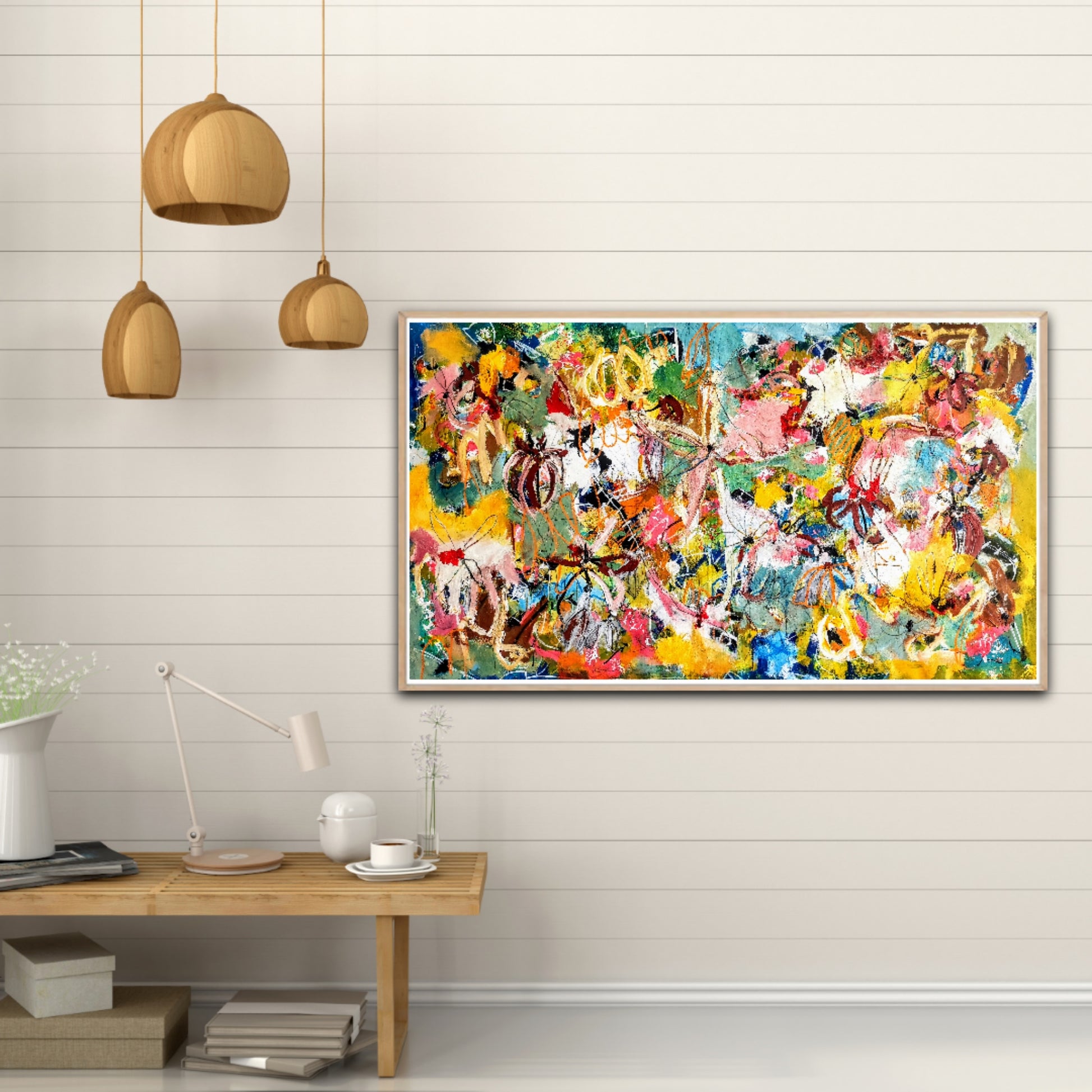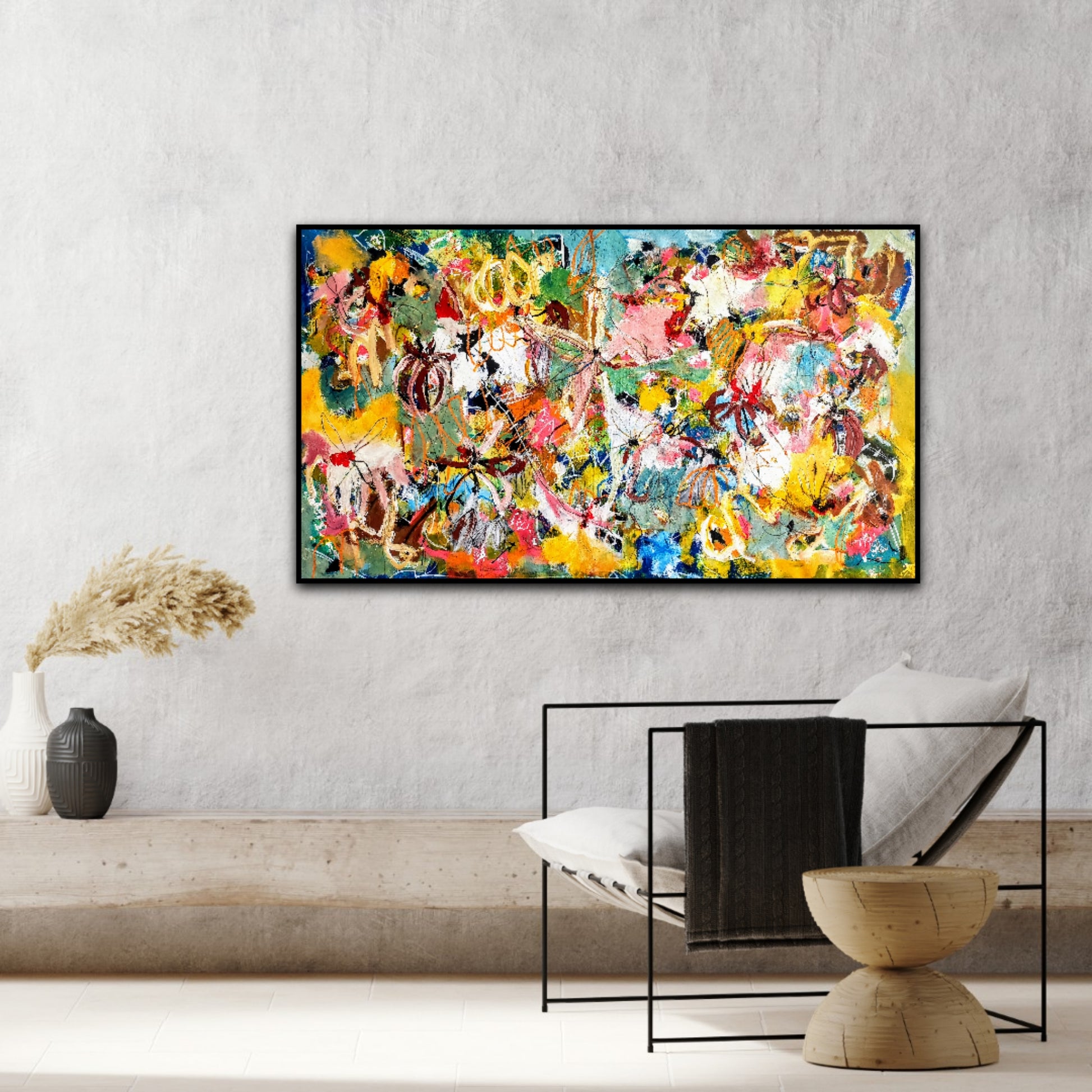 Tarde calurosa de verano, mis hijas Aitana y Claudia (10 y 11 años) comienzan a dibujar en un trozo de lienzo que tengo olvidado por el estudio. Con música, bailando empiezan a garabatear un paisaje, su jardín. Al rato sueltan las pinturas y lo dejan todo porque, obviamente en verano, hay cosas mejores que hacer. Tras unos días me fijo en el lienzo y decido trabajarlo. Misma música, sin objetivos, sin el hemisferio izquierdo, sigo creando el jardín de Aitana y Claudia. Van apareciendo colores, formas, Naturaleza...