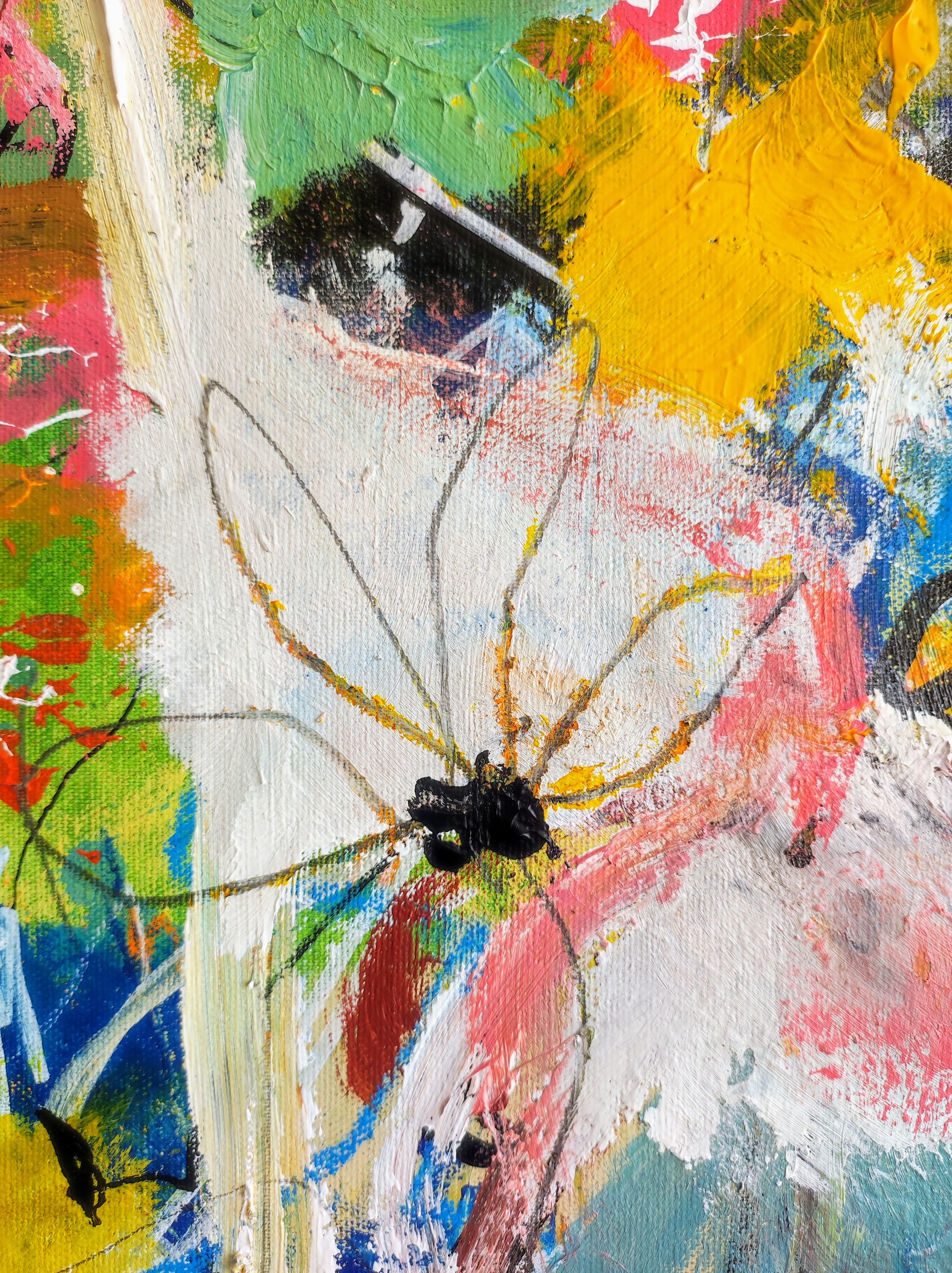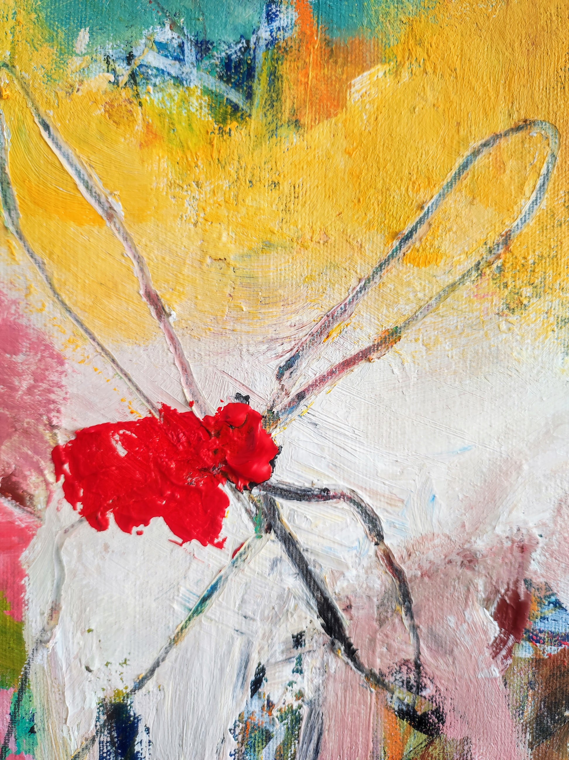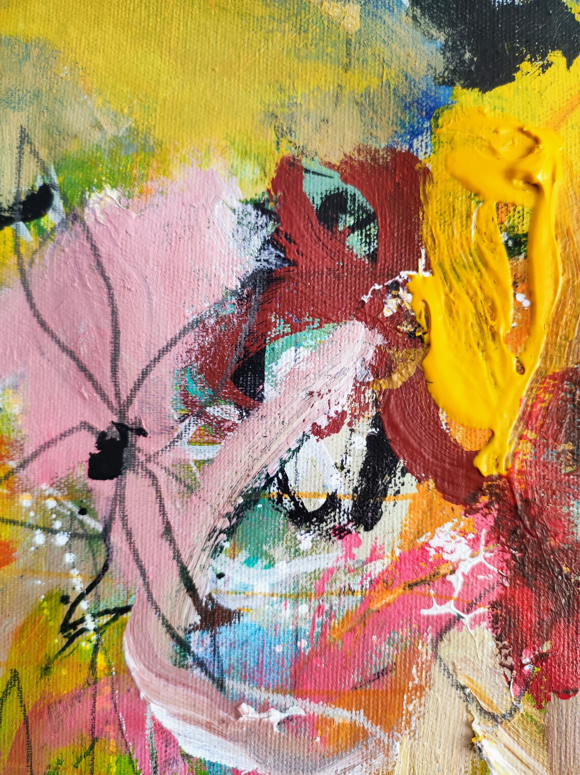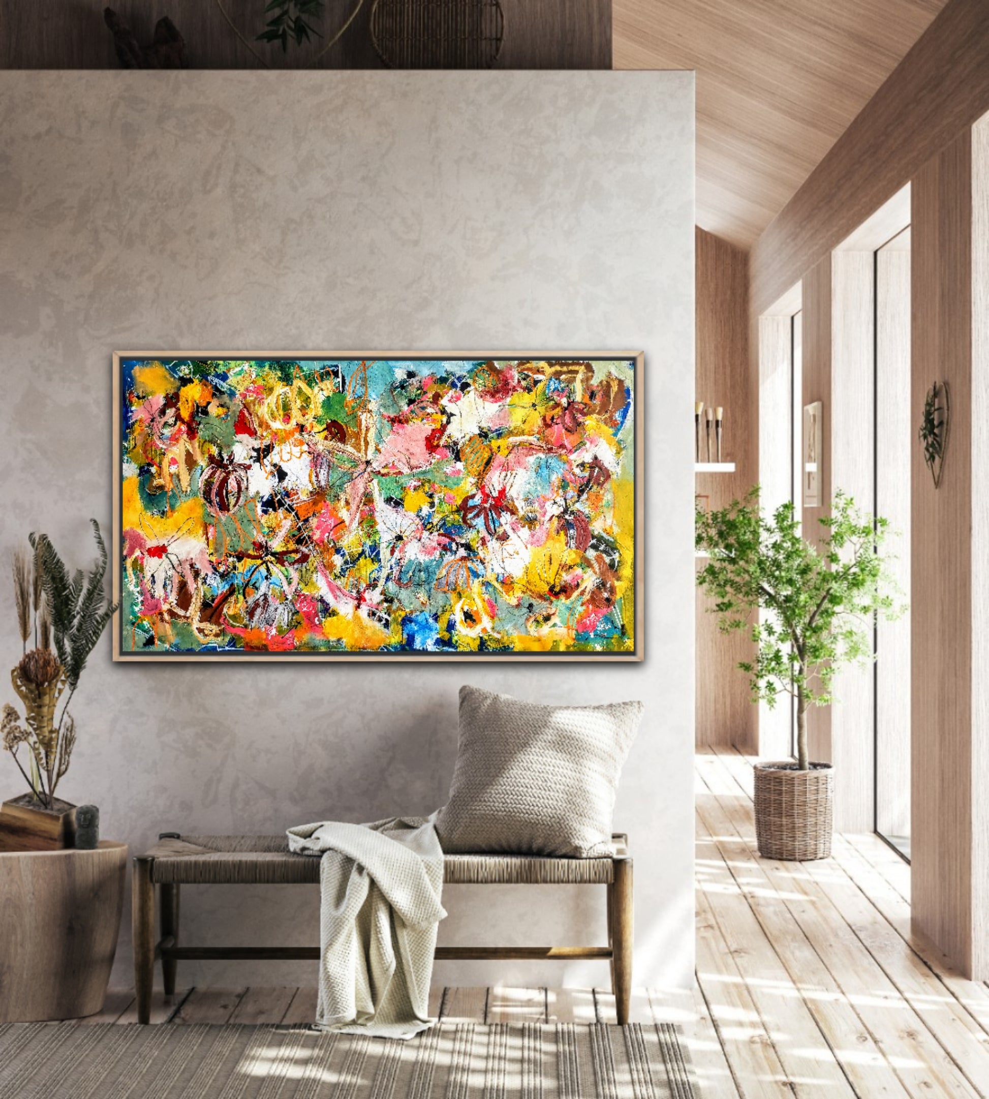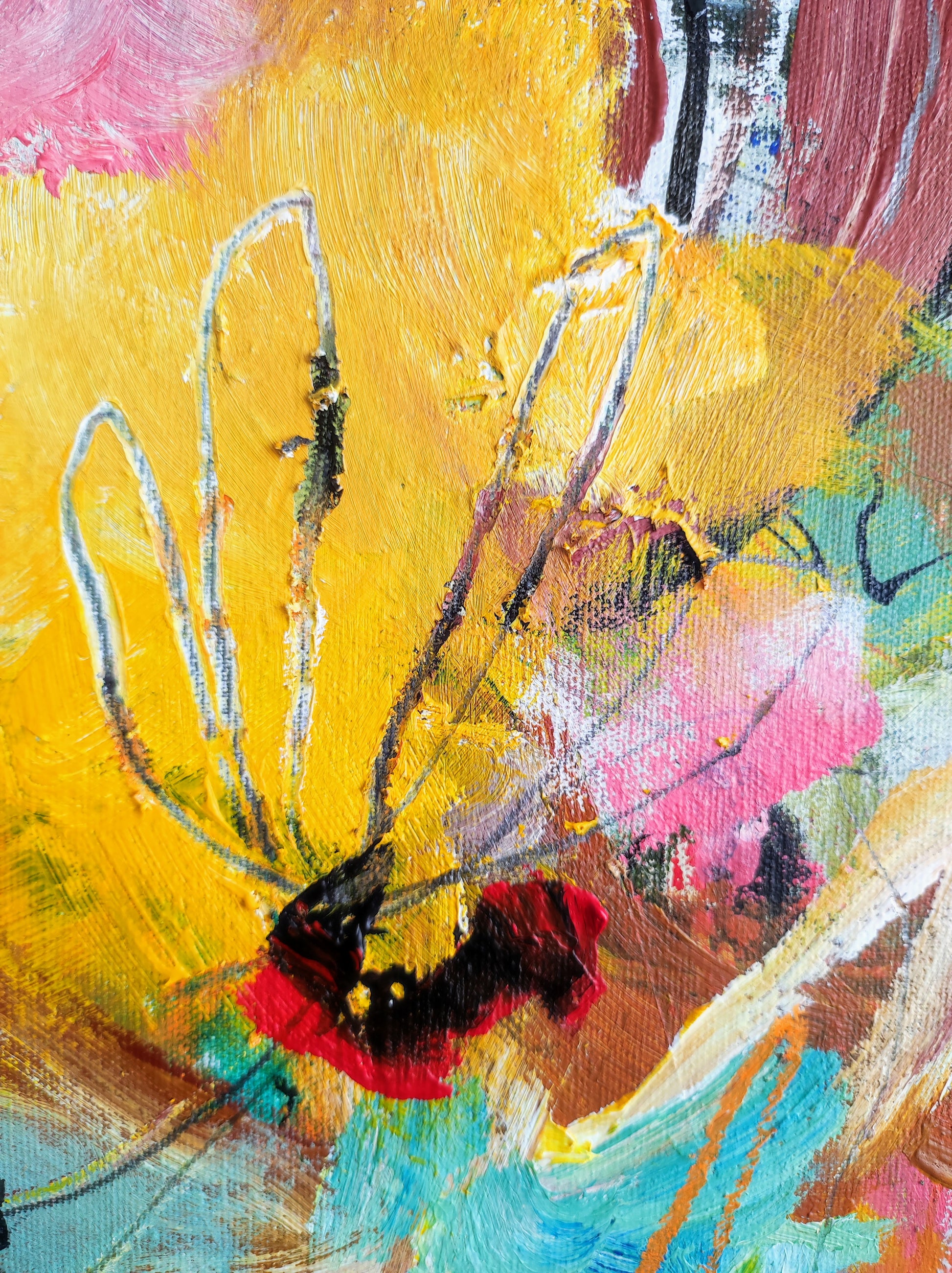 Tarde calurosa de verano, mis hijas Aitana y Claudia (10 y 11 años) comienzan a dibujar en un trozo de lienzo que tengo olvidado por el estudio. Con música, bailando empiezan a garabatear un paisaje, su jardín. Al rato sueltan las pinturas y lo dejan todo porque, obviamente en verano, hay cosas mejores que hacer. Tras unos días me fijo en el lienzo y decido trabajarlo. Misma música, sin objetivos, sin el hemisferio izquierdo, sigo creando el jardín de Aitana y Claudia. Van apareciendo colores, formas, Naturaleza...