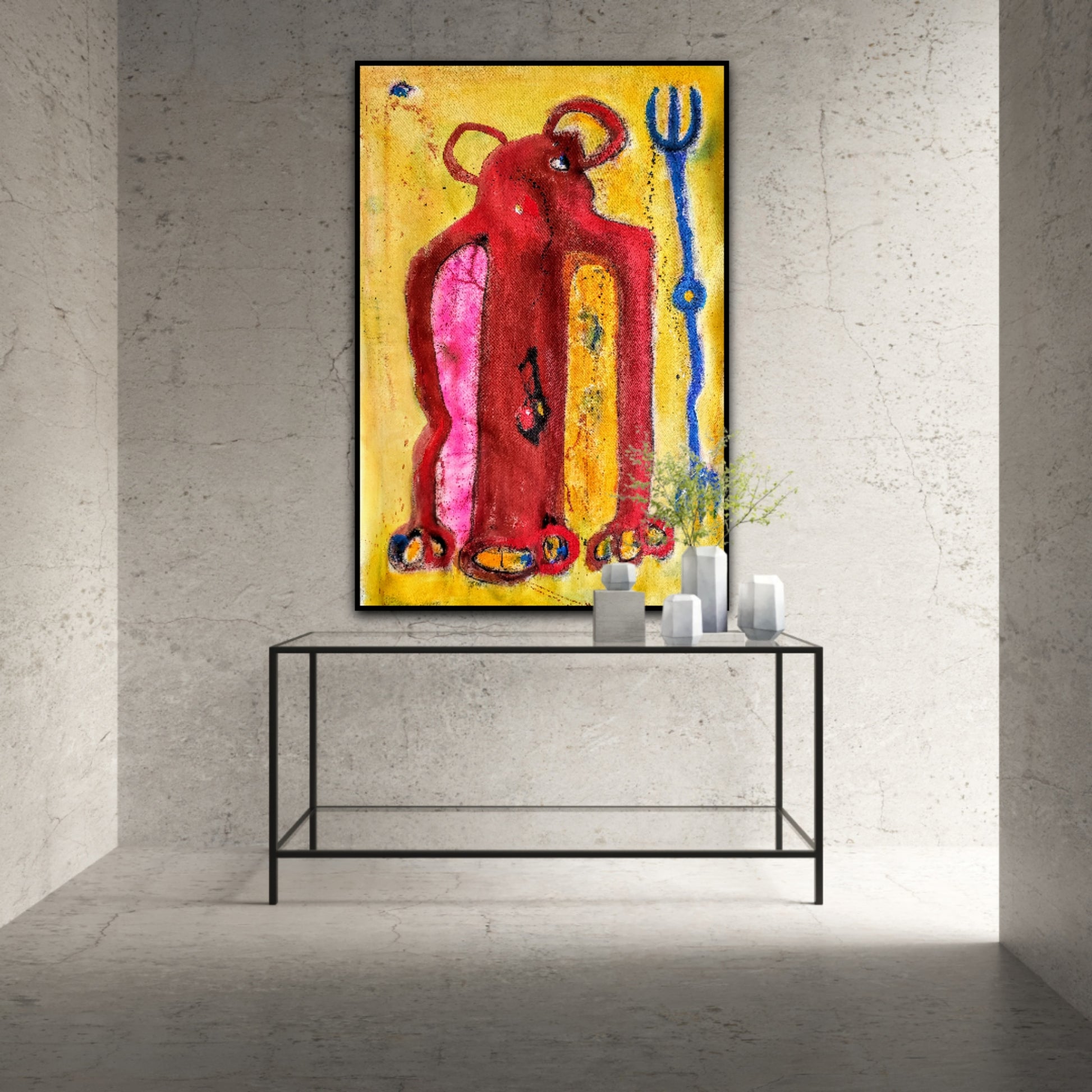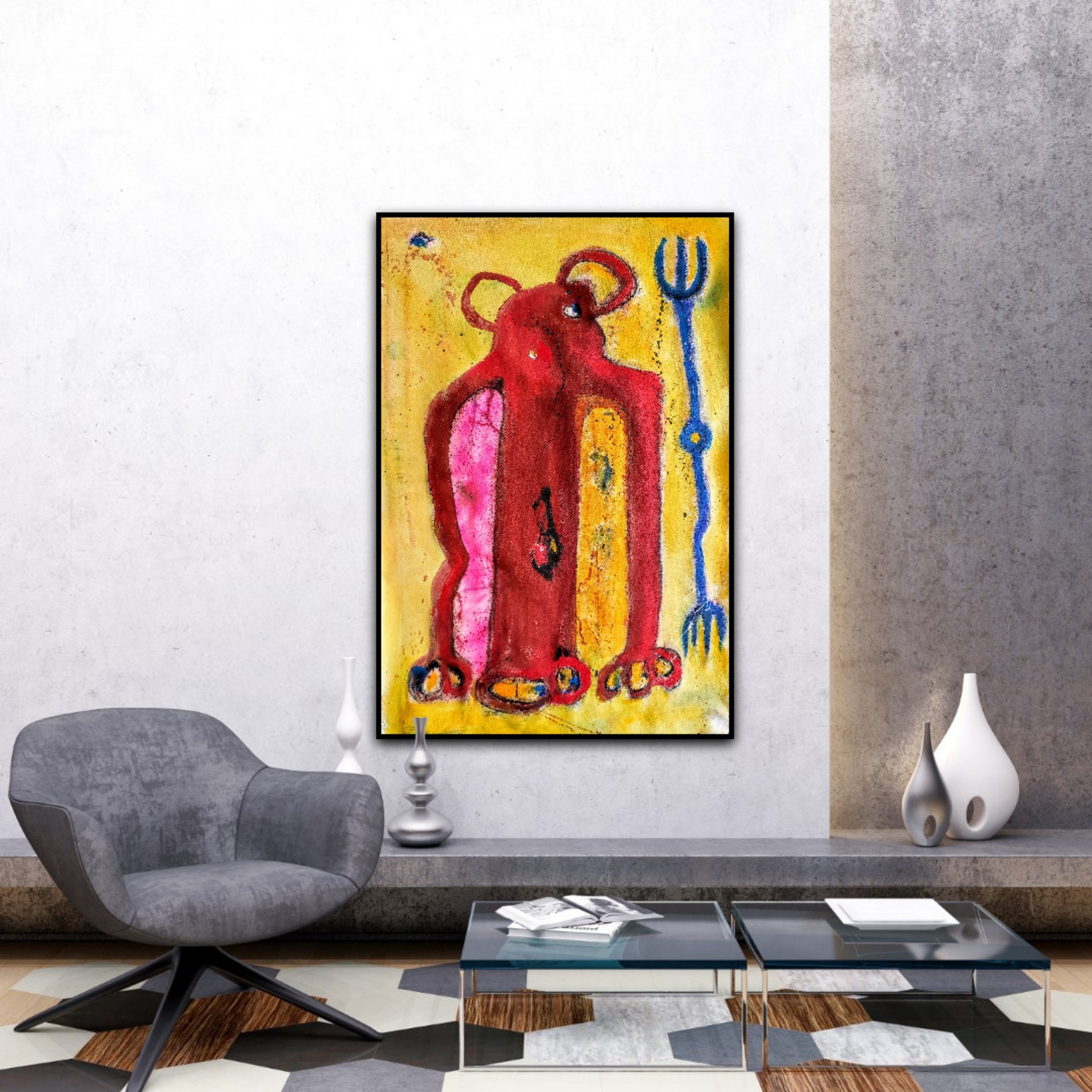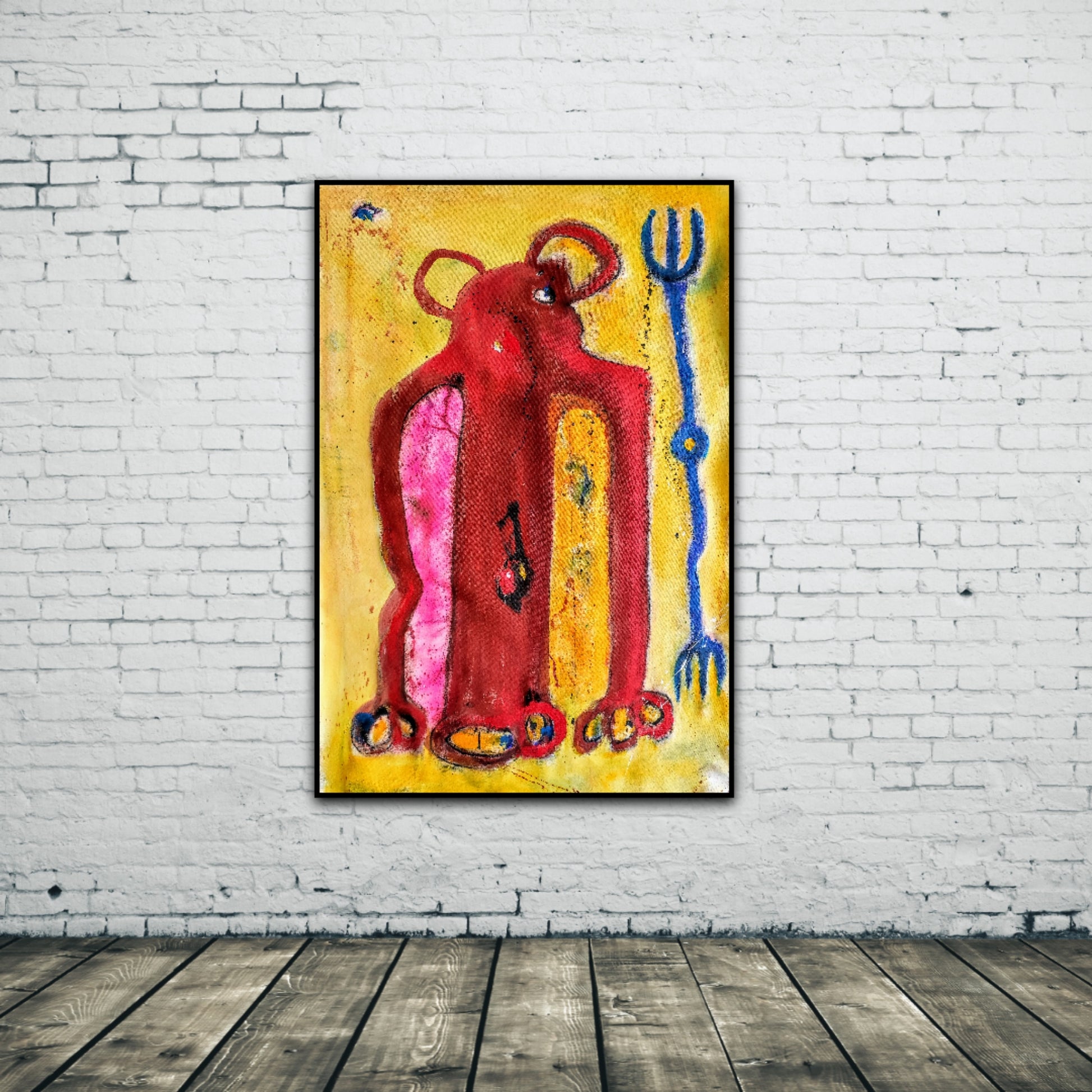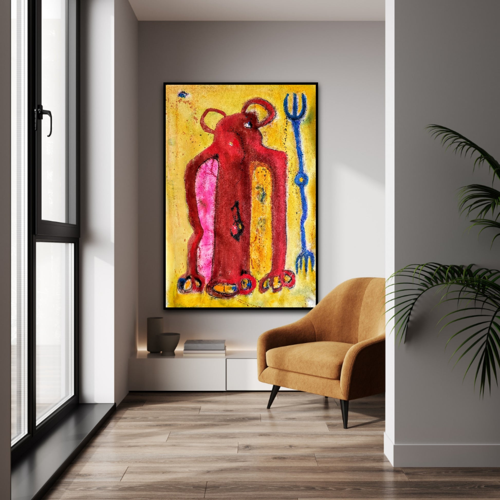 La figura original tiene una extraña forma muy diferente a otras pinturas de la misma época y contexto. En la obra pictórica se hace una interpretación libre de dicha figura aprovechando su gran carga expresiva.