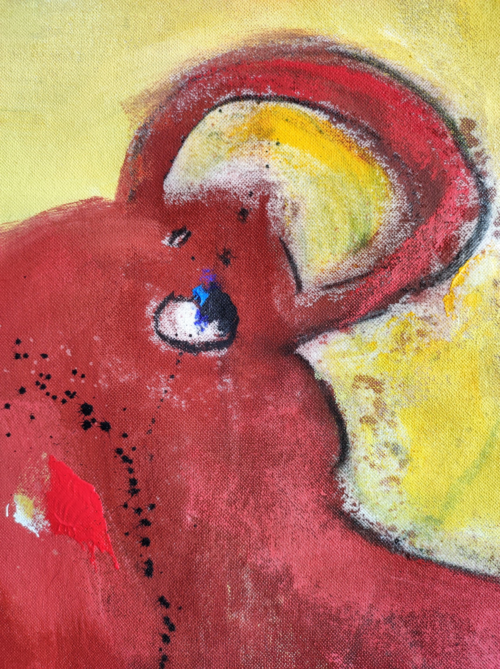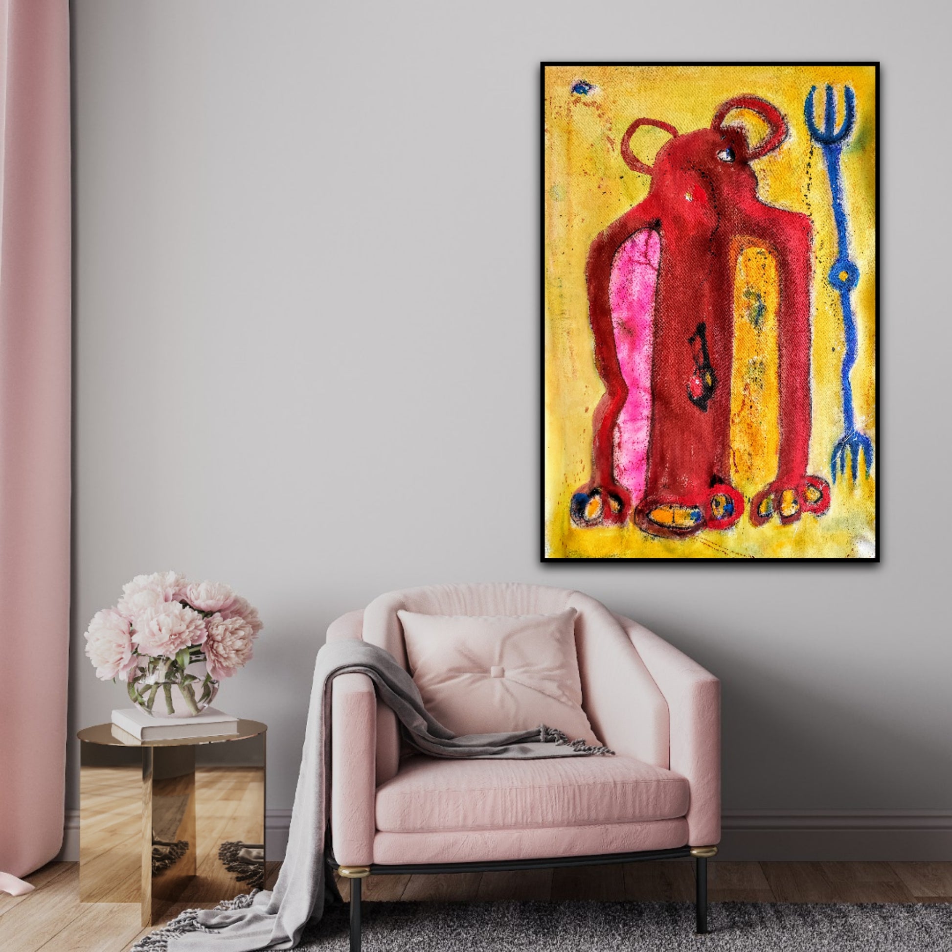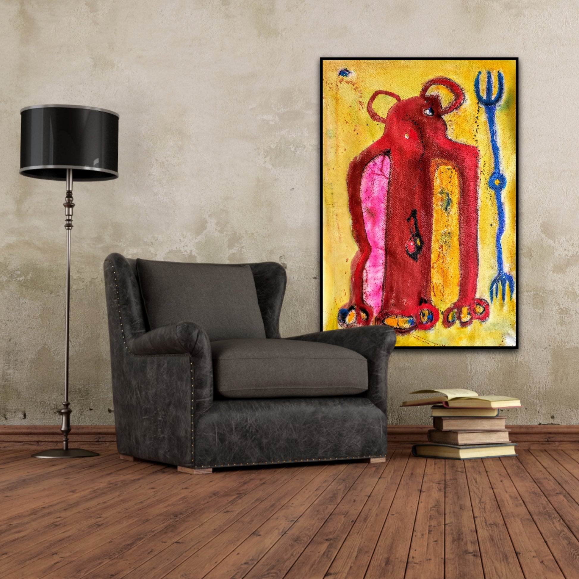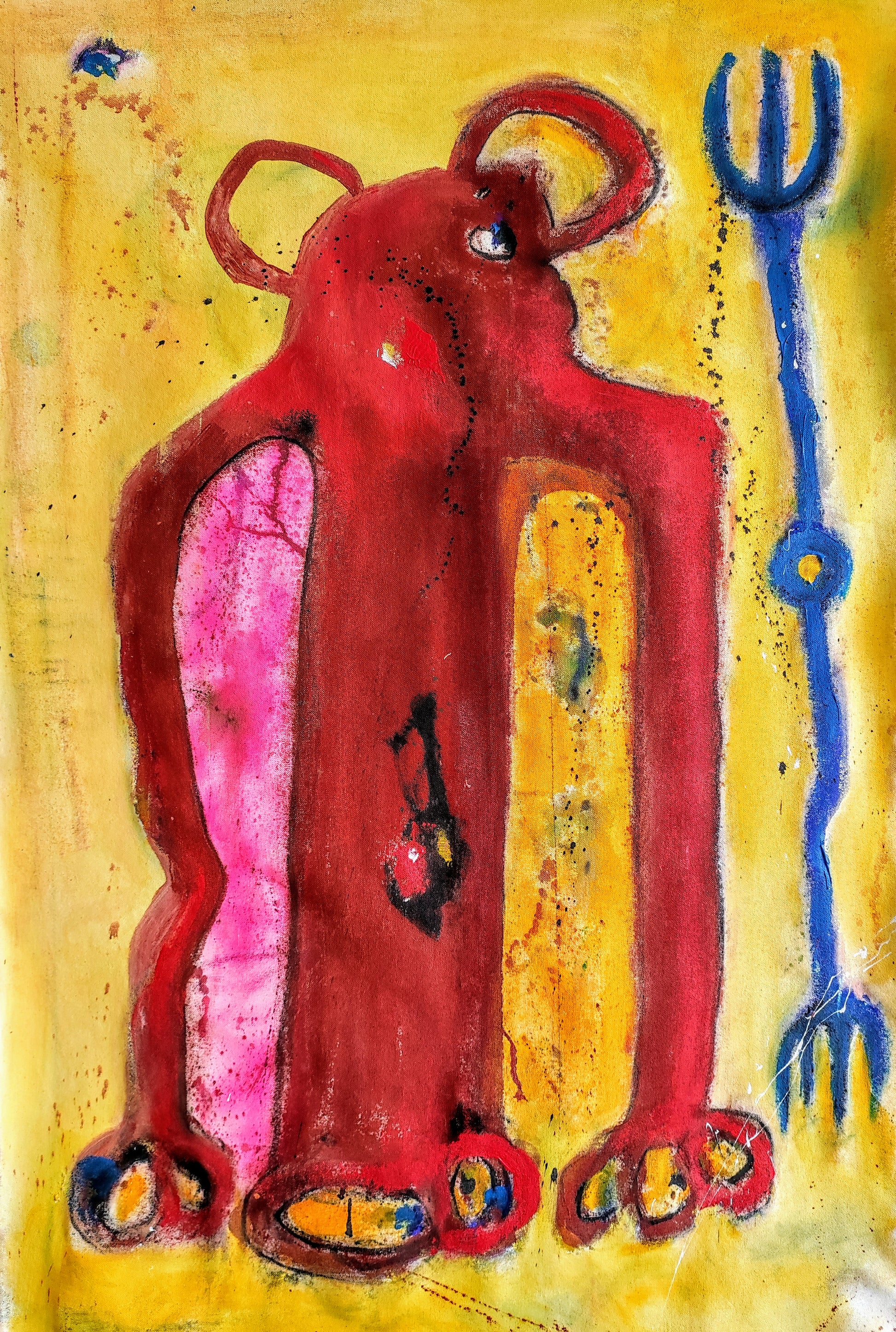 La figura original tiene una extraña forma muy diferente a otras pinturas de la misma época y contexto. En la obra pictórica se hace una interpretación libre de dicha figura aprovechando su gran carga expresiva.