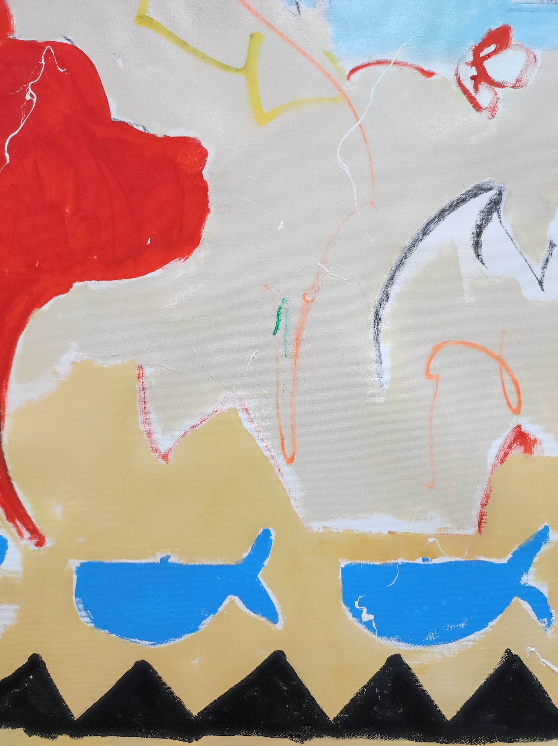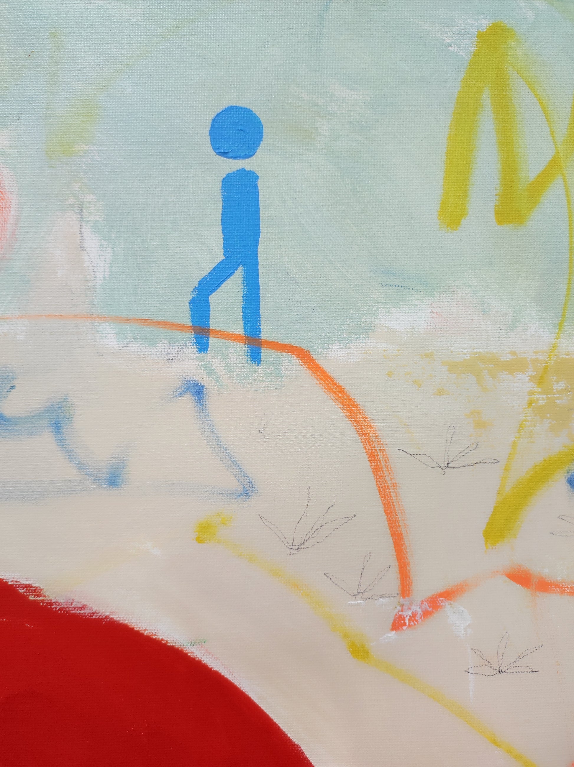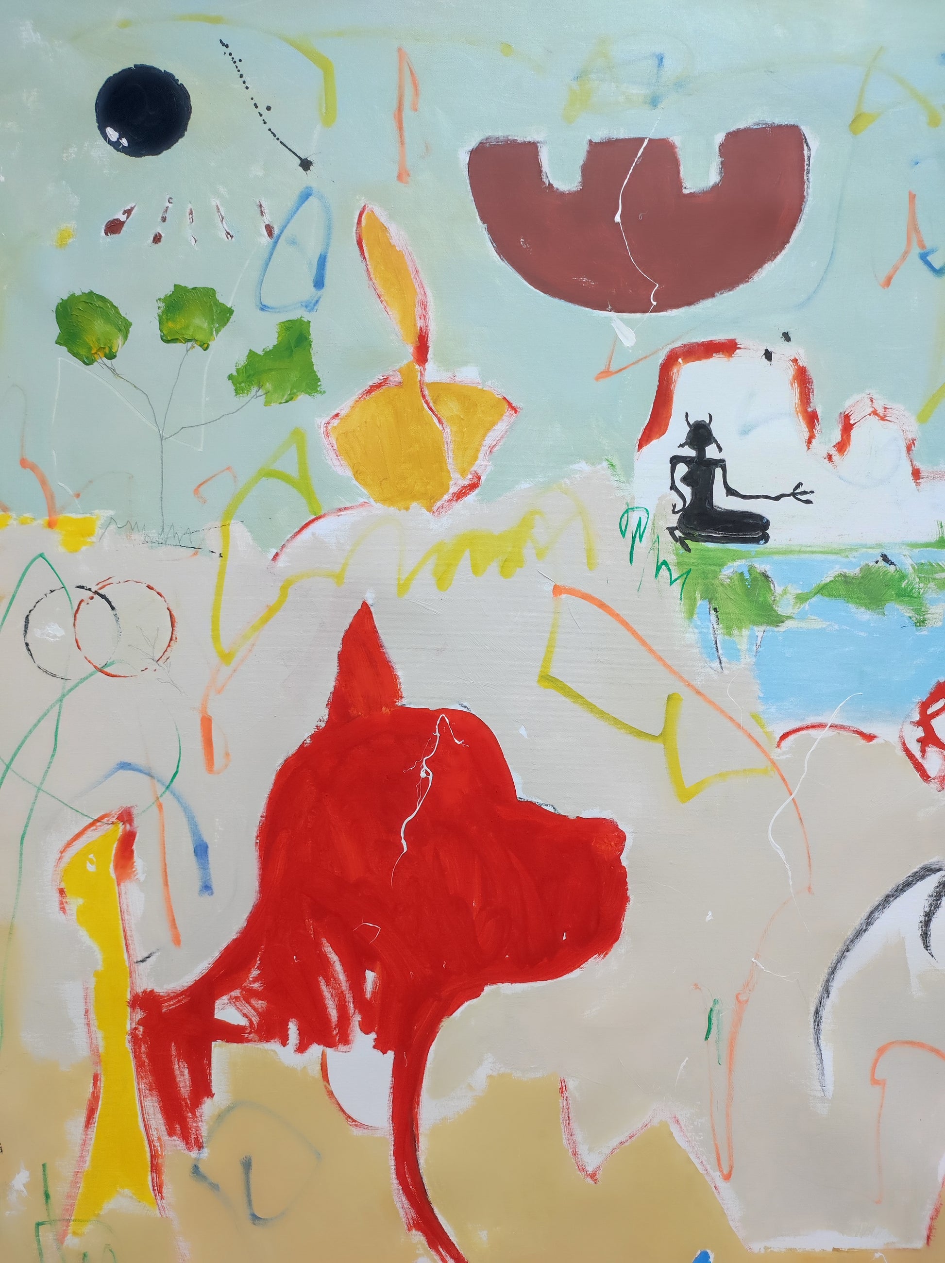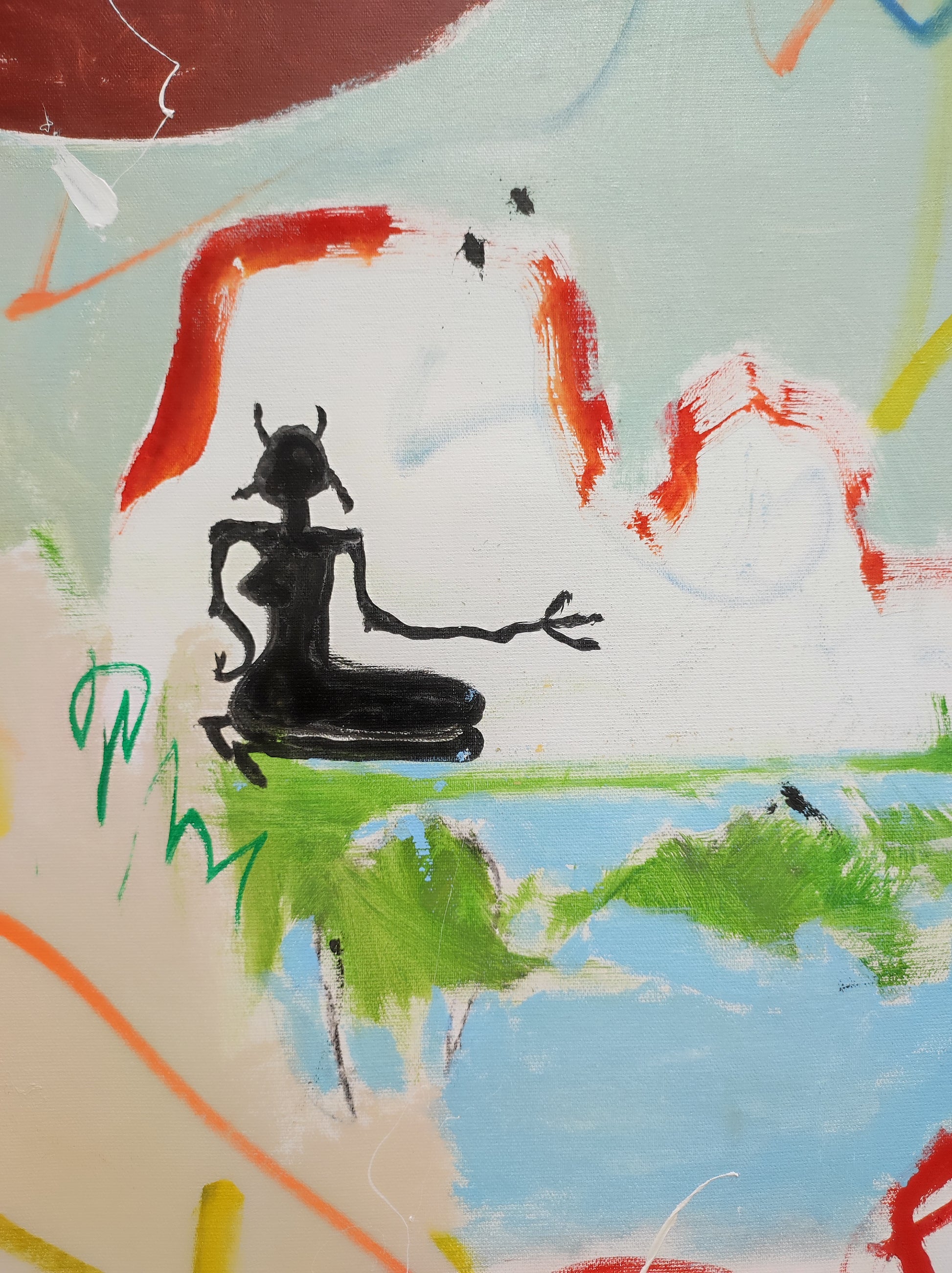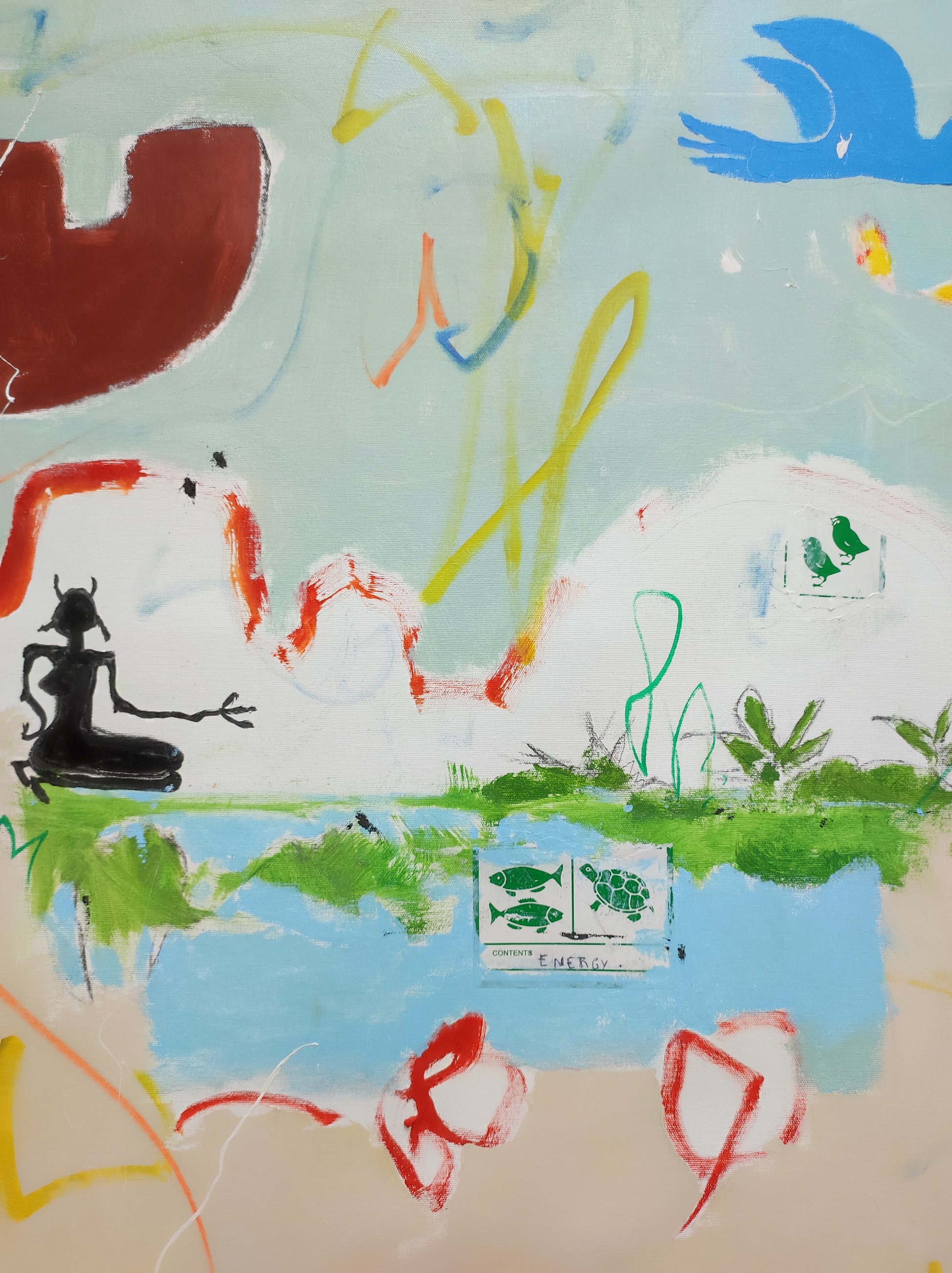 Pintura gestual, intuitiva, que deja que las cosas pasen y se apoya sobre lo que aparece. Aprovechando el accidente y aceptando las consecuencias.