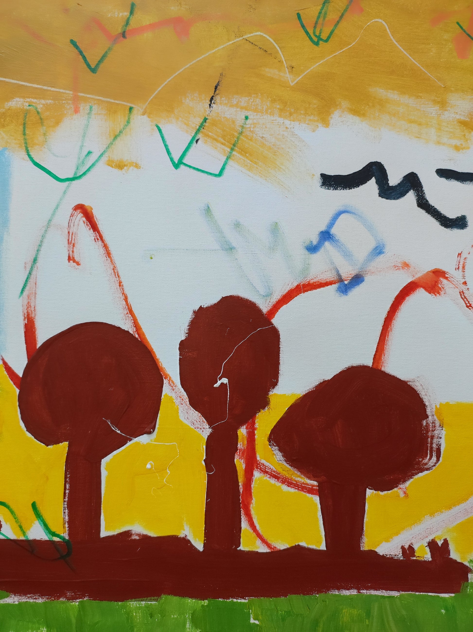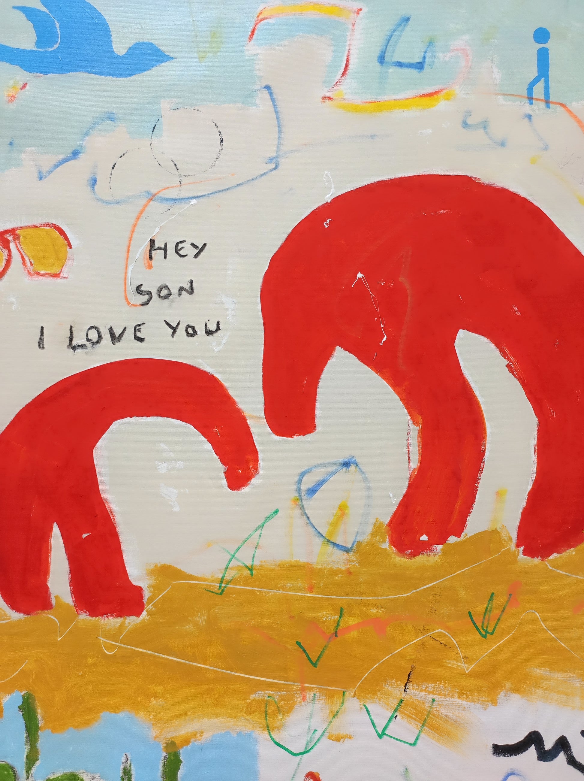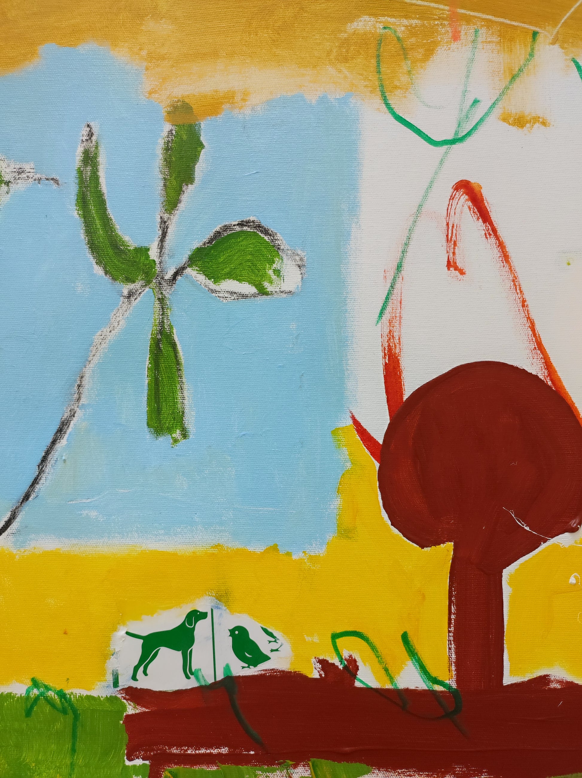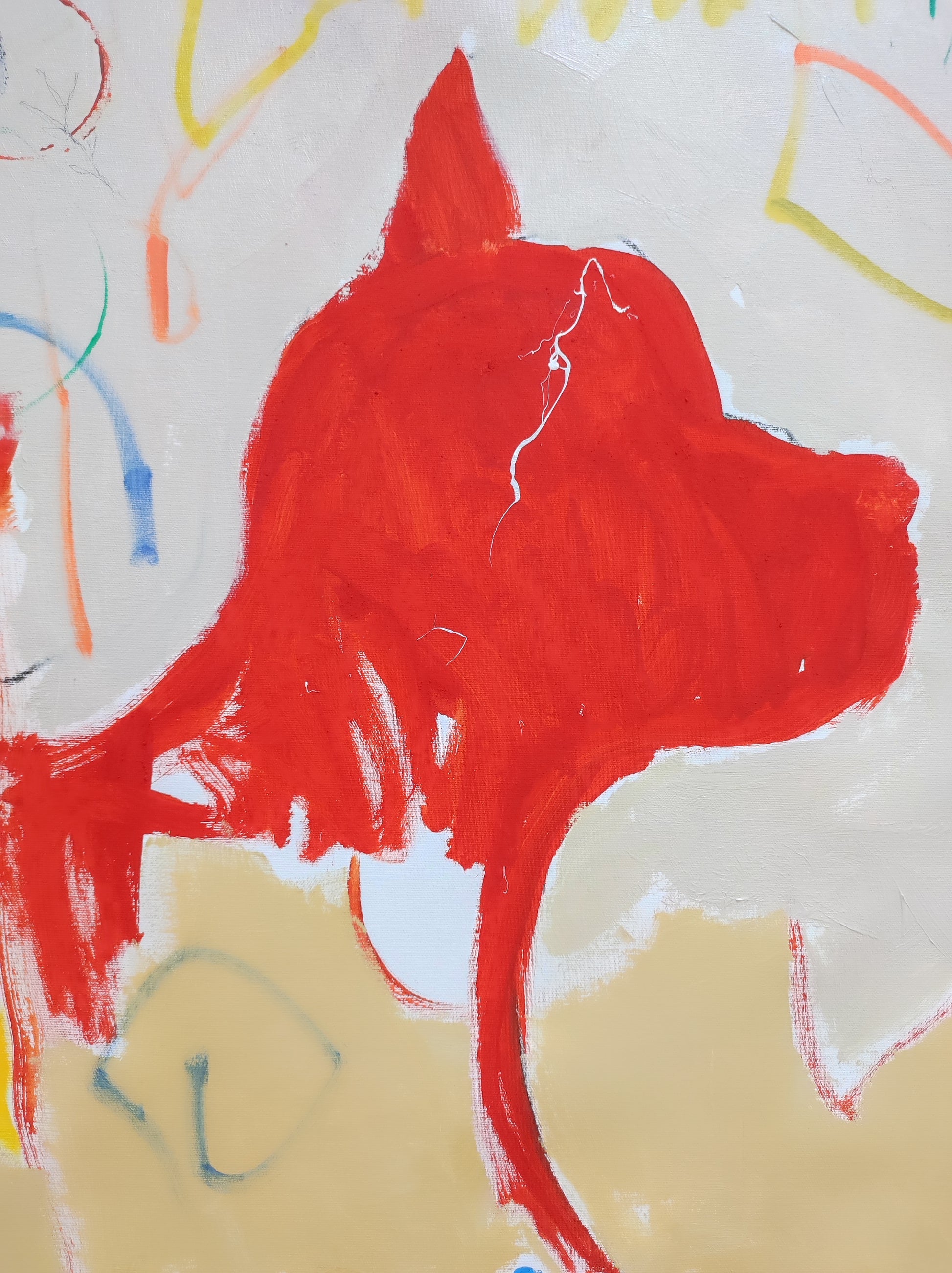 Pintura gestual, intuitiva, que deja que las cosas pasen y se apoya sobre lo que aparece. Aprovechando el accidente y aceptando las consecuencias.
