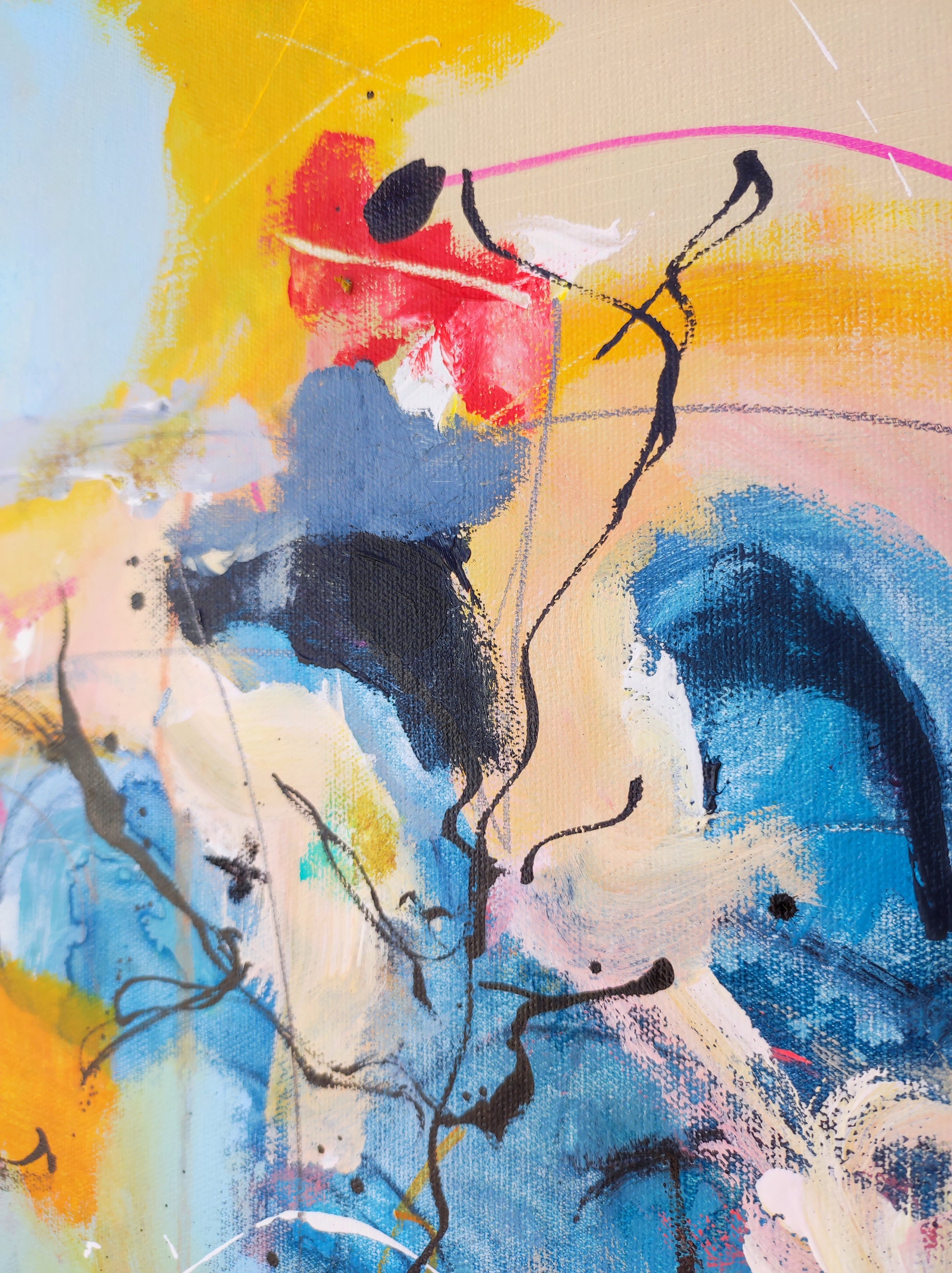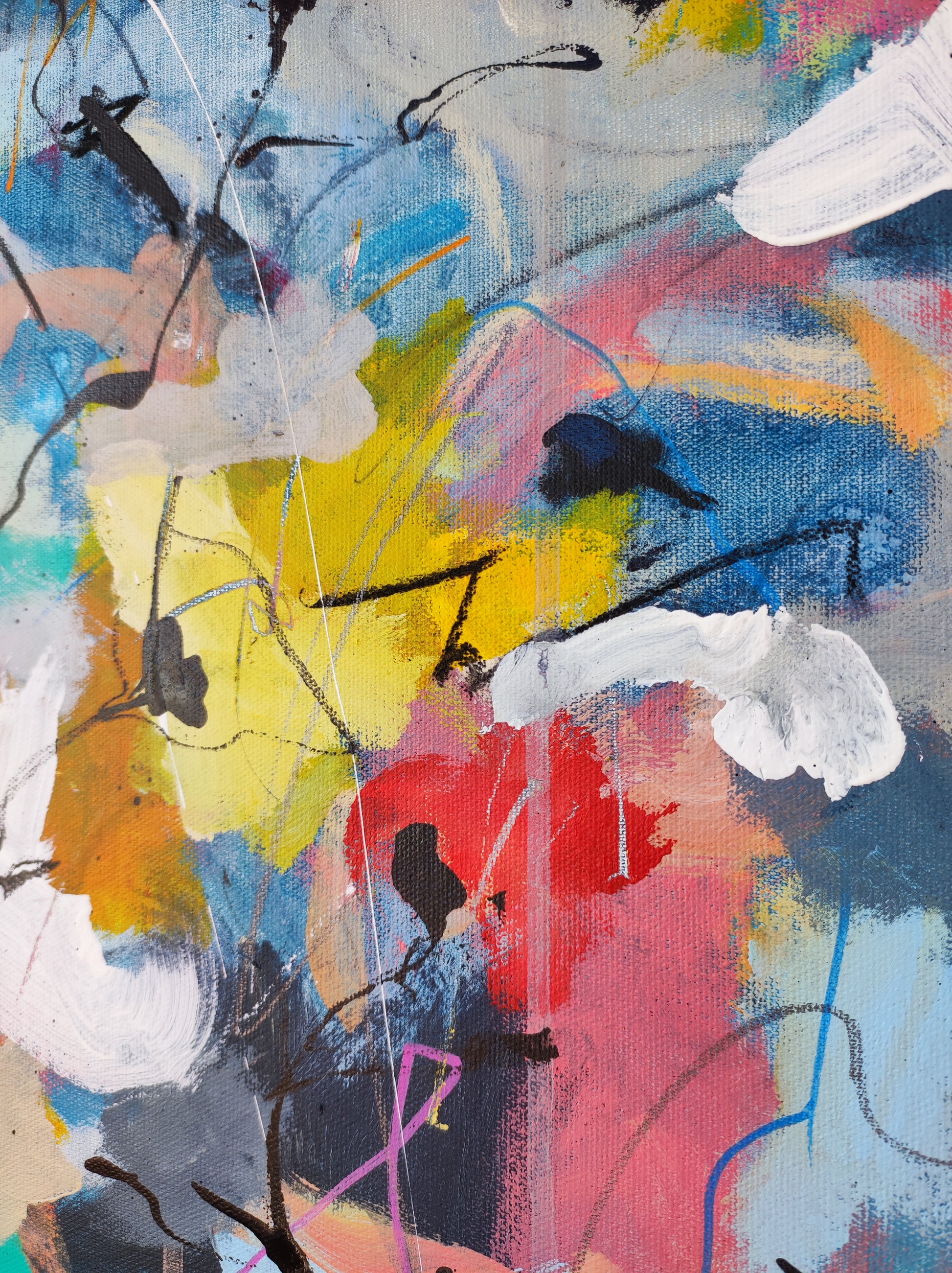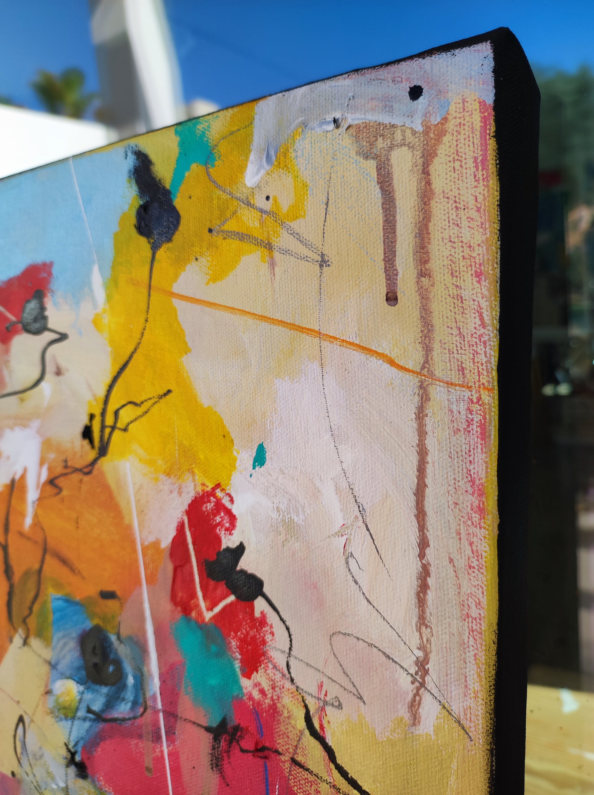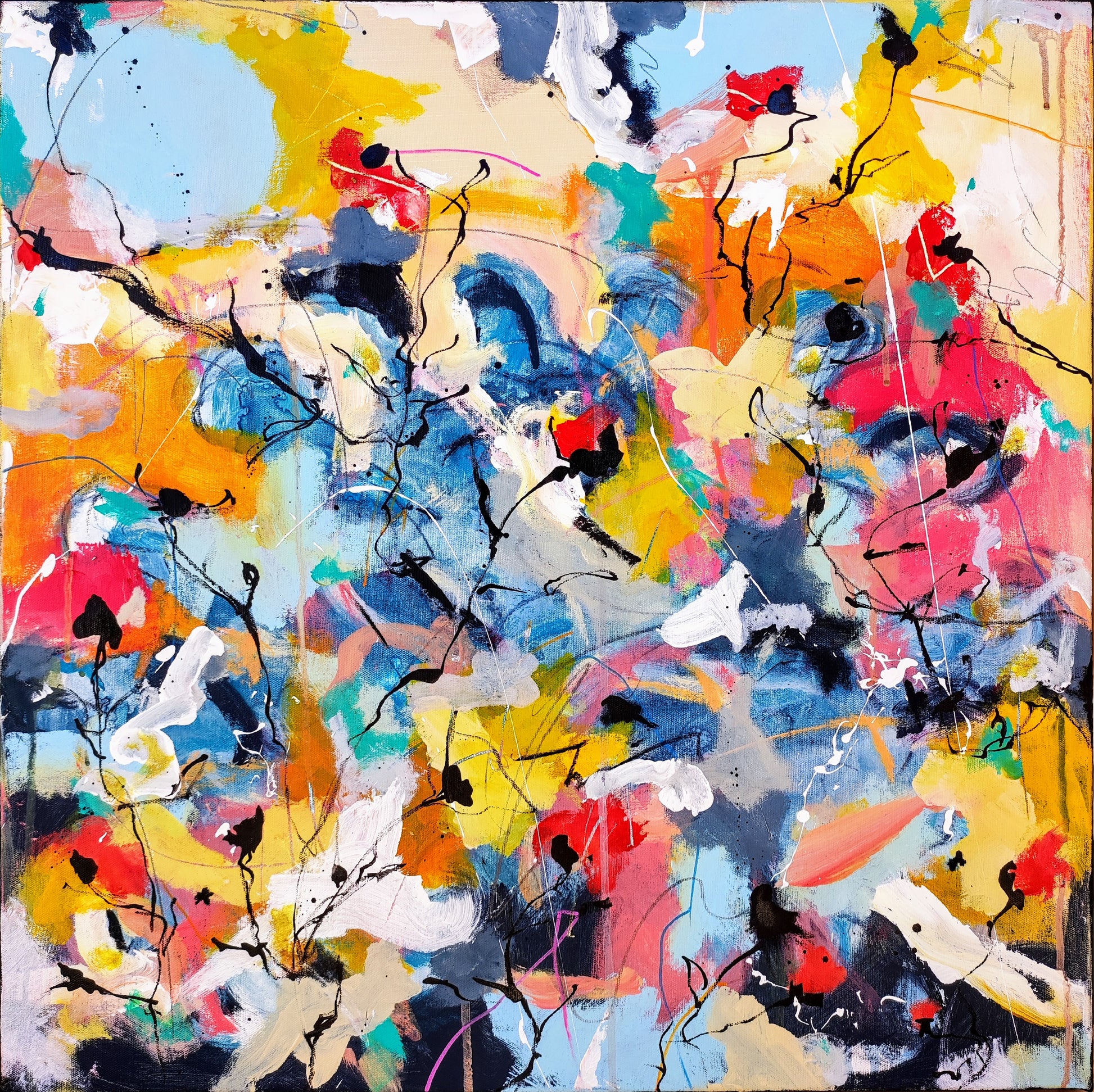 Obra que evoluciona a través de diferentes capas construyen una sinfonía de color y forma sobre la cual se desarrolla un trazo muy sugerido con tinta china que nos evoca unas flores, pero también otras formas como medusas, insectos, cereales...