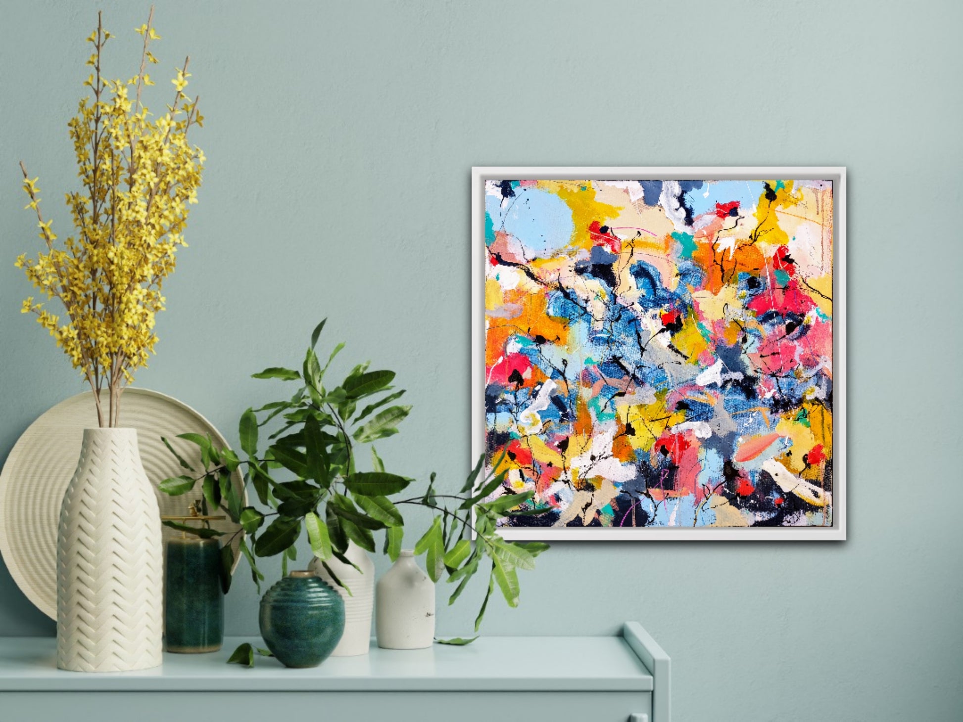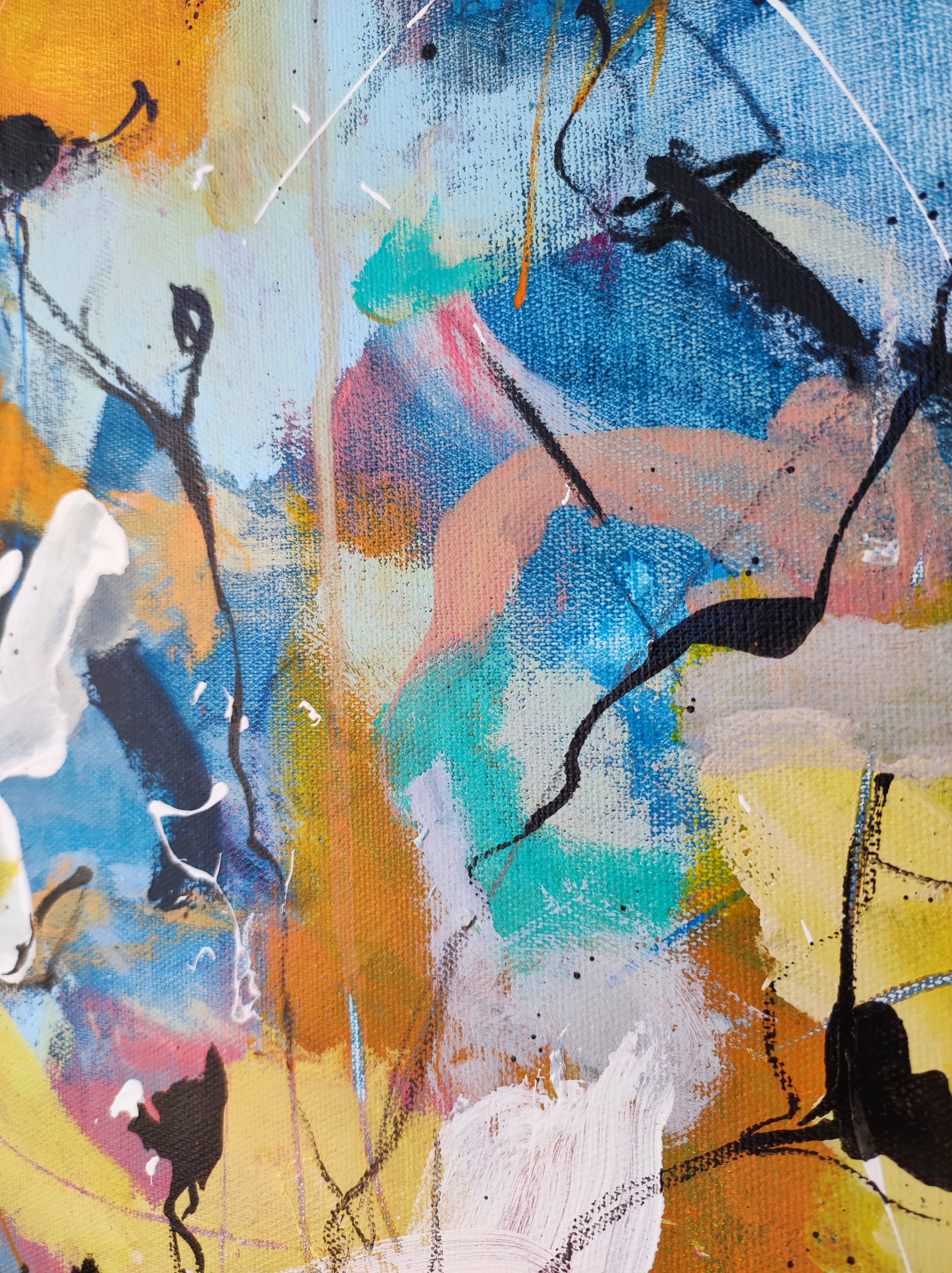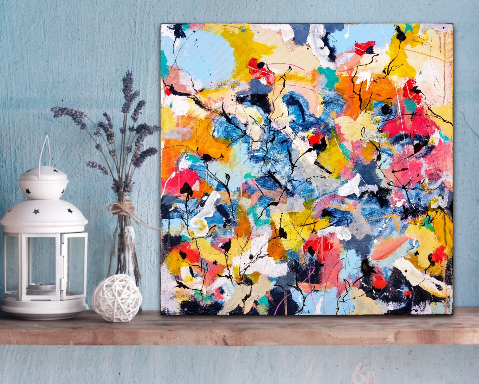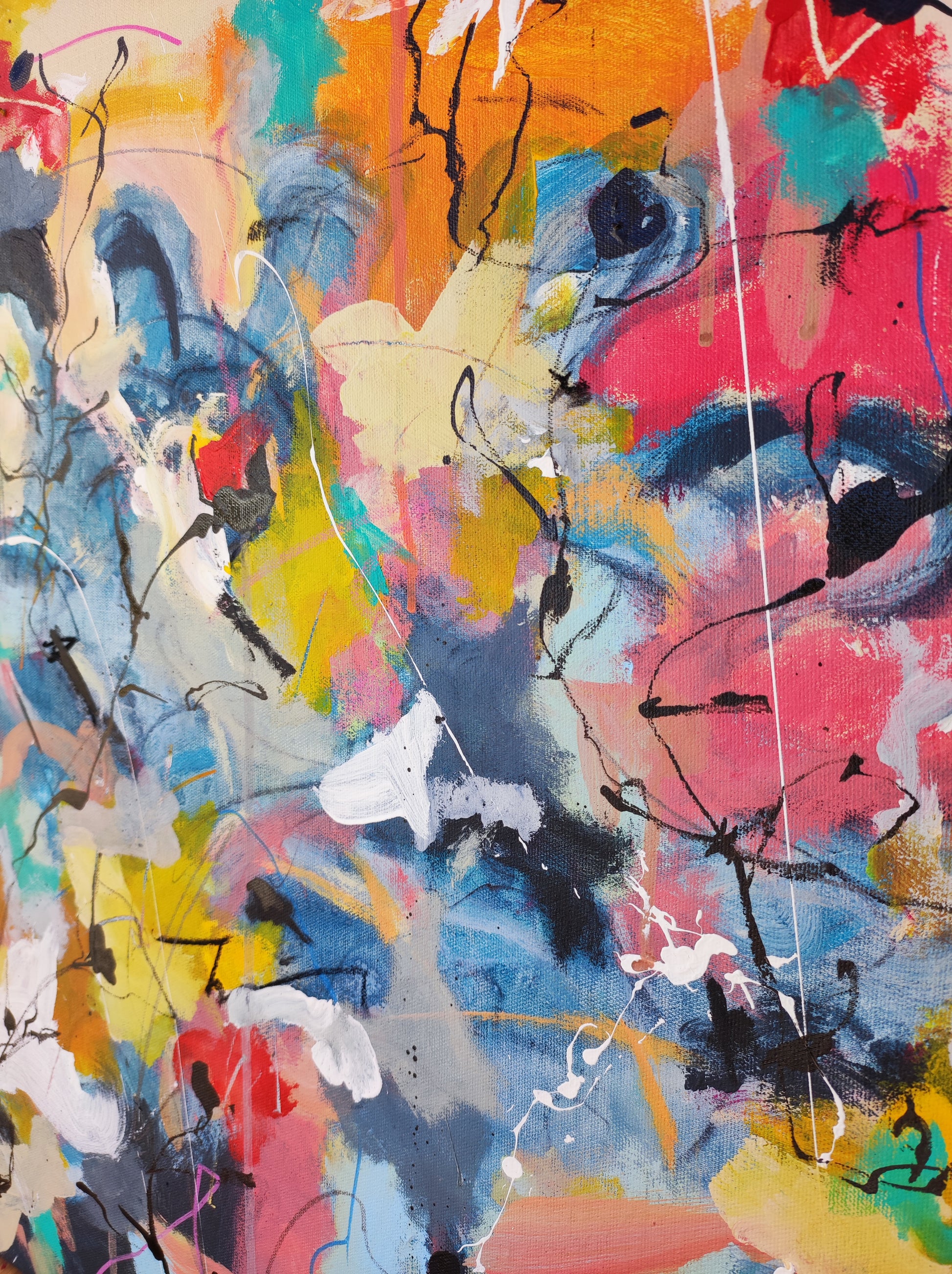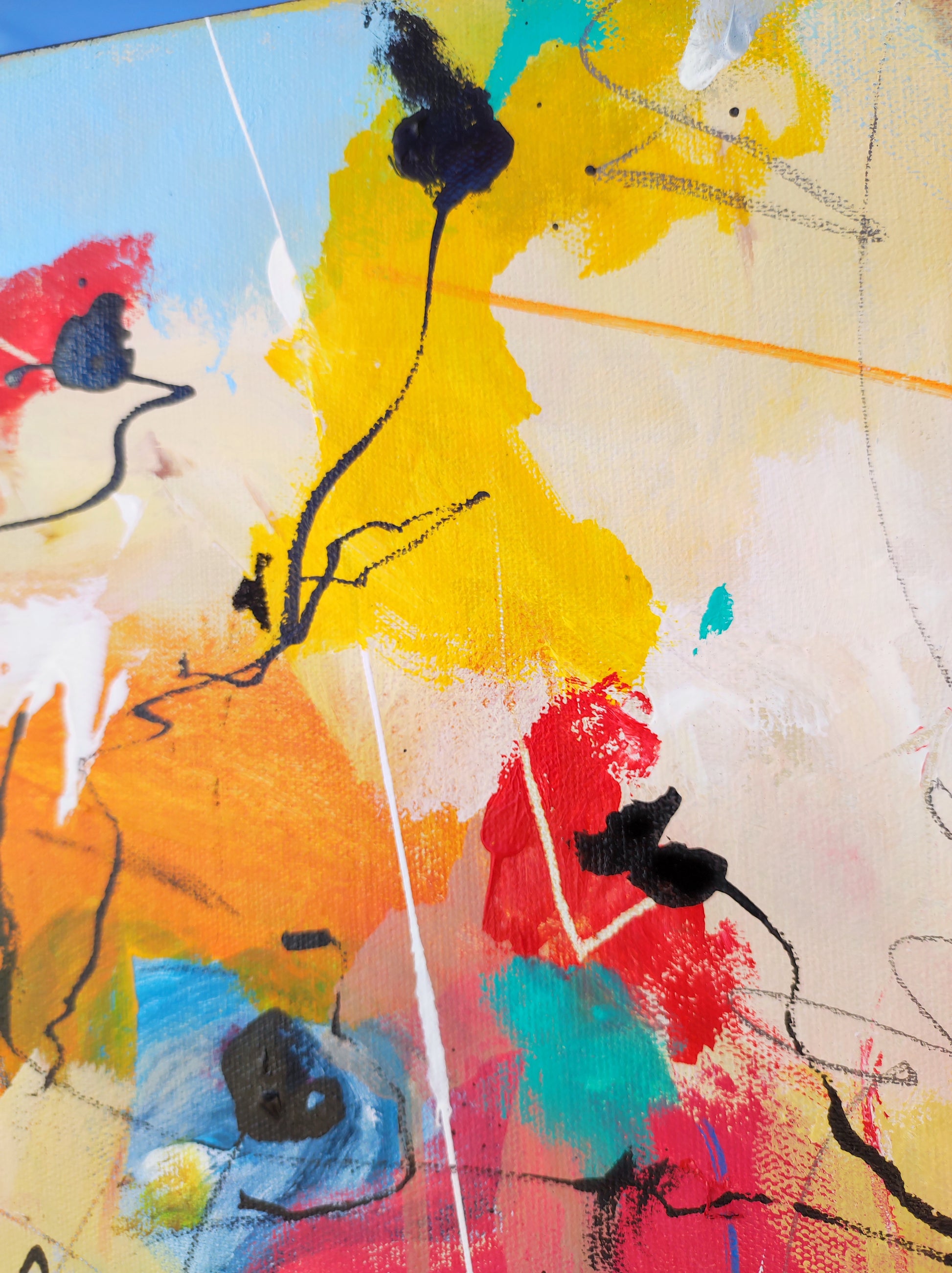 Obra que evoluciona a través de diferentes capas construyen una sinfonía de color y forma sobre la cual se desarrolla un trazo muy sugerido con tinta china que nos evoca unas flores, pero también otras formas como medusas, insectos, cereales...