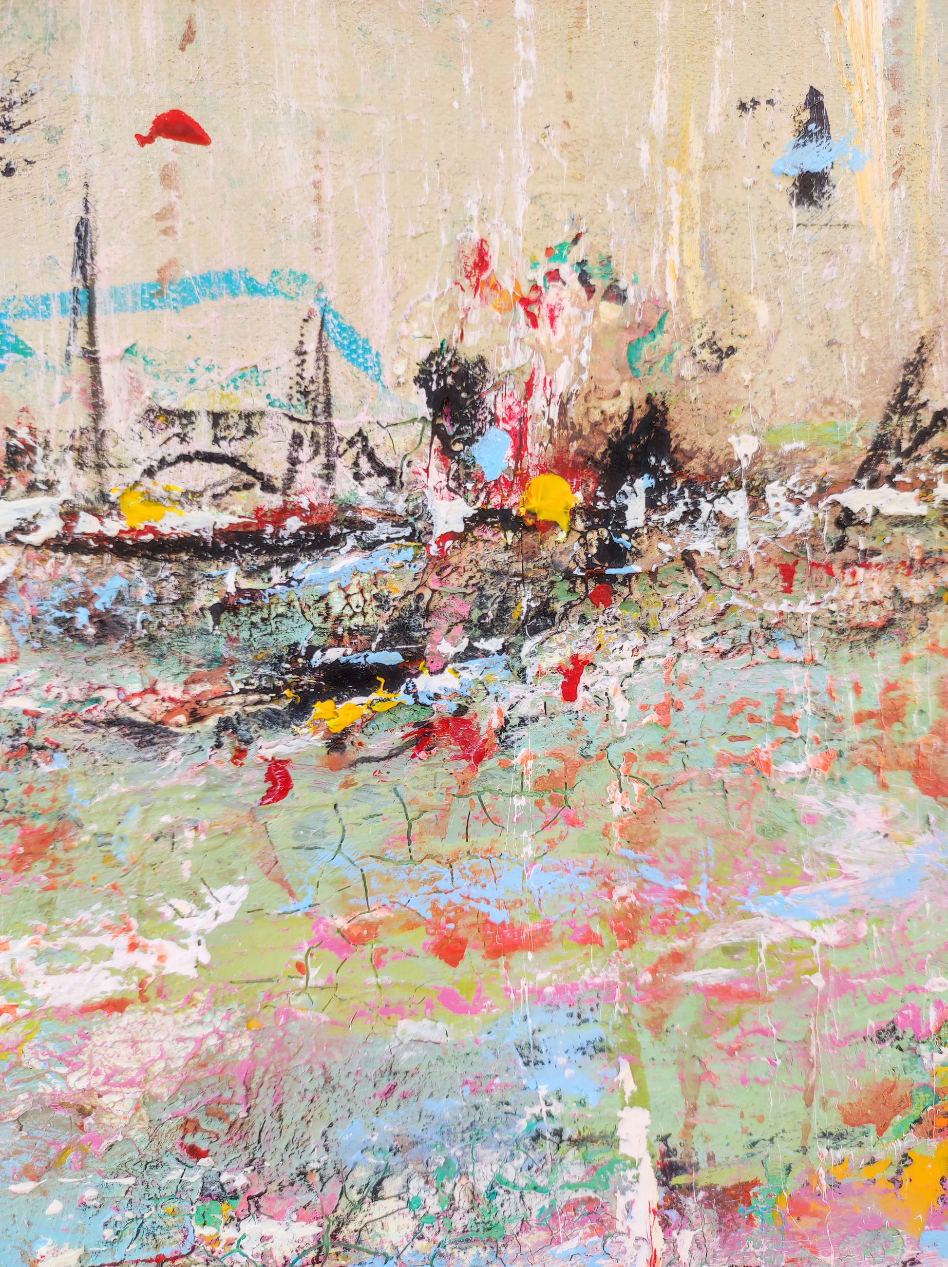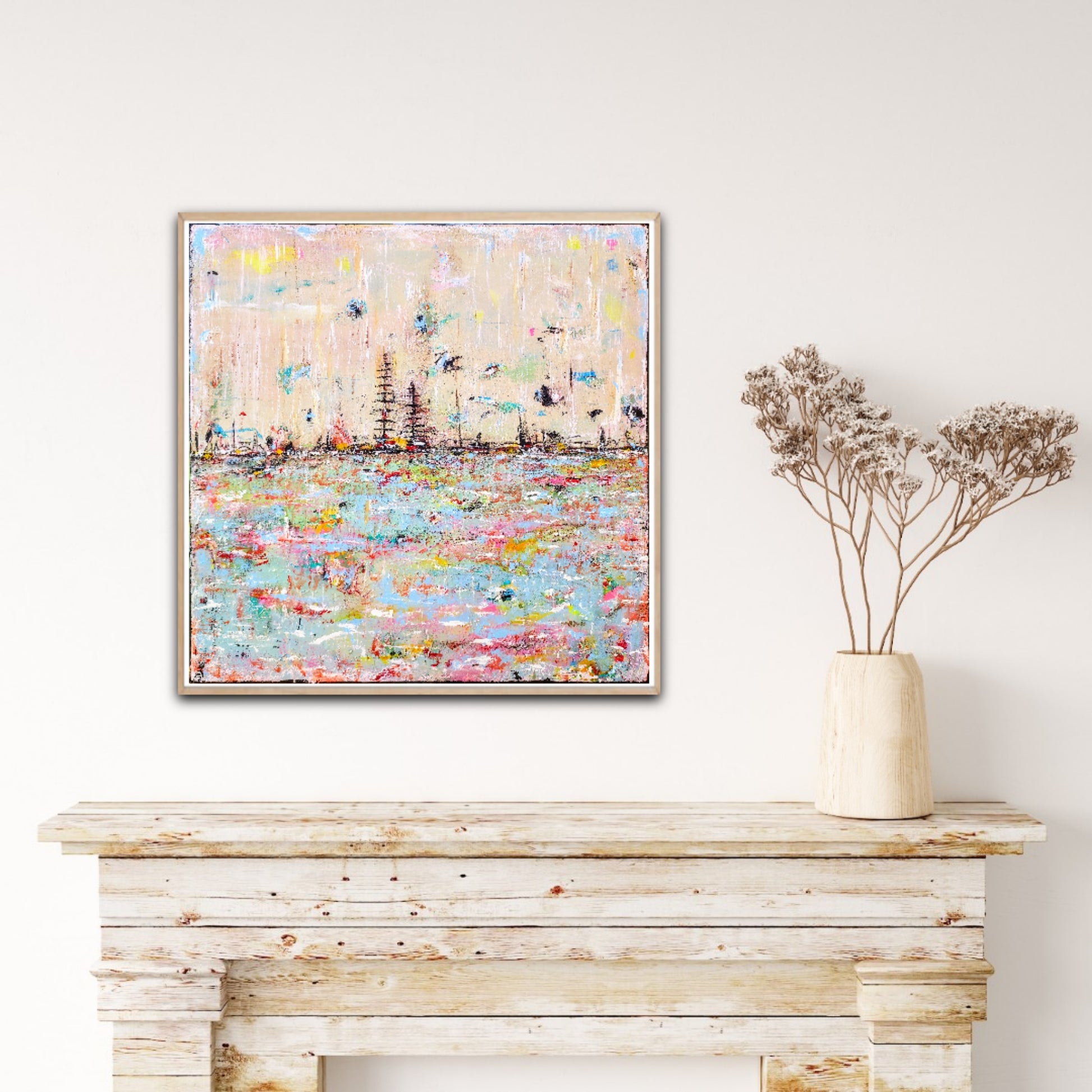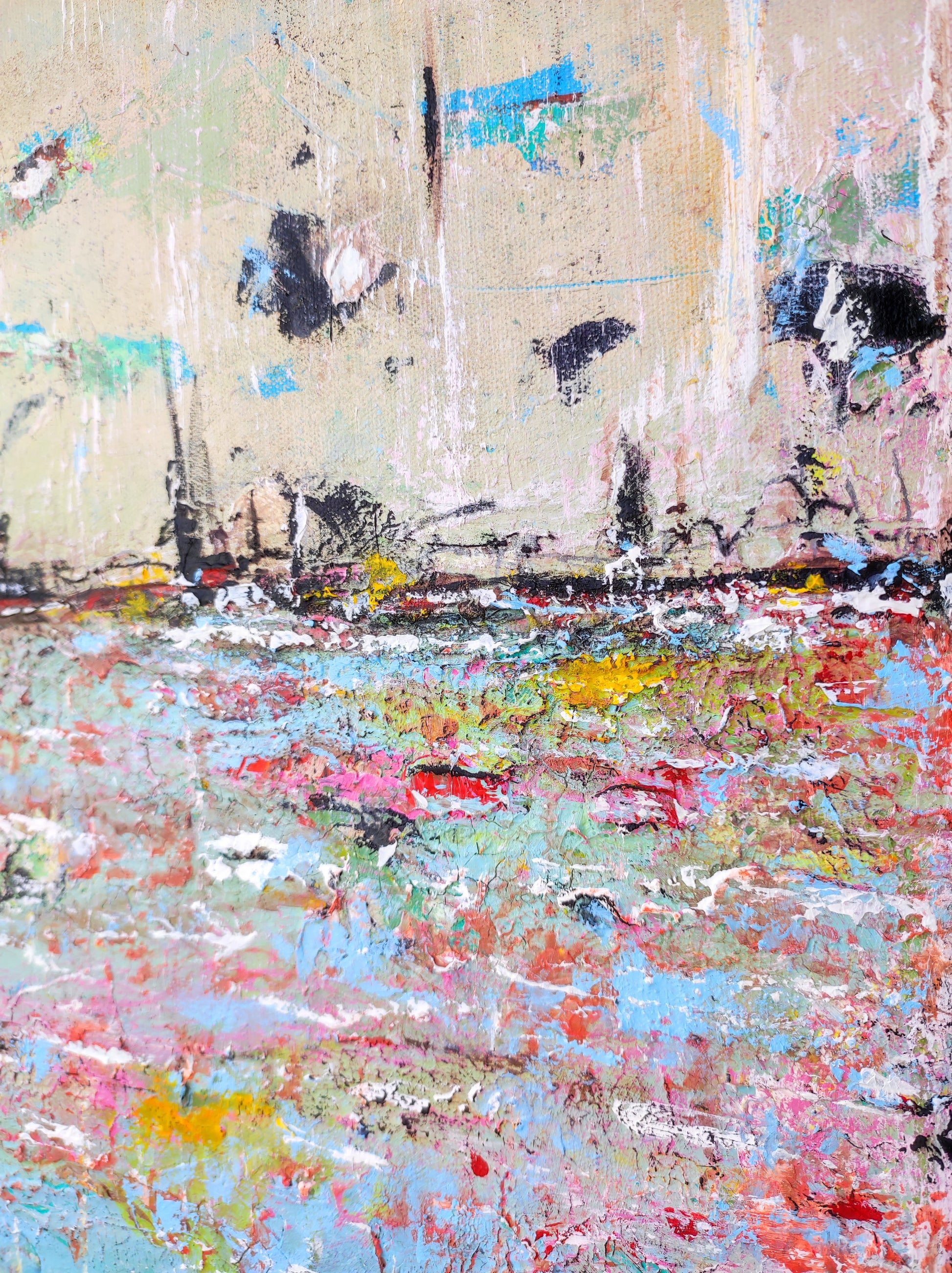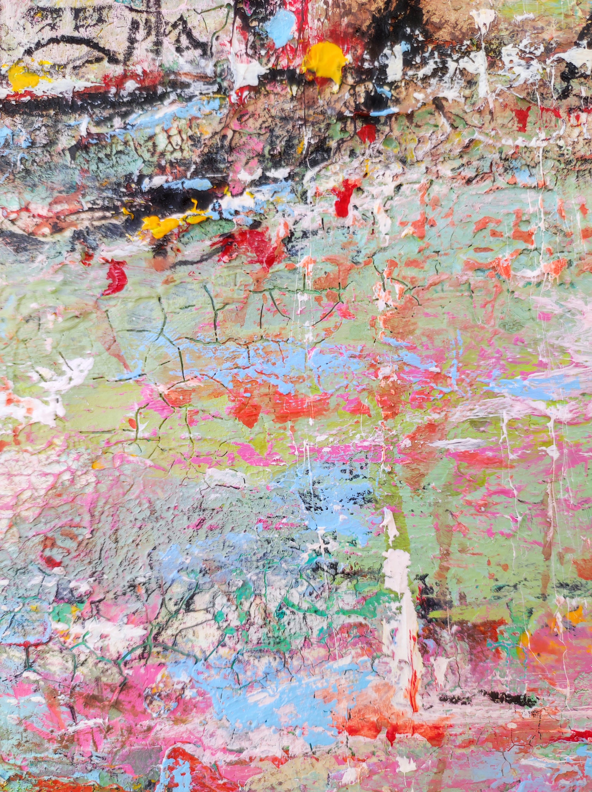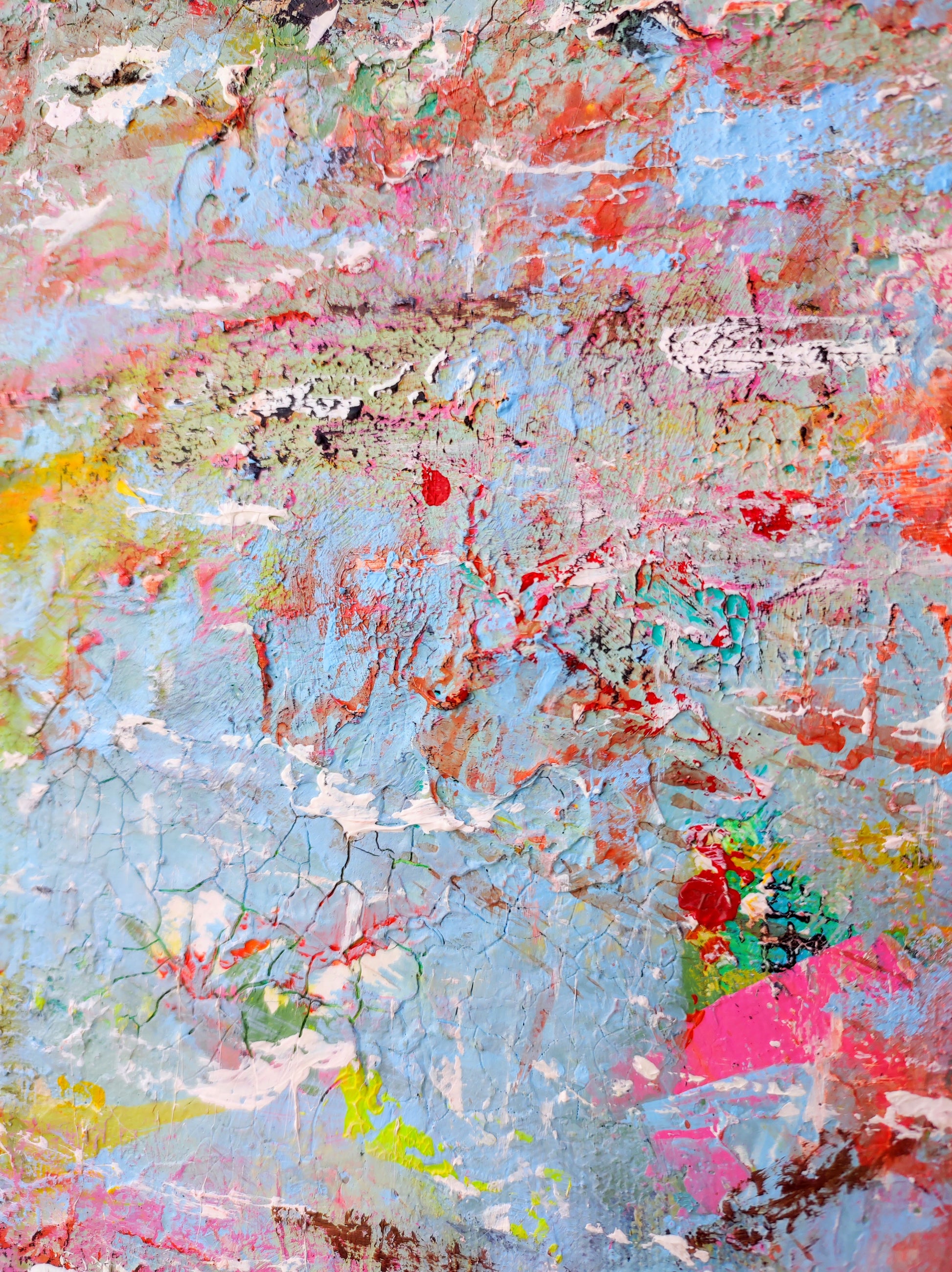 Obra que evoluciona a través de diferentes capas y acaba evocando (de forma no buscada) un paisaje donde los tonos rosáceos, turquesa y ocres por debajo de la línea del horizonte nos recuerdan a una marisma o una laguna salinera.
