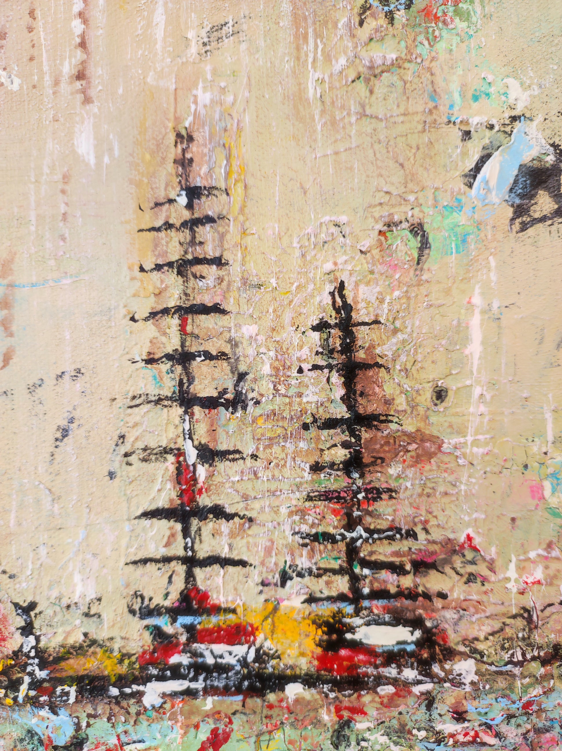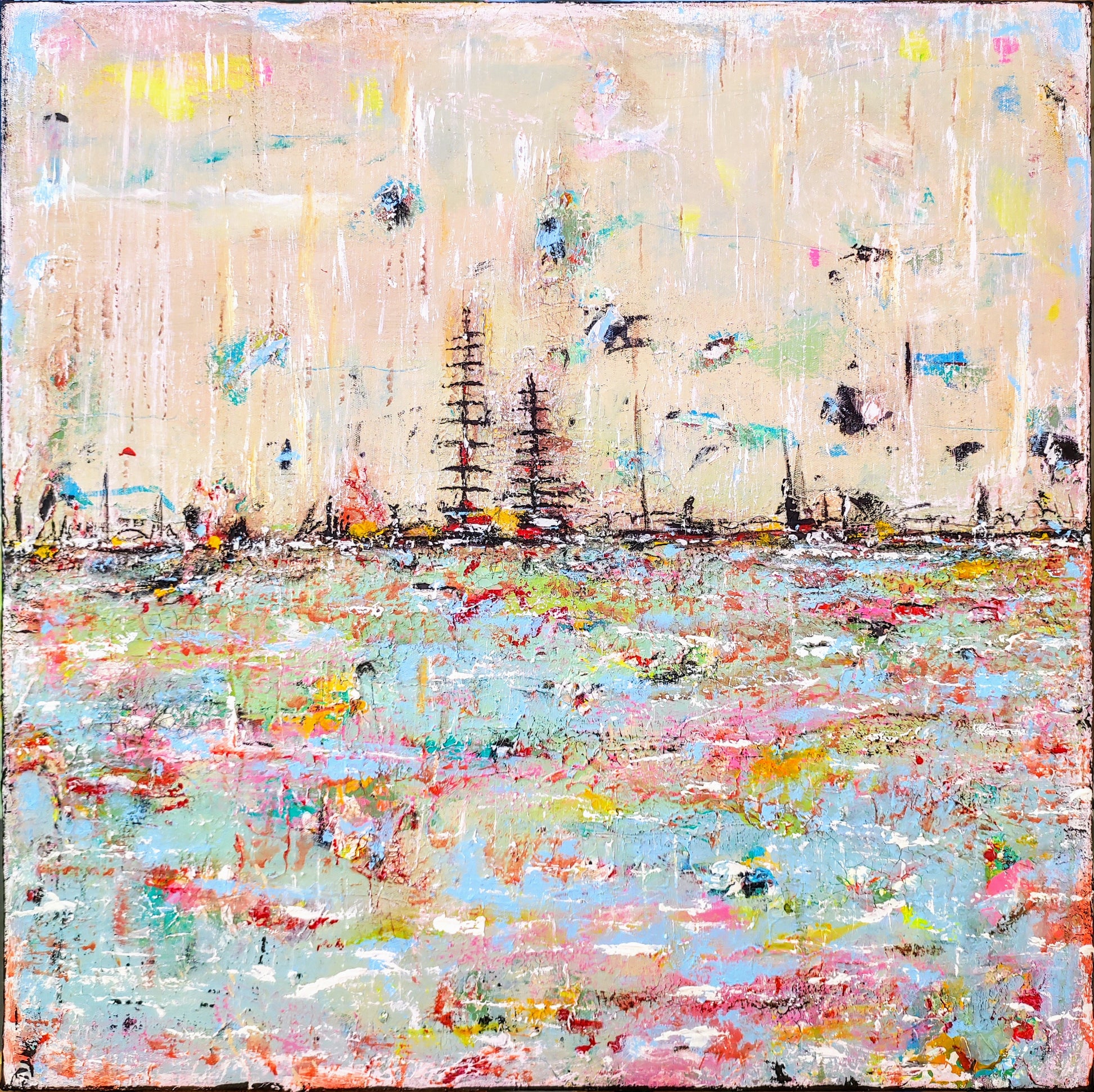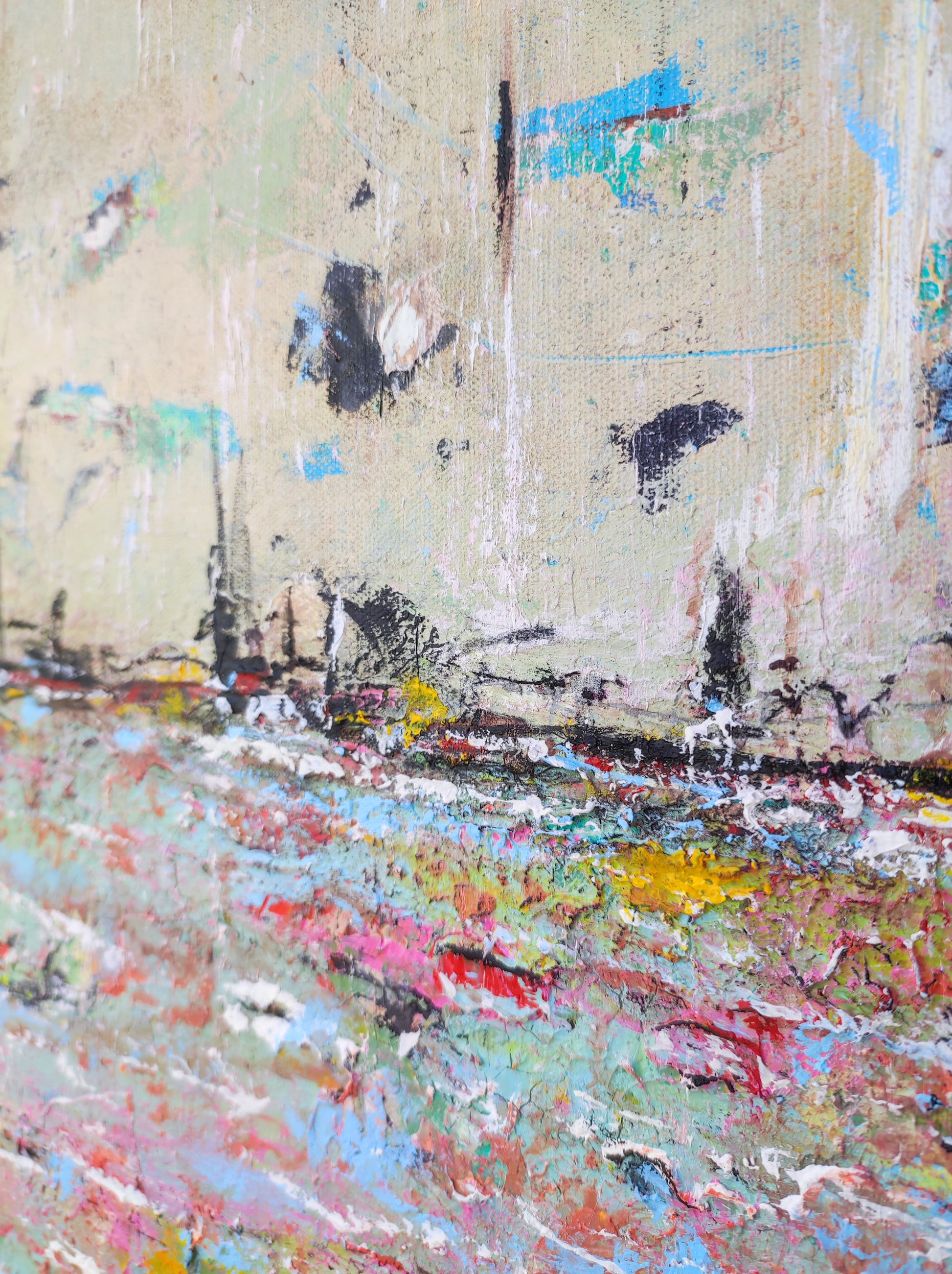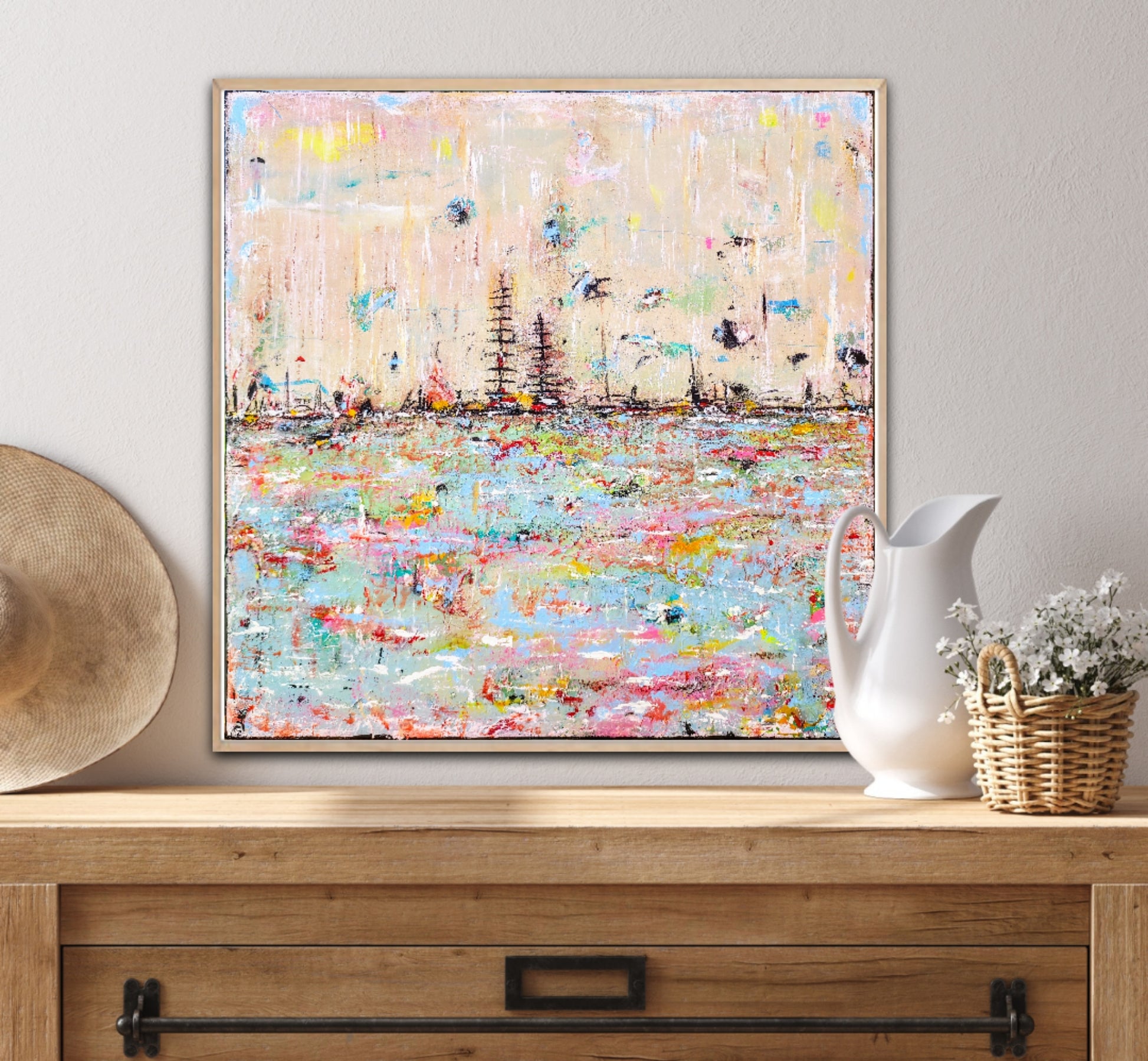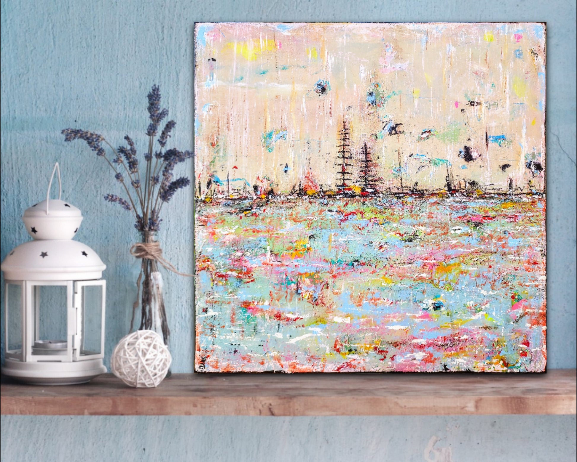 Obra que evoluciona a través de diferentes capas y acaba evocando (de forma no buscada) un paisaje donde los tonos rosáceos, turquesa y ocres por debajo de la línea del horizonte nos recuerdan a una marisma o una laguna salinera.