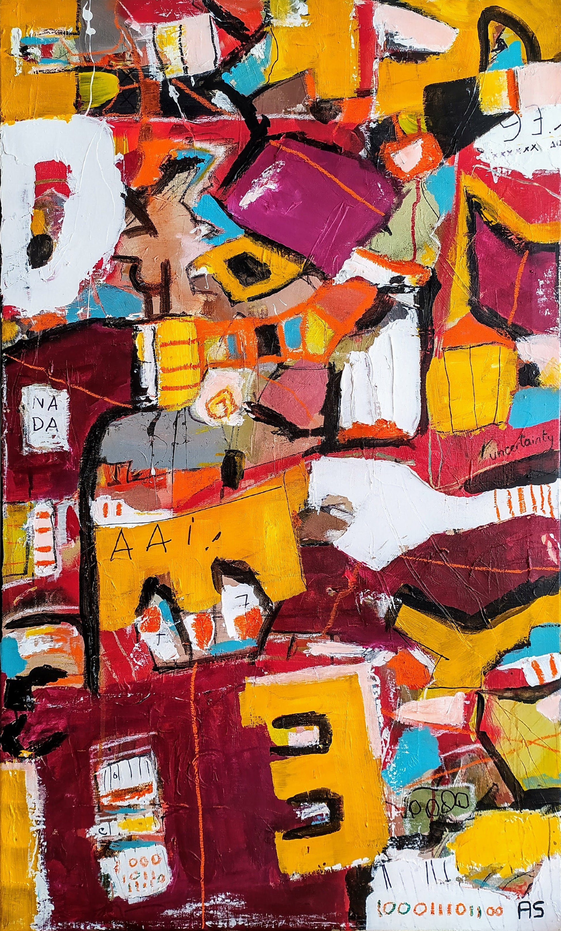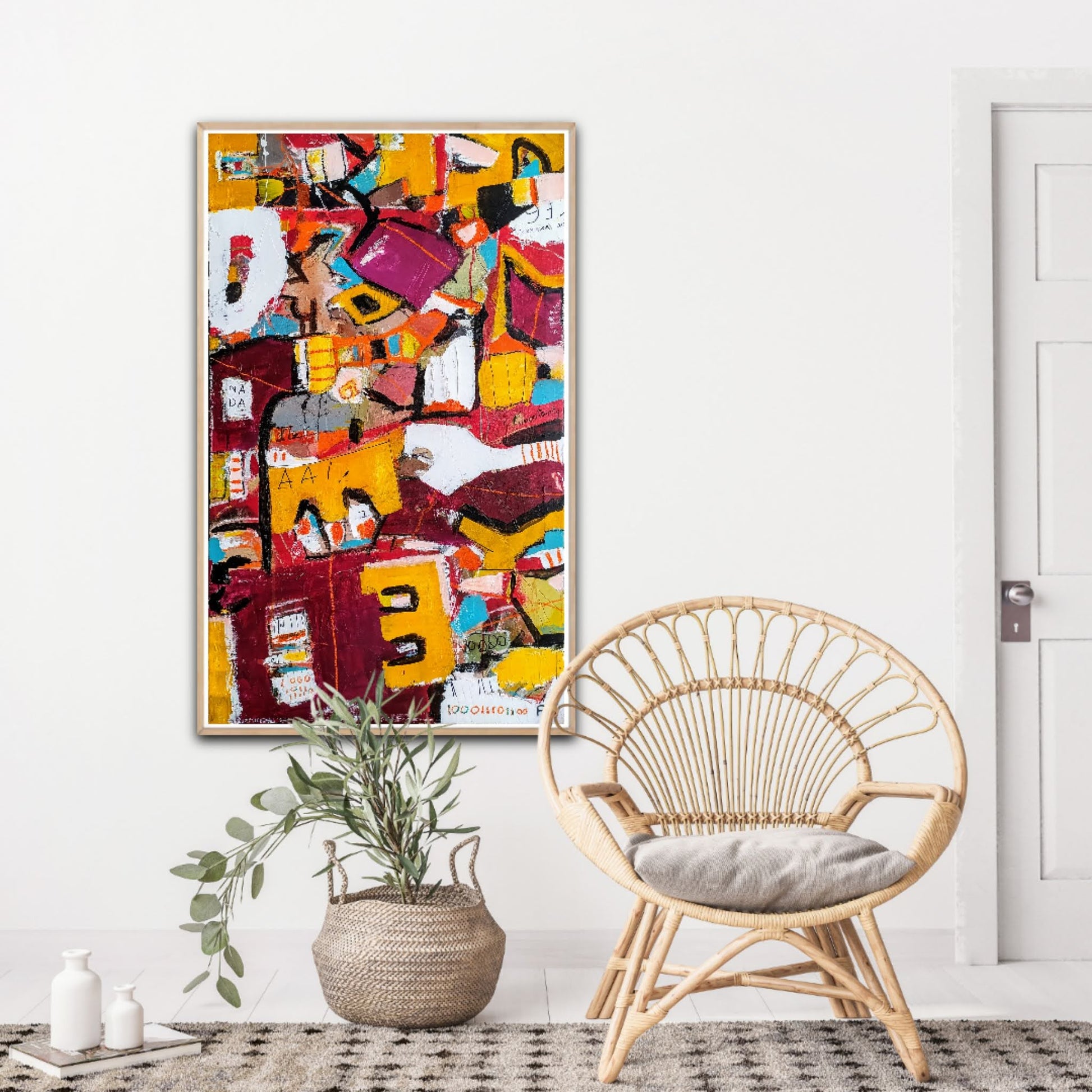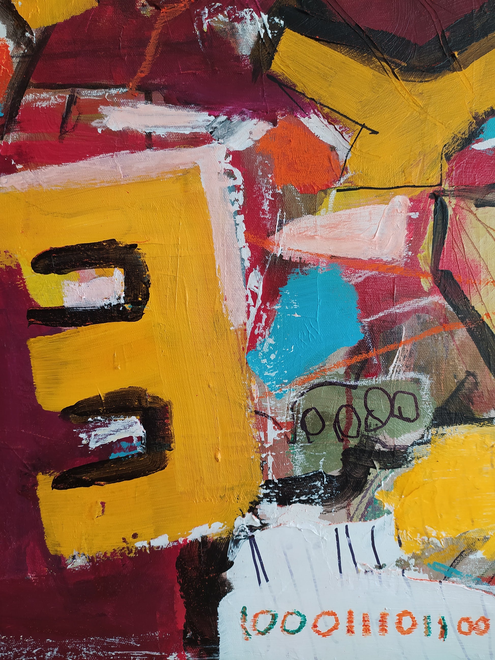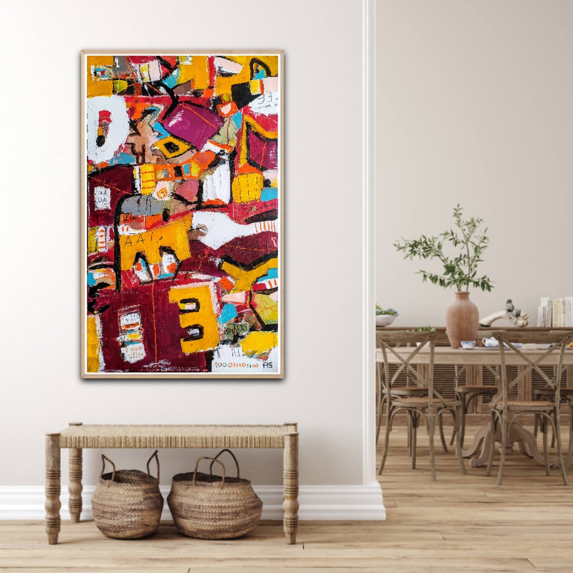 Obra con cierta inspiración cubista, múltiples capas se solapan, dominando finalmente rojos, ocres y manchas en blanco con heavy gesso. La obra ofrece un juego de texturas, color, marcas, letras y símbolos.