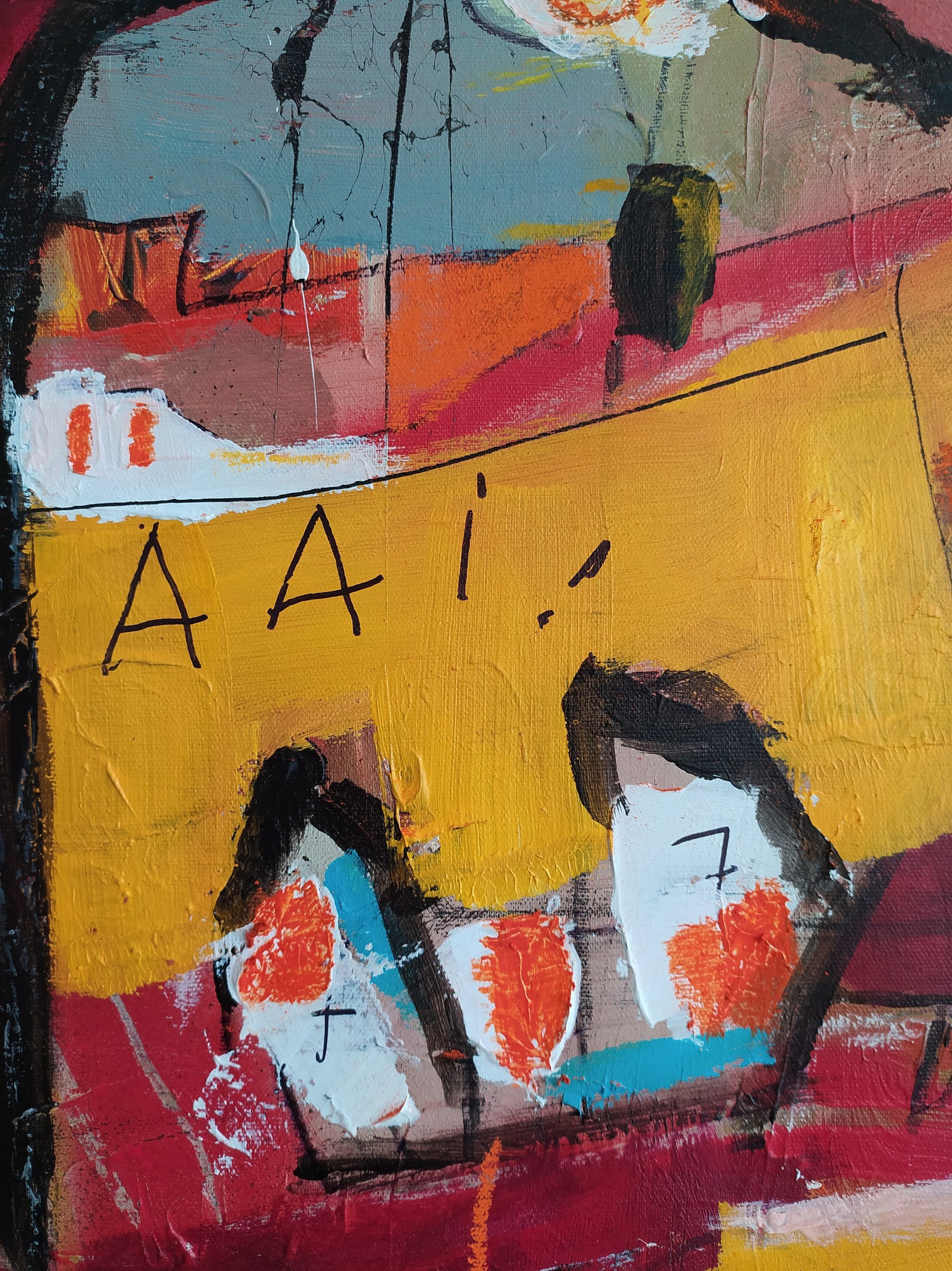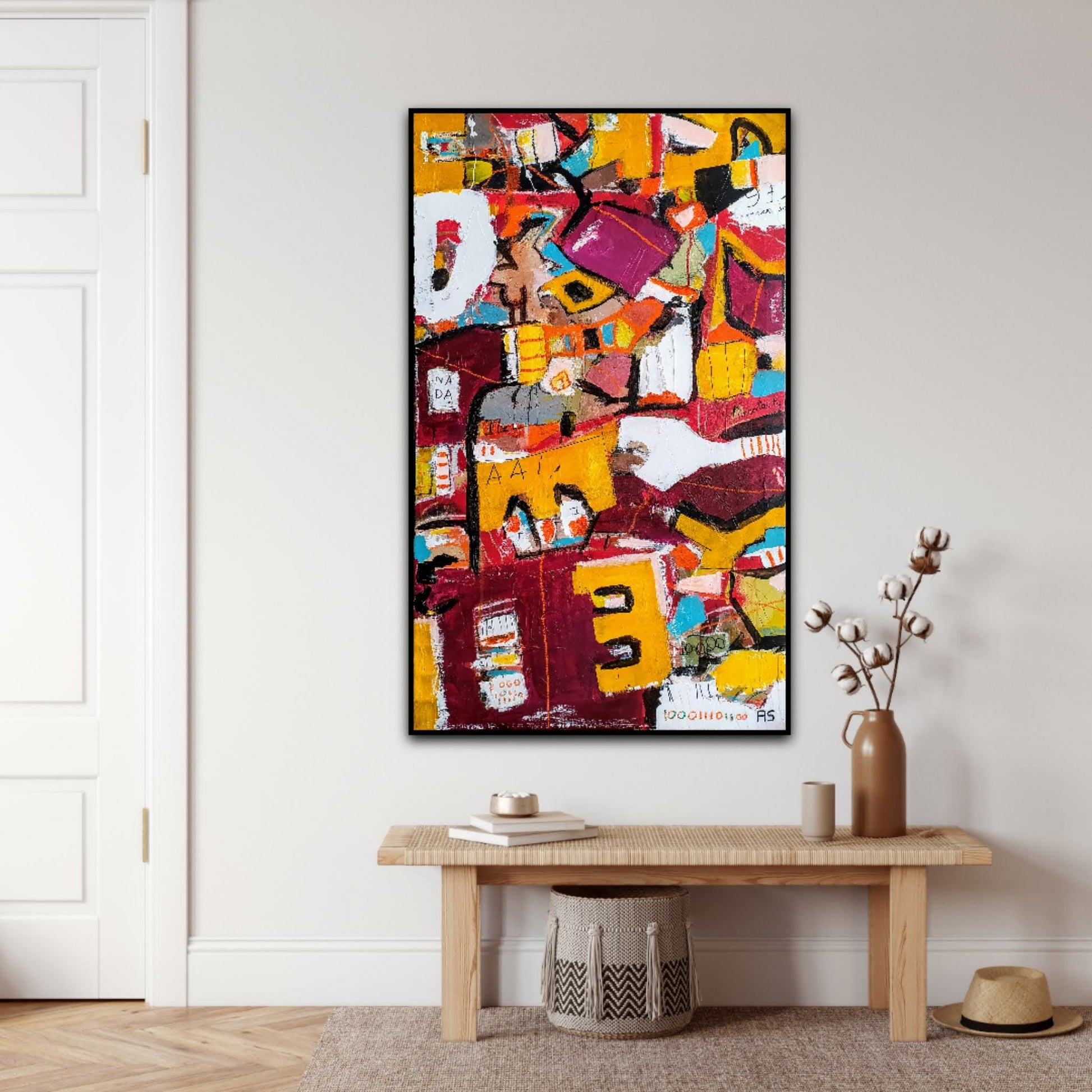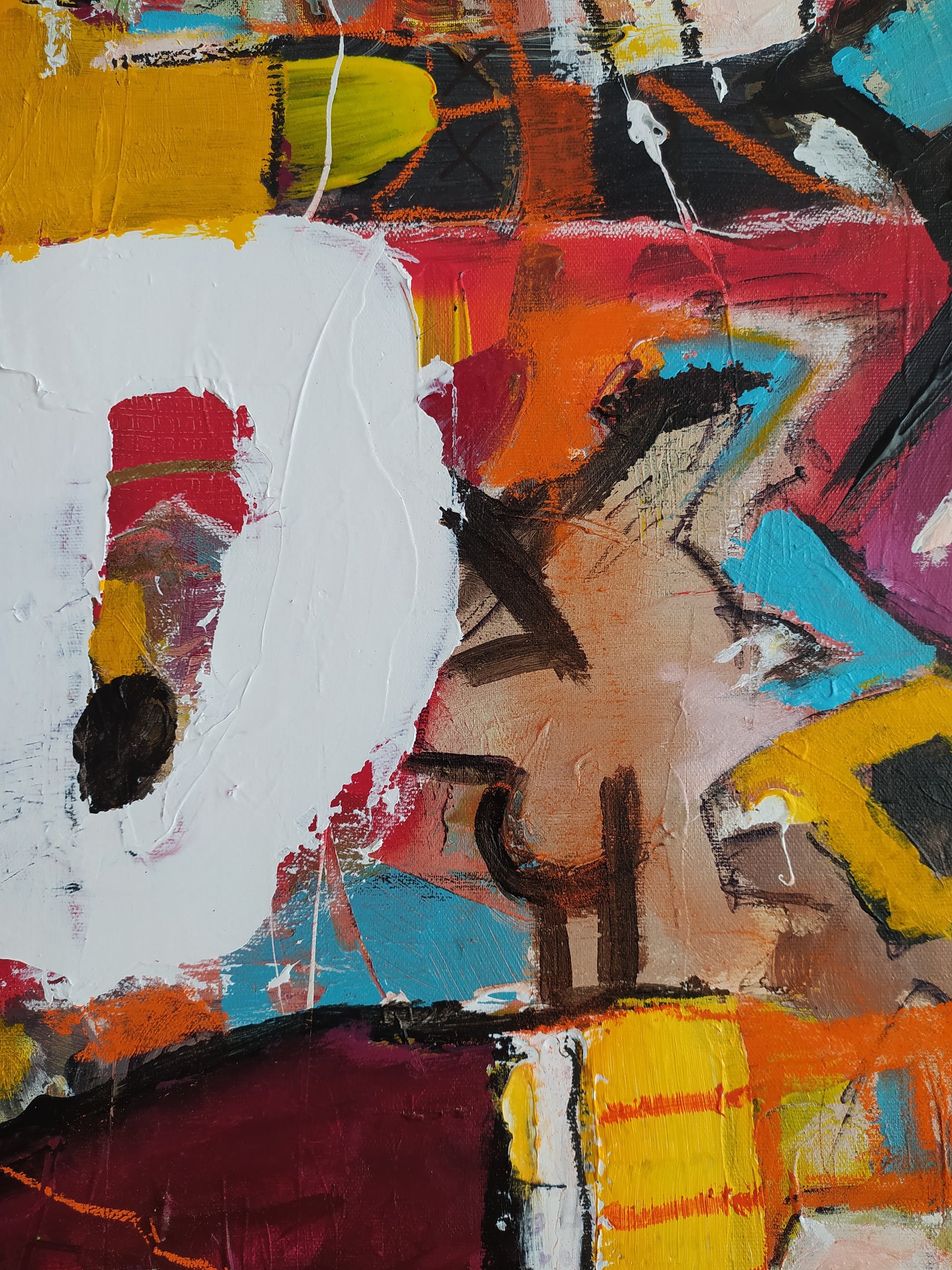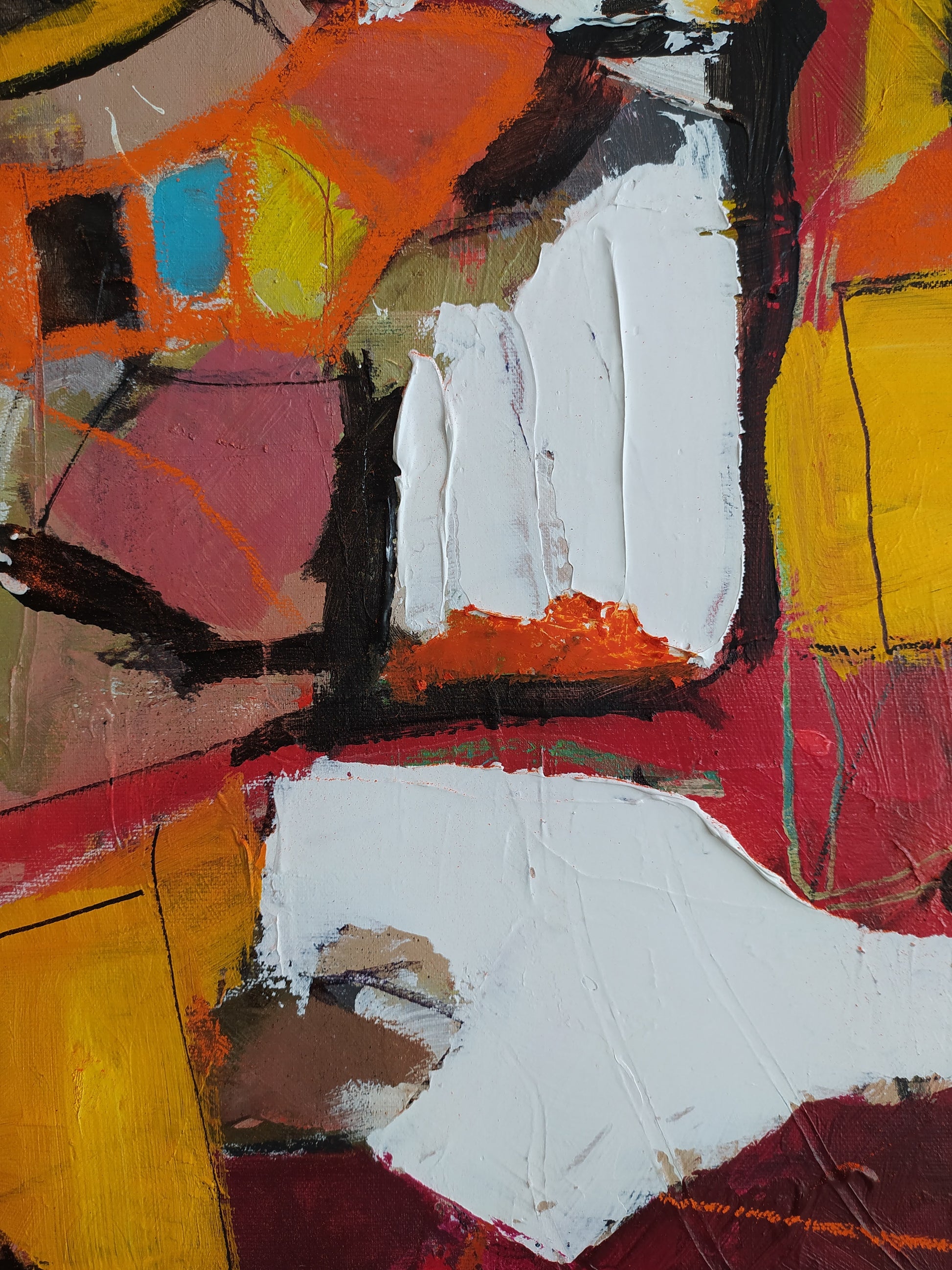 Obra con cierta inspiración cubista, múltiples capas se solapan, dominando finalmente rojos, ocres y manchas en blanco con heavy gesso. La obra ofrece un juego de texturas, color, marcas, letras y símbolos.