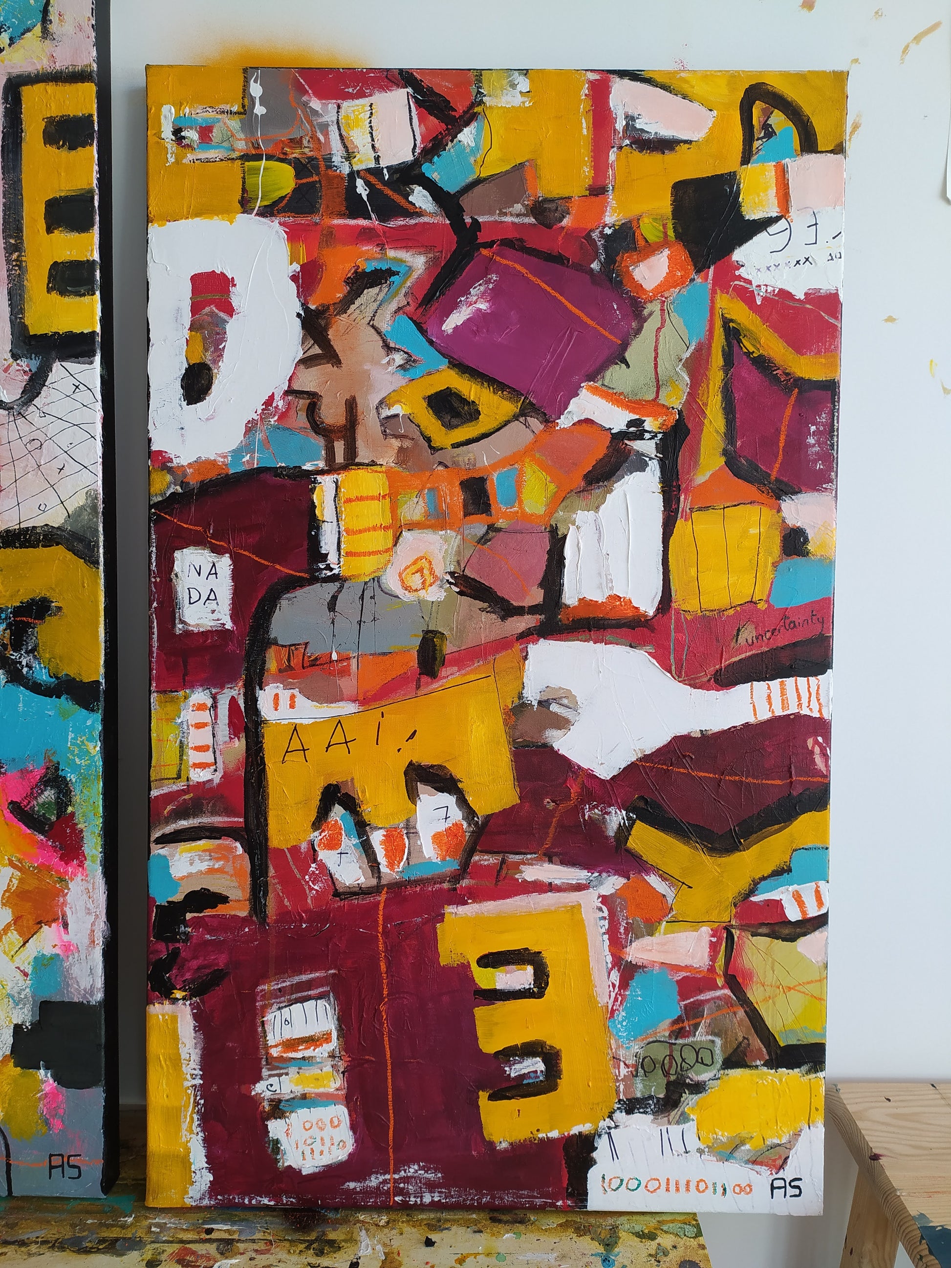 Técnica: mixed media: acrílico, pintura en spray, gesso, carboncillo, ceras.