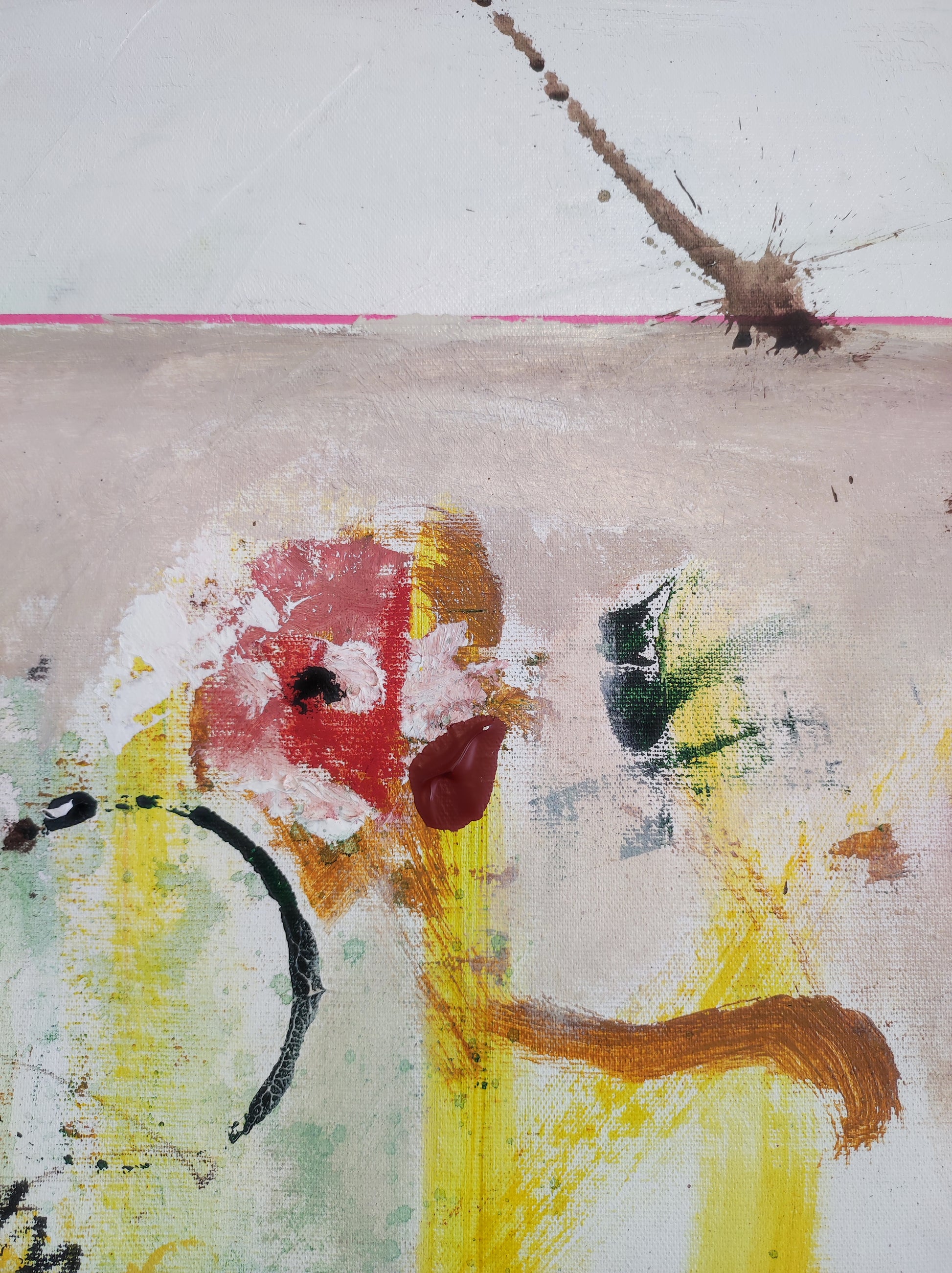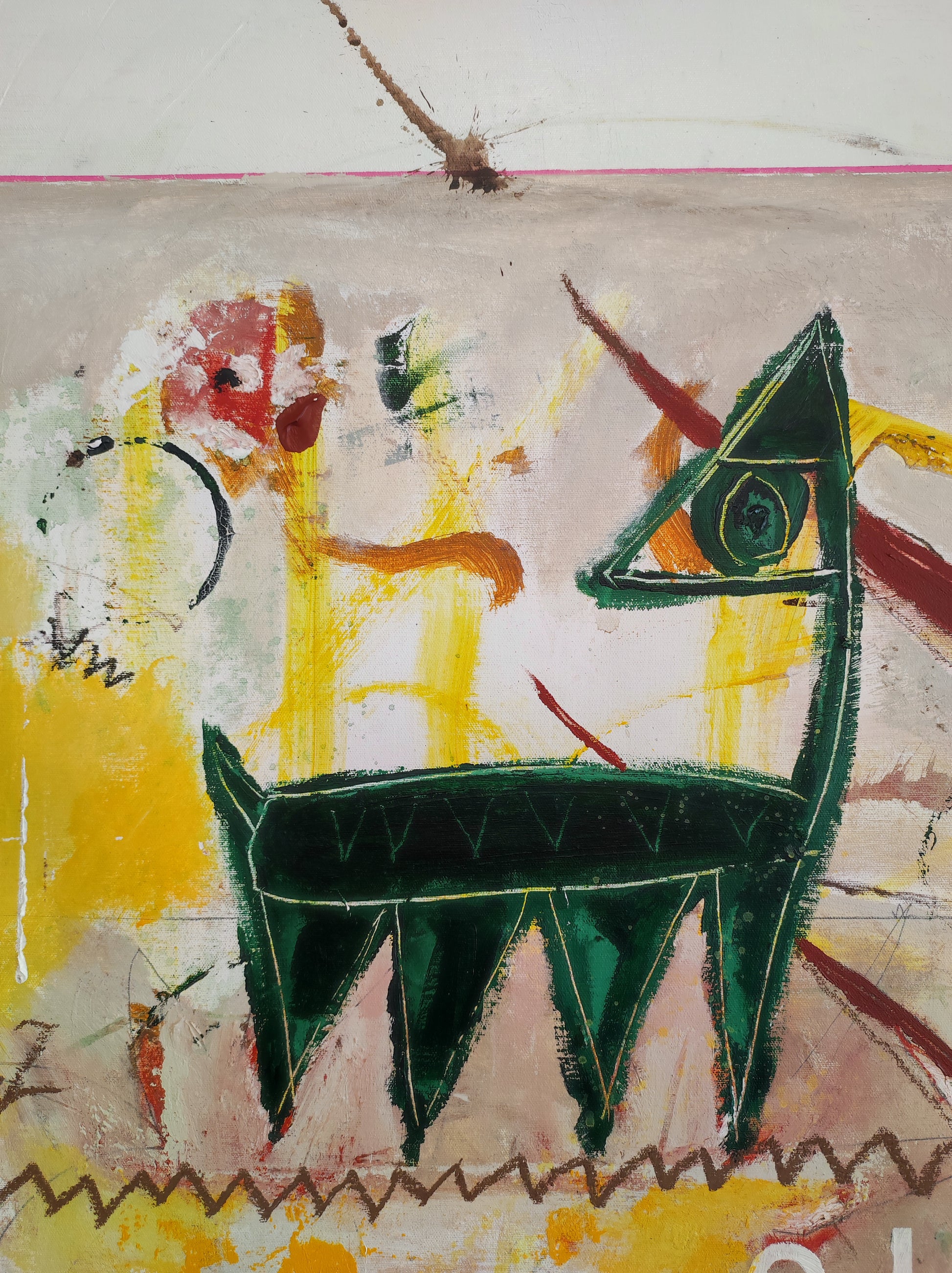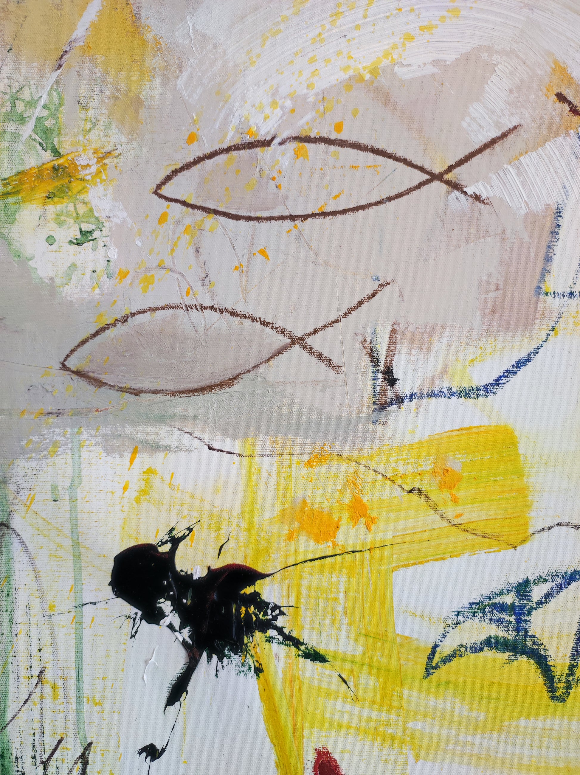 Pintura gestual, intuitiva, que deja que las cosas pasen y se apoya sobre lo que aparece. Aprovechando el accidente y aceptando las consecuencias.