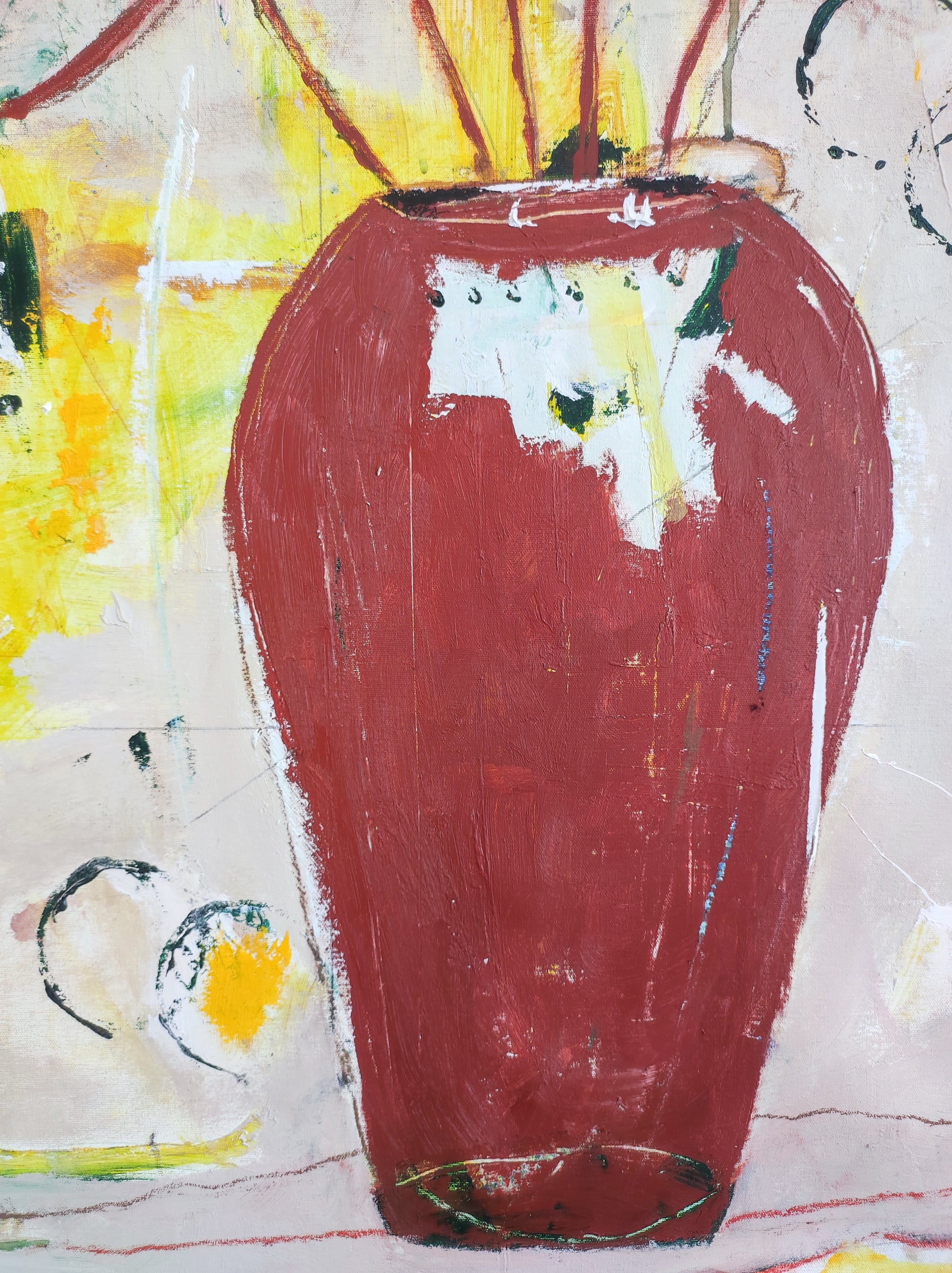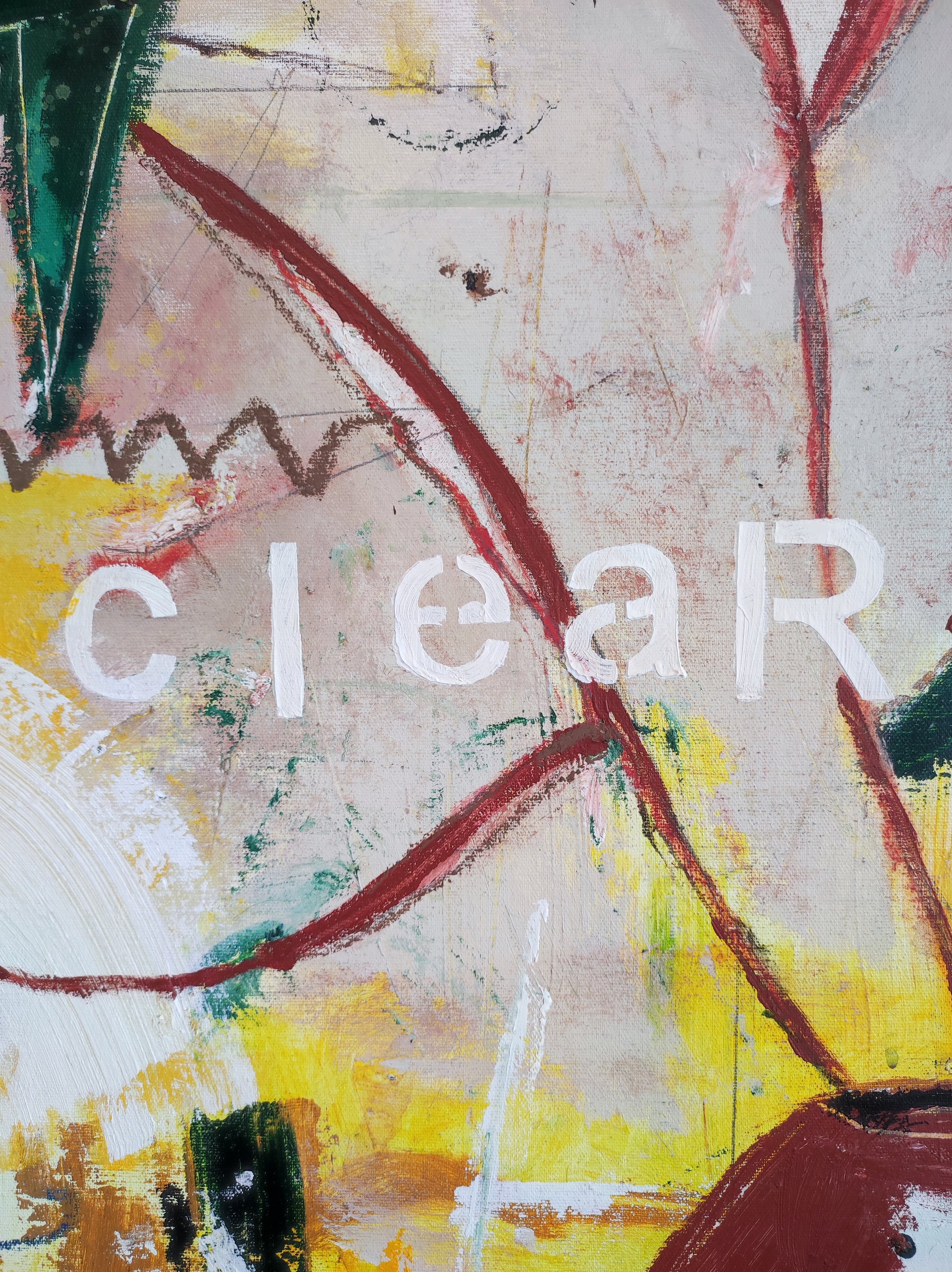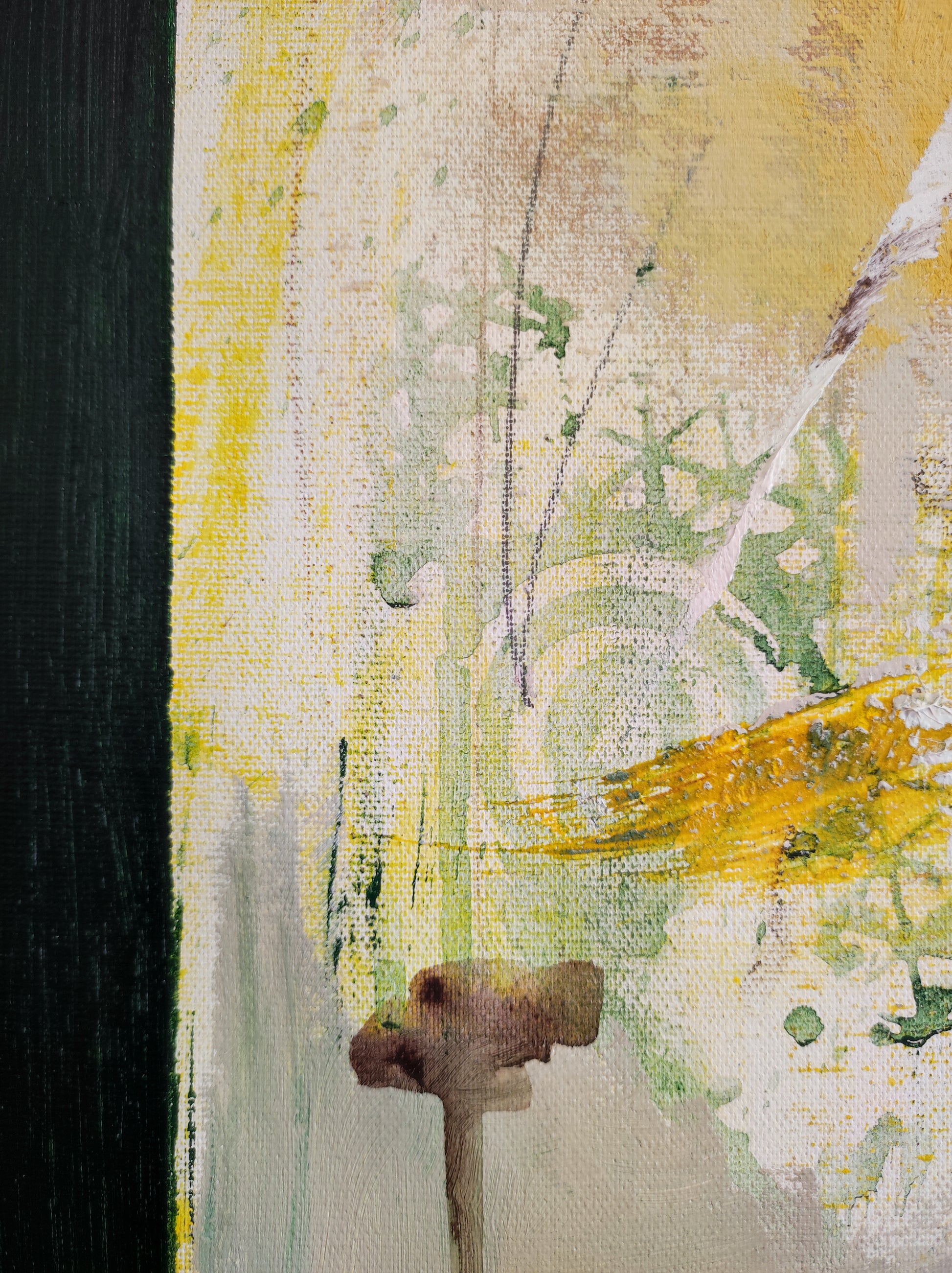 Pintura gestual, intuitiva, que deja que las cosas pasen y se apoya sobre lo que aparece. Aprovechando el accidente y aceptando las consecuencias.