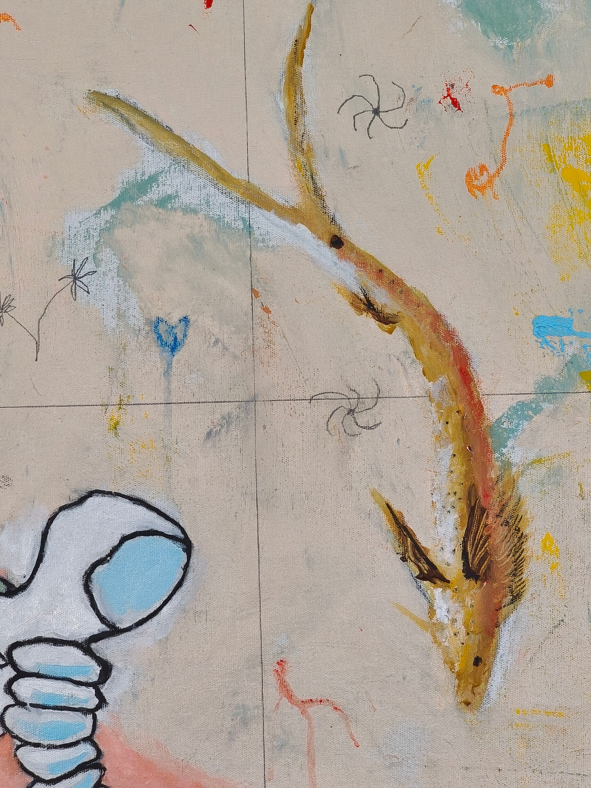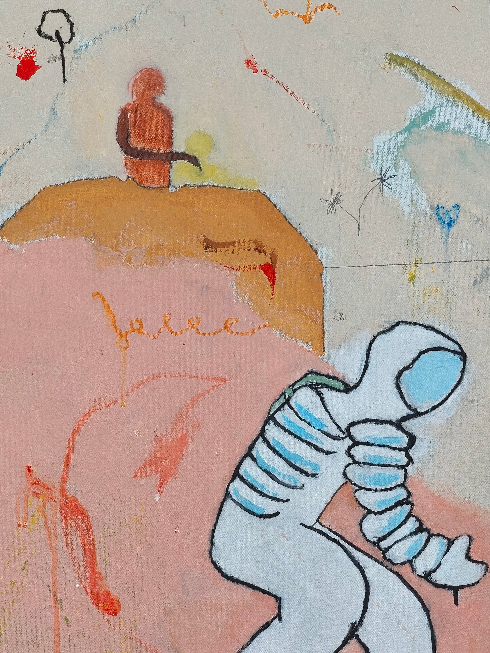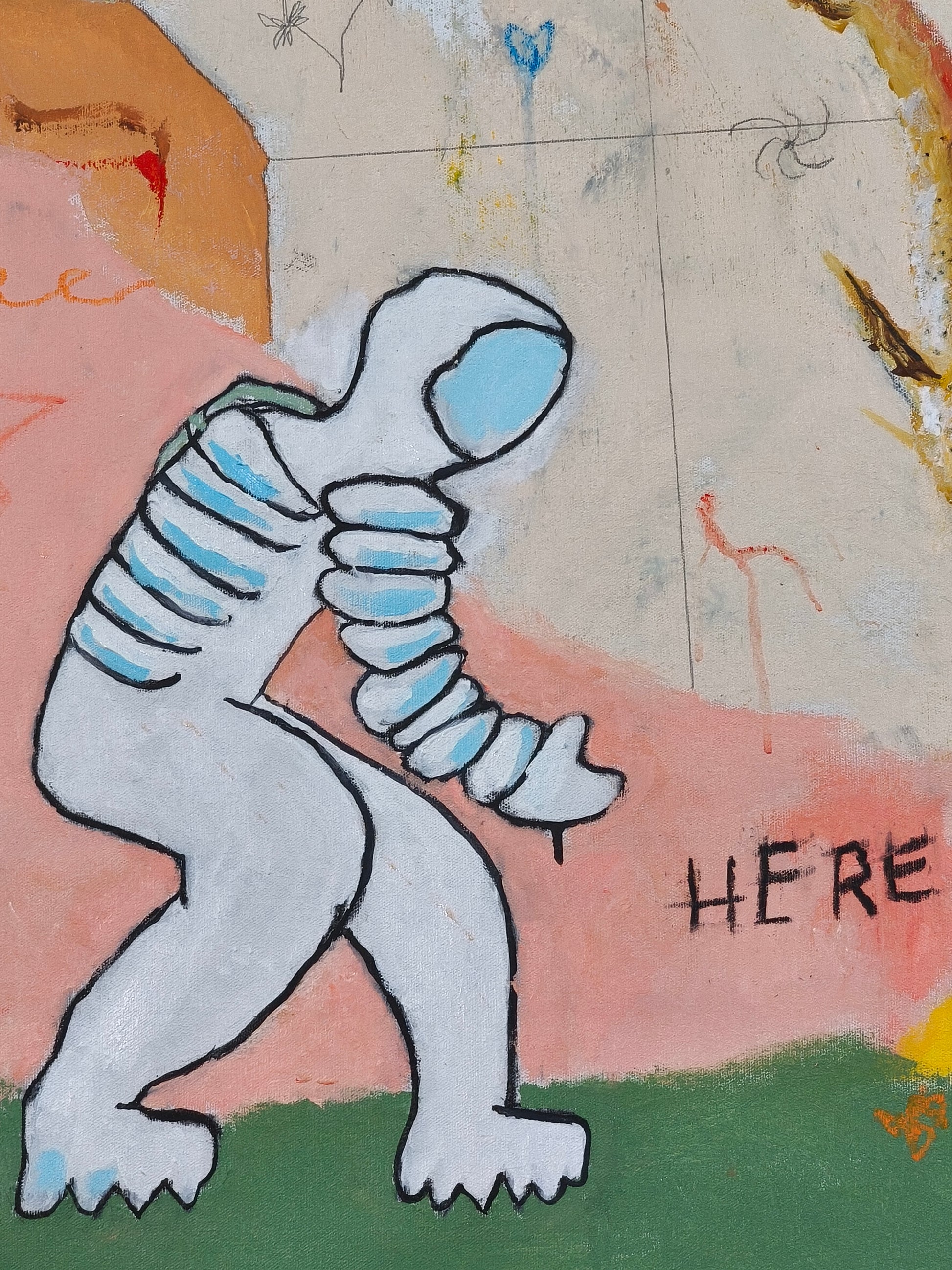 Pintura gestual, intuitiva, que deja que las cosas pasen y se apoya sobre lo que aparece. Aprovechando el accidente y aceptando las consecuencias.