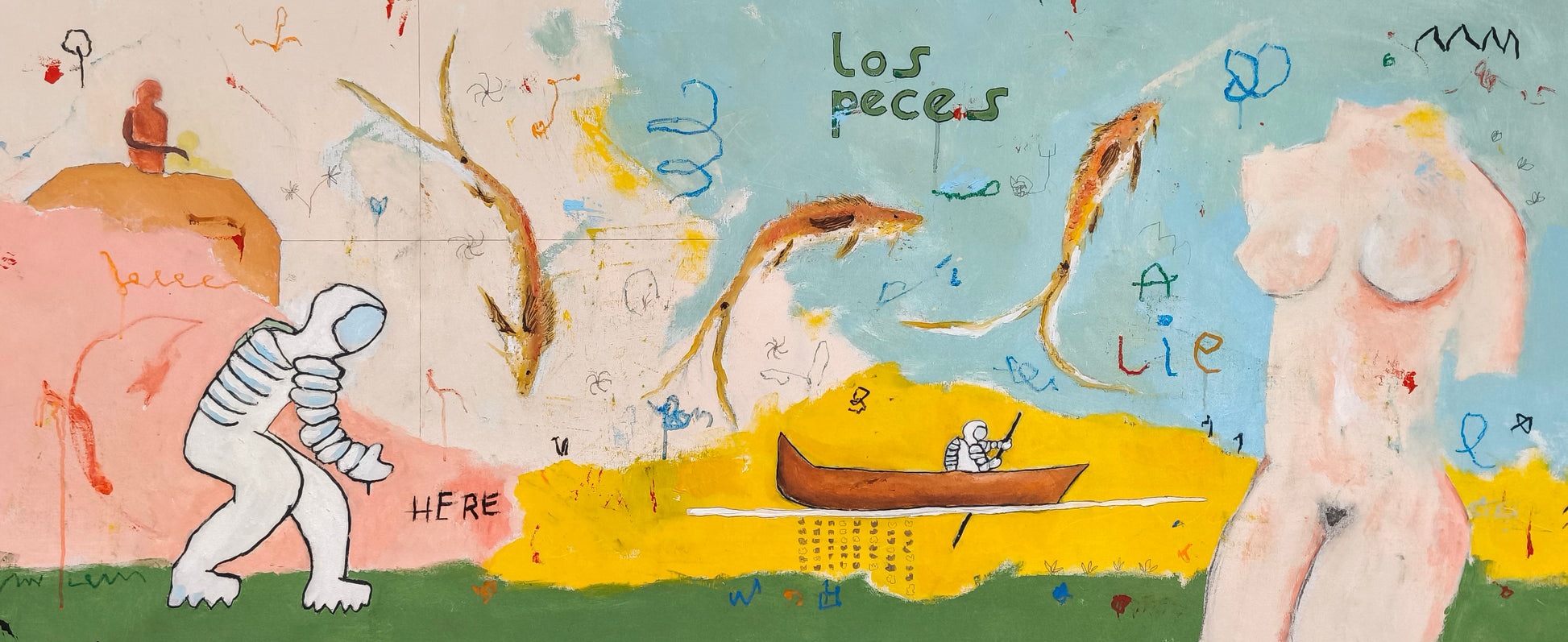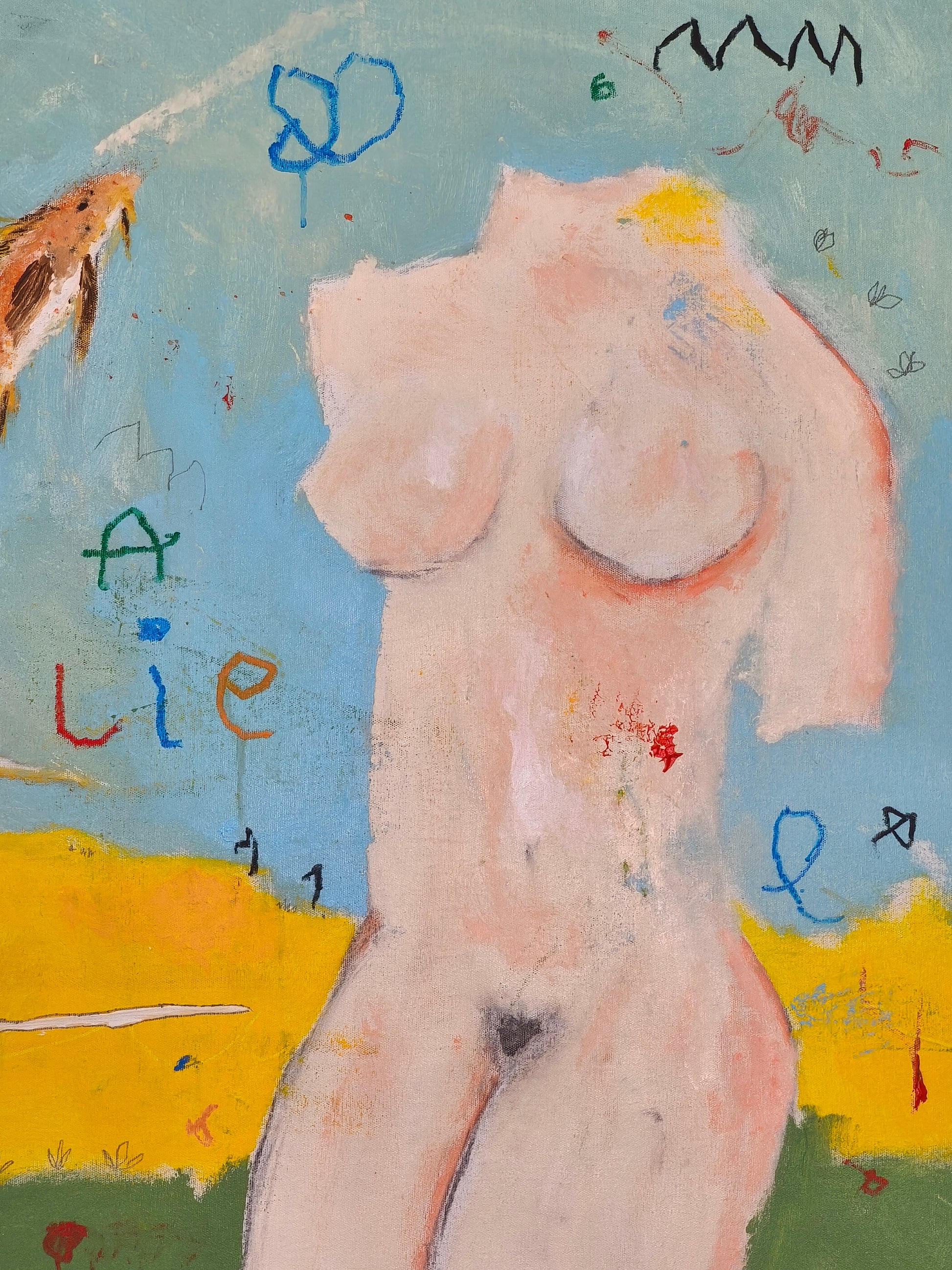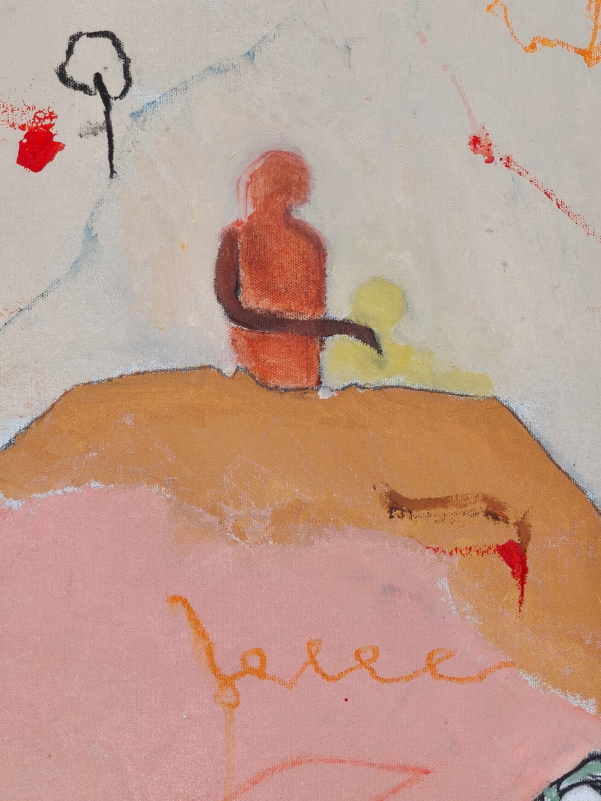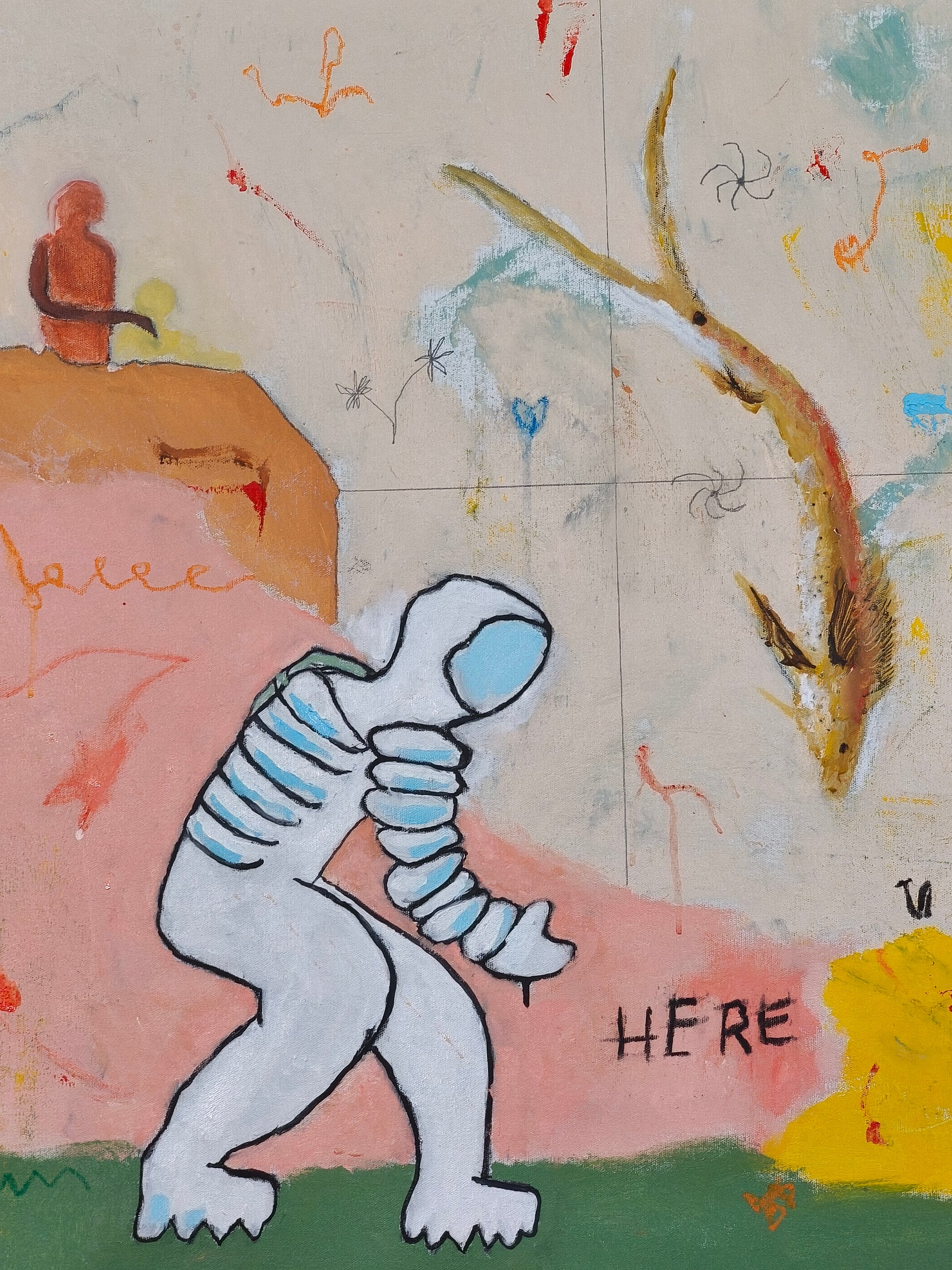 Pintura gestual, intuitiva, que deja que las cosas pasen y se apoya sobre lo que aparece. Aprovechando el accidente y aceptando las consecuencias.