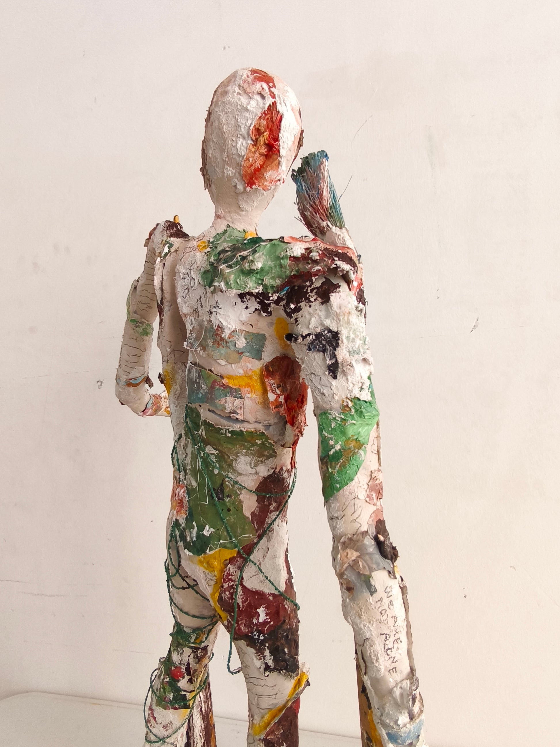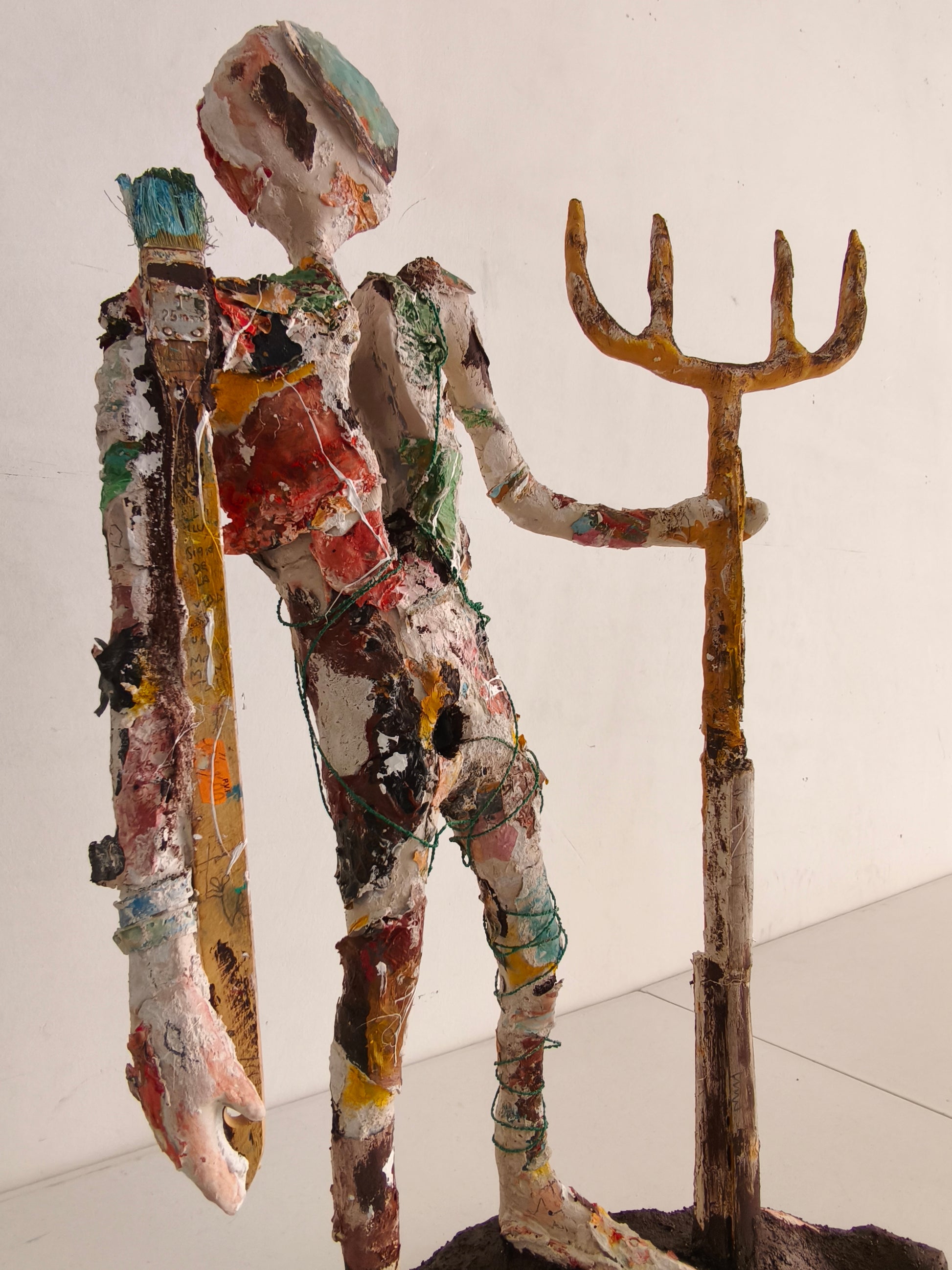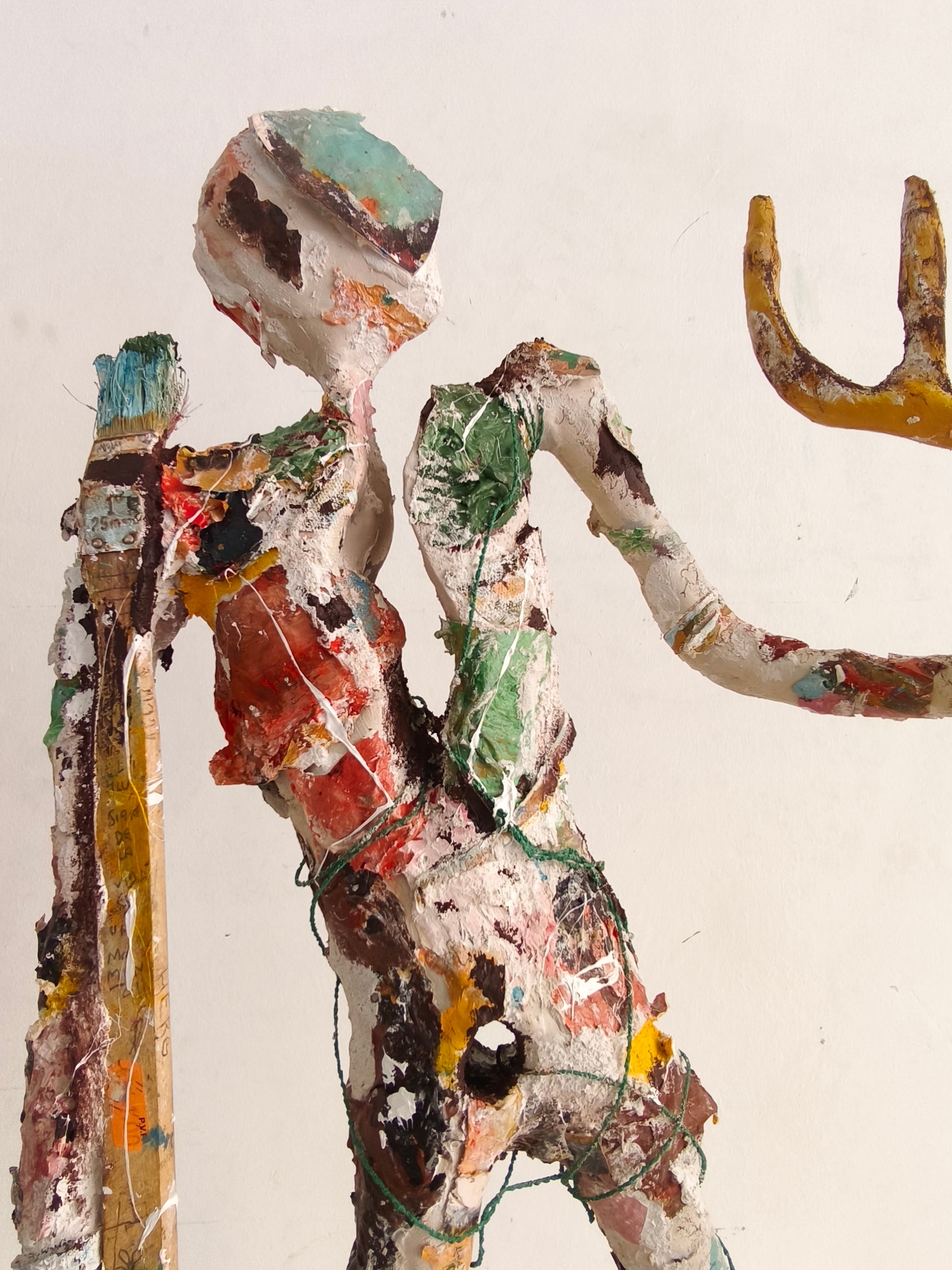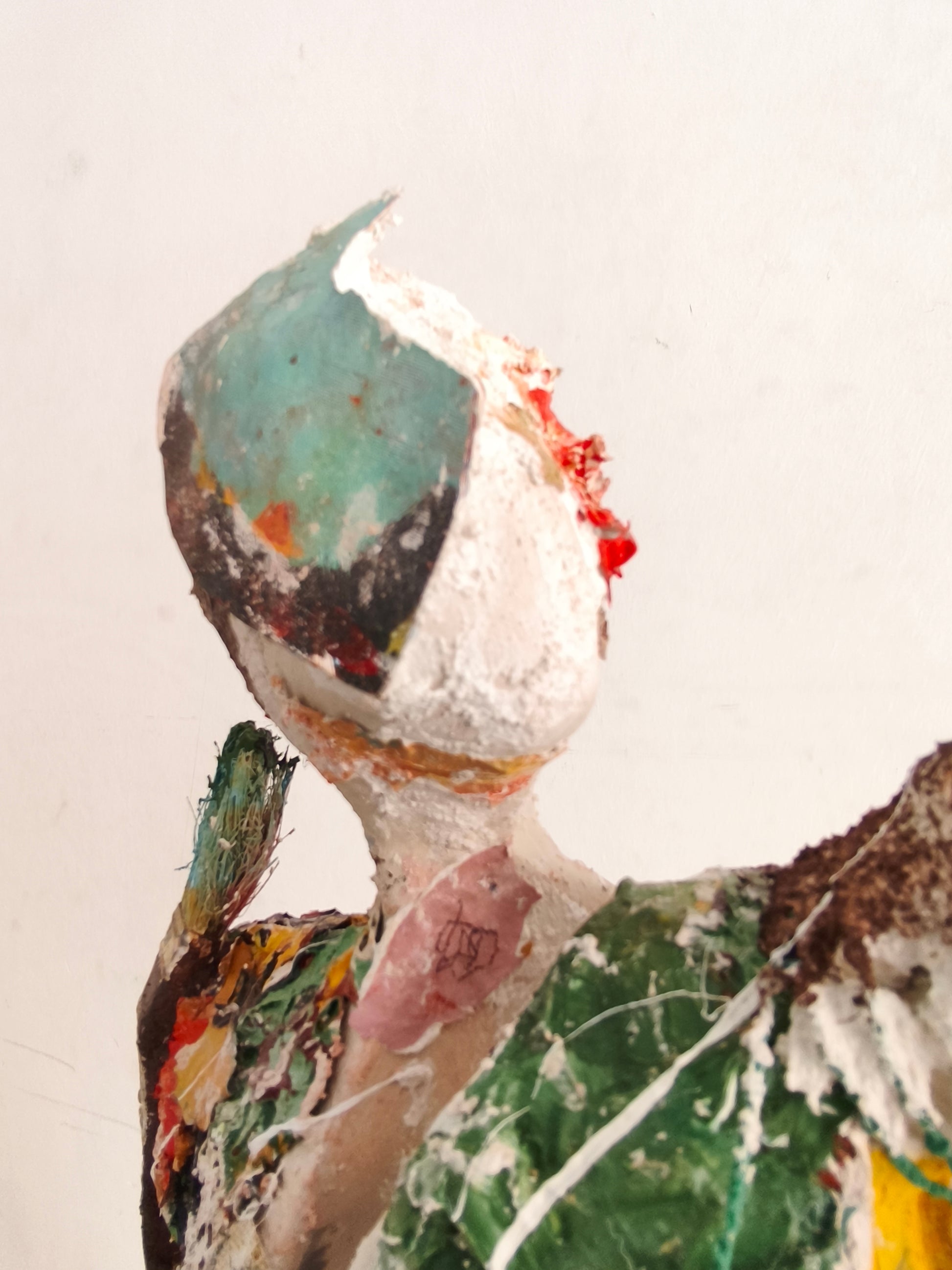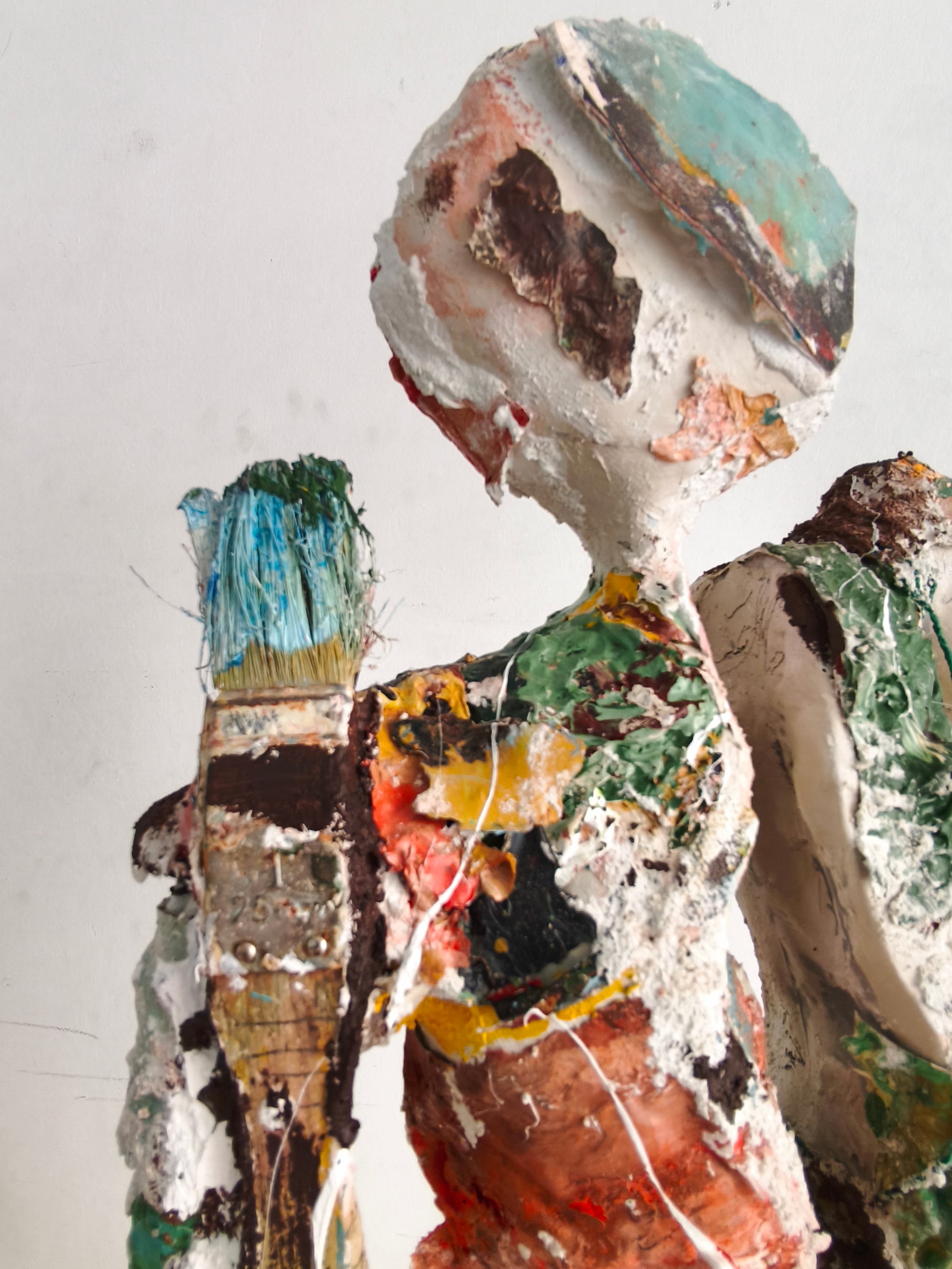 Técnica: base de escultura en impresión digital 3D en resina. Cobertura y detalles hechos a mano con restos de pintura acrílica seca, cemento cola, gesso, alambre, caña y brocha usada.