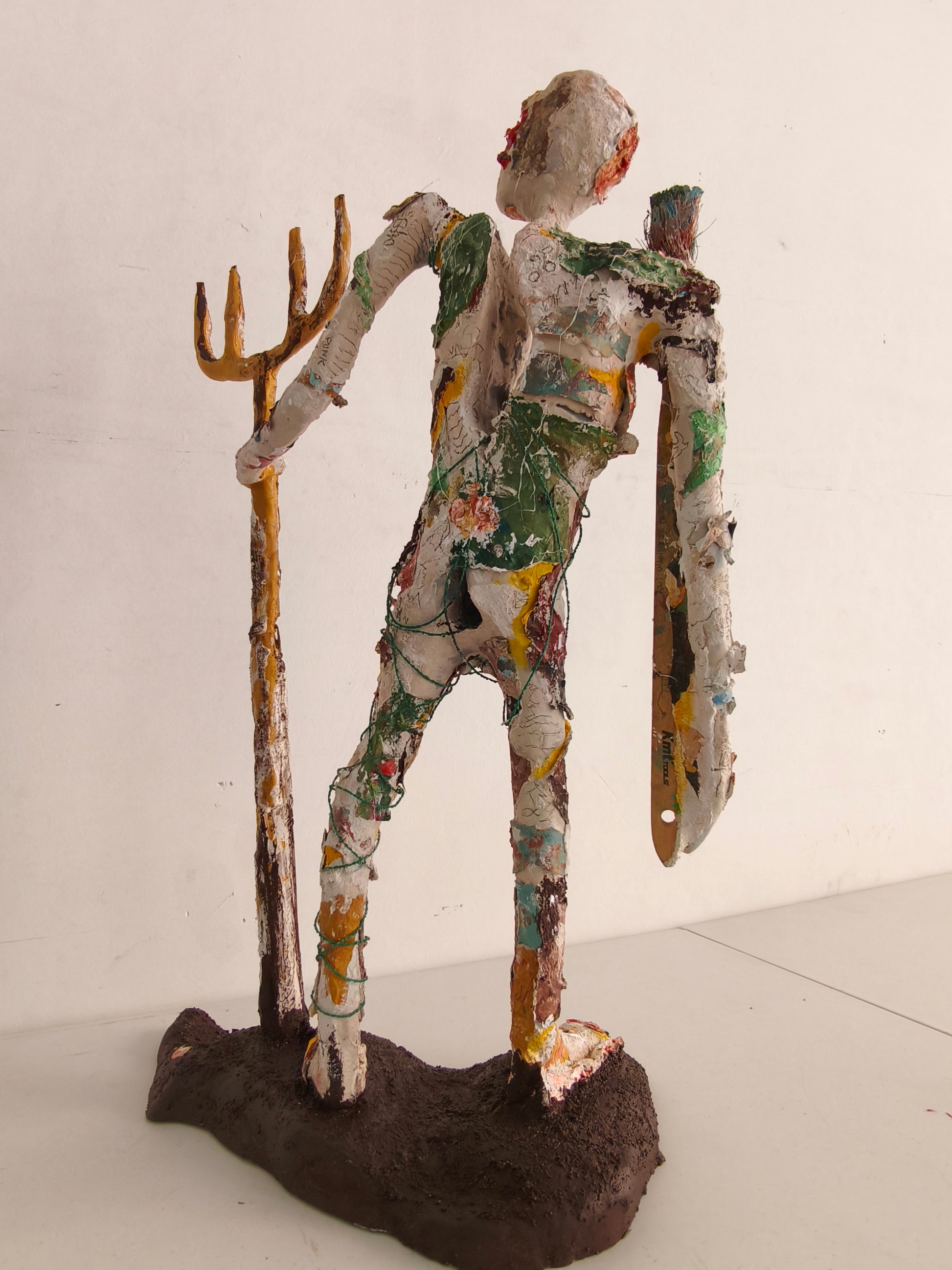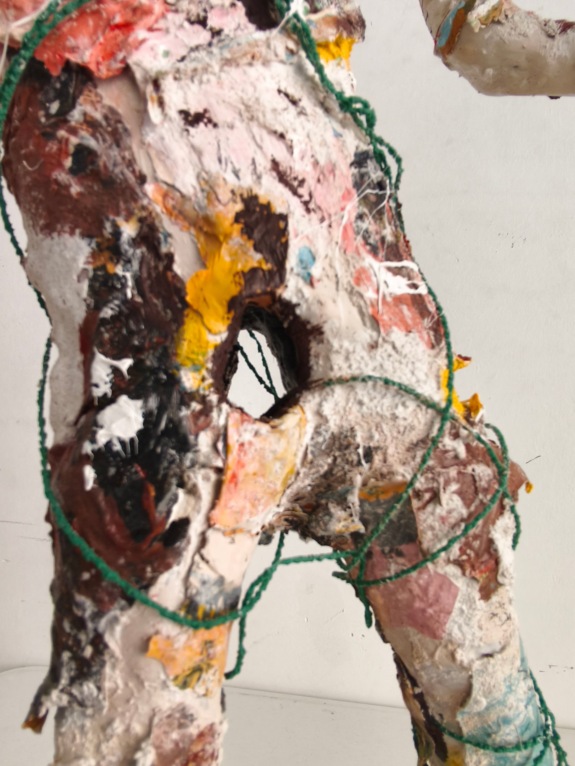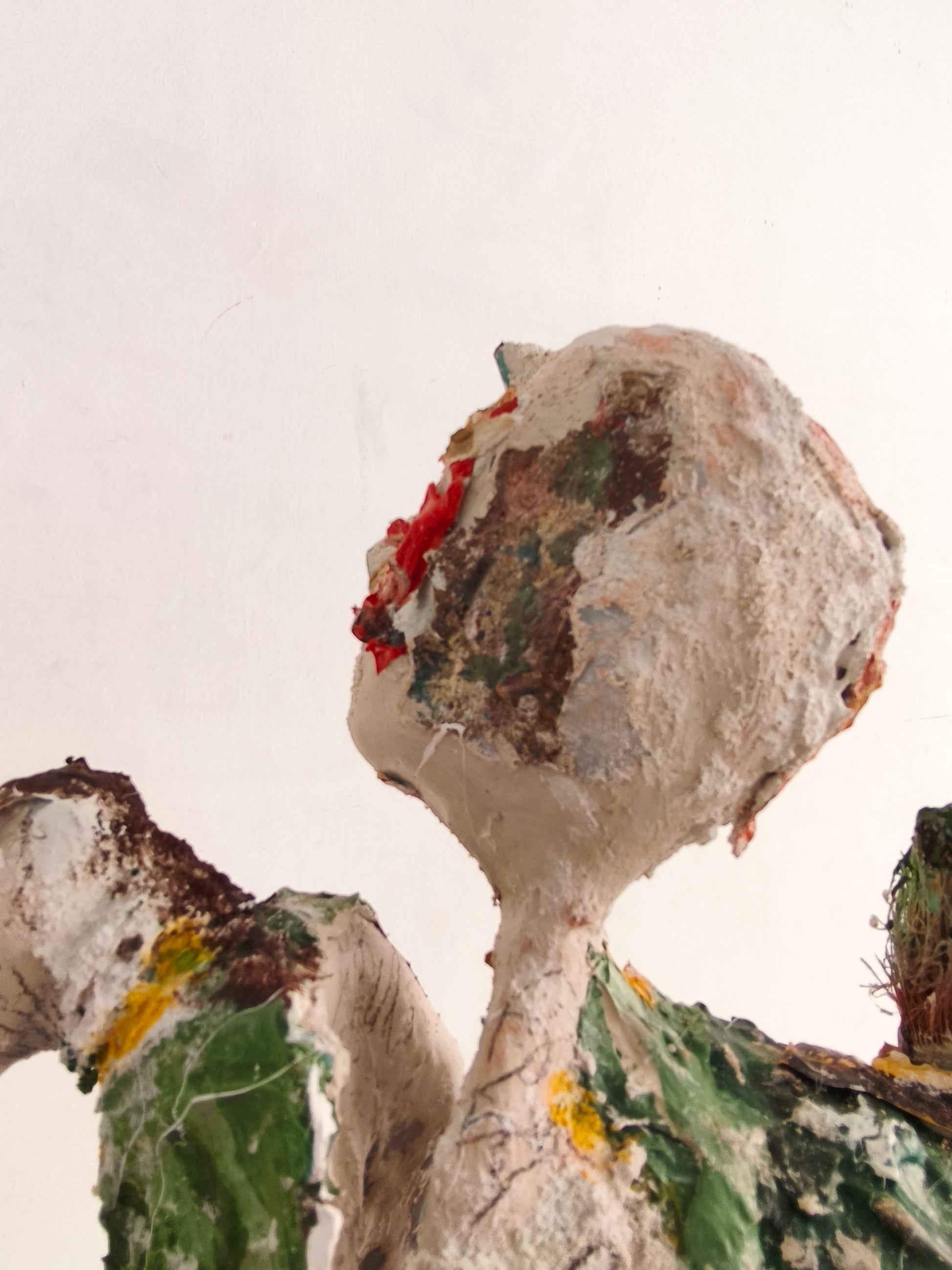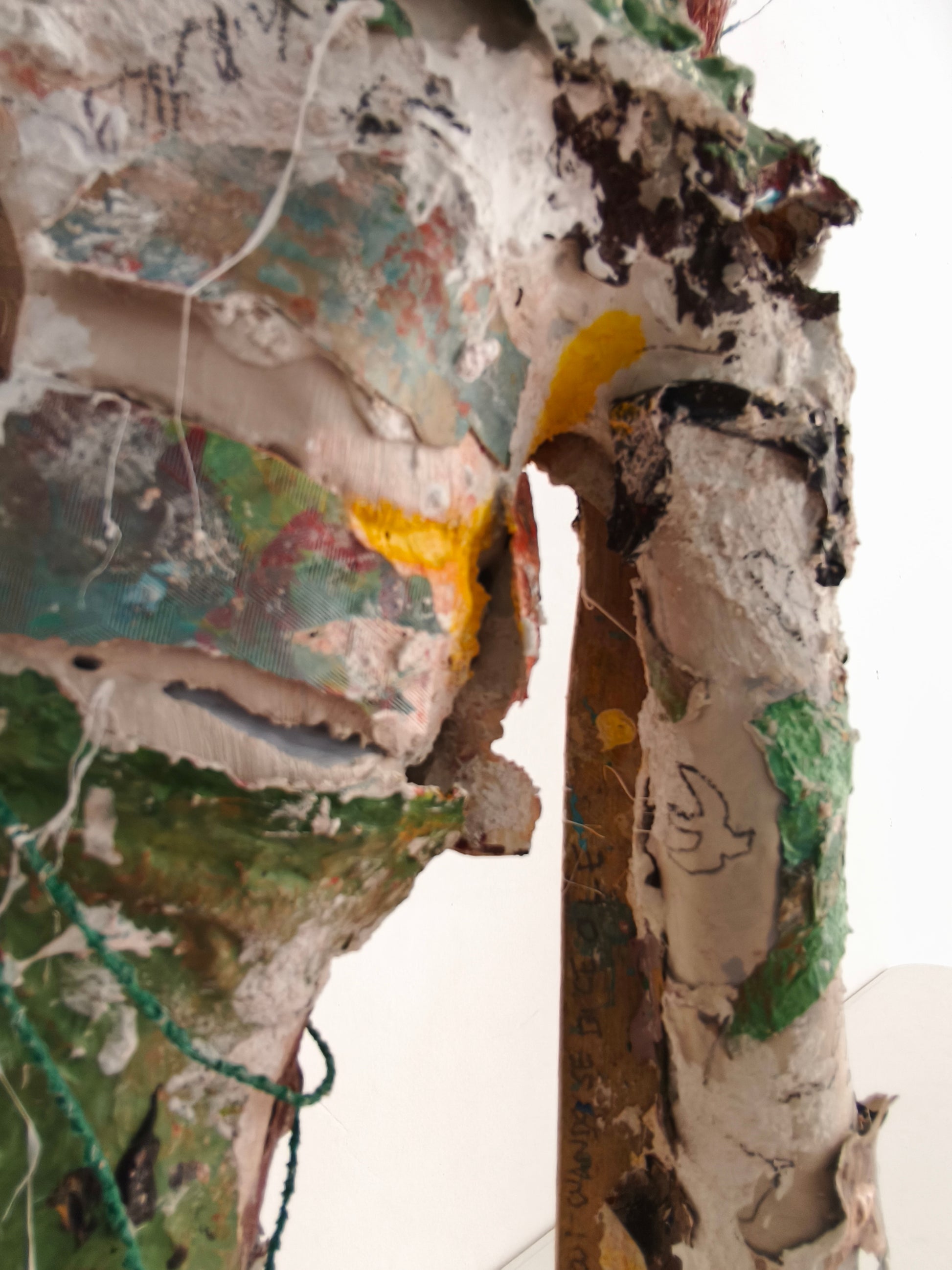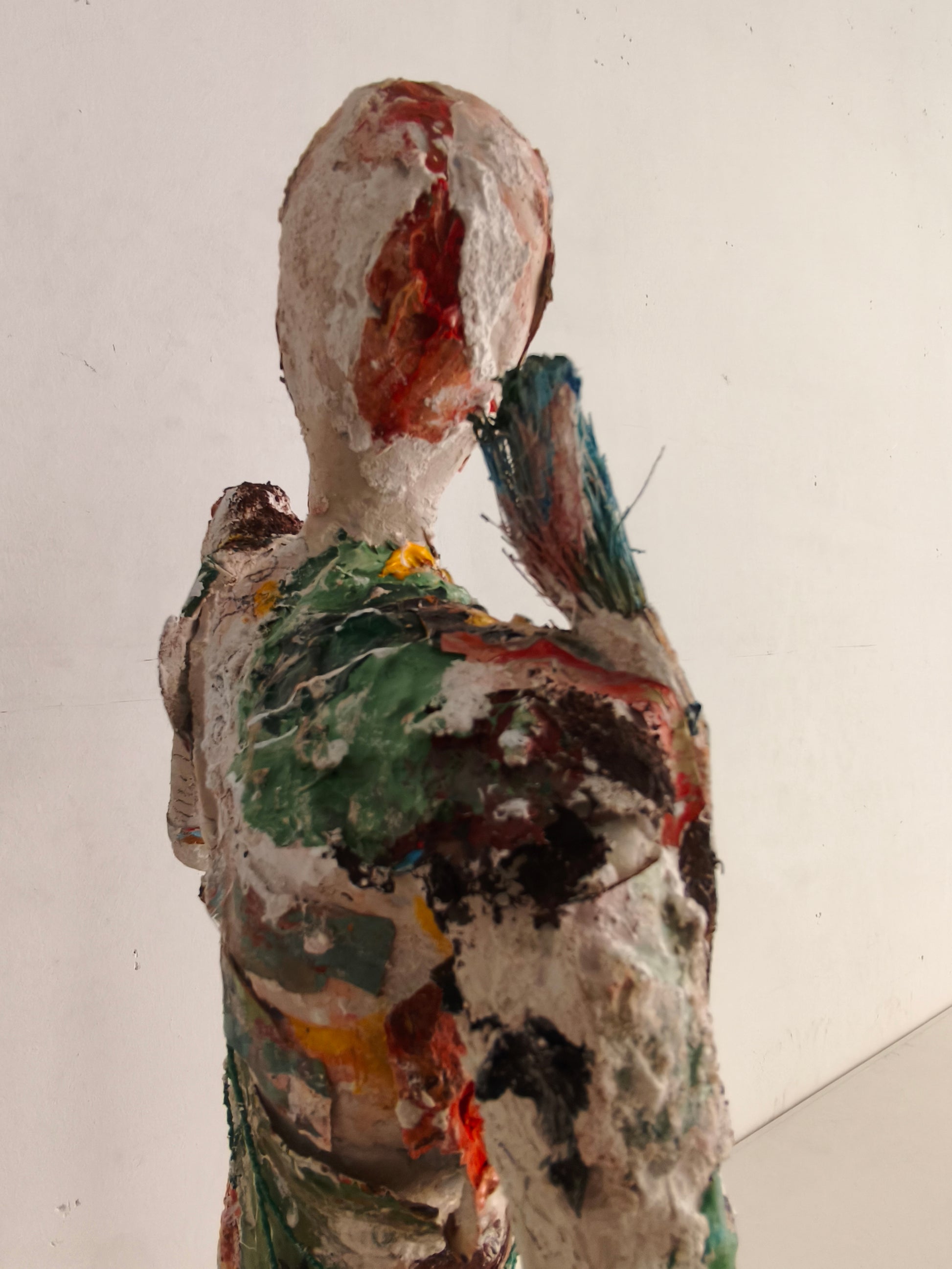 Técnica: base de escultura en impresión digital 3D en resina. Cobertura y detalles hechos a mano con restos de pintura acrílica seca, cemento cola, gesso, alambre, caña y brocha usada.
