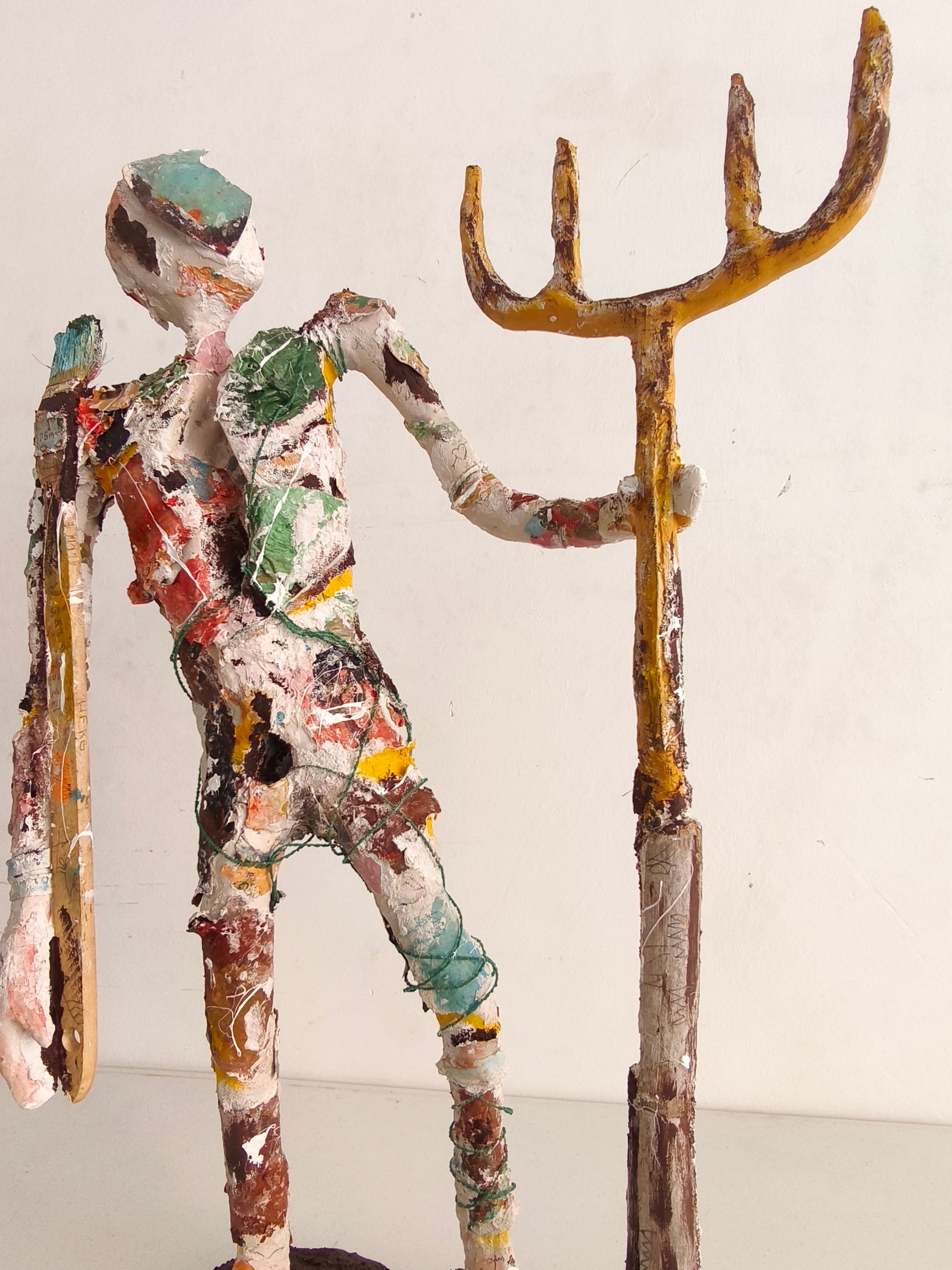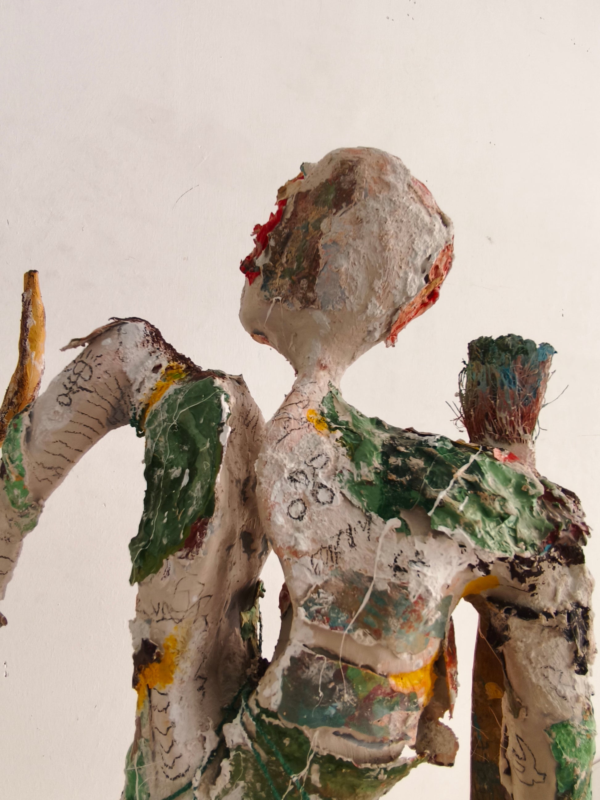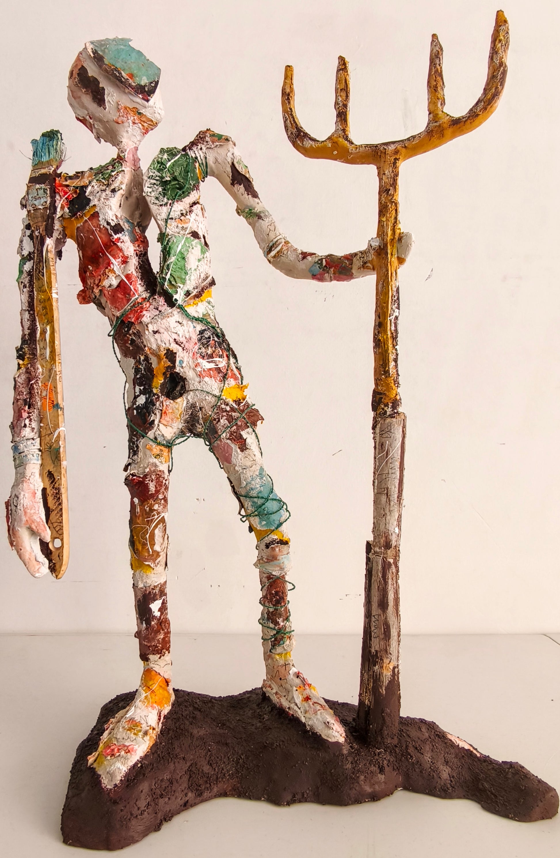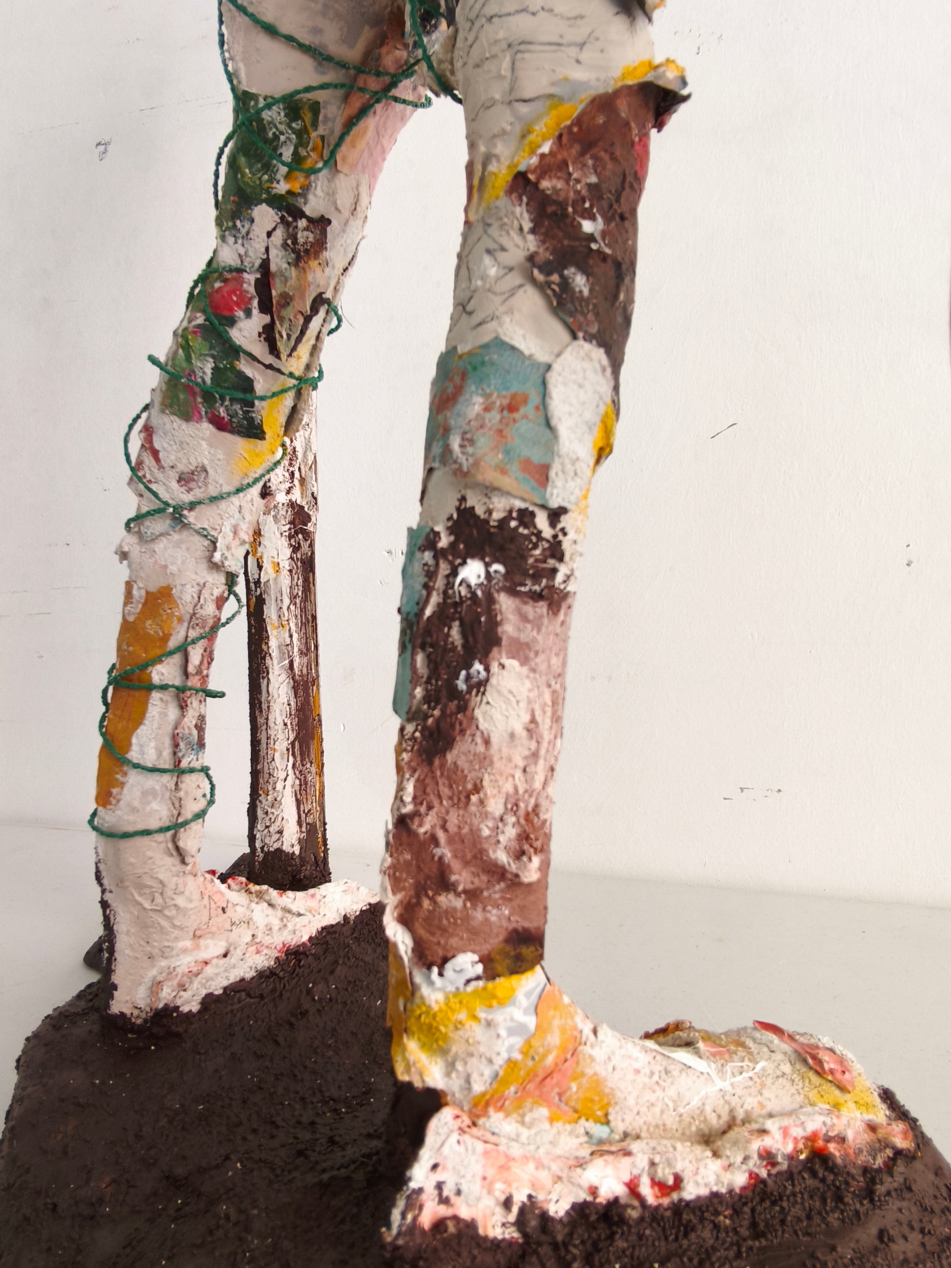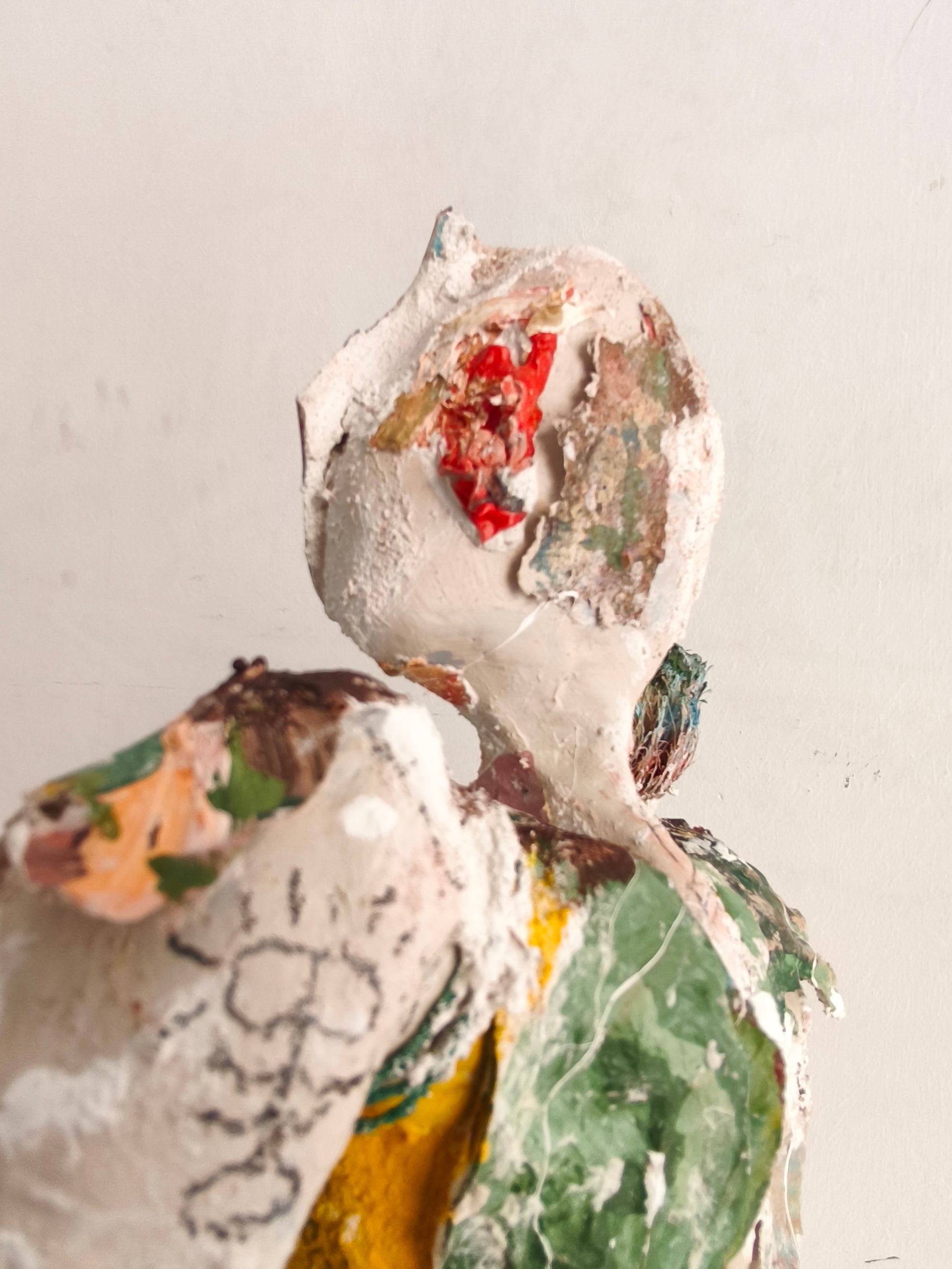 Técnica: base de escultura en impresión digital 3D en resina. Cobertura y detalles hechos a mano con restos de pintura acrílica seca, cemento cola, gesso, alambre, caña y brocha usada.