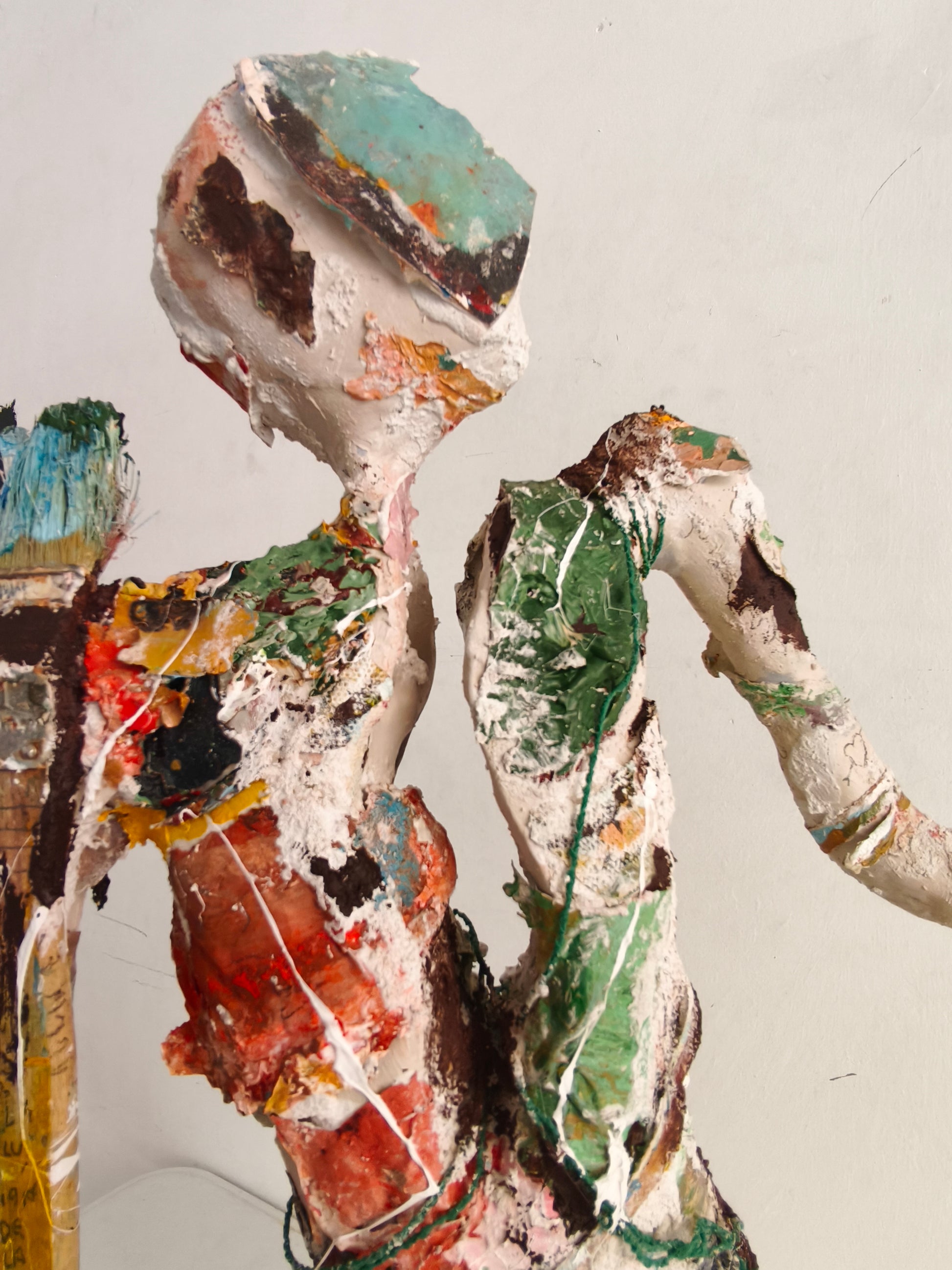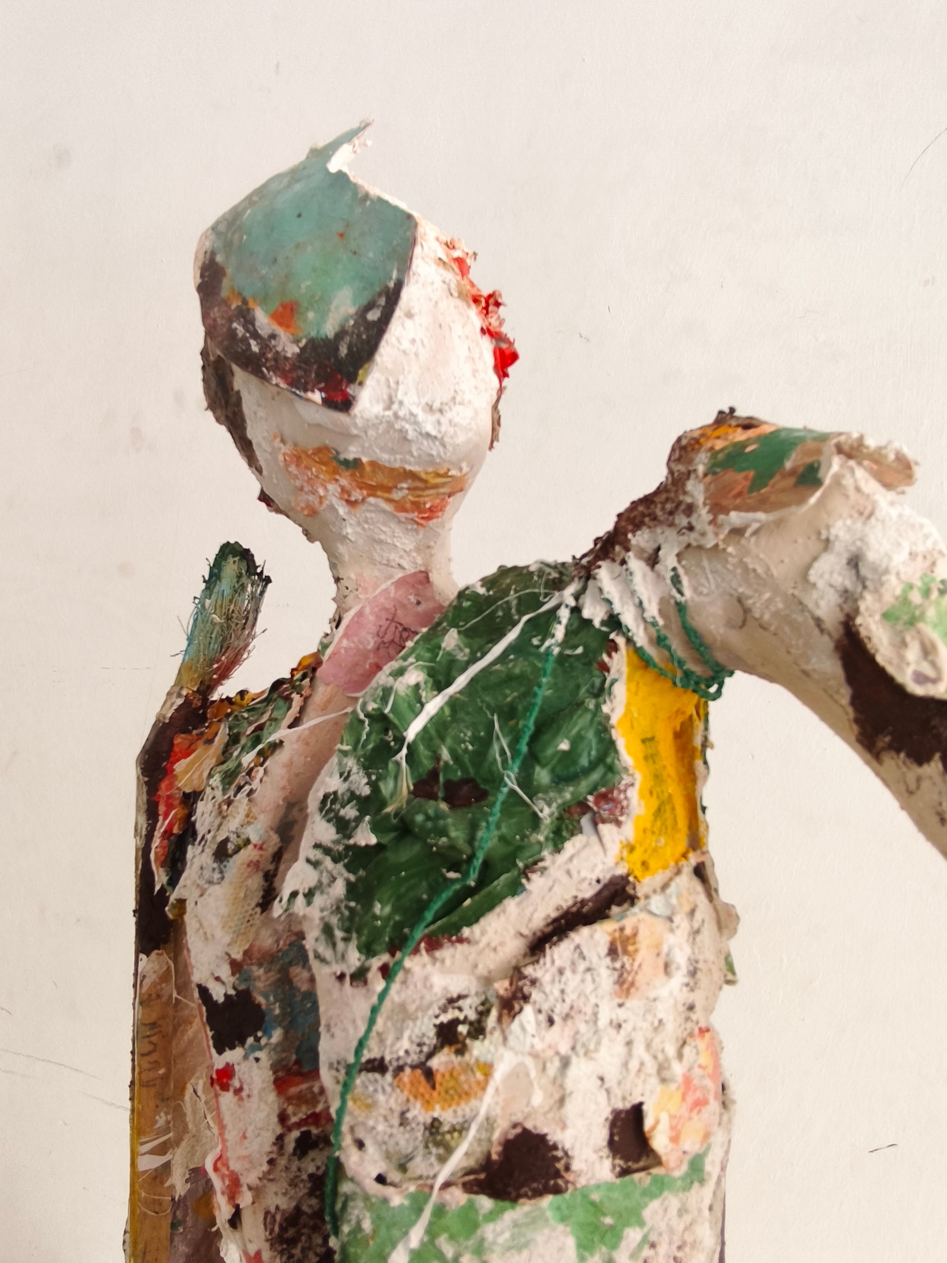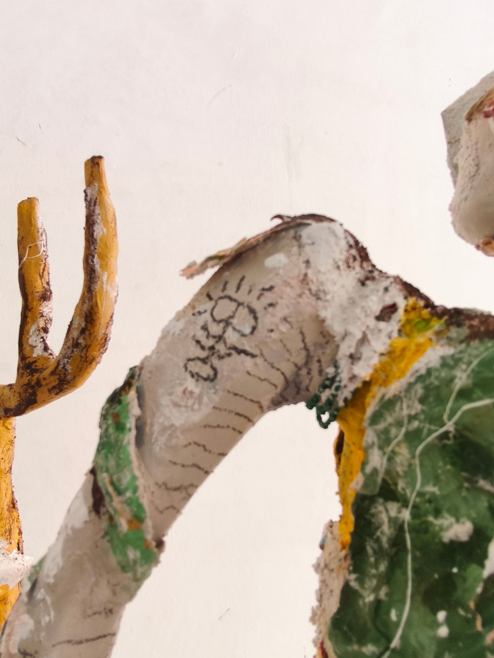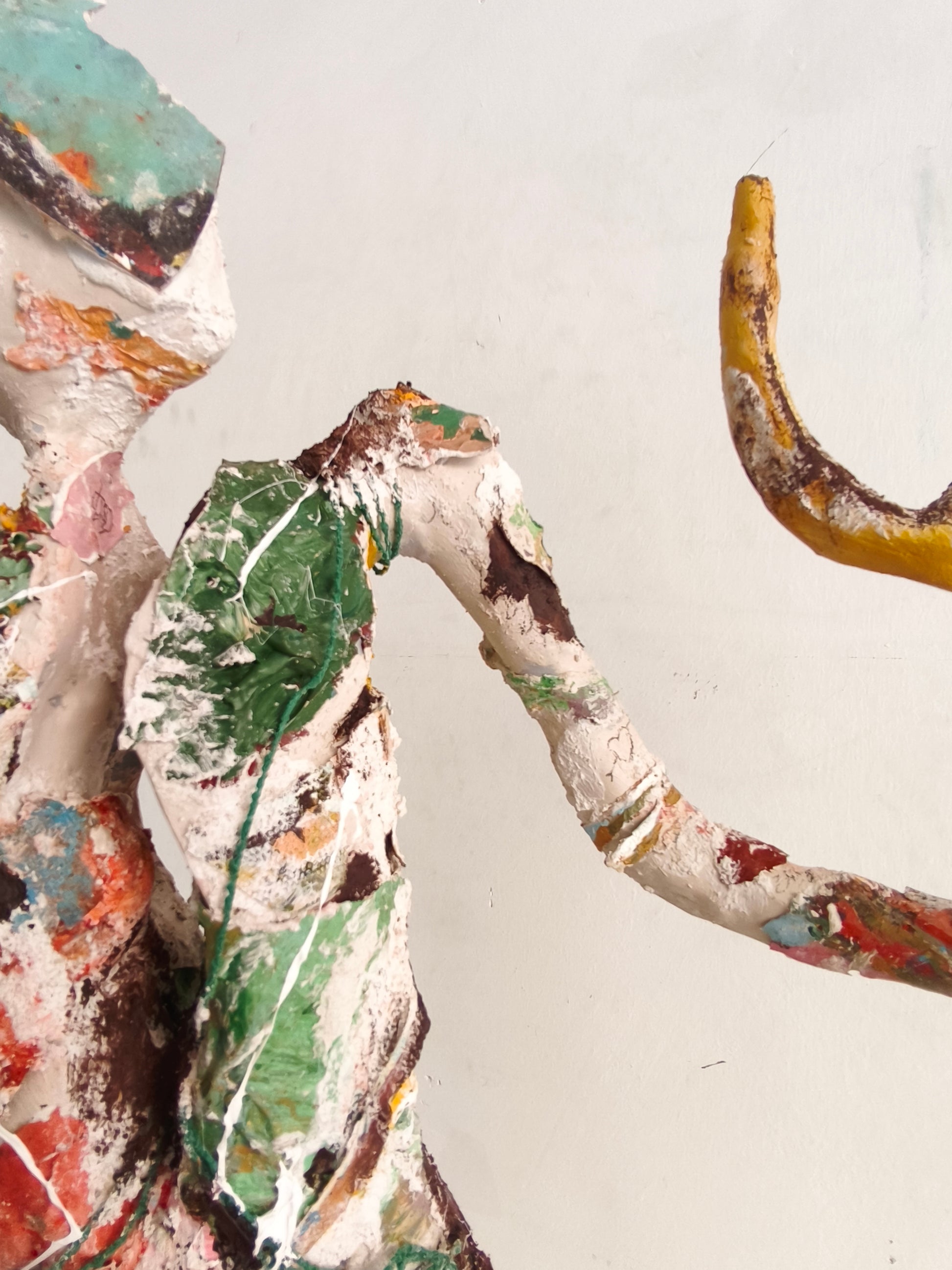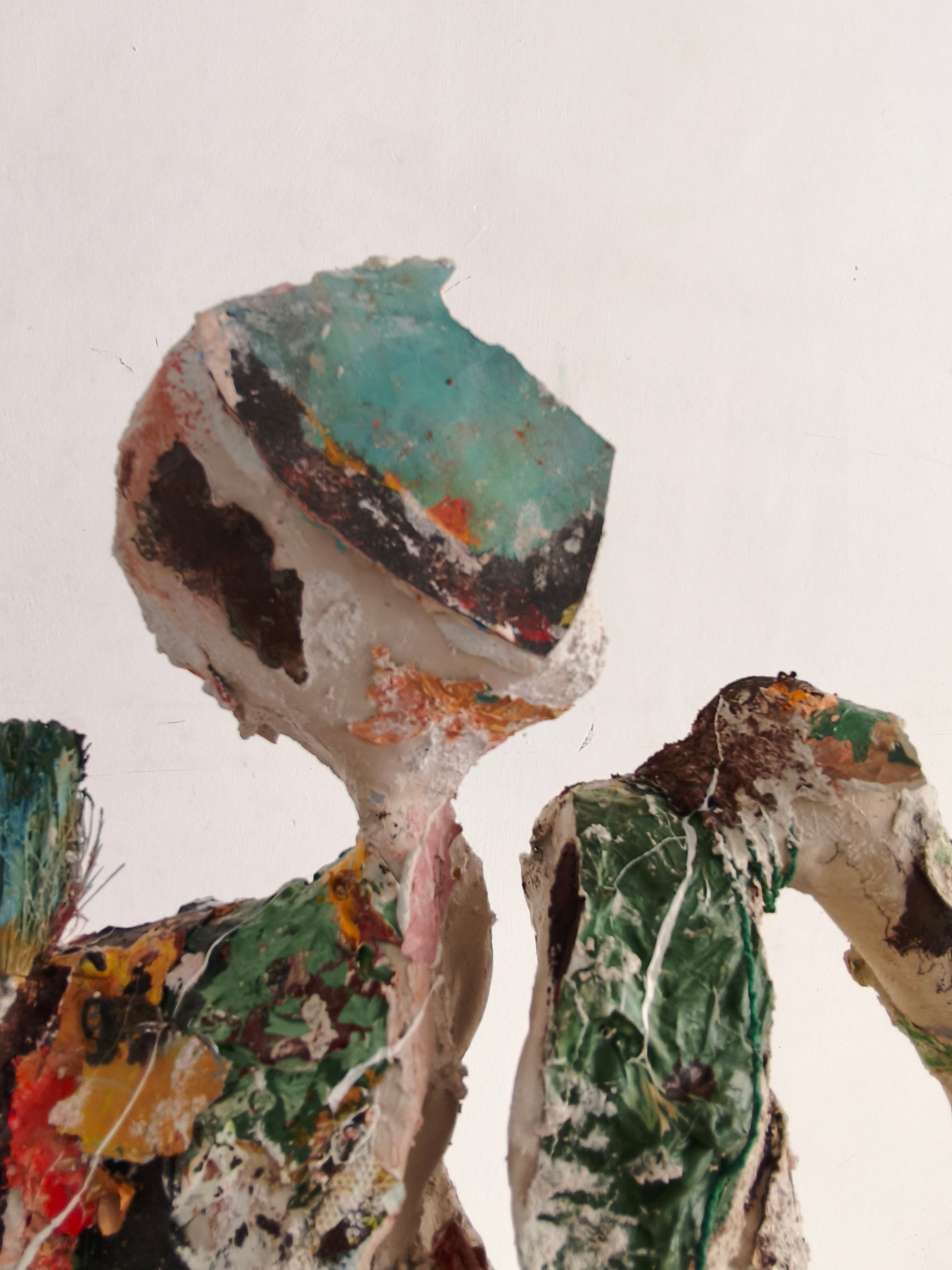 Técnica: base de escultura en impresión digital 3D en resina. Cobertura y detalles hechos a mano con restos de pintura acrílica seca, cemento cola, gesso, alambre, caña y brocha usada.