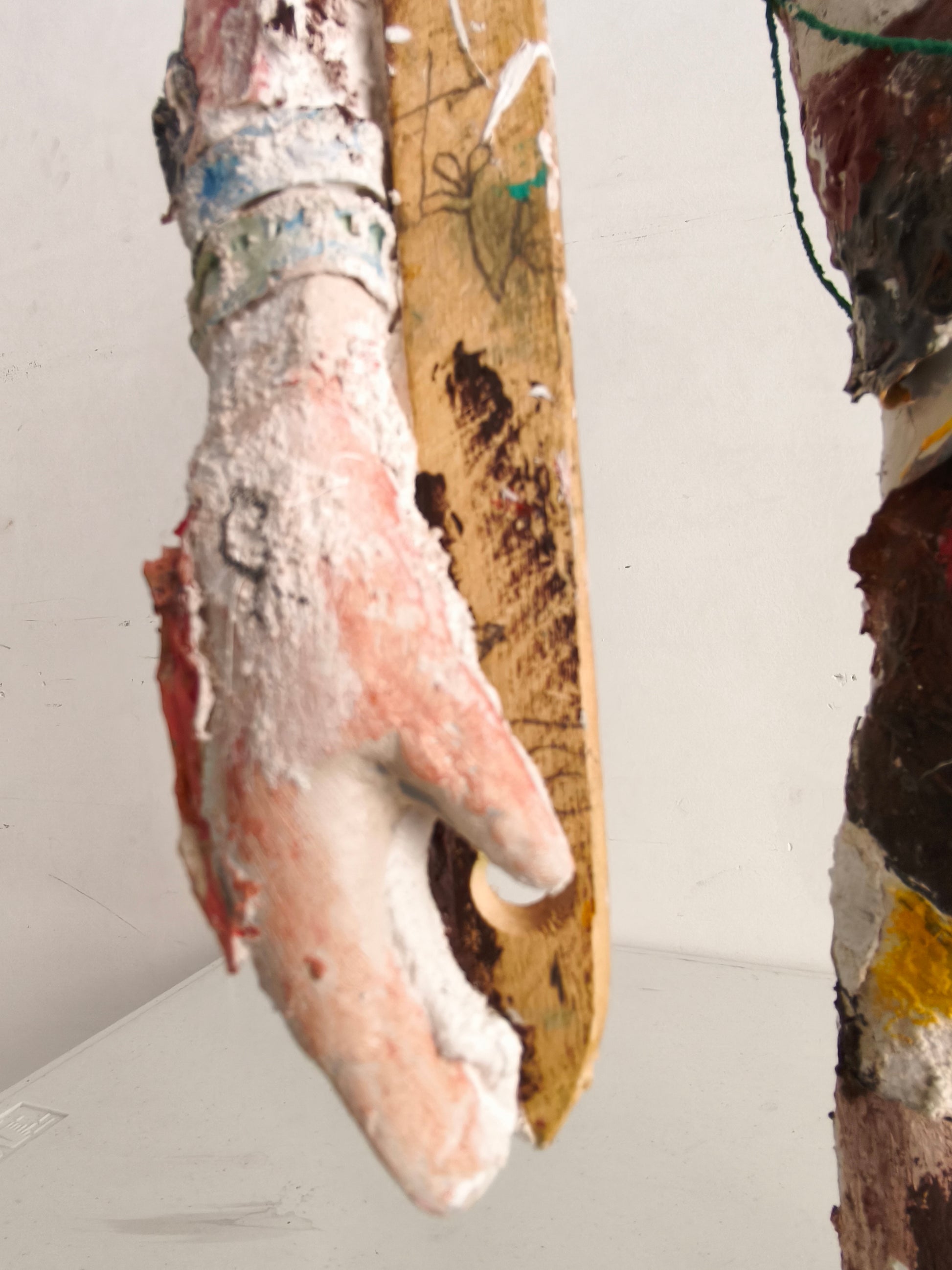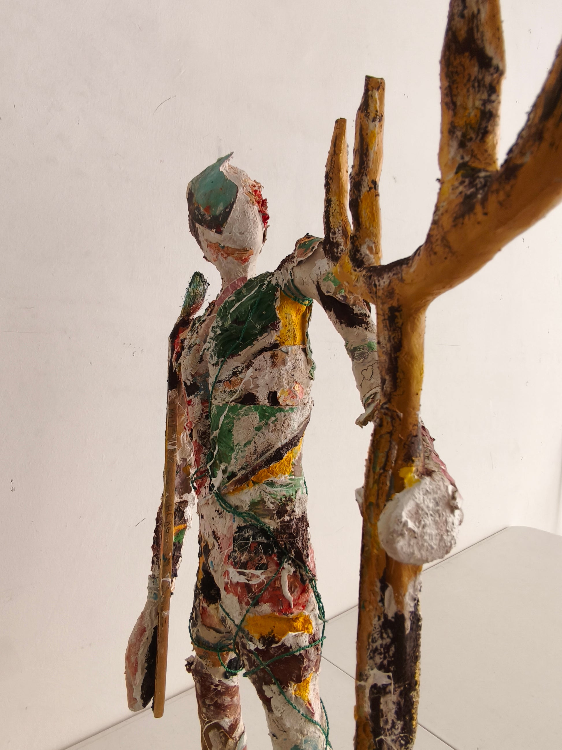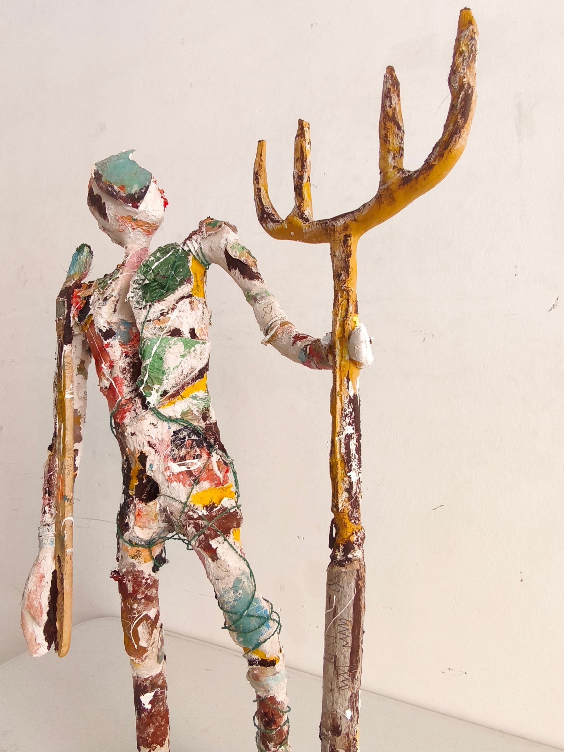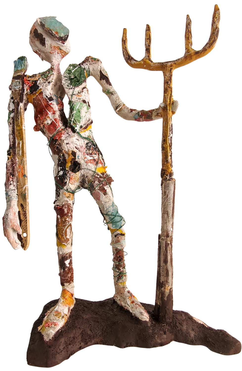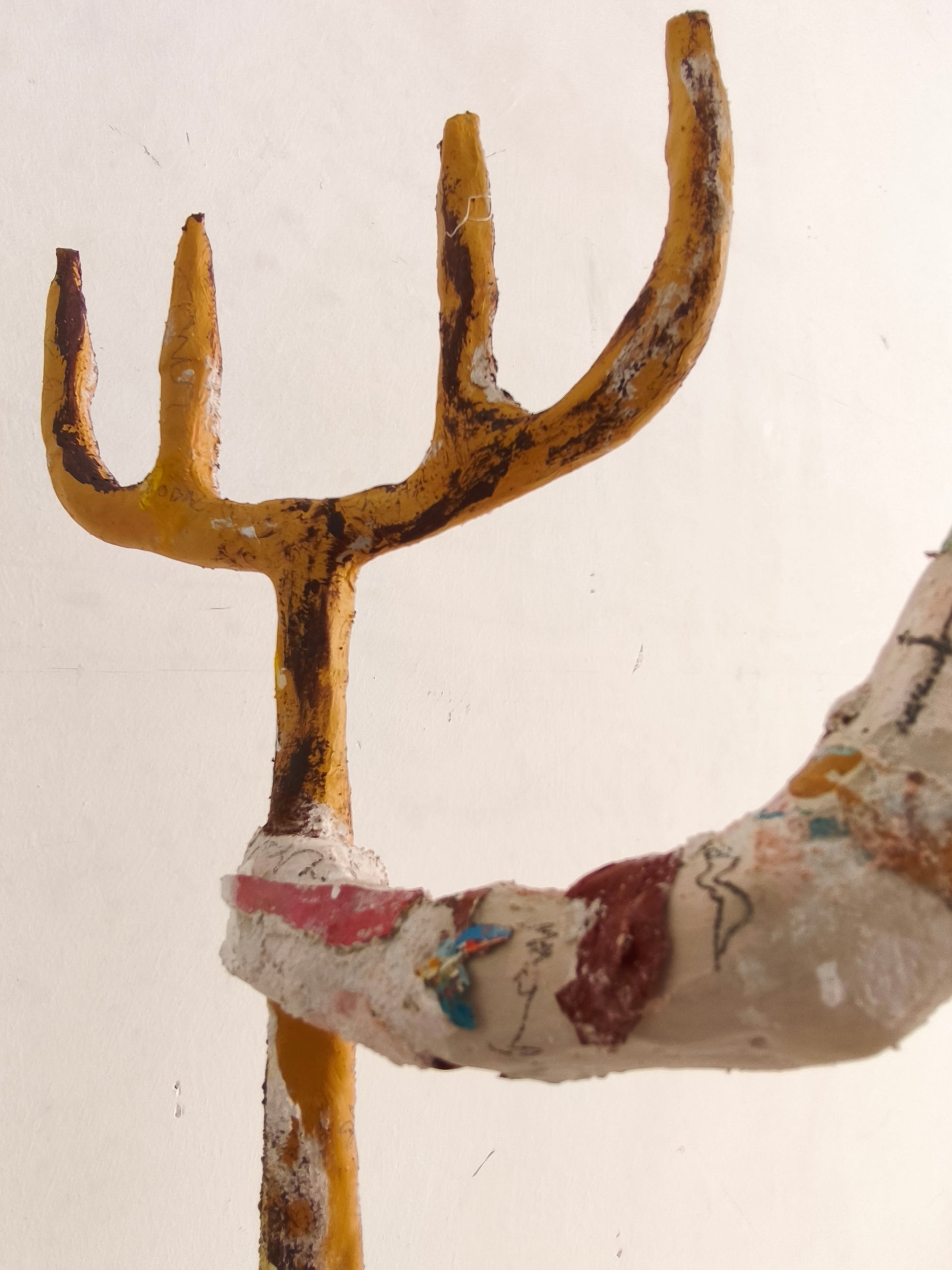 Técnica: base de escultura en impresión digital 3D en resina. Cobertura y detalles hechos a mano con restos de pintura acrílica seca, cemento cola, gesso, alambre, caña y brocha usada.