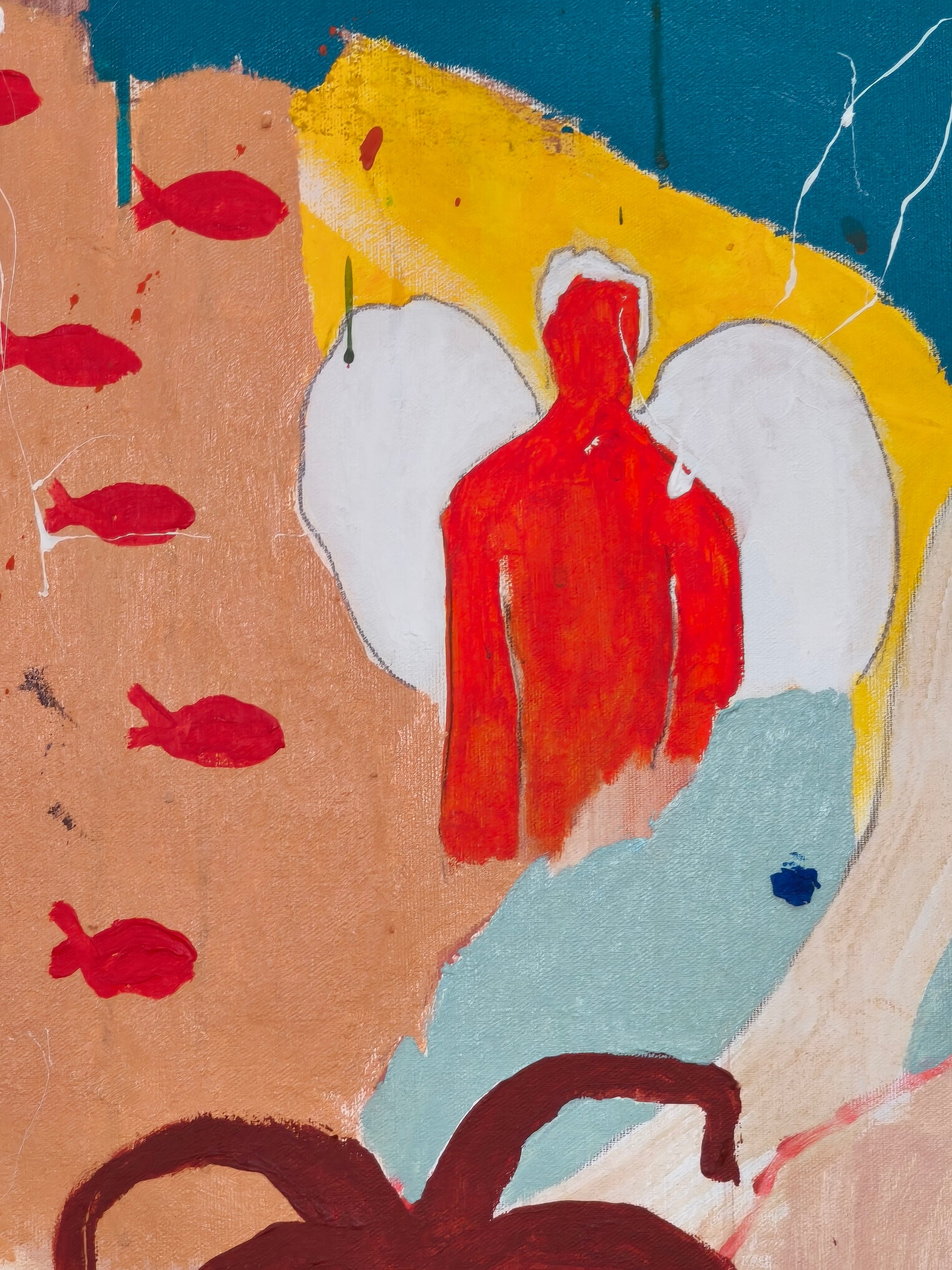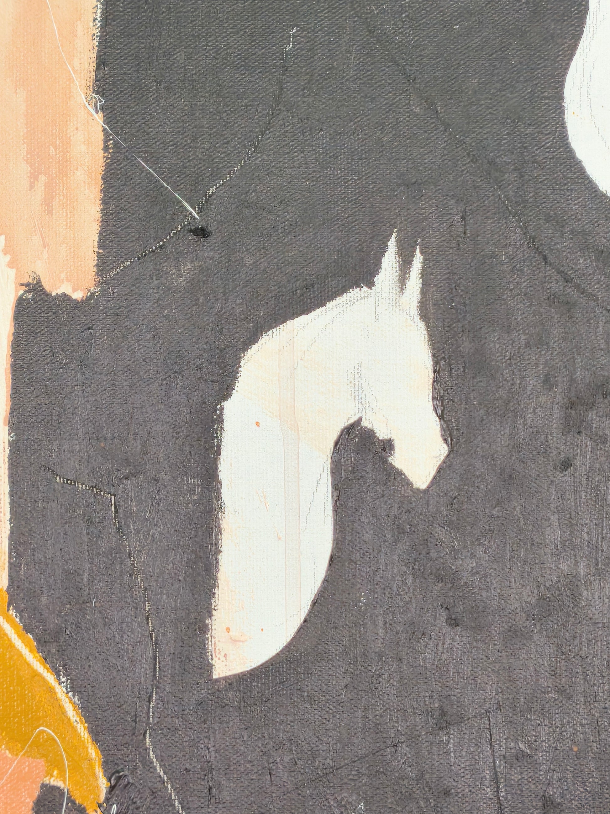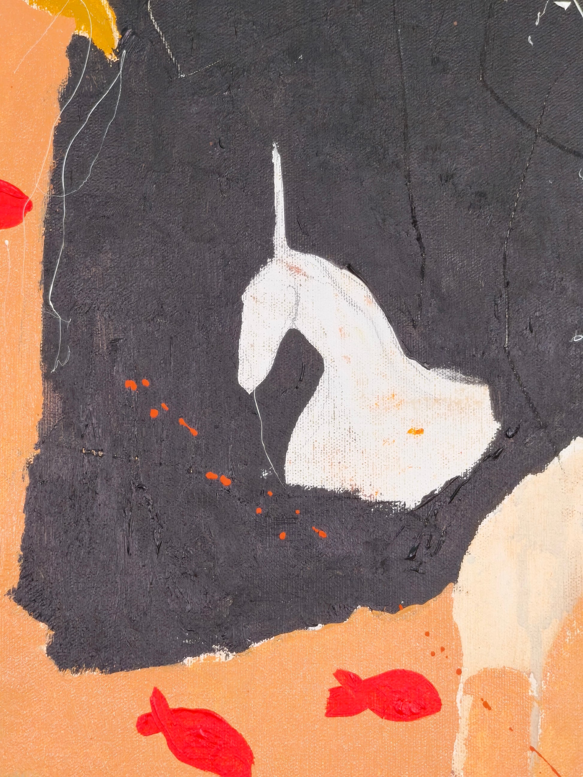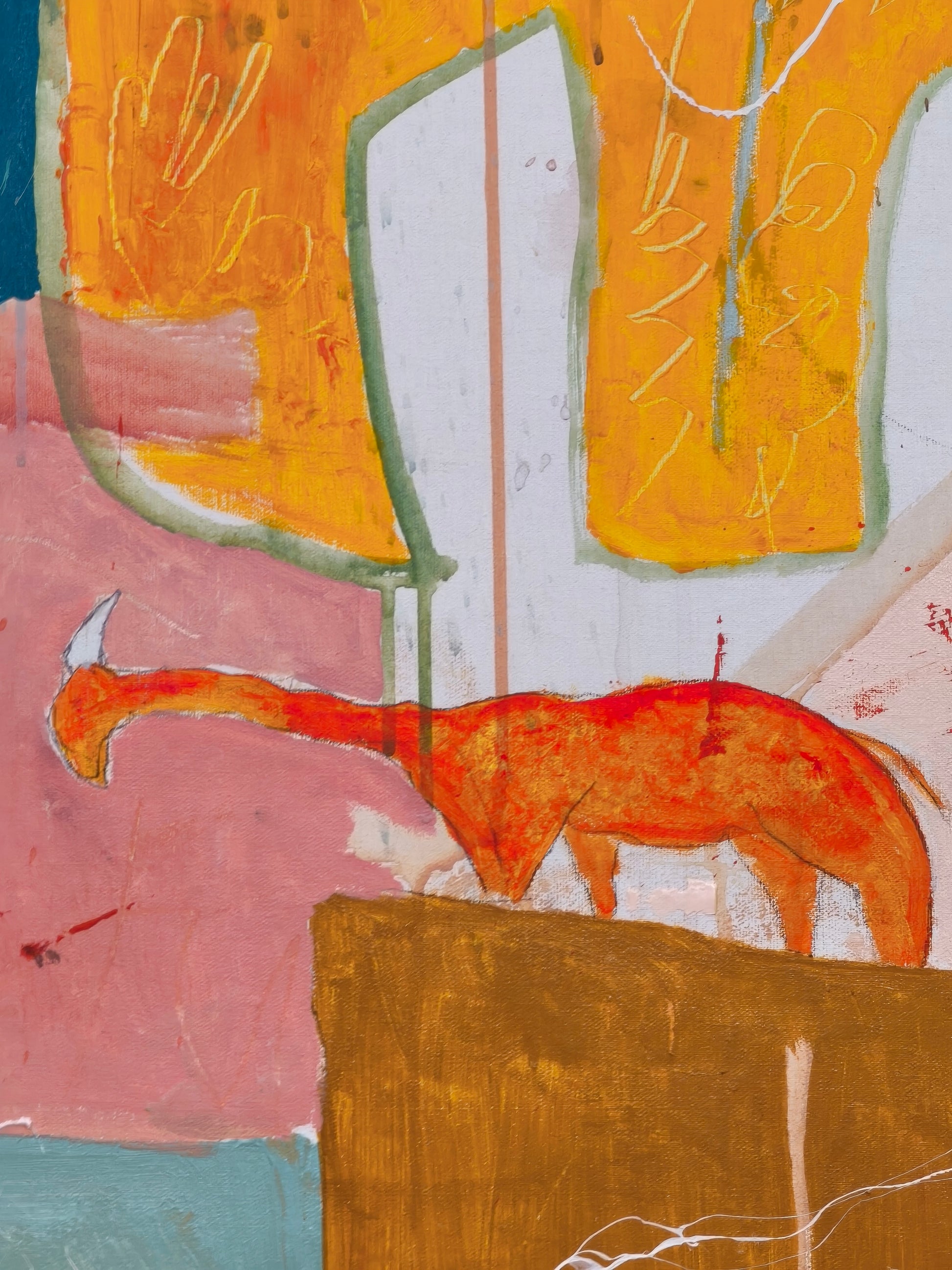 Pintura gestual, intuitiva, que deja que las cosas pasen y se apoya sobre lo que aparece. Aprovechando el accidente y aceptando las consecuencias.
