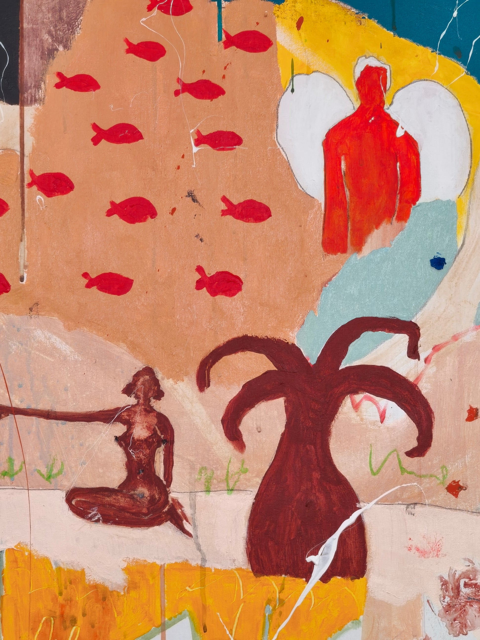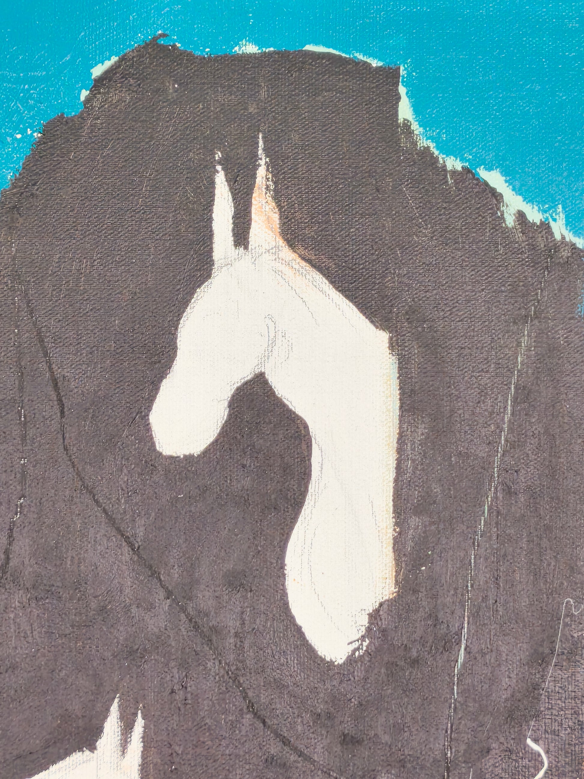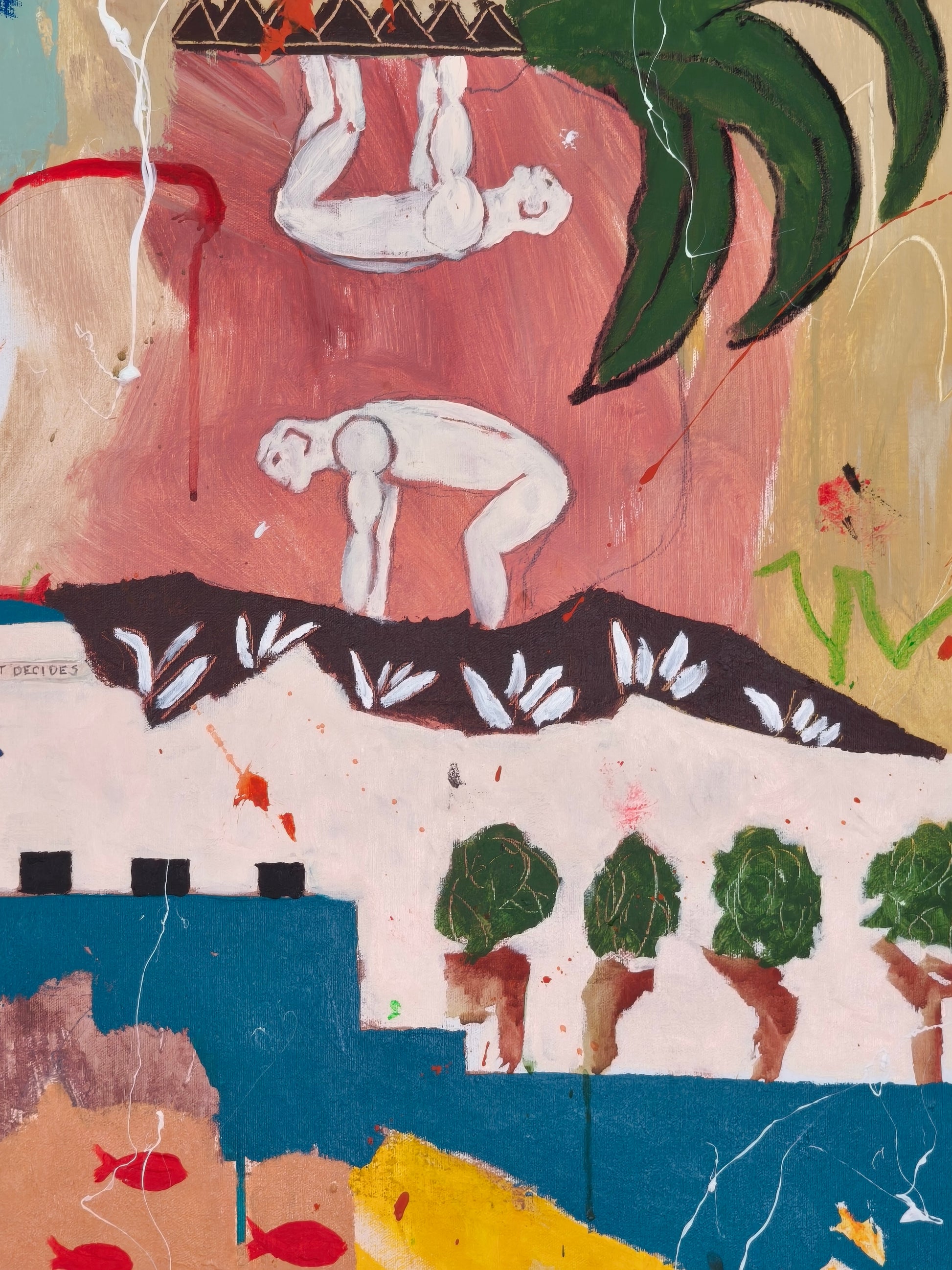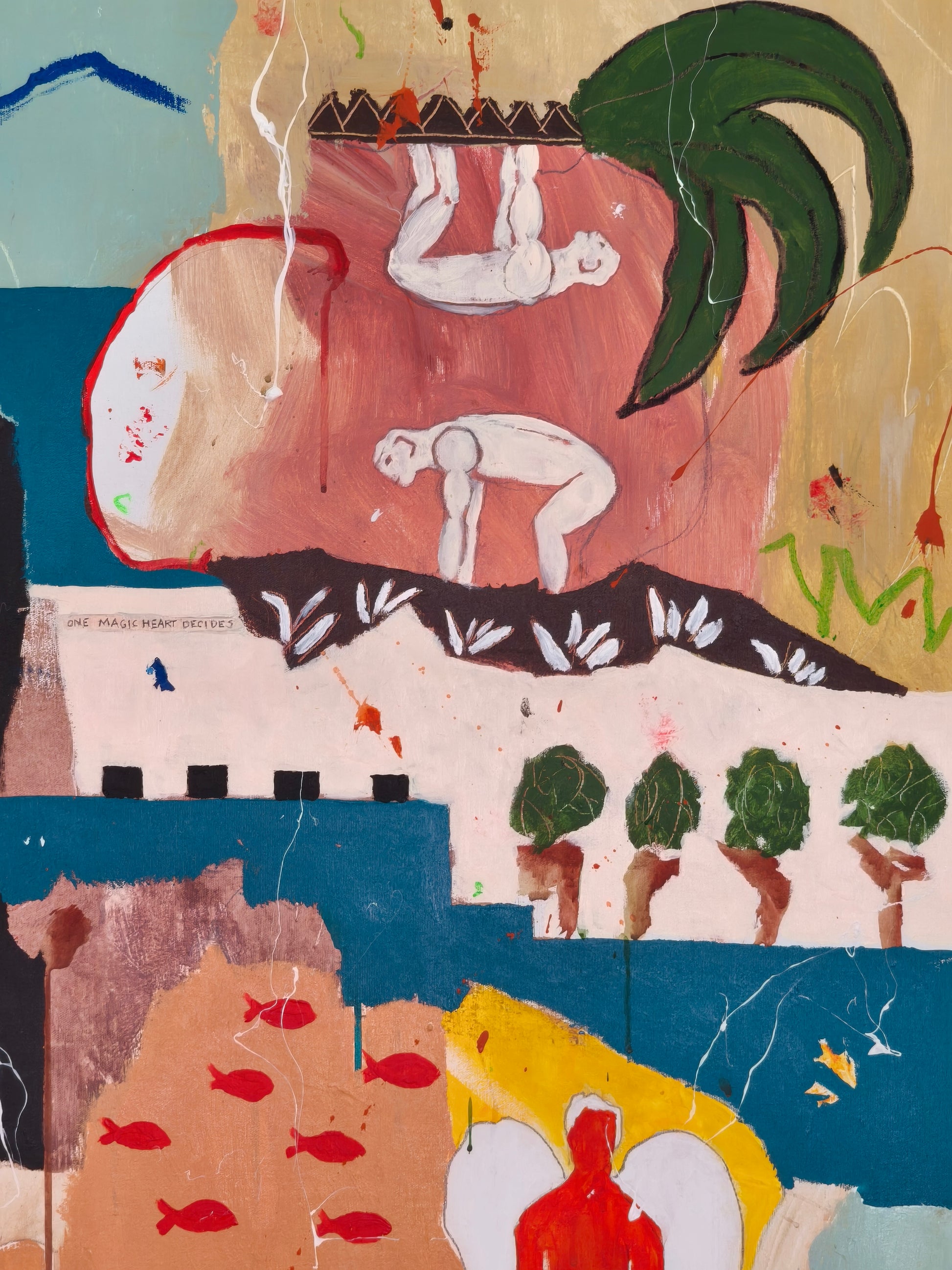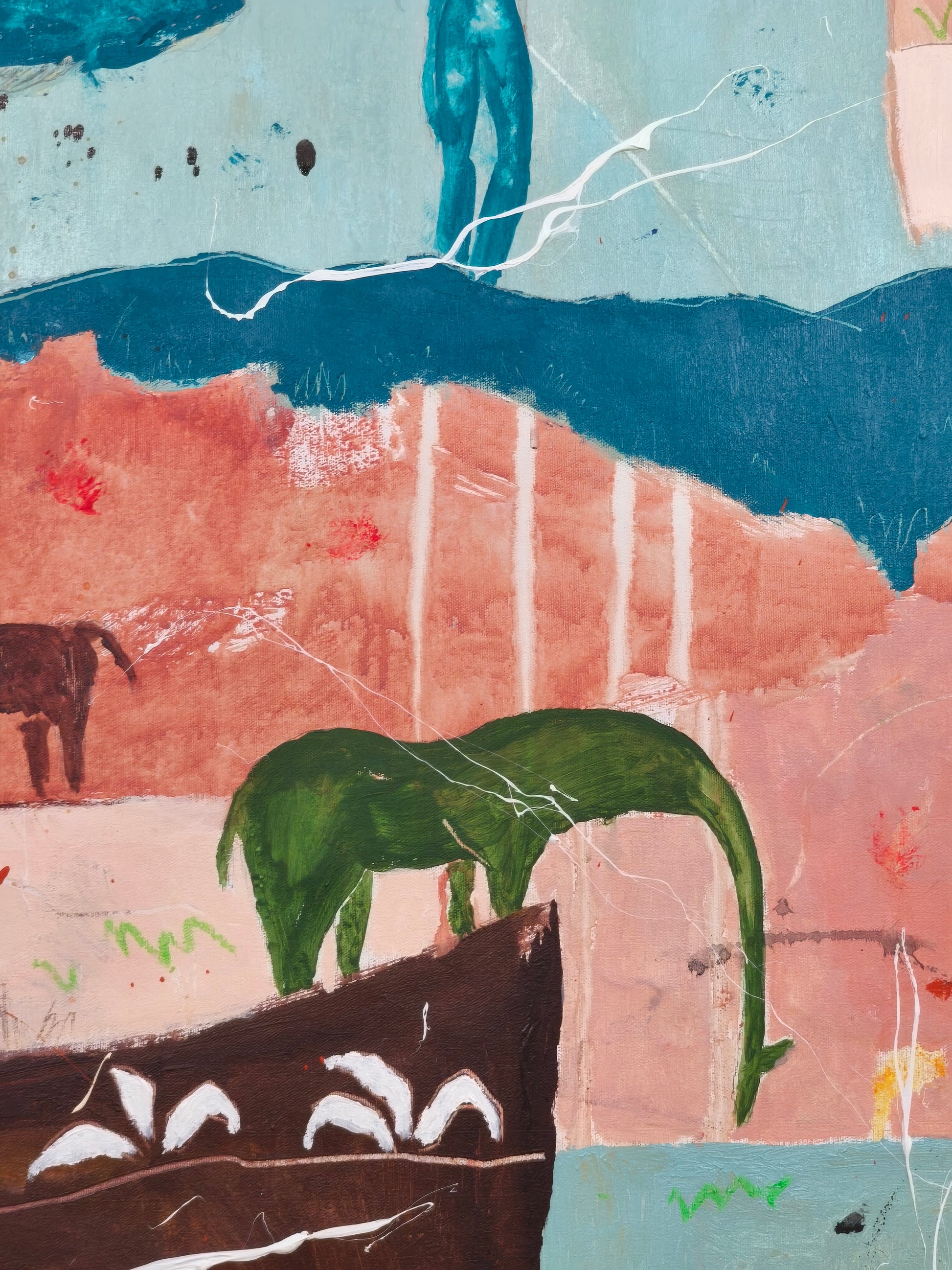 Pintura gestual, intuitiva, que deja que las cosas pasen y se apoya sobre lo que aparece. Aprovechando el accidente y aceptando las consecuencias.