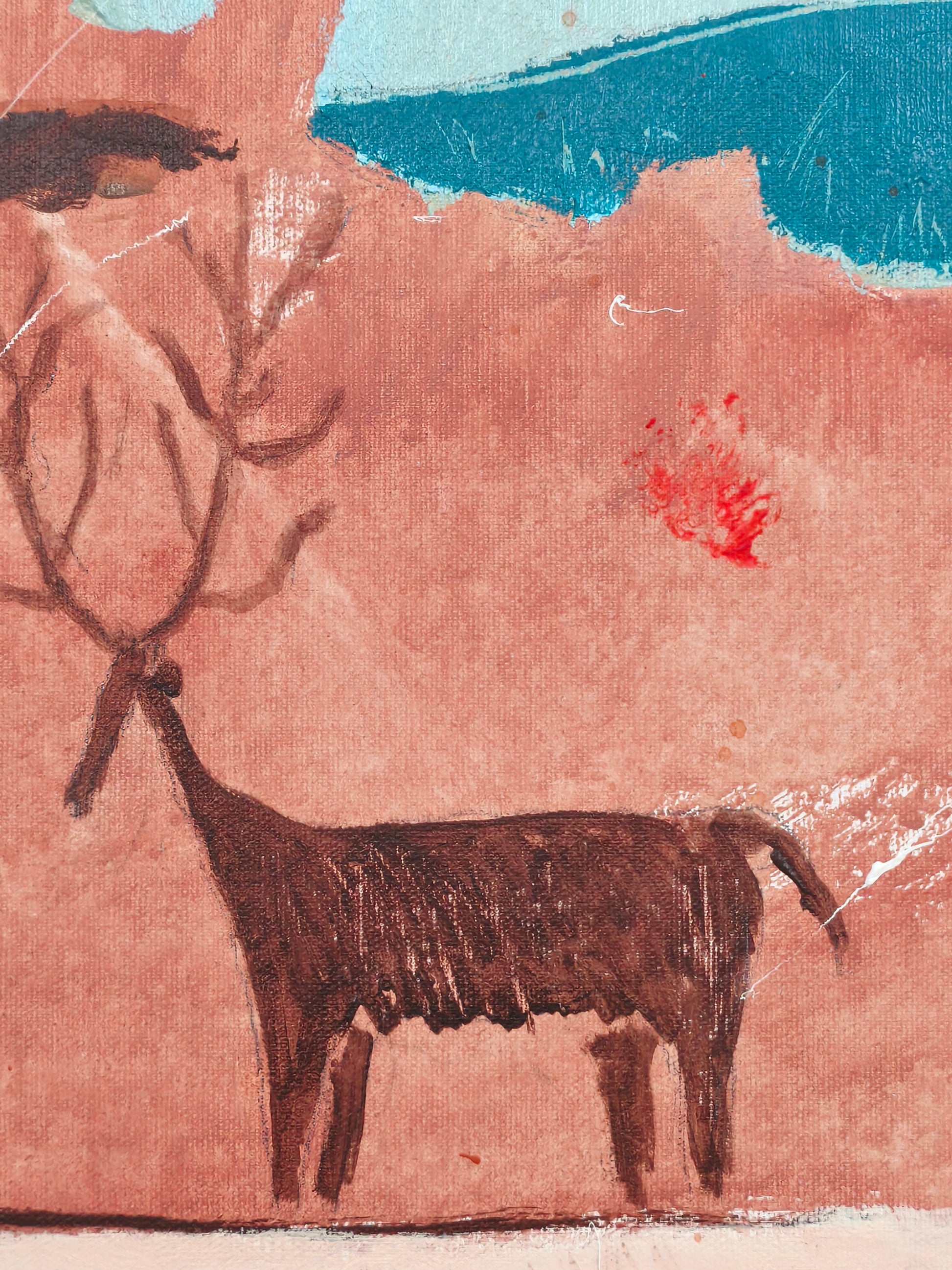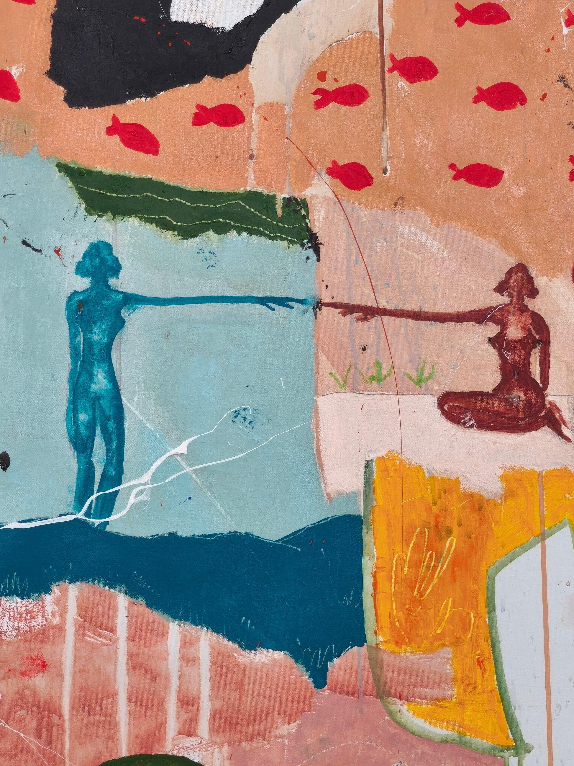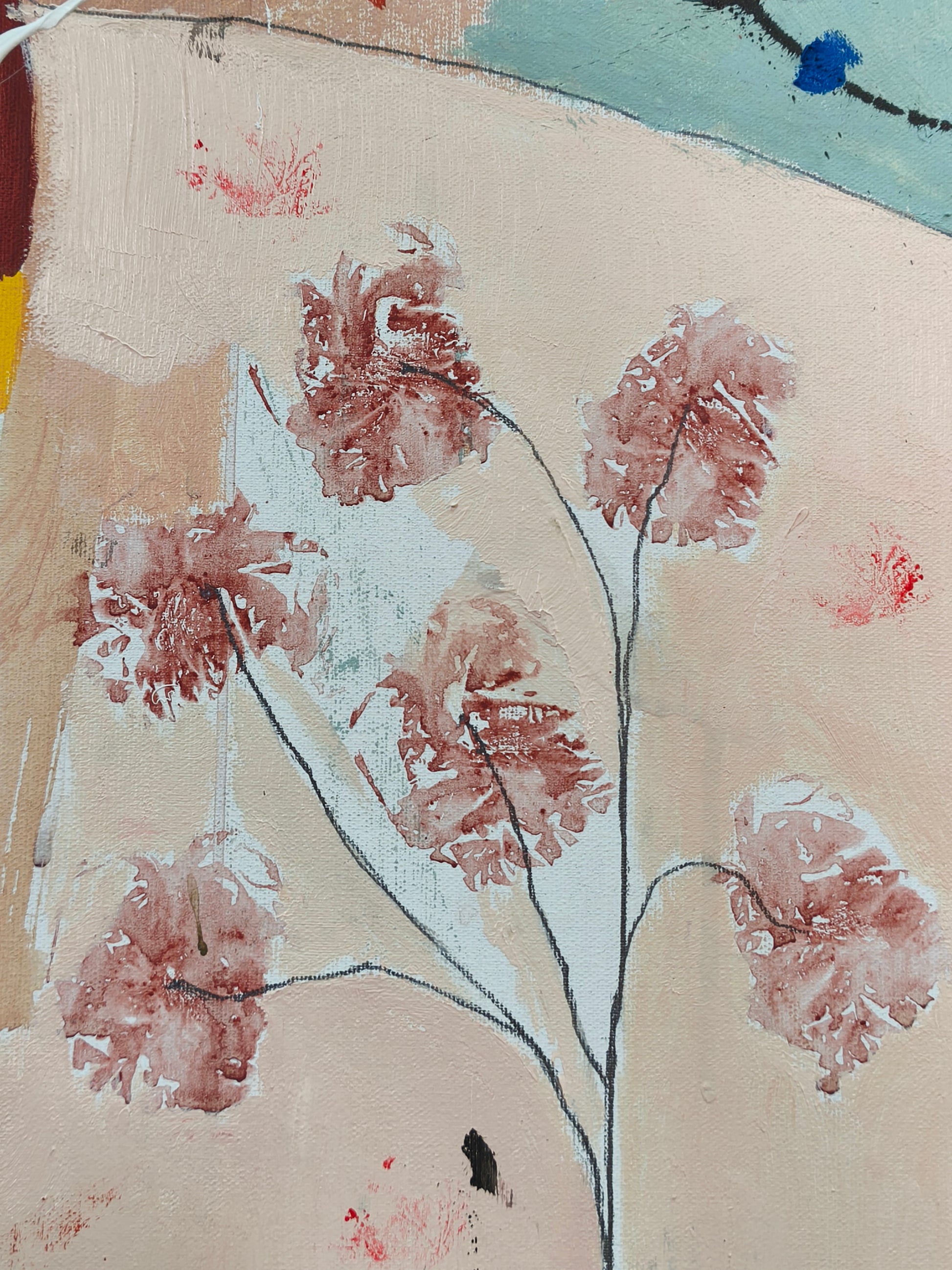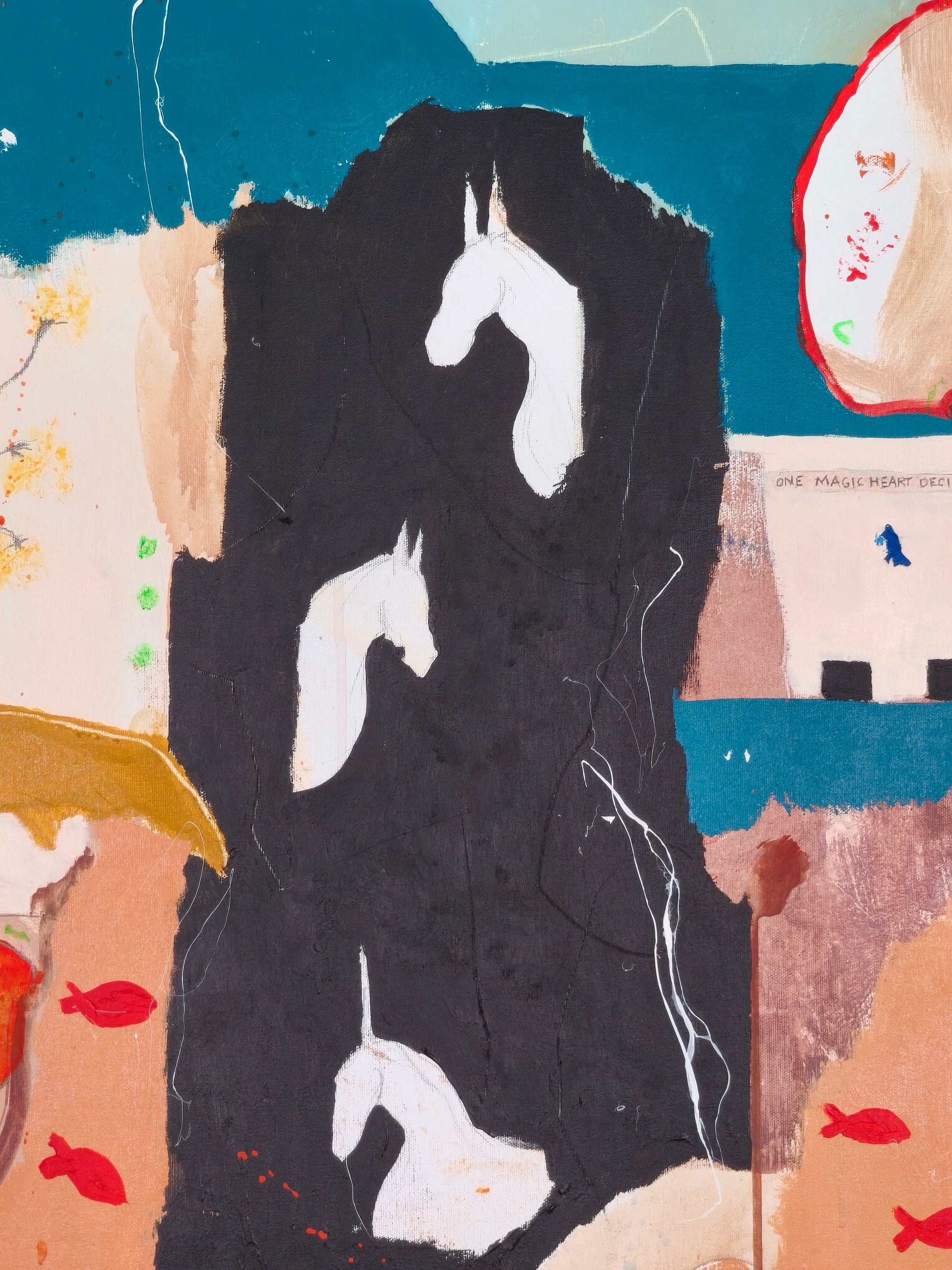 Pintura gestual, intuitiva, que deja que las cosas pasen y se apoya sobre lo que aparece. Aprovechando el accidente y aceptando las consecuencias.